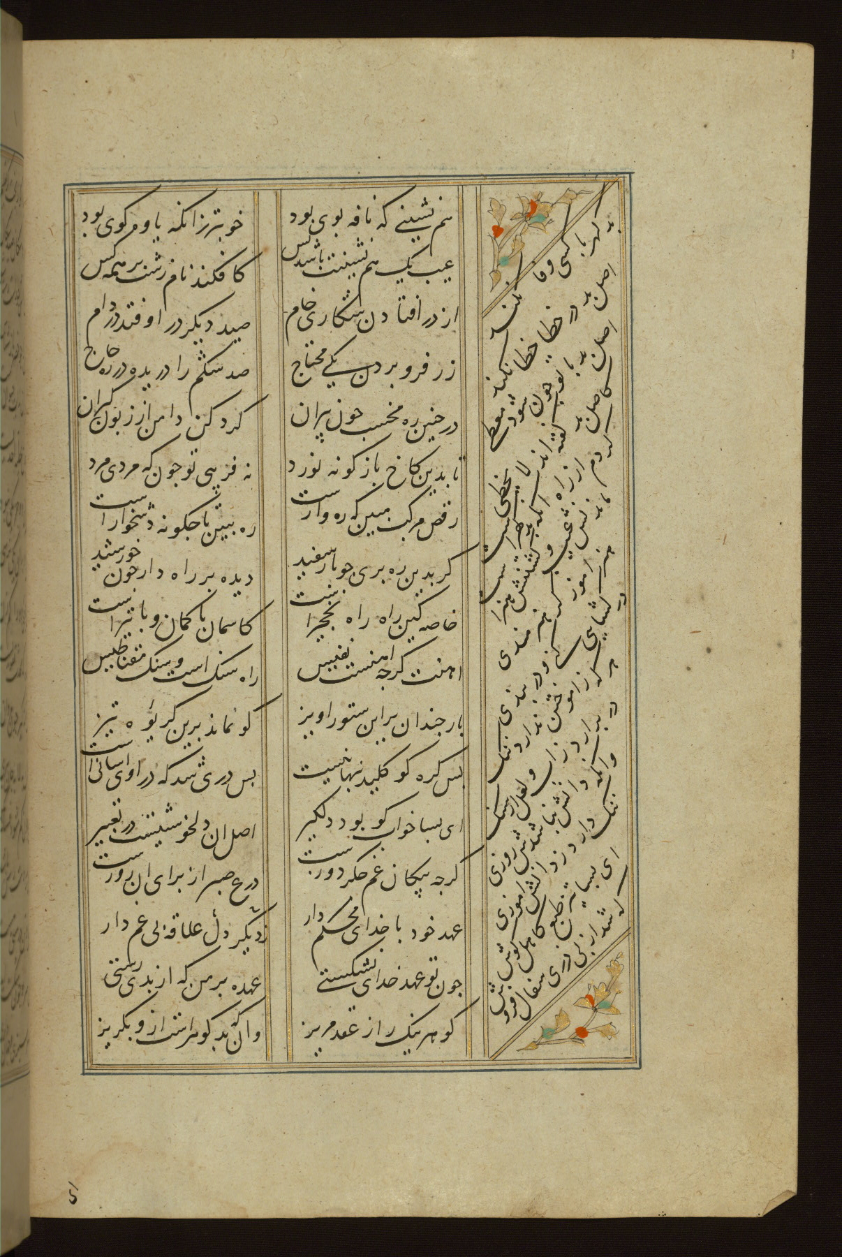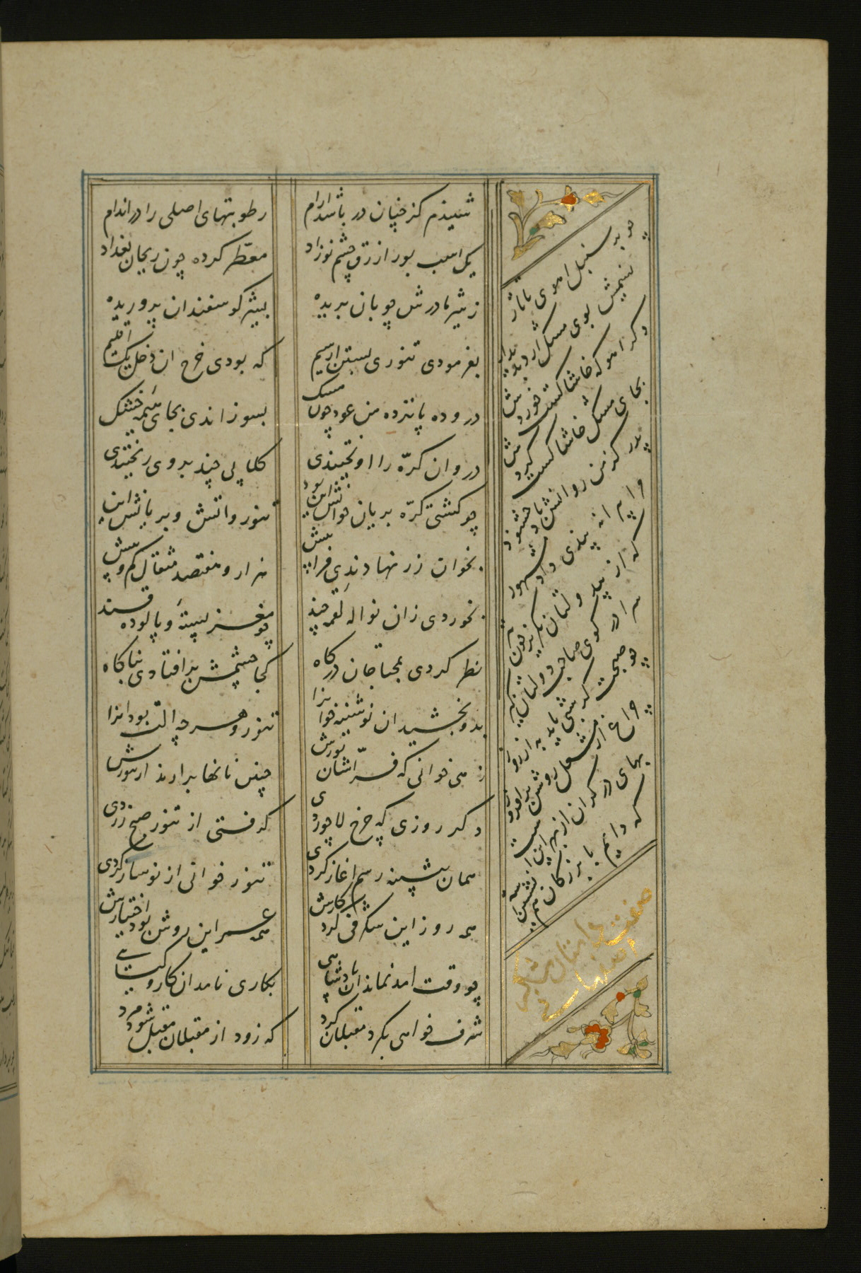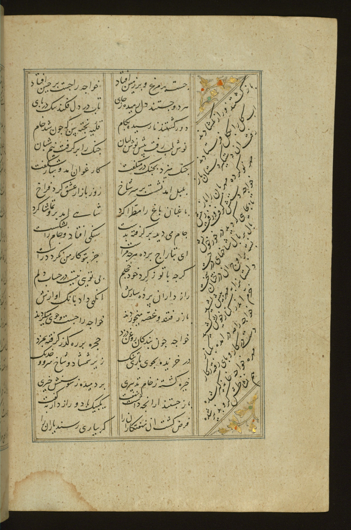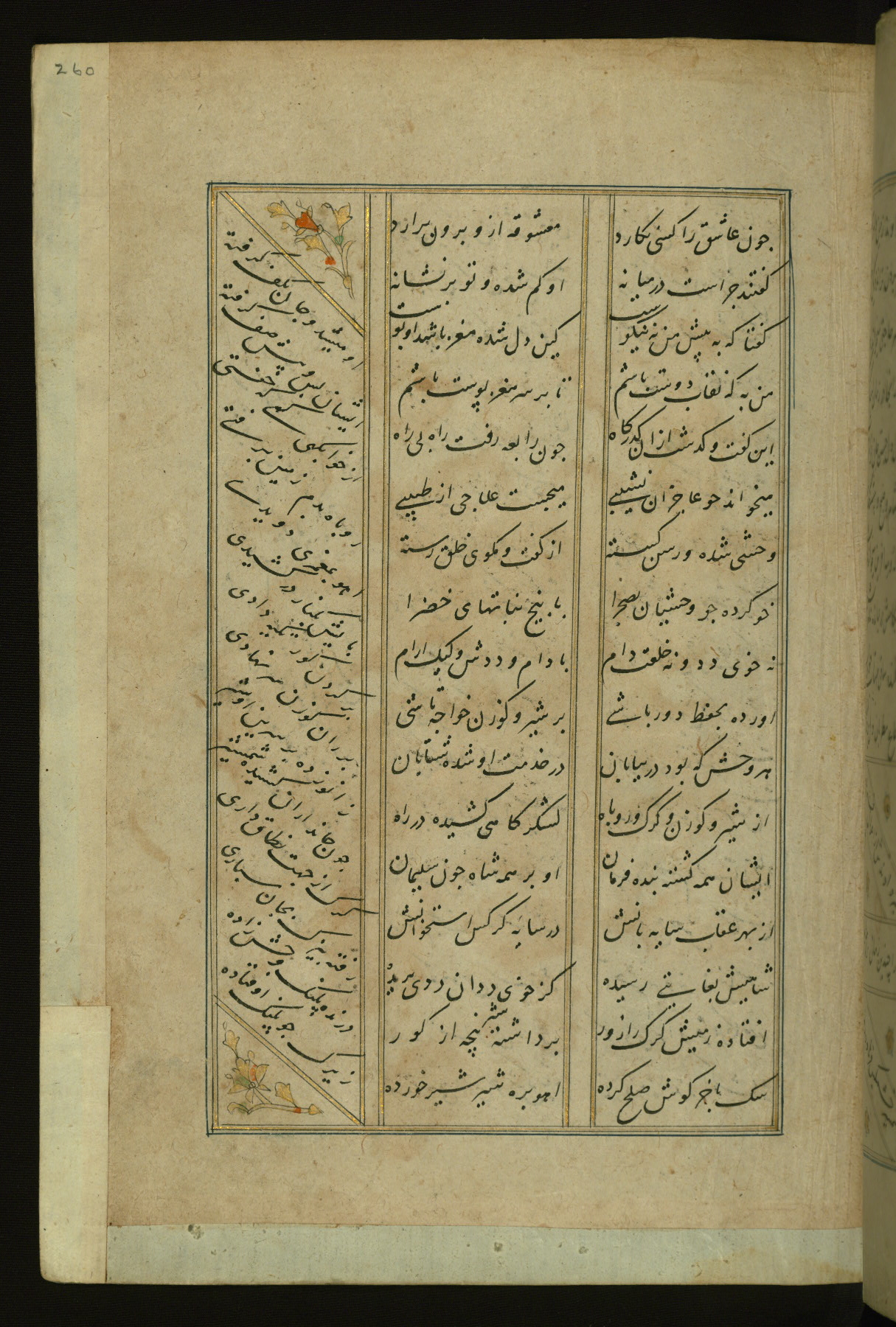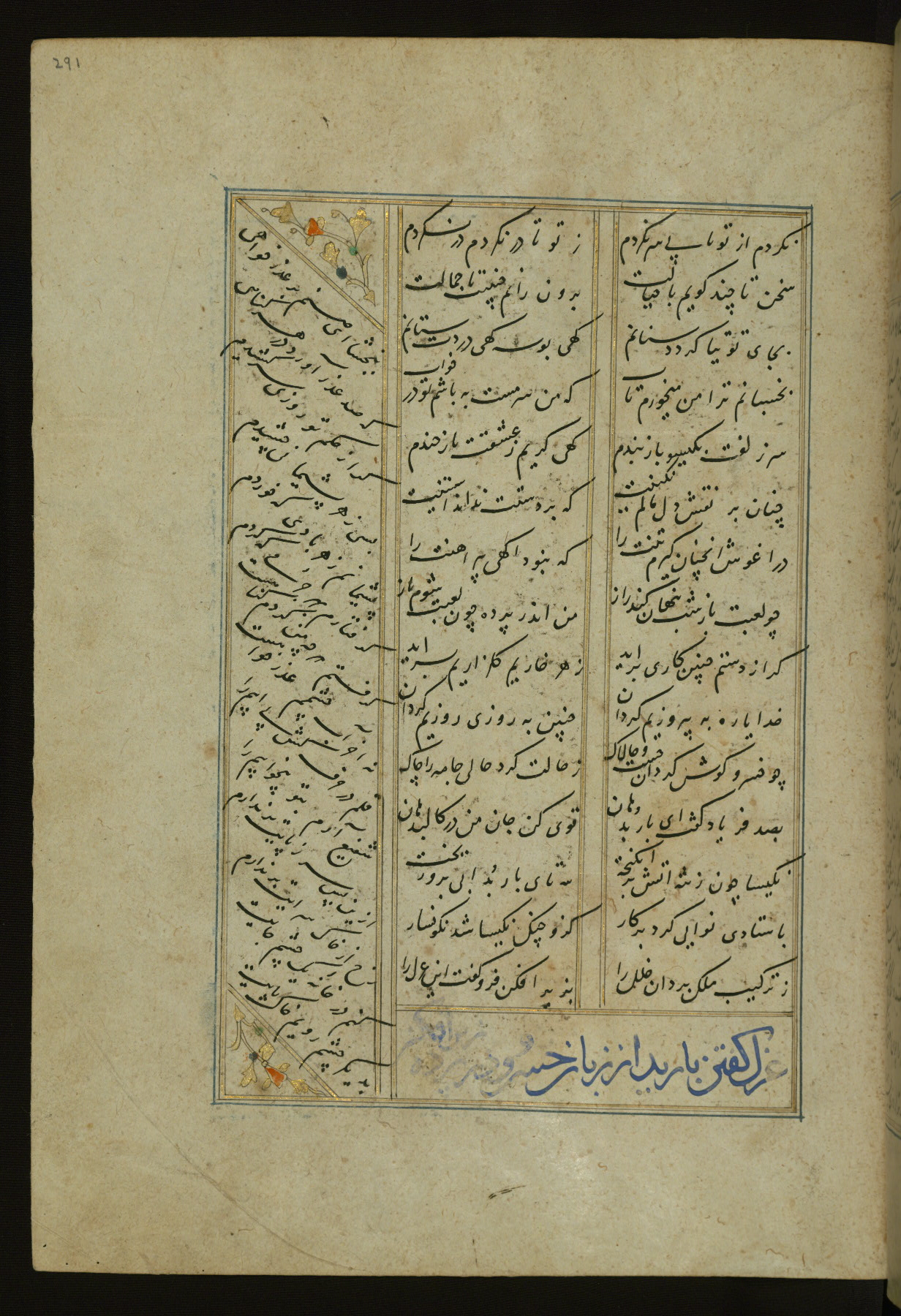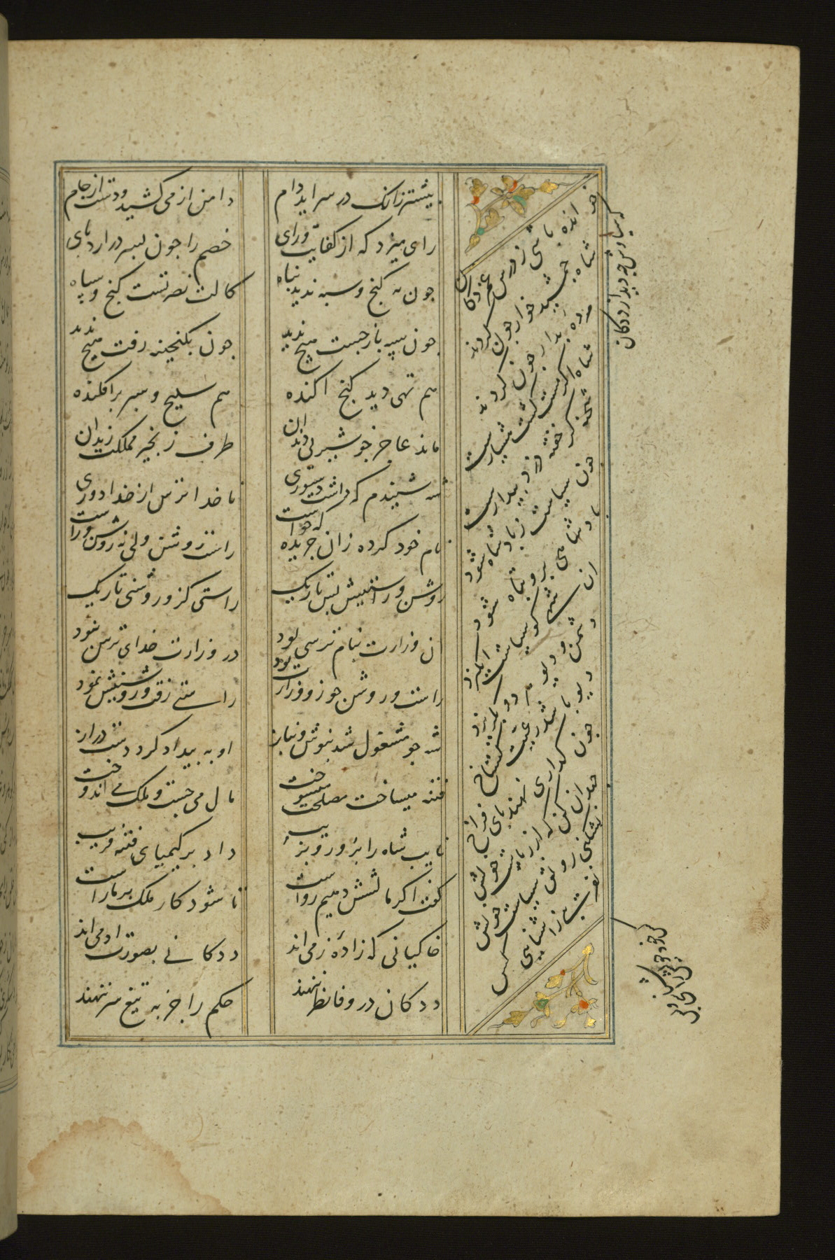 This copy of the Khamsah (quintet) of Niẓāmī Ganjavī (d. 605 AH / 1209 CE) was written by Abū Bakr Shāh ibn Ḥasan ibn ʿAlī al-Shahrastānī and illuminated by Jamāl al-Dīn ibn Muḥammad al-Ṣiddīqī al-Iṣfahānī between 892 AH / 1486 CE and 900 AH / 1494-5 CE. The manuscript opens with a double-page illuminated frontispiece with an inscription giving the title of the work and the name of the author (fols. 1b-2a). There are four illuminated titlepieces with the names of the individual poems and twenty-six repainted illustrations. According to evidence supplied by the colophons, the original binding was by the hand of Jamāl al-Dīn ibn Muḥammad al-Ṣiddīqī al-Iṣfahānī, as well. Unfortunately, it has not survived. The binding presently attached to the manuscript dates to the twelfth century AH / eighteenth CE.