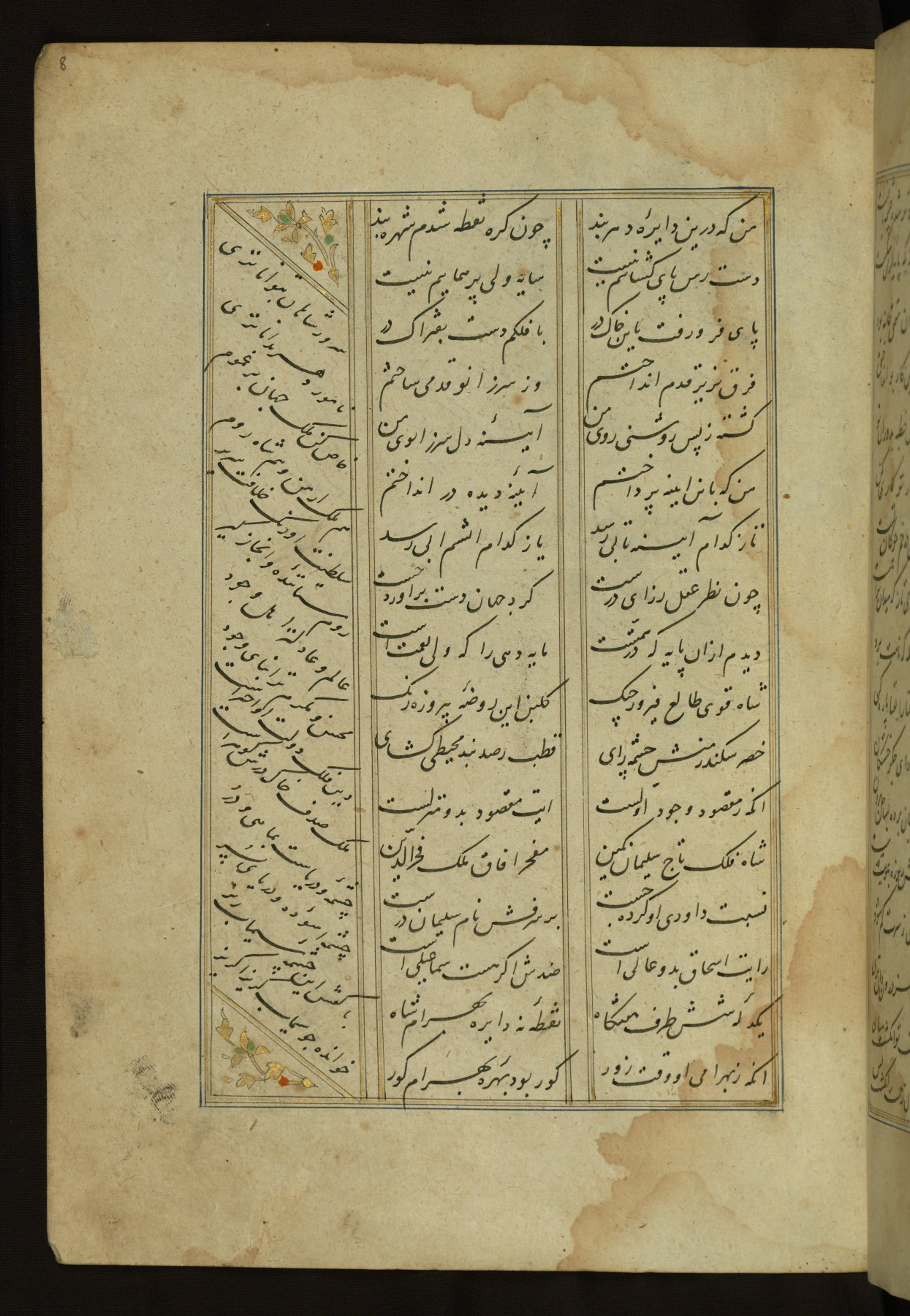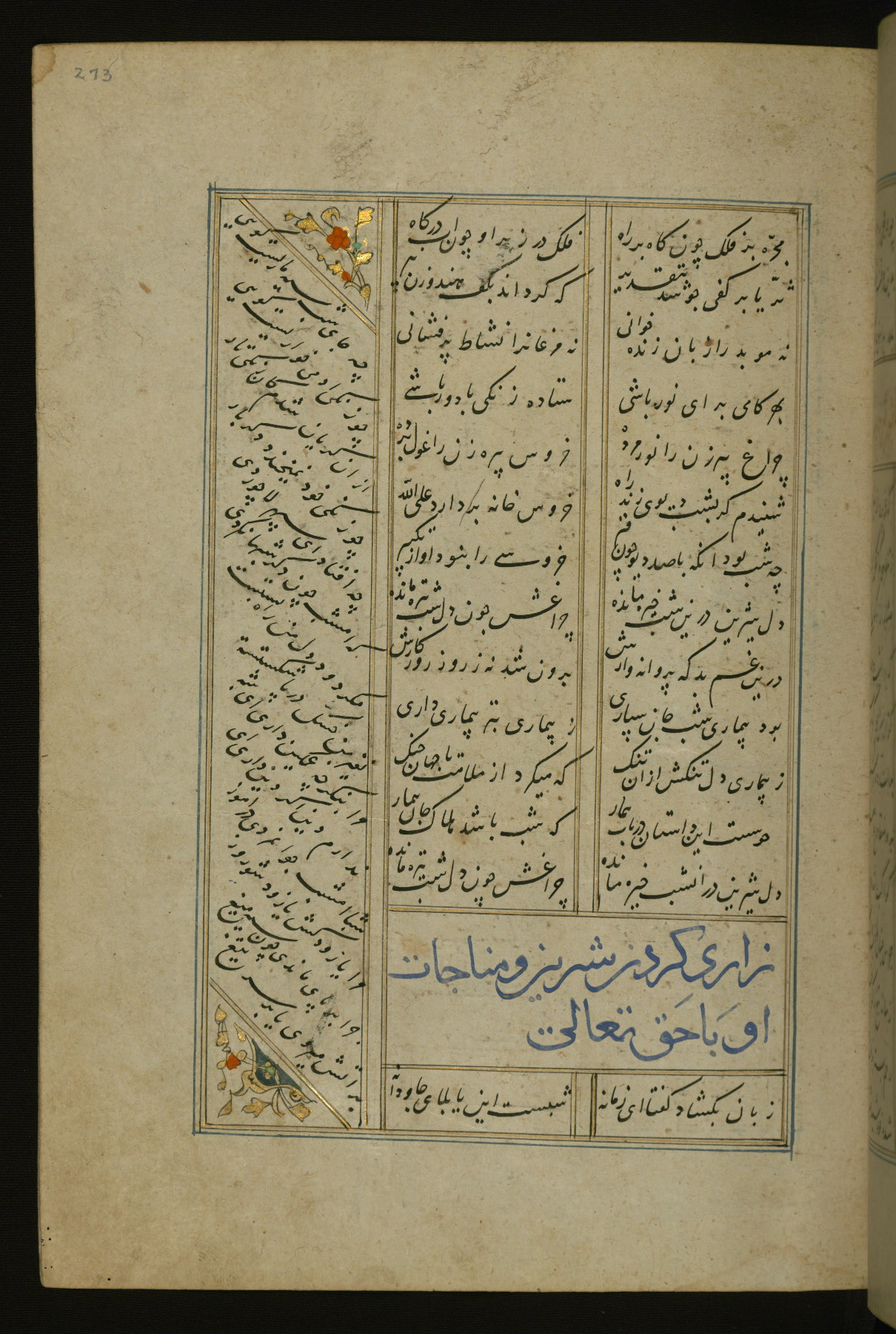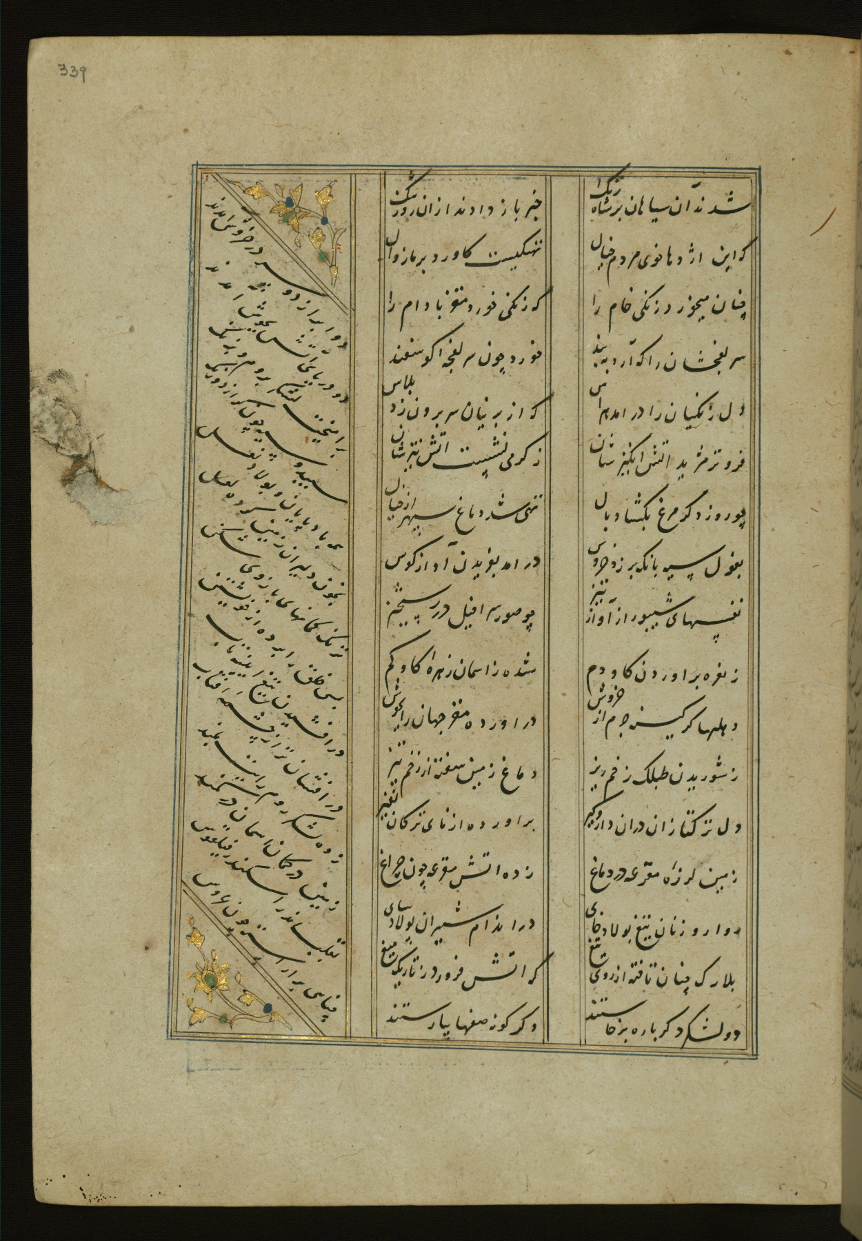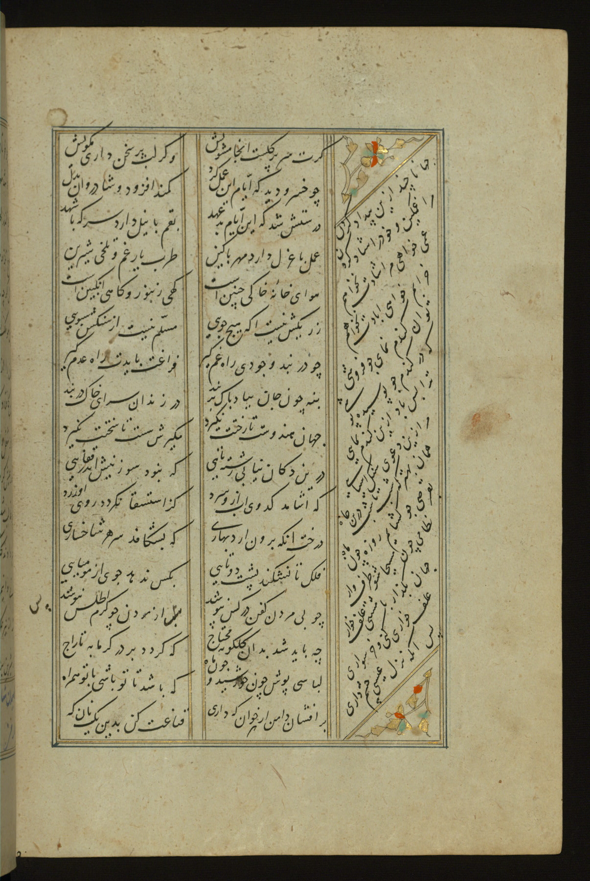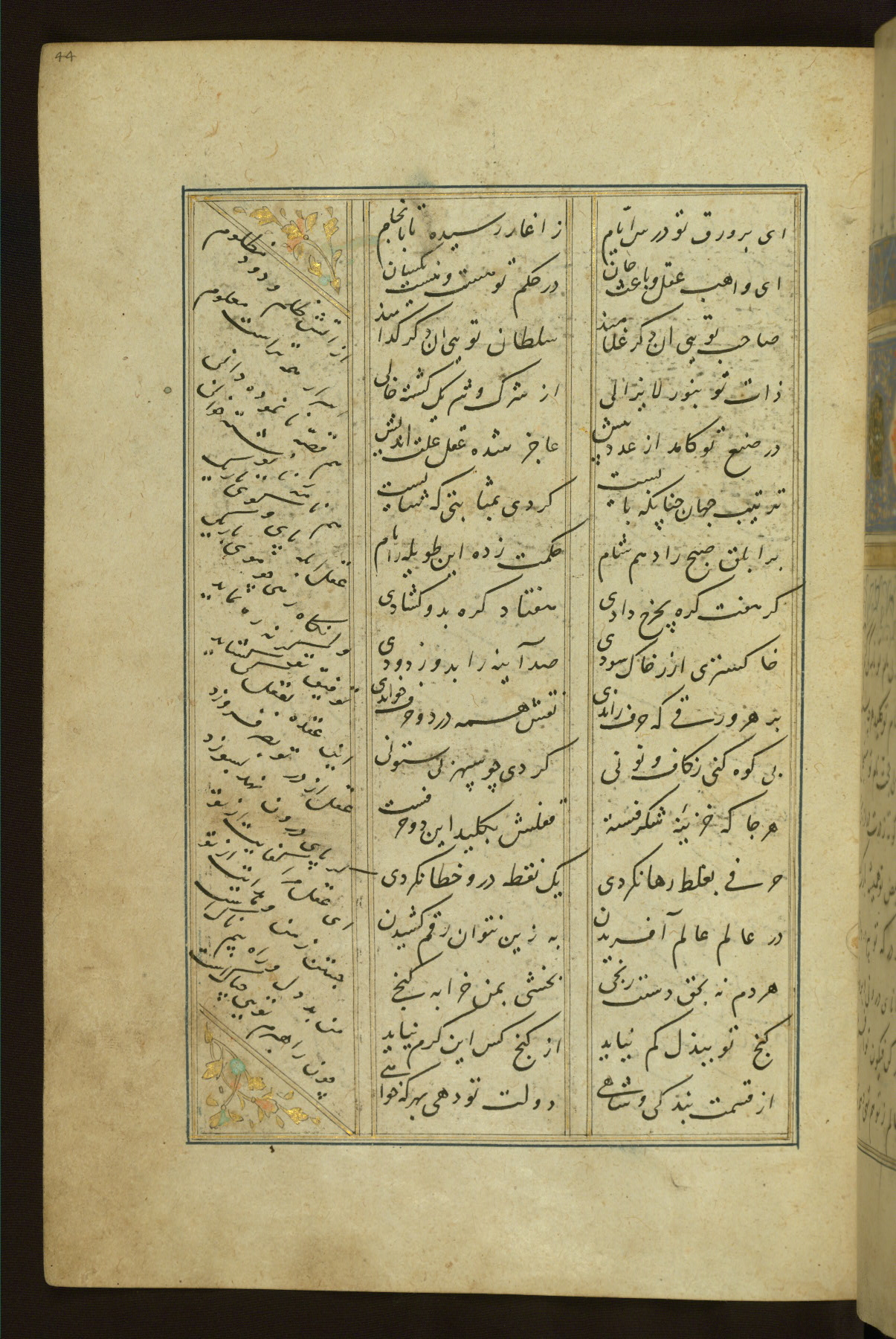 This copy of the Khamsah (quintet) of Niẓāmī Ganjavī (d. 605 AH / 1209 CE) was written by Abū Bakr Shāh ibn Ḥasan ibn ʿAlī al-Shahrastānī and illuminated by Jamāl al-Dīn ibn Muḥammad al-Ṣiddīqī al-Iṣfahānī between 892 AH / 1486 CE and 900 AH / 1494-5 CE. The manuscript opens with a double-page illuminated frontispiece with an inscription giving the title of the work and the name of the author (fols. 1b-2a). There are four illuminated titlepieces with the names of the individual poems and twenty-six repainted illustrations. According to evidence supplied by the colophons, the original binding was by the hand of Jamāl al-Dīn ibn Muḥammad al-Ṣiddīqī al-Iṣfahānī, as well. Unfortunately, it has not survived. The binding presently attached to the manuscript dates to the twelfth century AH / eighteenth CE.