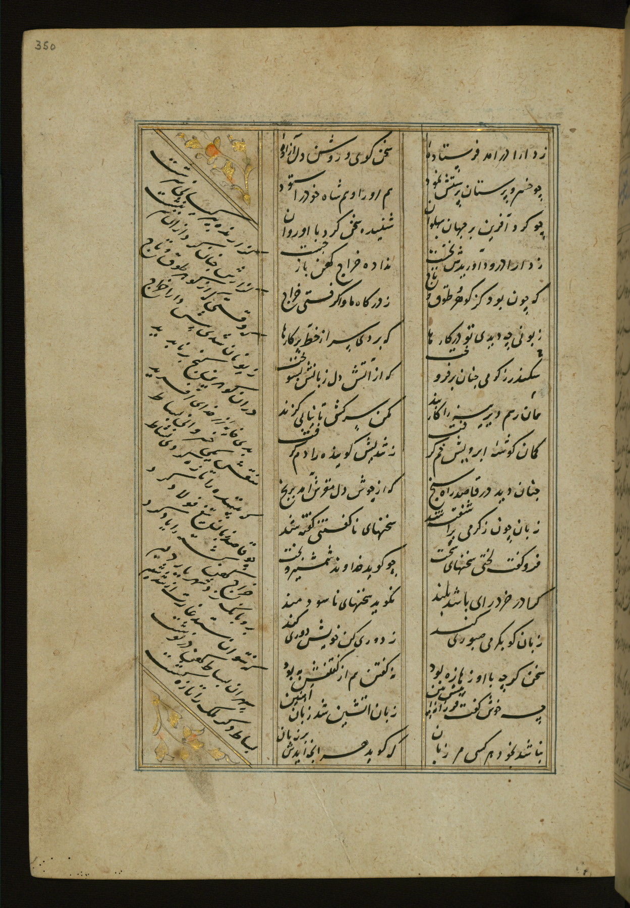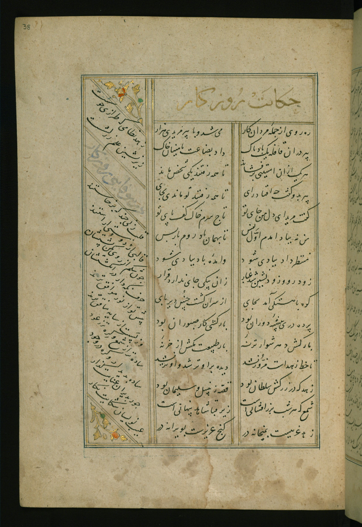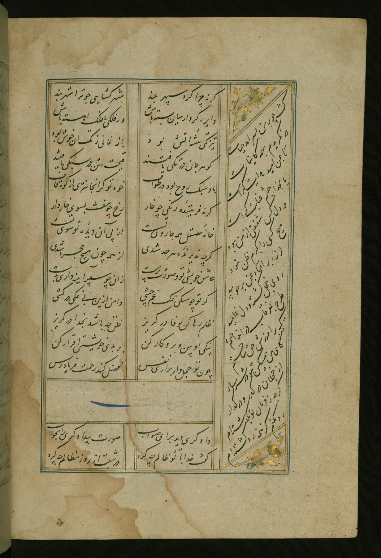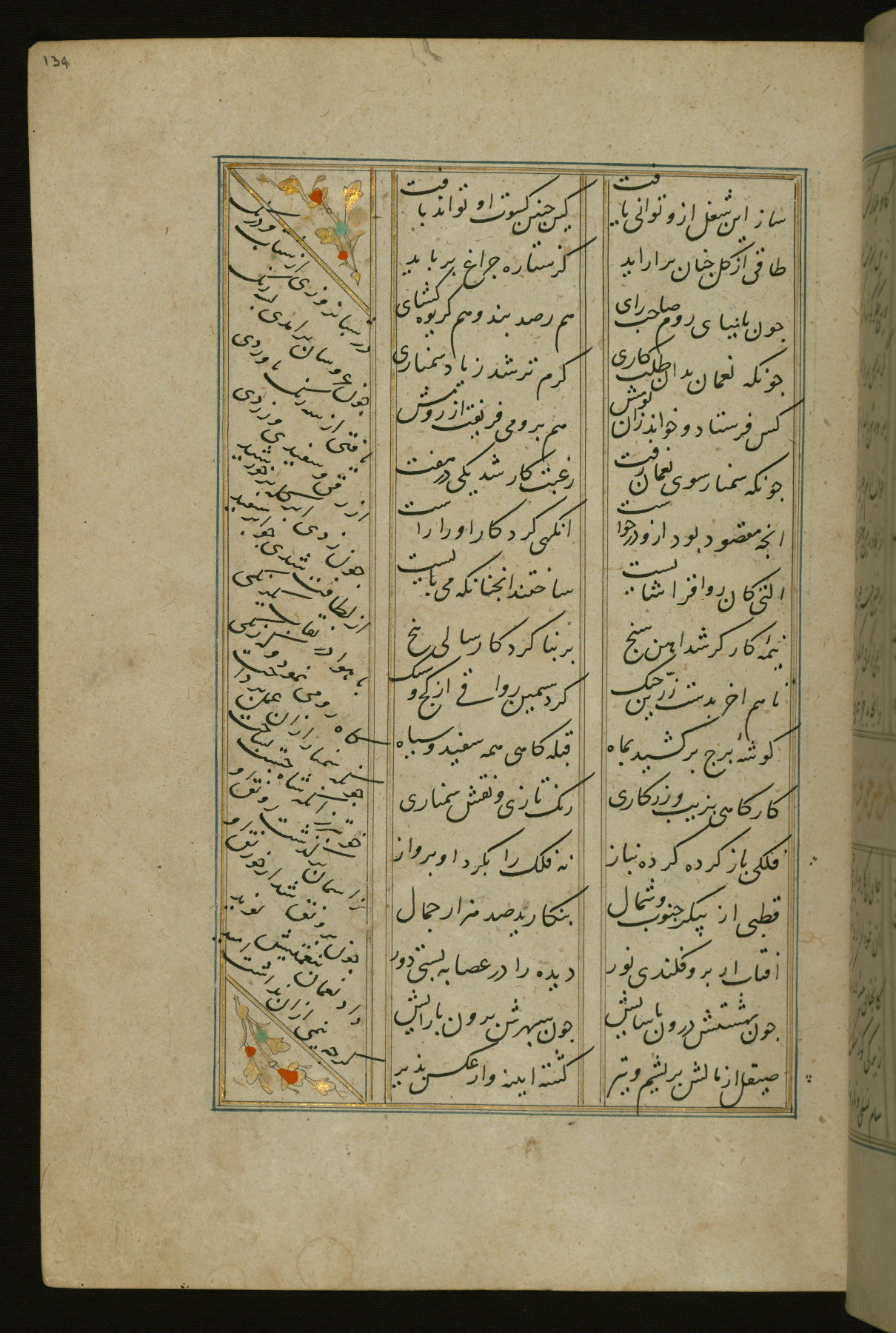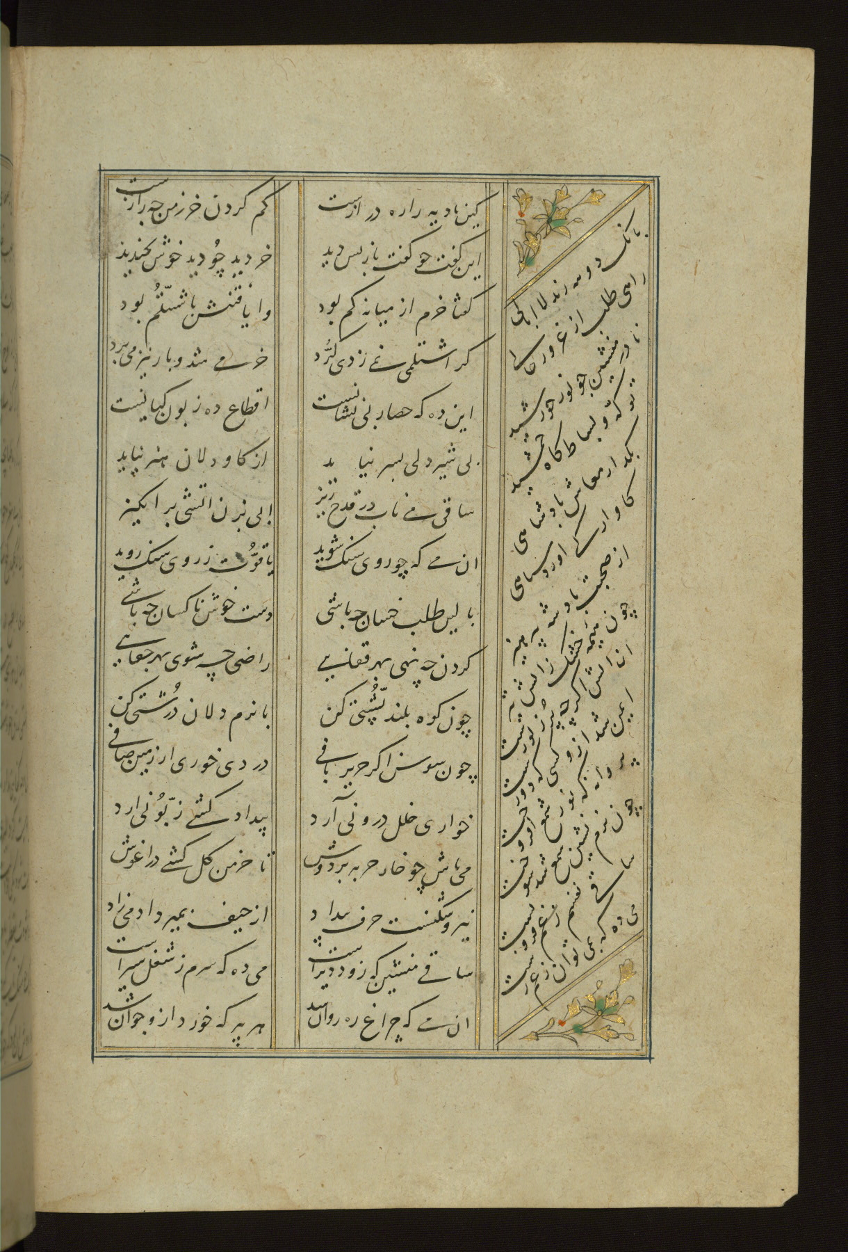 This copy of the Khamsah (quintet) of Niẓāmī Ganjavī (d. 605 AH / 1209 CE) was written by Abū Bakr Shāh ibn Ḥasan ibn ʿAlī al-Shahrastānī and illuminated by Jamāl al-Dīn ibn Muḥammad al-Ṣiddīqī al-Iṣfahānī between 892 AH / 1486 CE and 900 AH / 1494-5 CE. The manuscript opens with a double-page illuminated frontispiece with an inscription giving the title of the work and the name of the author (fols. 1b-2a). There are four illuminated titlepieces with the names of the individual poems and twenty-six repainted illustrations. According to evidence supplied by the colophons, the original binding was by the hand of Jamāl al-Dīn ibn Muḥammad al-Ṣiddīqī al-Iṣfahānī, as well. Unfortunately, it has not survived. The binding presently attached to the manuscript dates to the twelfth century AH / eighteenth CE.