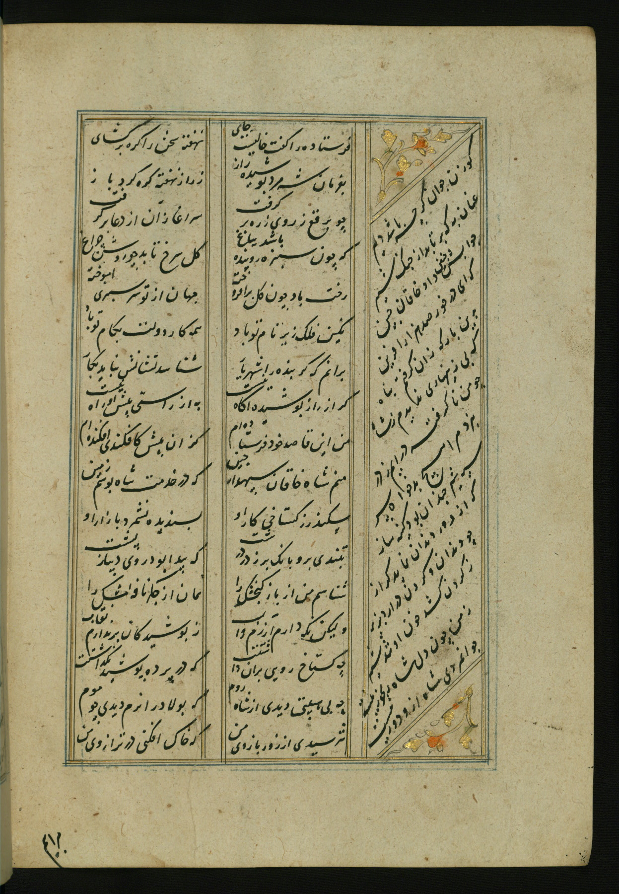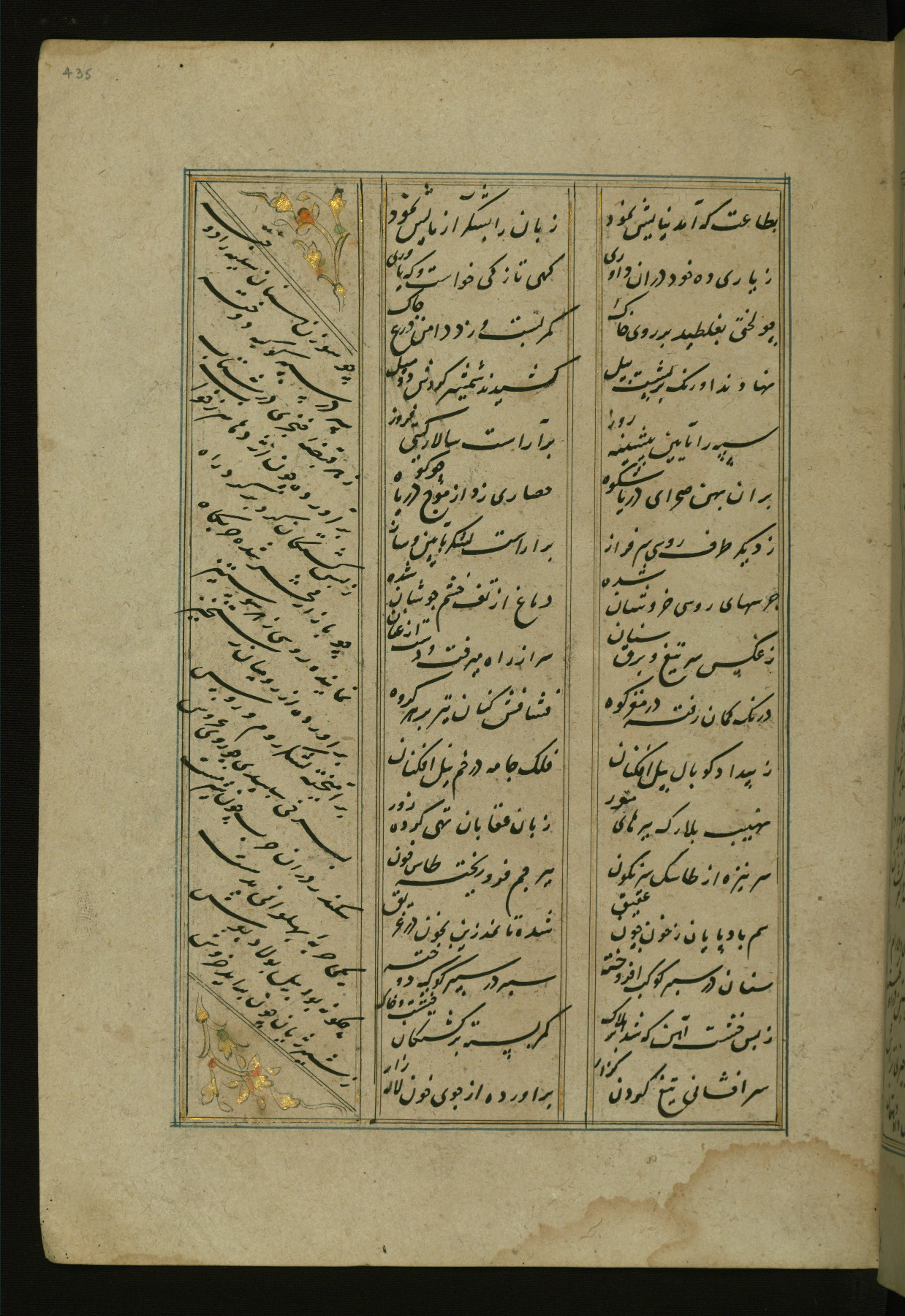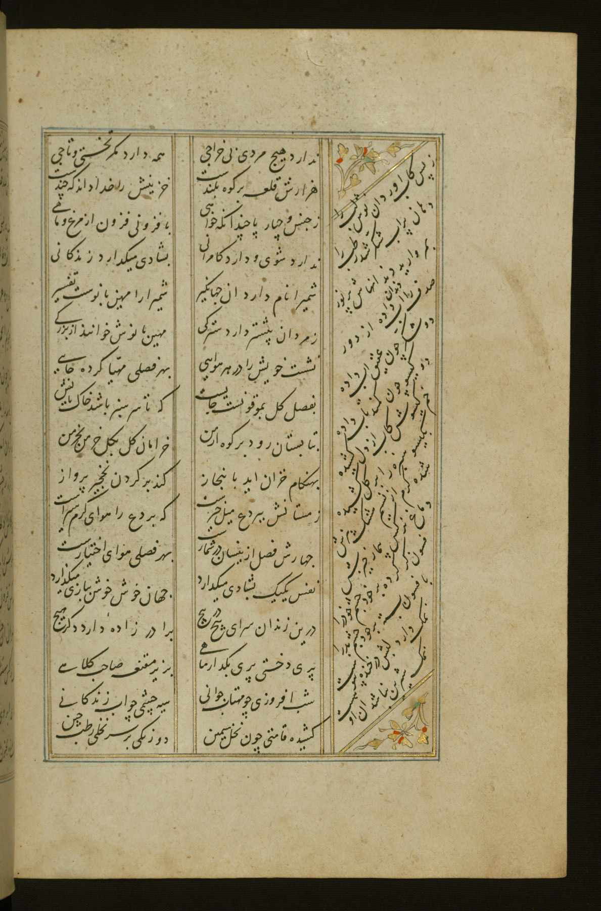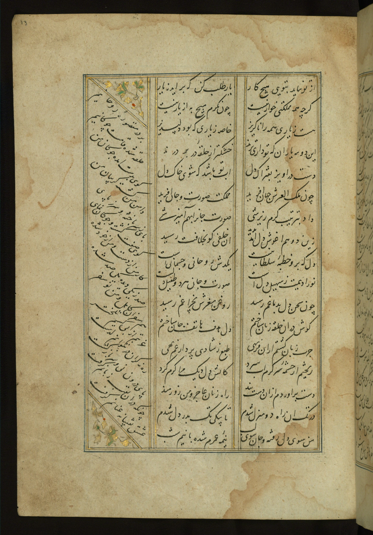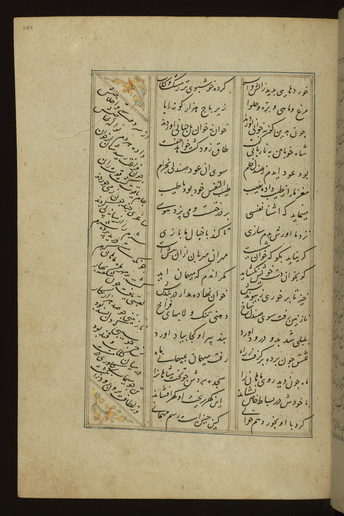 This copy of the Khamsah (quintet) of Niẓāmī Ganjavī (d. 605 AH / 1209 CE) was written by Abū Bakr Shāh ibn Ḥasan ibn ʿAlī al-Shahrastānī and illuminated by Jamāl al-Dīn ibn Muḥammad al-Ṣiddīqī al-Iṣfahānī between 892 AH / 1486 CE and 900 AH / 1494-5 CE. The manuscript opens with a double-page illuminated frontispiece with an inscription giving the title of the work and the name of the author (fols. 1b-2a). There are four illuminated titlepieces with the names of the individual poems and twenty-six repainted illustrations. According to evidence supplied by the colophons, the original binding was by the hand of Jamāl al-Dīn ibn Muḥammad al-Ṣiddīqī al-Iṣfahānī, as well. Unfortunately, it has not survived. The binding presently attached to the manuscript dates to the twelfth century AH / eighteenth CE.