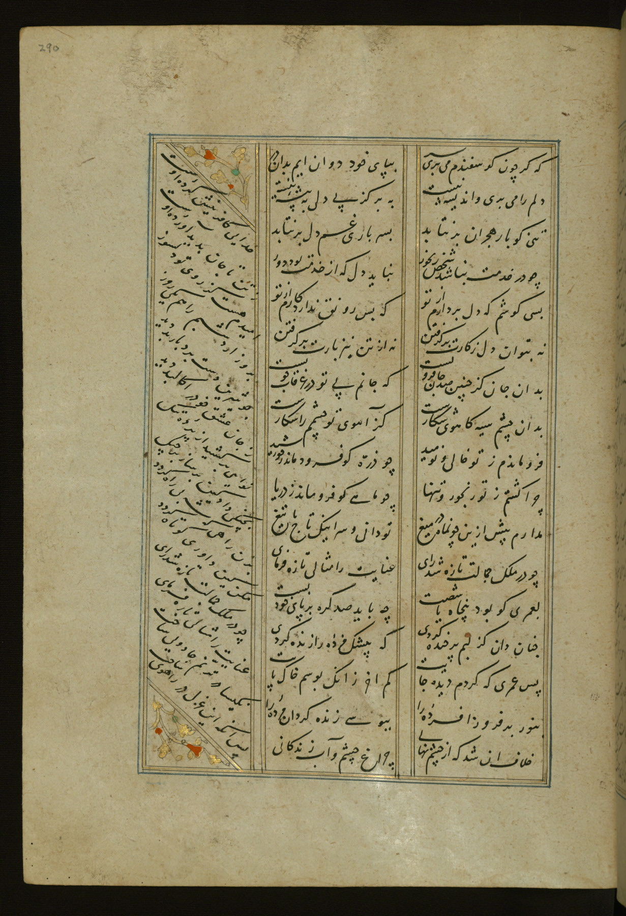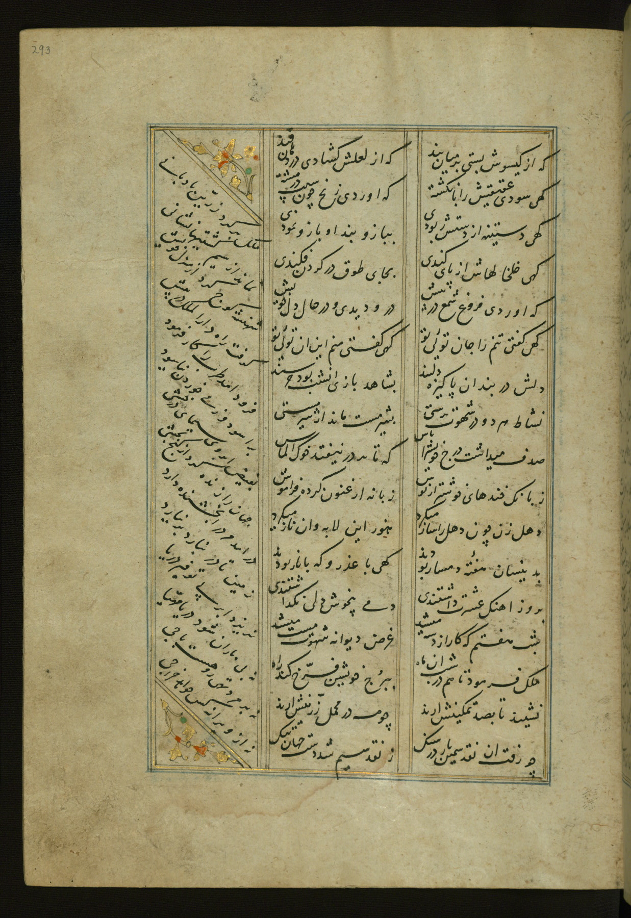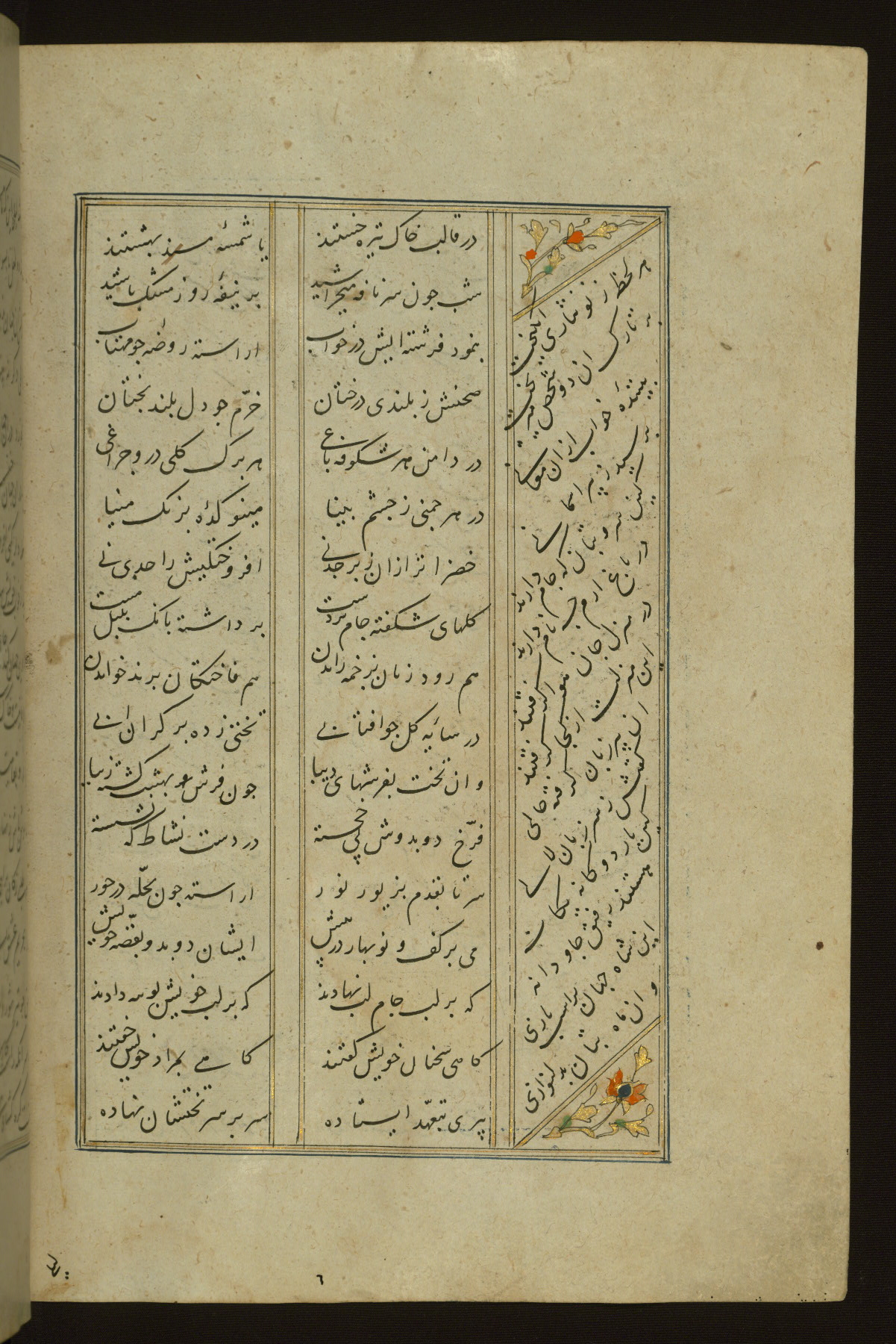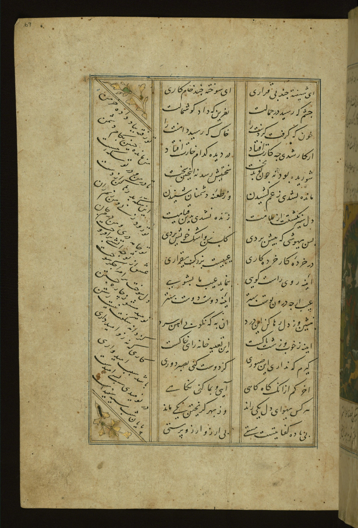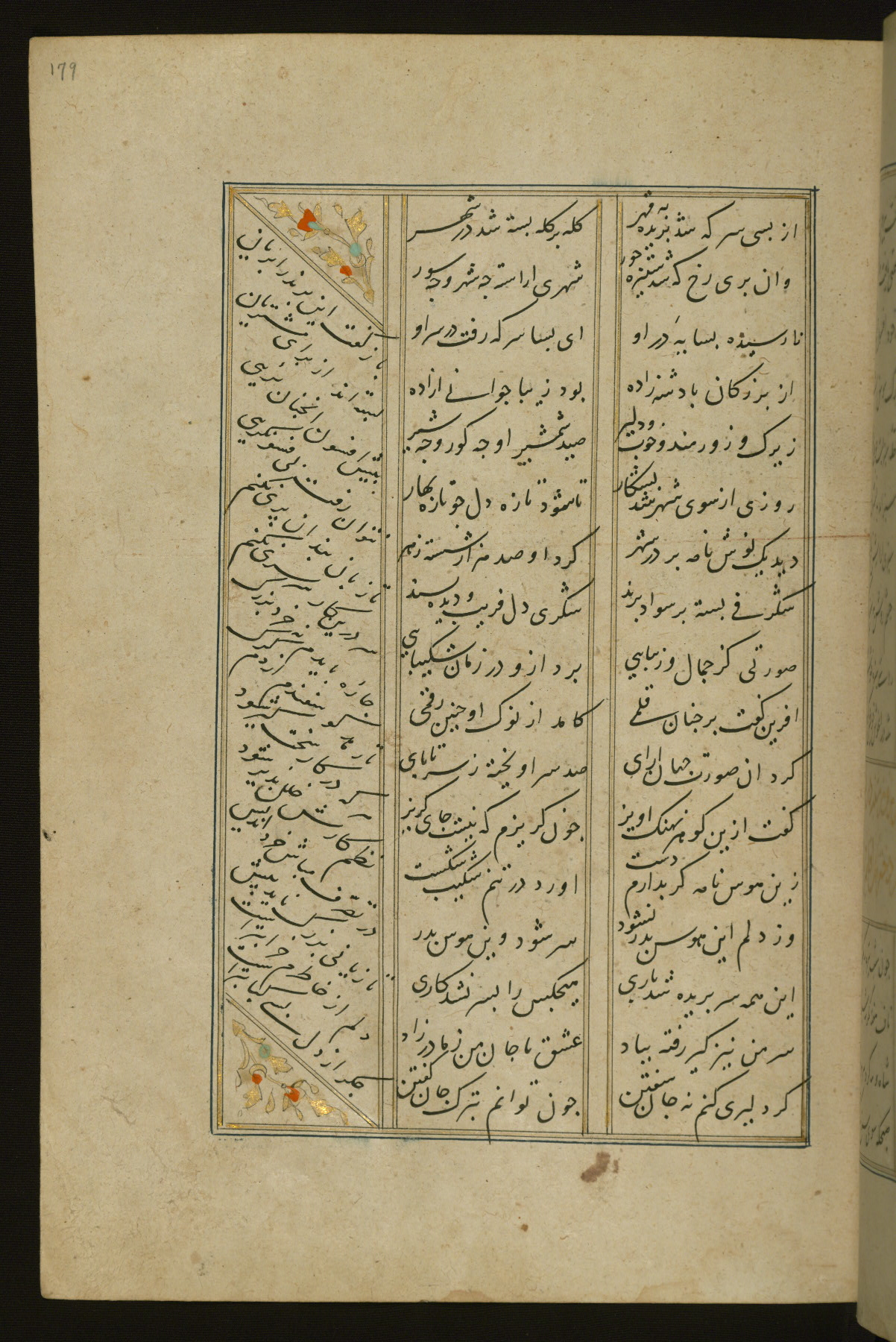 This copy of the Khamsah (quintet) of Niẓāmī Ganjavī (d. 605 AH / 1209 CE) was written by Abū Bakr Shāh ibn Ḥasan ibn ʿAlī al-Shahrastānī and illuminated by Jamāl al-Dīn ibn Muḥammad al-Ṣiddīqī al-Iṣfahānī between 892 AH / 1486 CE and 900 AH / 1494-5 CE. The manuscript opens with a double-page illuminated frontispiece with an inscription giving the title of the work and the name of the author (fols. 1b-2a). There are four illuminated titlepieces with the names of the individual poems and twenty-six repainted illustrations. According to evidence supplied by the colophons, the original binding was by the hand of Jamāl al-Dīn ibn Muḥammad al-Ṣiddīqī al-Iṣfahānī, as well. Unfortunately, it has not survived. The binding presently attached to the manuscript dates to the twelfth century AH / eighteenth CE.