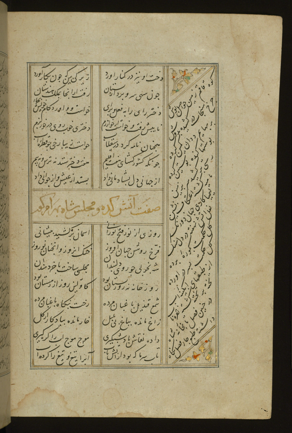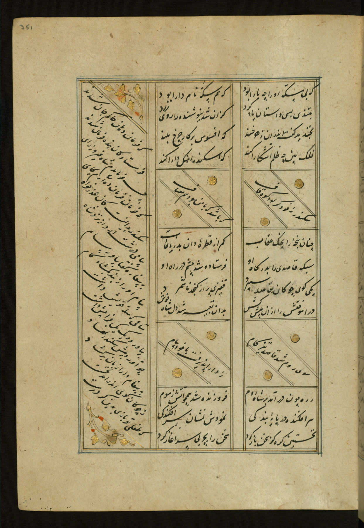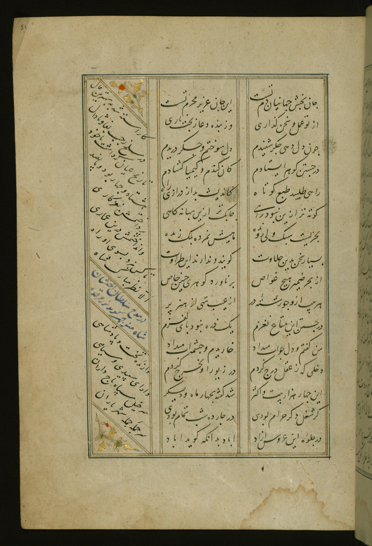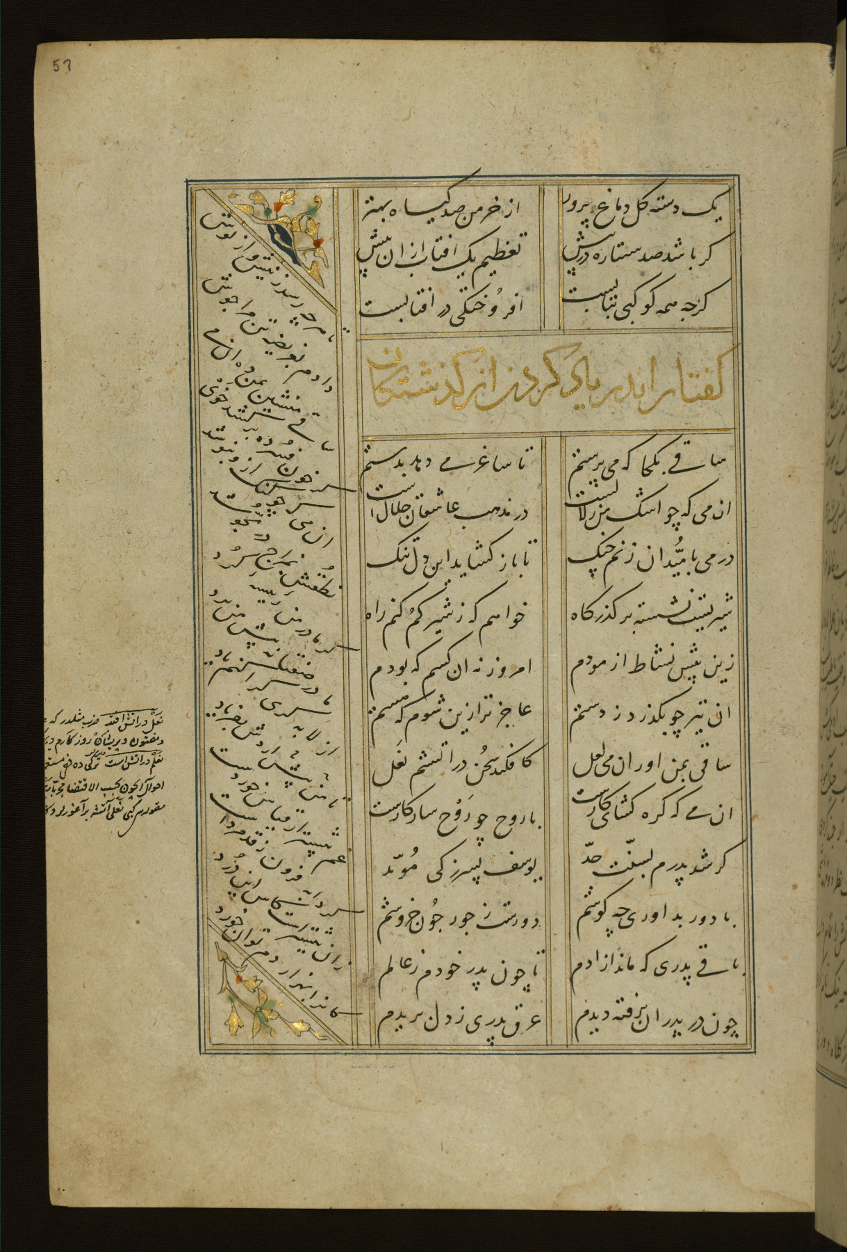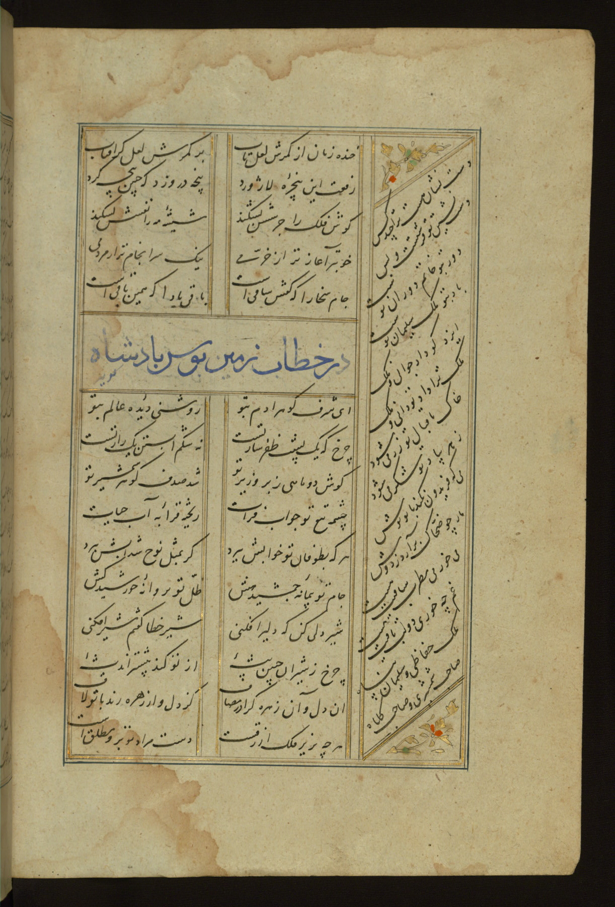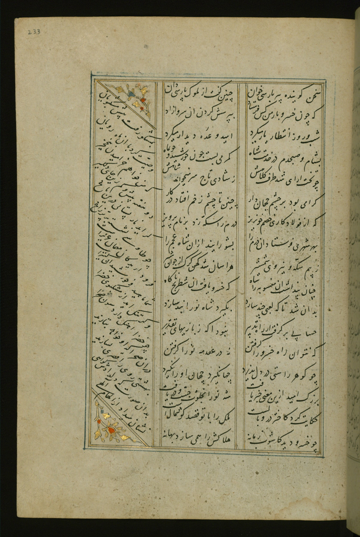 This copy of the Khamsah (quintet) of Niẓāmī Ganjavī (d. 605 AH / 1209 CE) was written by Abū Bakr Shāh ibn Ḥasan ibn ʿAlī al-Shahrastānī and illuminated by Jamāl al-Dīn ibn Muḥammad al-Ṣiddīqī al-Iṣfahānī between 892 AH / 1486 CE and 900 AH / 1494-5 CE. The manuscript opens with a double-page illuminated frontispiece with an inscription giving the title of the work and the name of the author (fols. 1b-2a). There are four illuminated titlepieces with the names of the individual poems and twenty-six repainted illustrations. According to evidence supplied by the colophons, the original binding was by the hand of Jamāl al-Dīn ibn Muḥammad al-Ṣiddīqī al-Iṣfahānī, as well. Unfortunately, it has not survived. The binding presently attached to the manuscript dates to the twelfth century AH / eighteenth CE.