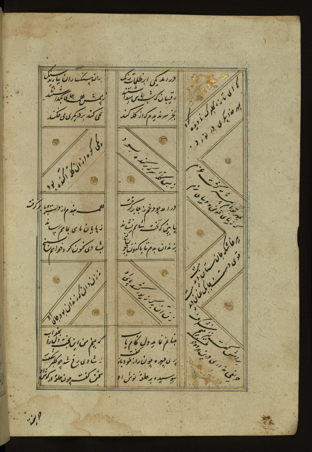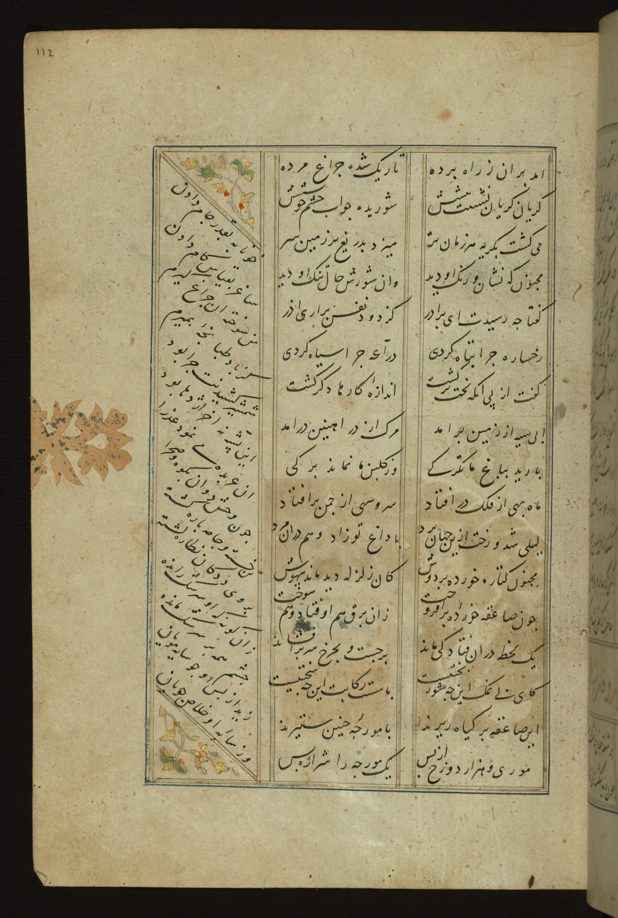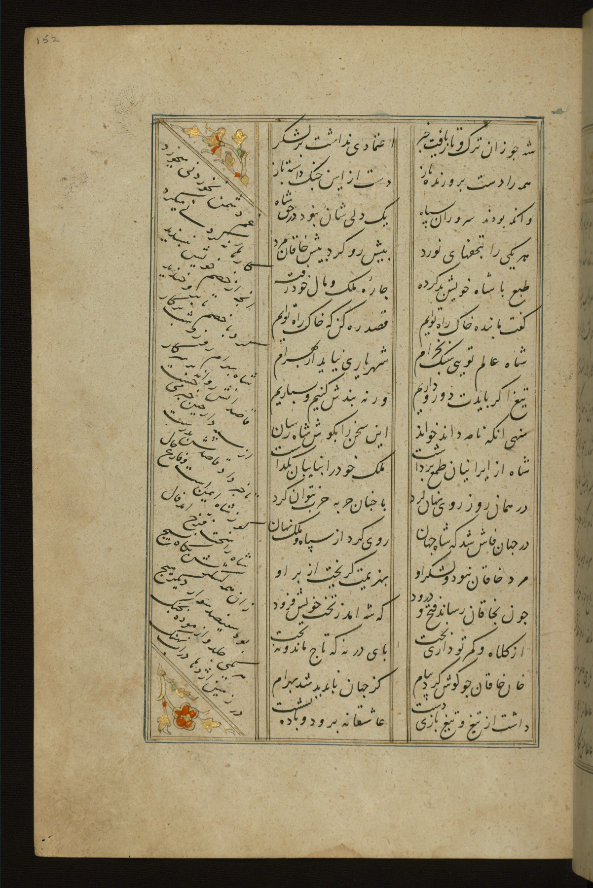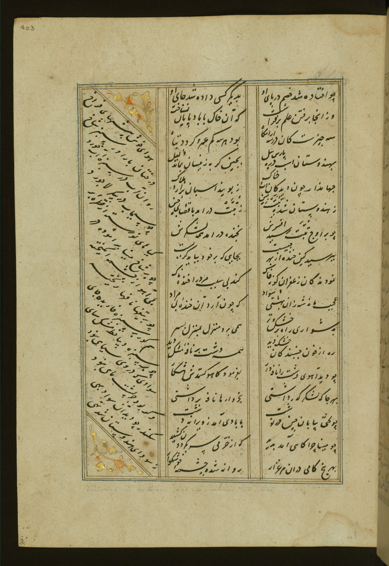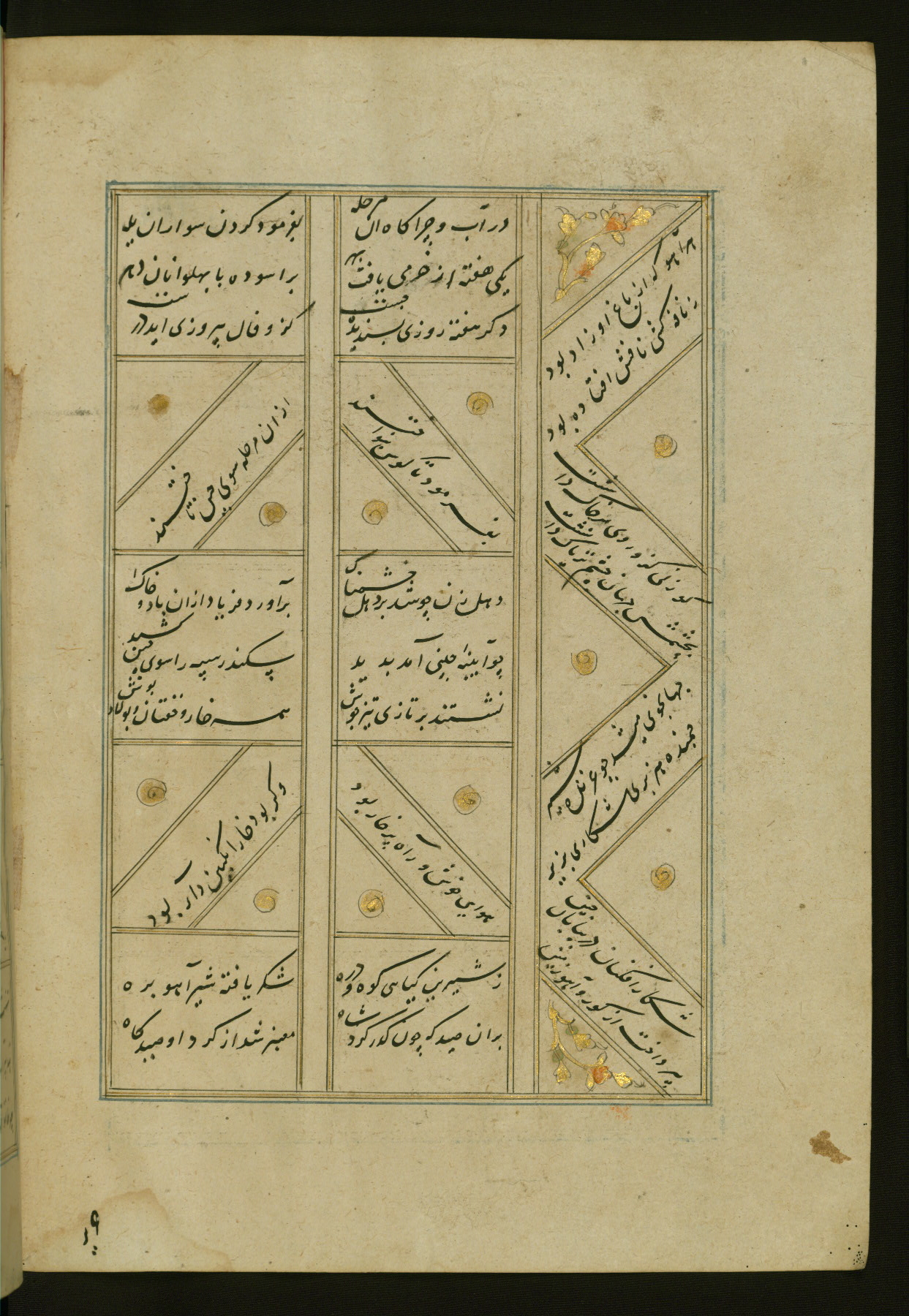 This copy of the Khamsah (quintet) of Niẓāmī Ganjavī (d. 605 AH / 1209 CE) was written by Abū Bakr Shāh ibn Ḥasan ibn ʿAlī al-Shahrastānī and illuminated by Jamāl al-Dīn ibn Muḥammad al-Ṣiddīqī al-Iṣfahānī between 892 AH / 1486 CE and 900 AH / 1494-5 CE. The manuscript opens with a double-page illuminated frontispiece with an inscription giving the title of the work and the name of the author (fols. 1b-2a). There are four illuminated titlepieces with the names of the individual poems and twenty-six repainted illustrations. According to evidence supplied by the colophons, the original binding was by the hand of Jamāl al-Dīn ibn Muḥammad al-Ṣiddīqī al-Iṣfahānī, as well. Unfortunately, it has not survived. The binding presently attached to the manuscript dates to the twelfth century AH / eighteenth CE.