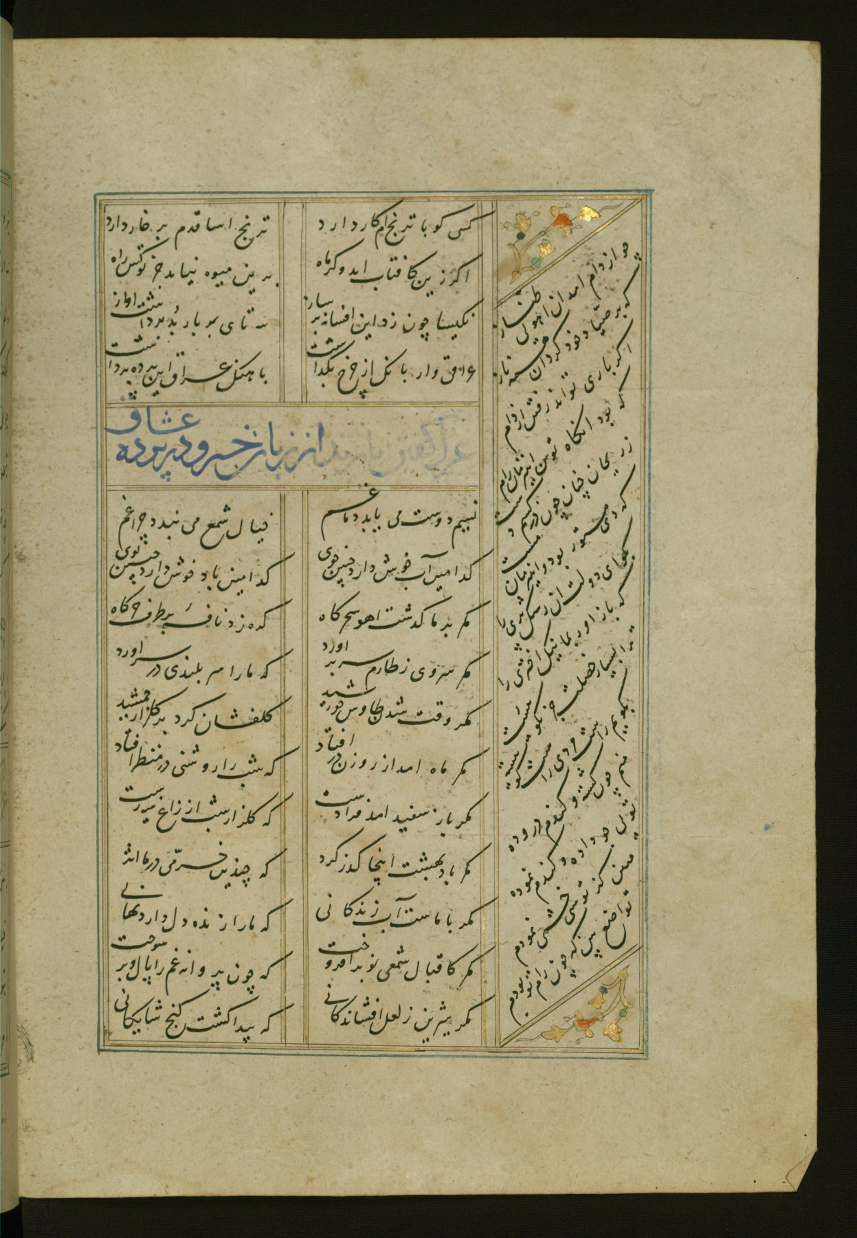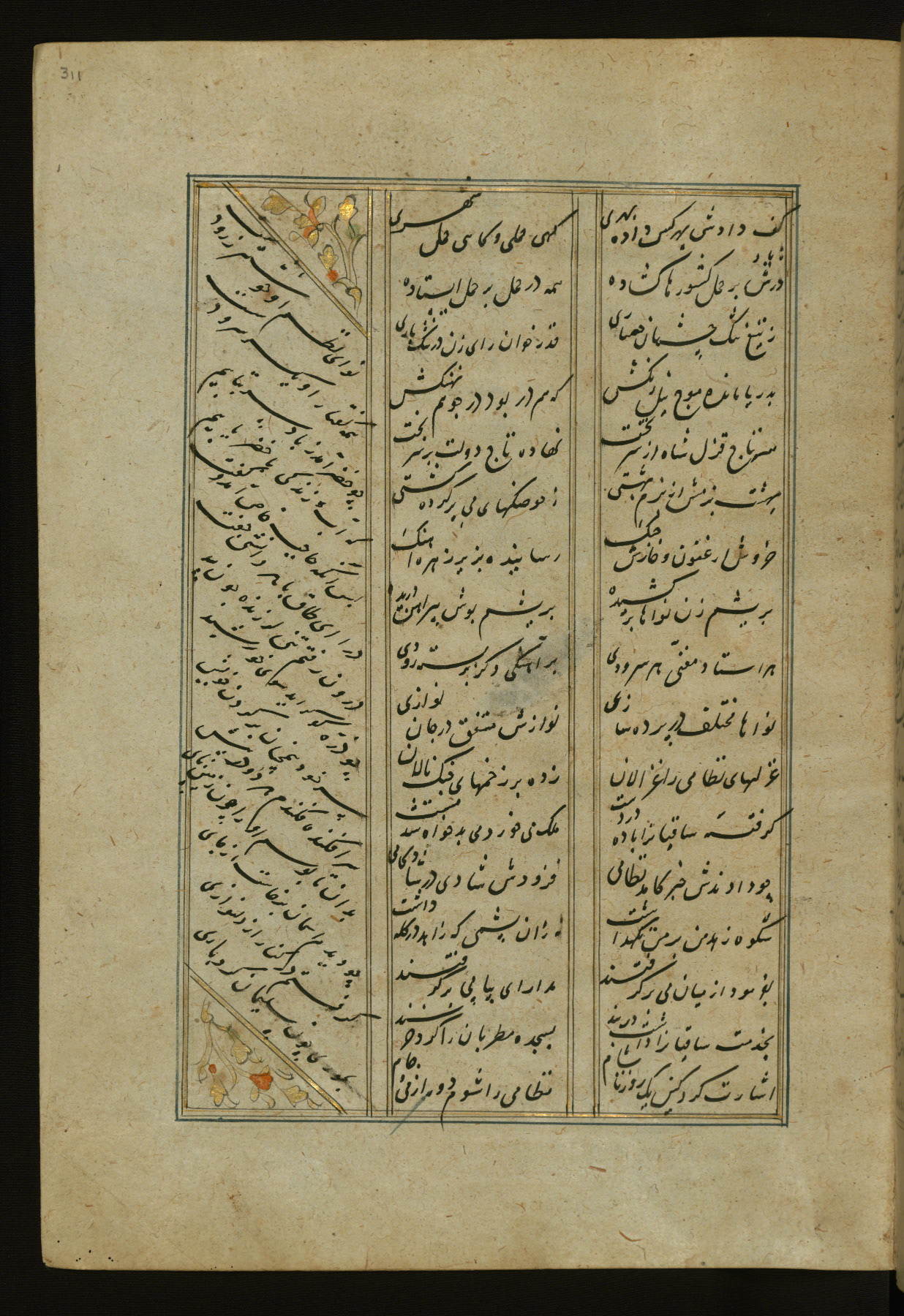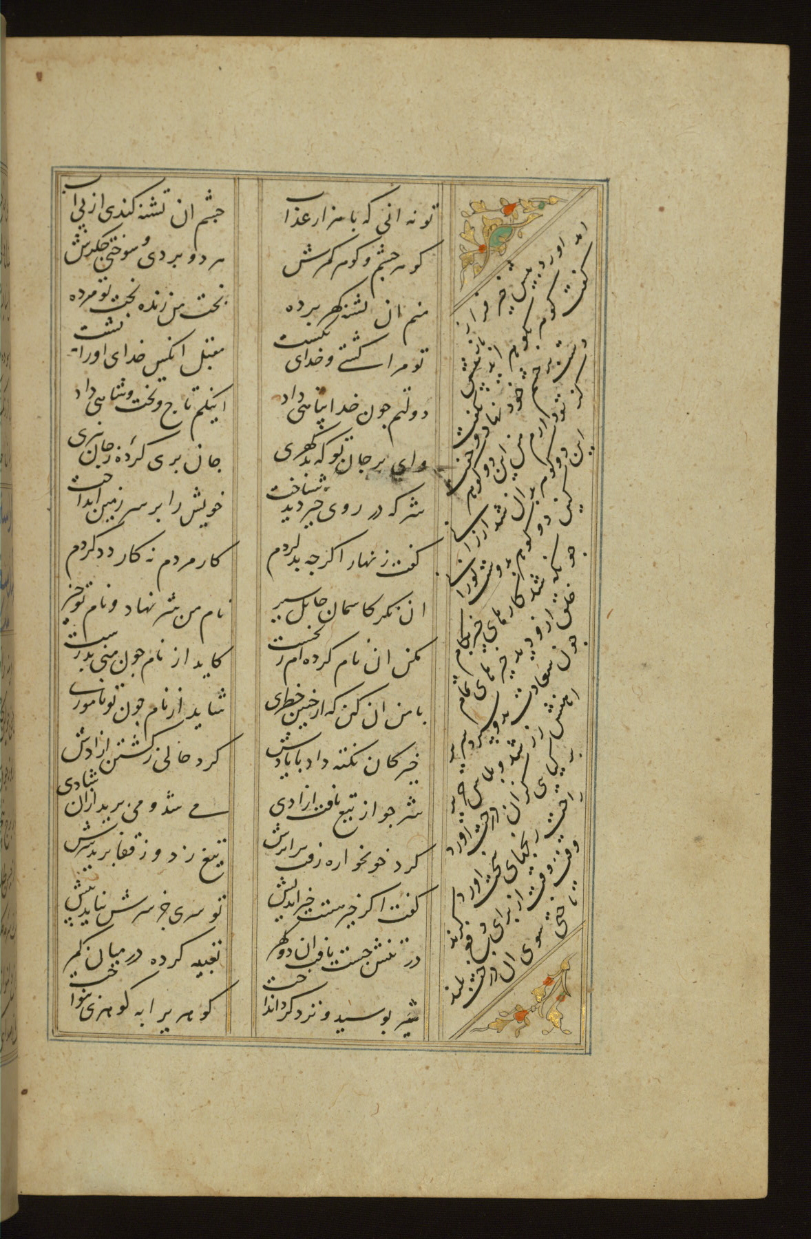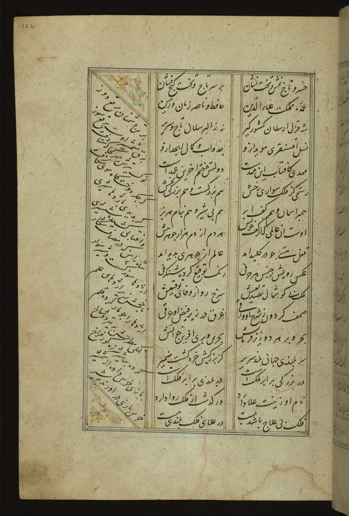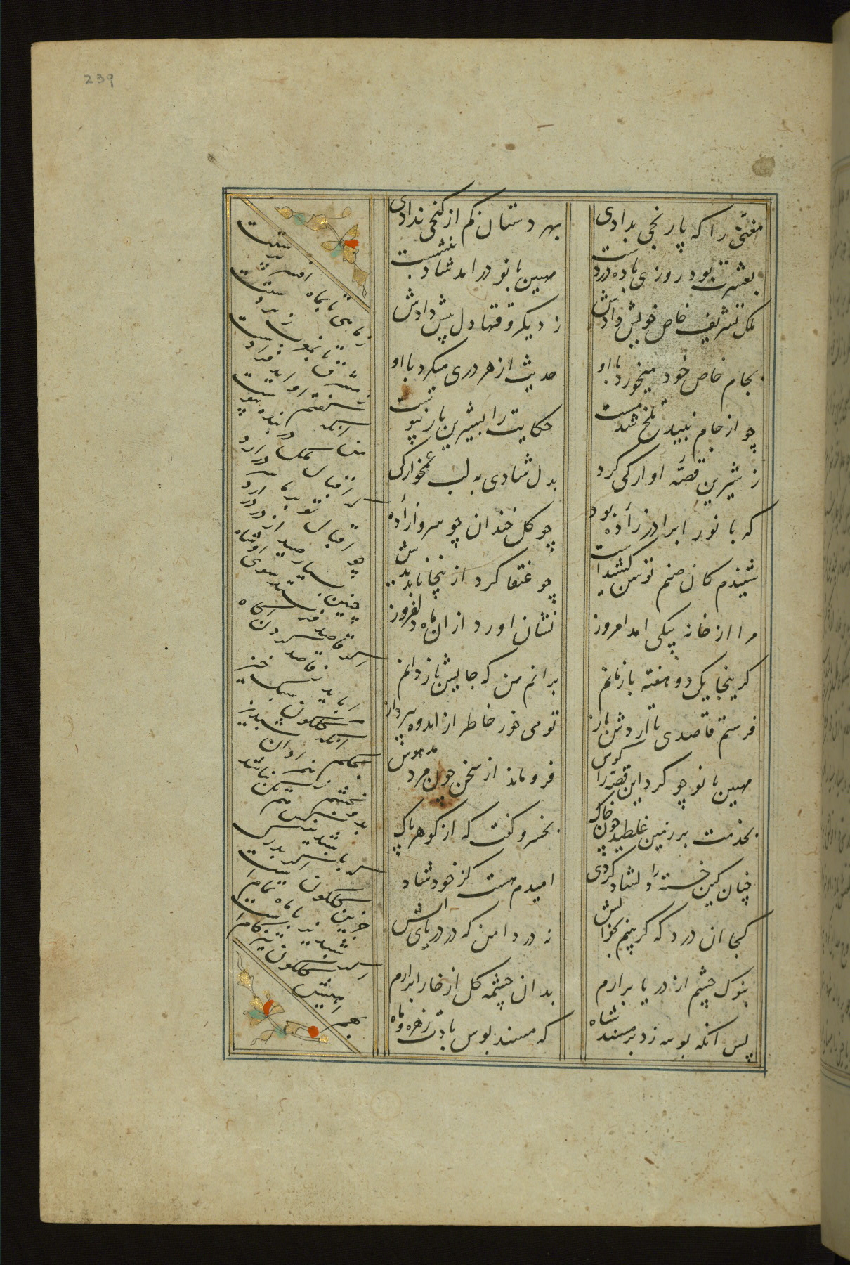 This copy of the Khamsah (quintet) of Niẓāmī Ganjavī (d. 605 AH / 1209 CE) was written by Abū Bakr Shāh ibn Ḥasan ibn ʿAlī al-Shahrastānī and illuminated by Jamāl al-Dīn ibn Muḥammad al-Ṣiddīqī al-Iṣfahānī between 892 AH / 1486 CE and 900 AH / 1494-5 CE. The manuscript opens with a double-page illuminated frontispiece with an inscription giving the title of the work and the name of the author (fols. 1b-2a). There are four illuminated titlepieces with the names of the individual poems and twenty-six repainted illustrations. According to evidence supplied by the colophons, the original binding was by the hand of Jamāl al-Dīn ibn Muḥammad al-Ṣiddīqī al-Iṣfahānī, as well. Unfortunately, it has not survived. The binding presently attached to the manuscript dates to the twelfth century AH / eighteenth CE.