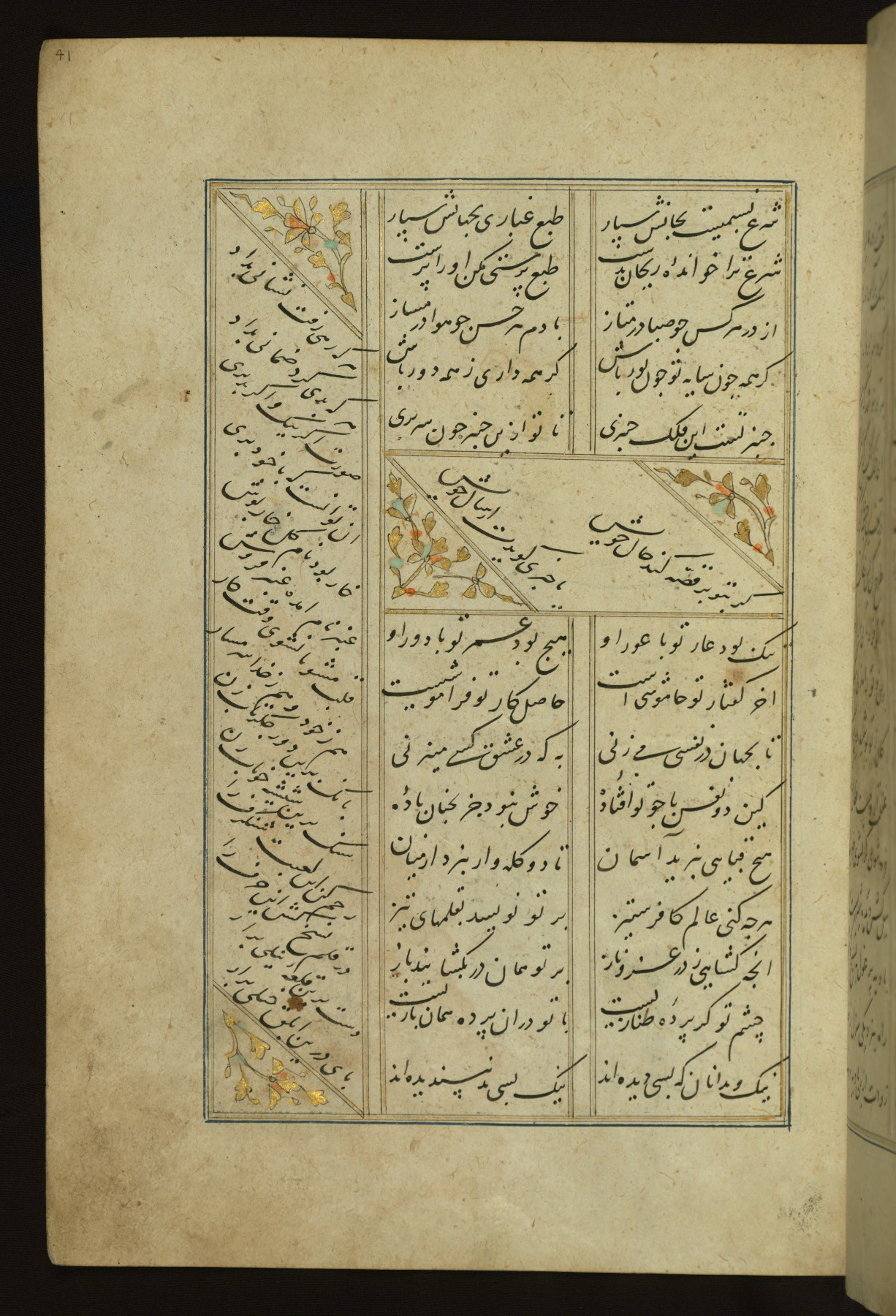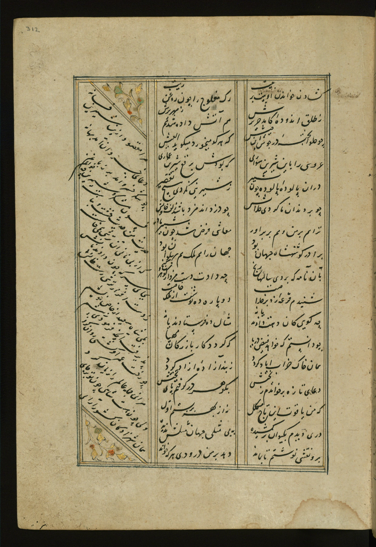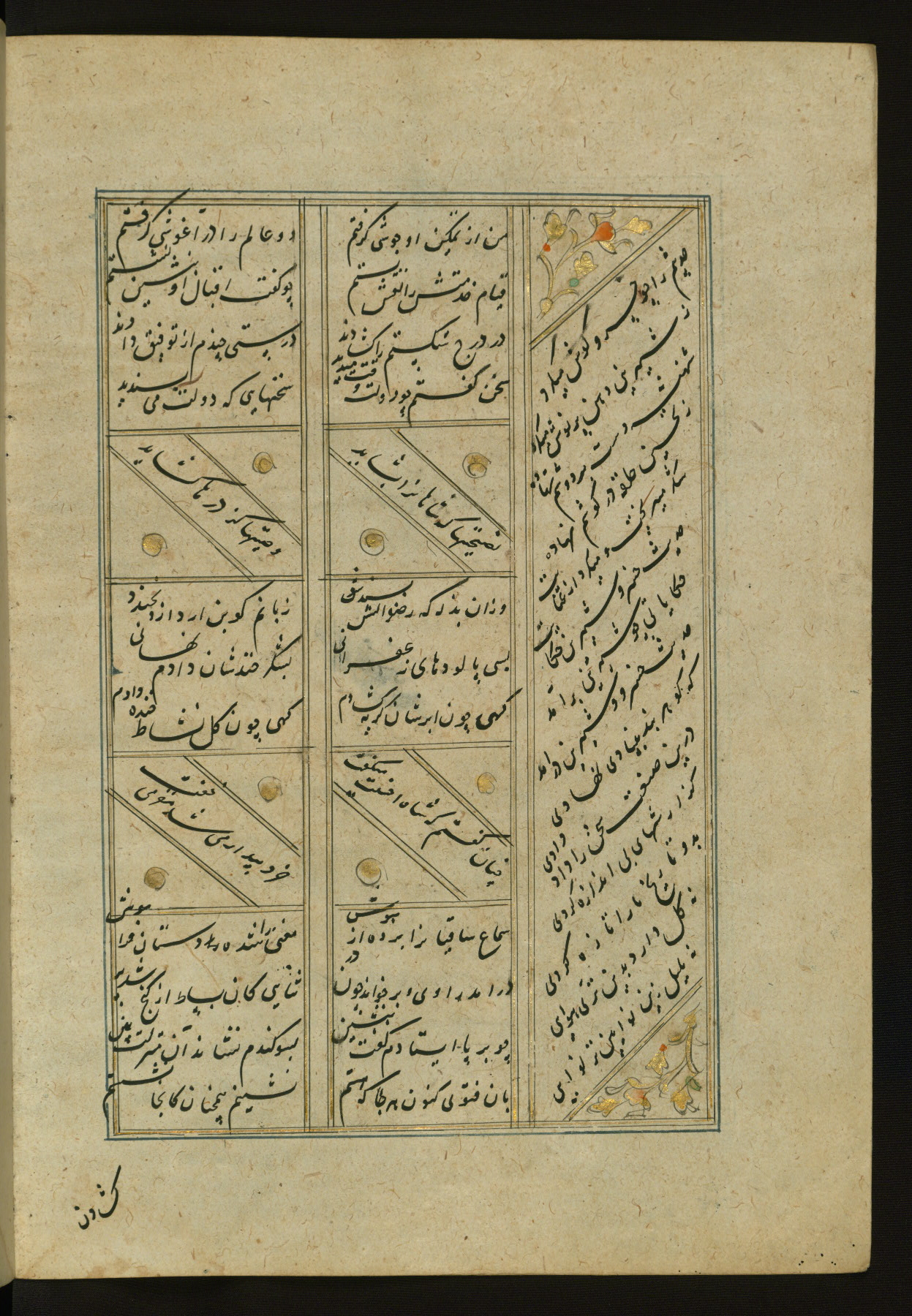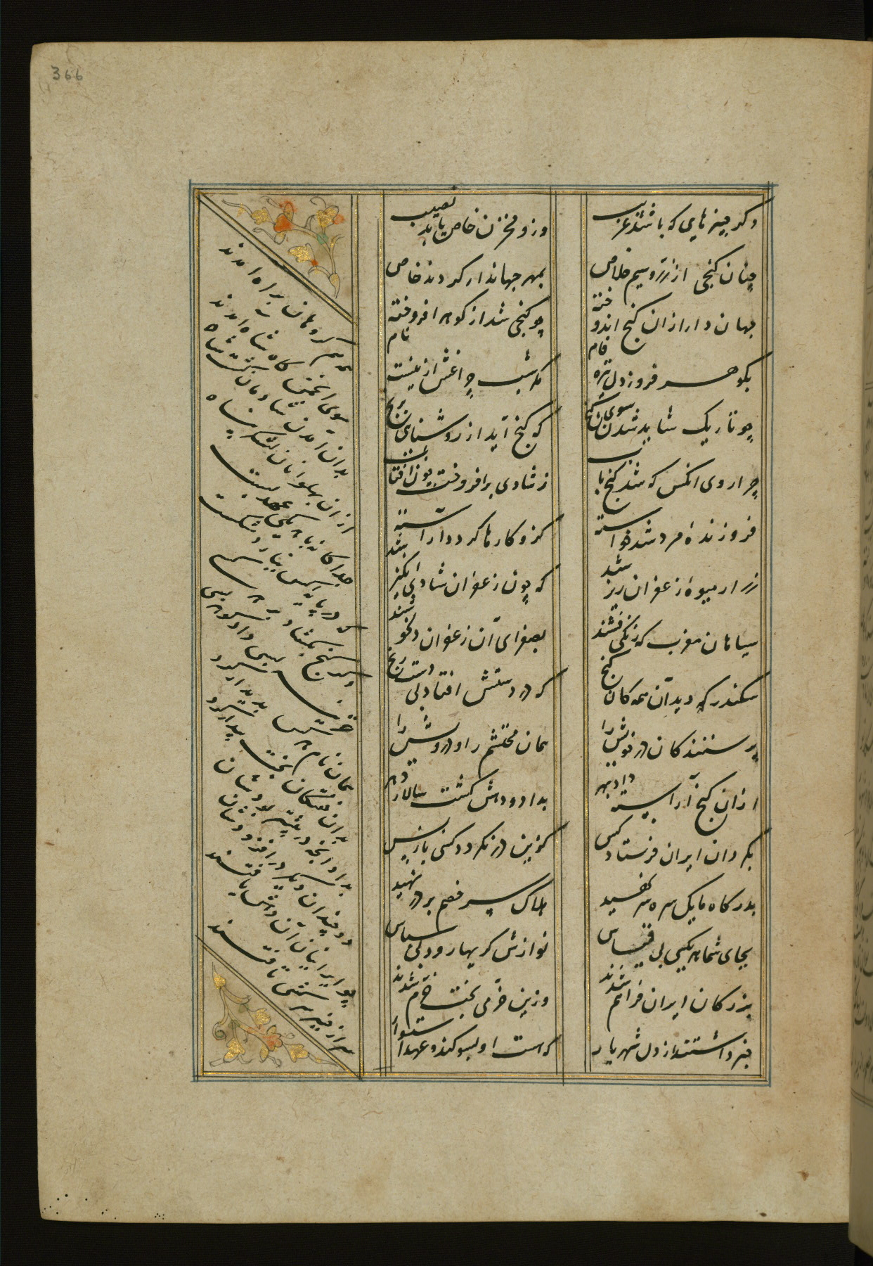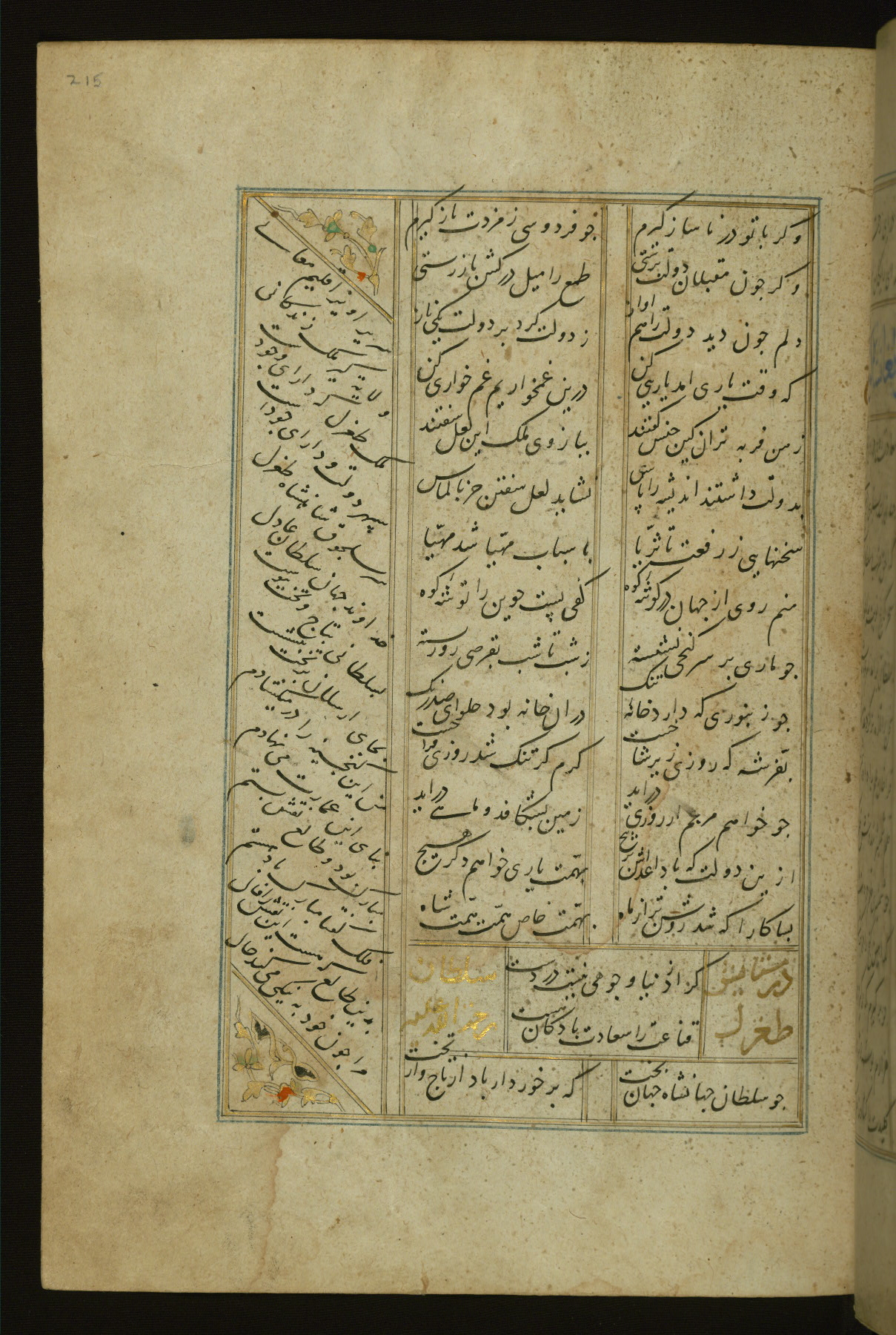 This copy of the Khamsah (quintet) of Niẓāmī Ganjavī (d. 605 AH / 1209 CE) was written by Abū Bakr Shāh ibn Ḥasan ibn ʿAlī al-Shahrastānī and illuminated by Jamāl al-Dīn ibn Muḥammad al-Ṣiddīqī al-Iṣfahānī between 892 AH / 1486 CE and 900 AH / 1494-5 CE. The manuscript opens with a double-page illuminated frontispiece with an inscription giving the title of the work and the name of the author (fols. 1b-2a). There are four illuminated titlepieces with the names of the individual poems and twenty-six repainted illustrations. According to evidence supplied by the colophons, the original binding was by the hand of Jamāl al-Dīn ibn Muḥammad al-Ṣiddīqī al-Iṣfahānī, as well. Unfortunately, it has not survived. The binding presently attached to the manuscript dates to the twelfth century AH / eighteenth CE.
