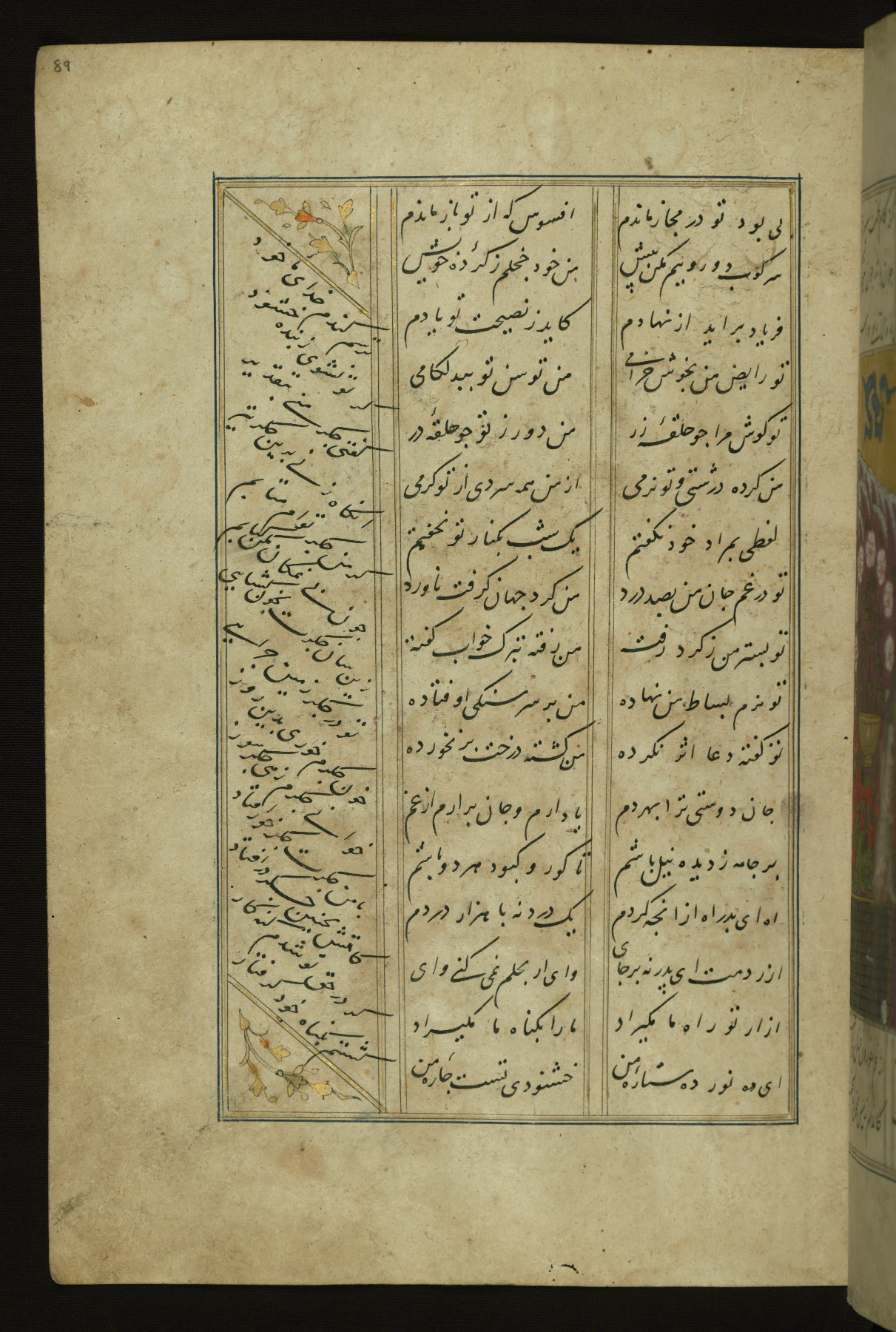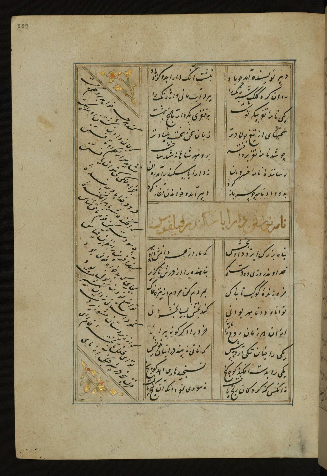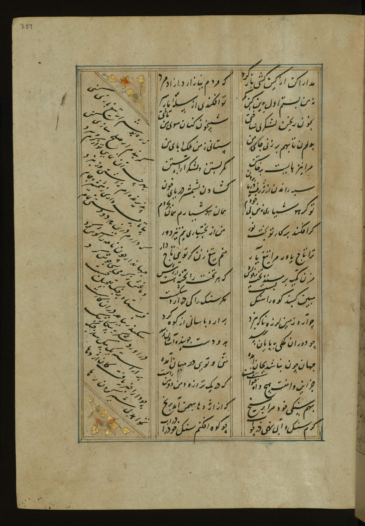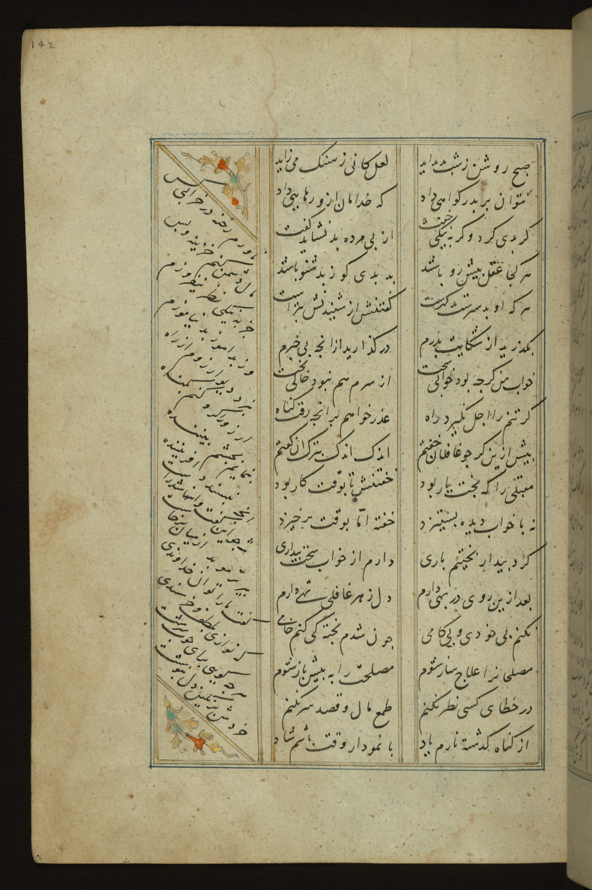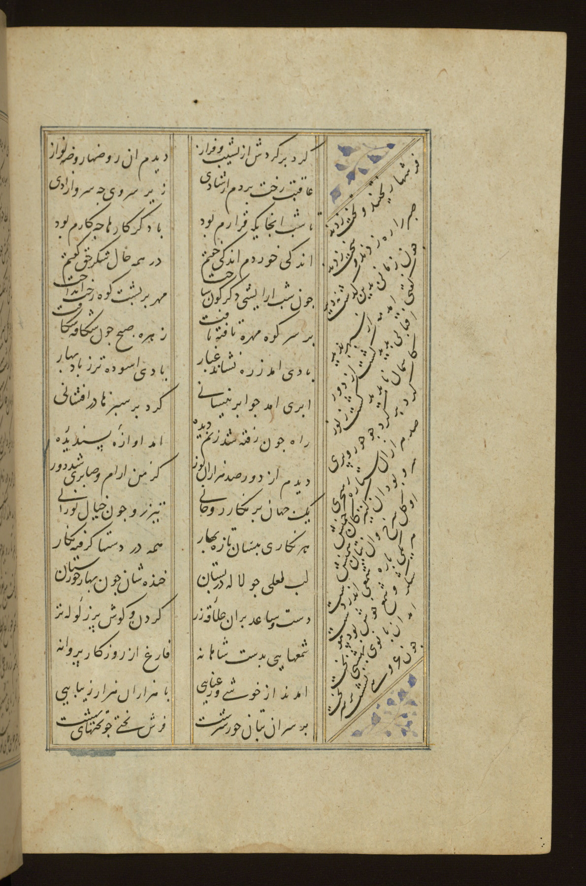 This copy of the Khamsah (quintet) of Niẓāmī Ganjavī (d. 605 AH / 1209 CE) was written by Abū Bakr Shāh ibn Ḥasan ibn ʿAlī al-Shahrastānī and illuminated by Jamāl al-Dīn ibn Muḥammad al-Ṣiddīqī al-Iṣfahānī between 892 AH / 1486 CE and 900 AH / 1494-5 CE. The manuscript opens with a double-page illuminated frontispiece with an inscription giving the title of the work and the name of the author (fols. 1b-2a). There are four illuminated titlepieces with the names of the individual poems and twenty-six repainted illustrations. According to evidence supplied by the colophons, the original binding was by the hand of Jamāl al-Dīn ibn Muḥammad al-Ṣiddīqī al-Iṣfahānī, as well. Unfortunately, it has not survived. The binding presently attached to the manuscript dates to the twelfth century AH / eighteenth CE.