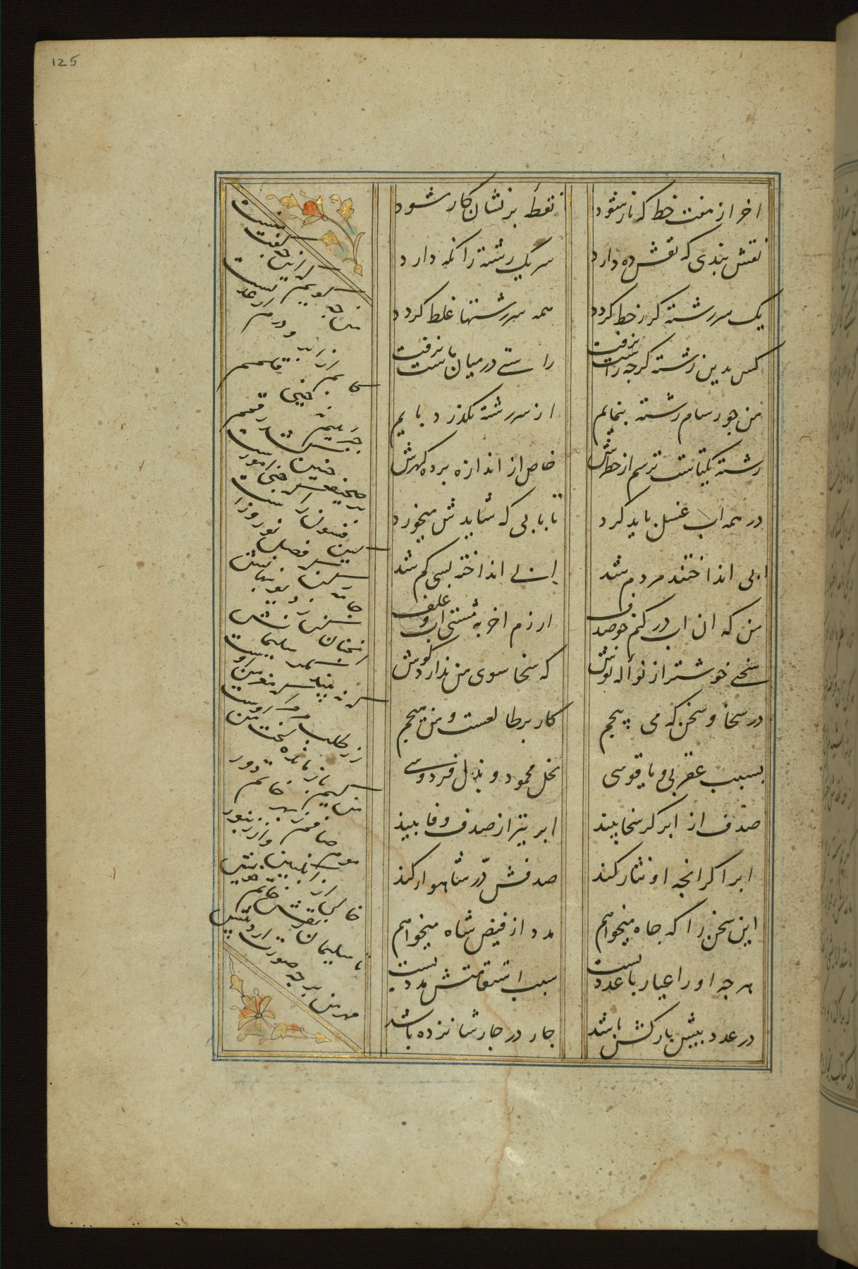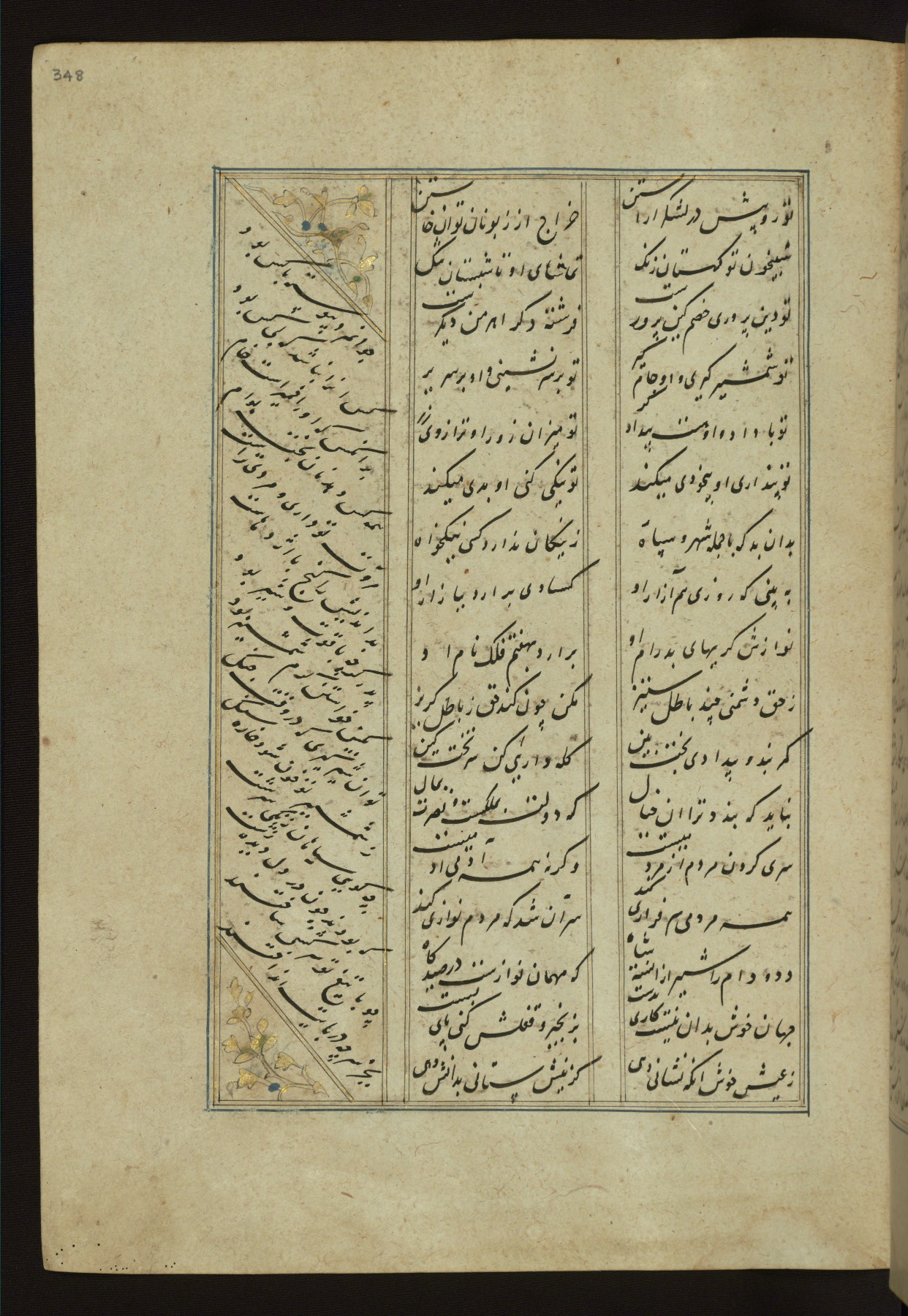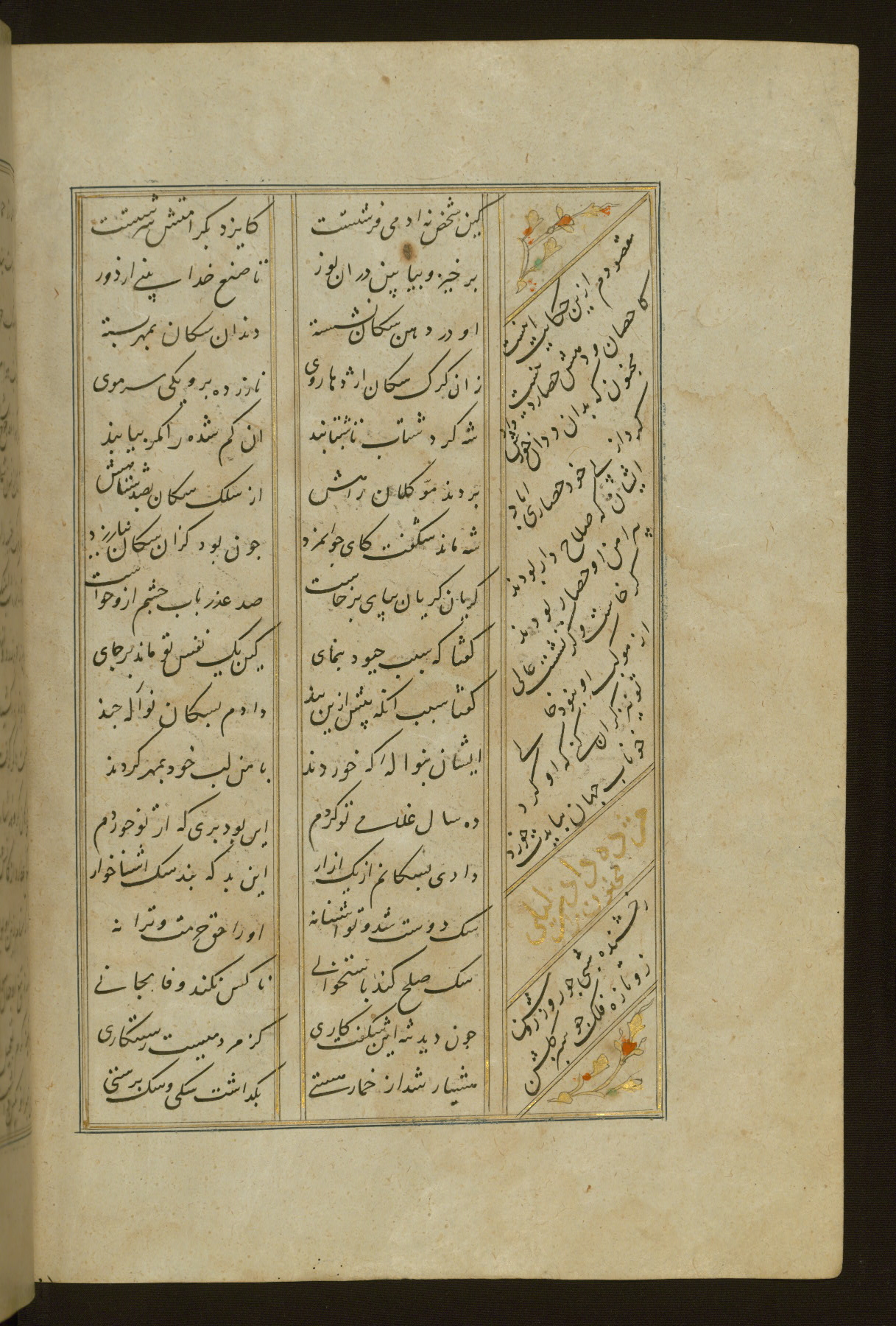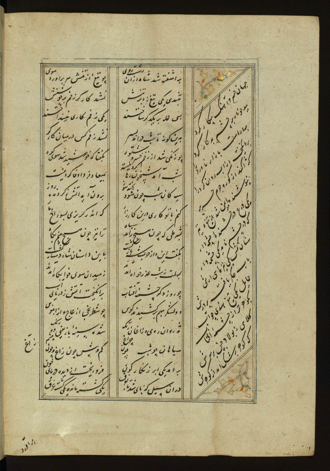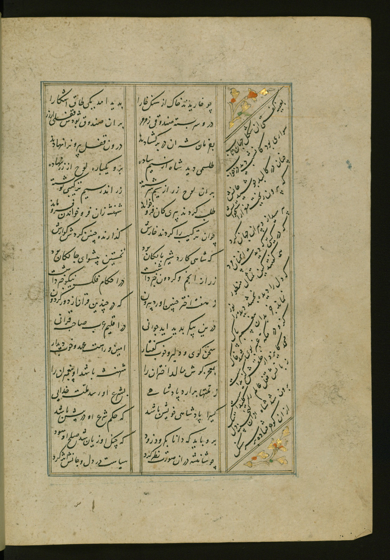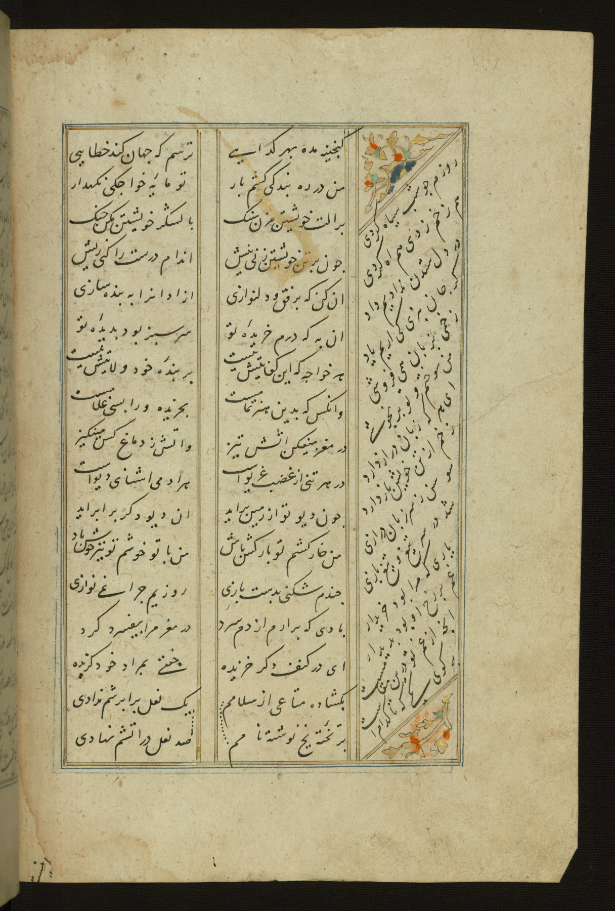 This copy of the Khamsah (quintet) of Niẓāmī Ganjavī (d. 605 AH / 1209 CE) was written by Abū Bakr Shāh ibn Ḥasan ibn ʿAlī al-Shahrastānī and illuminated by Jamāl al-Dīn ibn Muḥammad al-Ṣiddīqī al-Iṣfahānī between 892 AH / 1486 CE and 900 AH / 1494-5 CE. The manuscript opens with a double-page illuminated frontispiece with an inscription giving the title of the work and the name of the author (fols. 1b-2a). There are four illuminated titlepieces with the names of the individual poems and twenty-six repainted illustrations. According to evidence supplied by the colophons, the original binding was by the hand of Jamāl al-Dīn ibn Muḥammad al-Ṣiddīqī al-Iṣfahānī, as well. Unfortunately, it has not survived. The binding presently attached to the manuscript dates to the twelfth century AH / eighteenth CE.