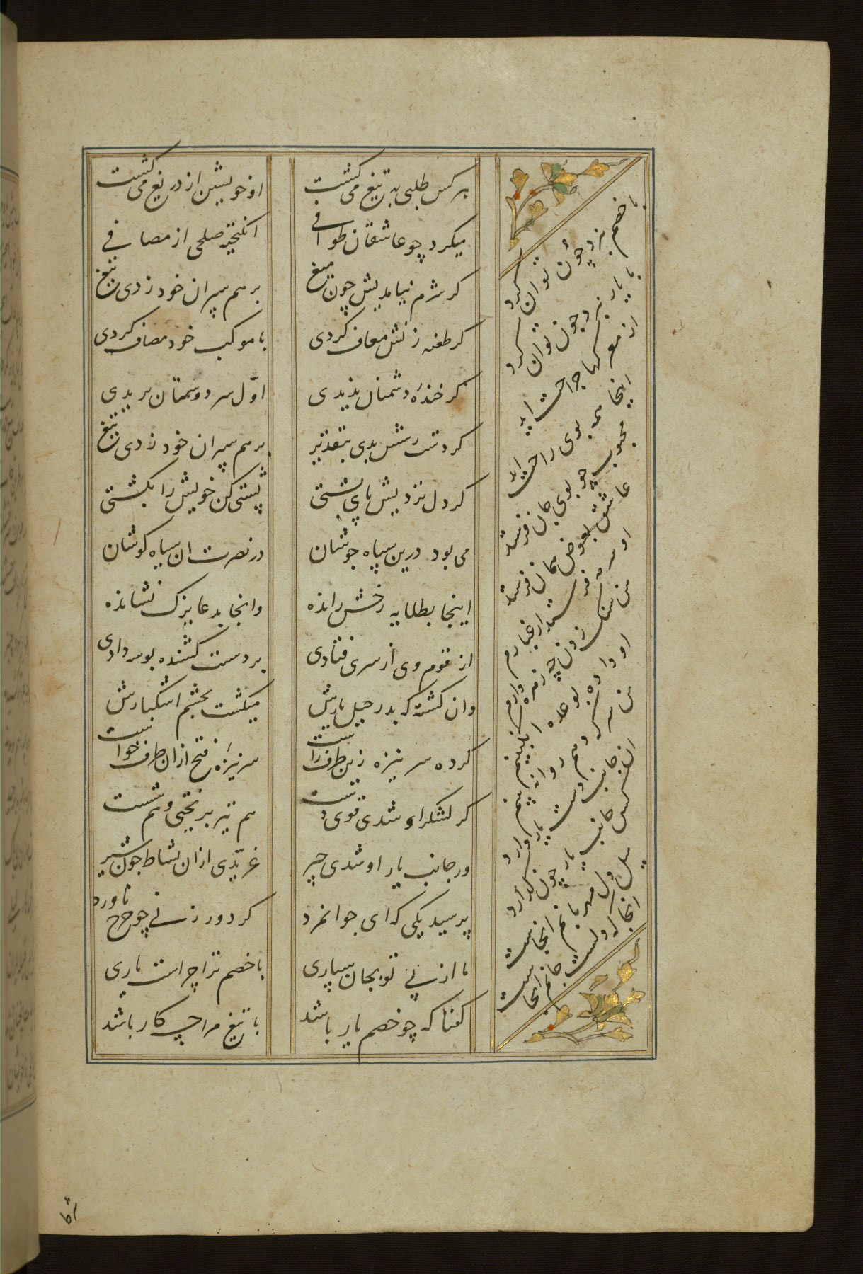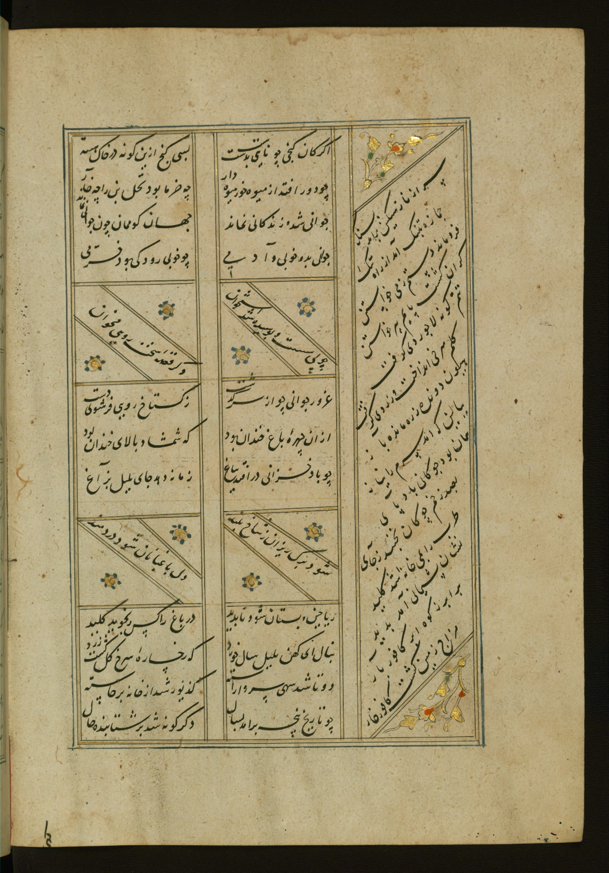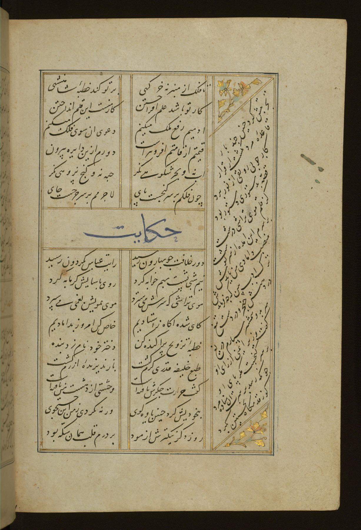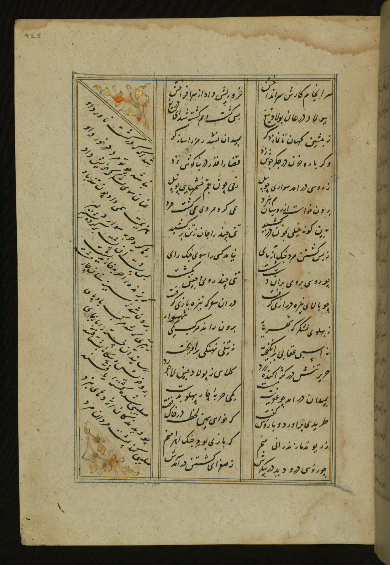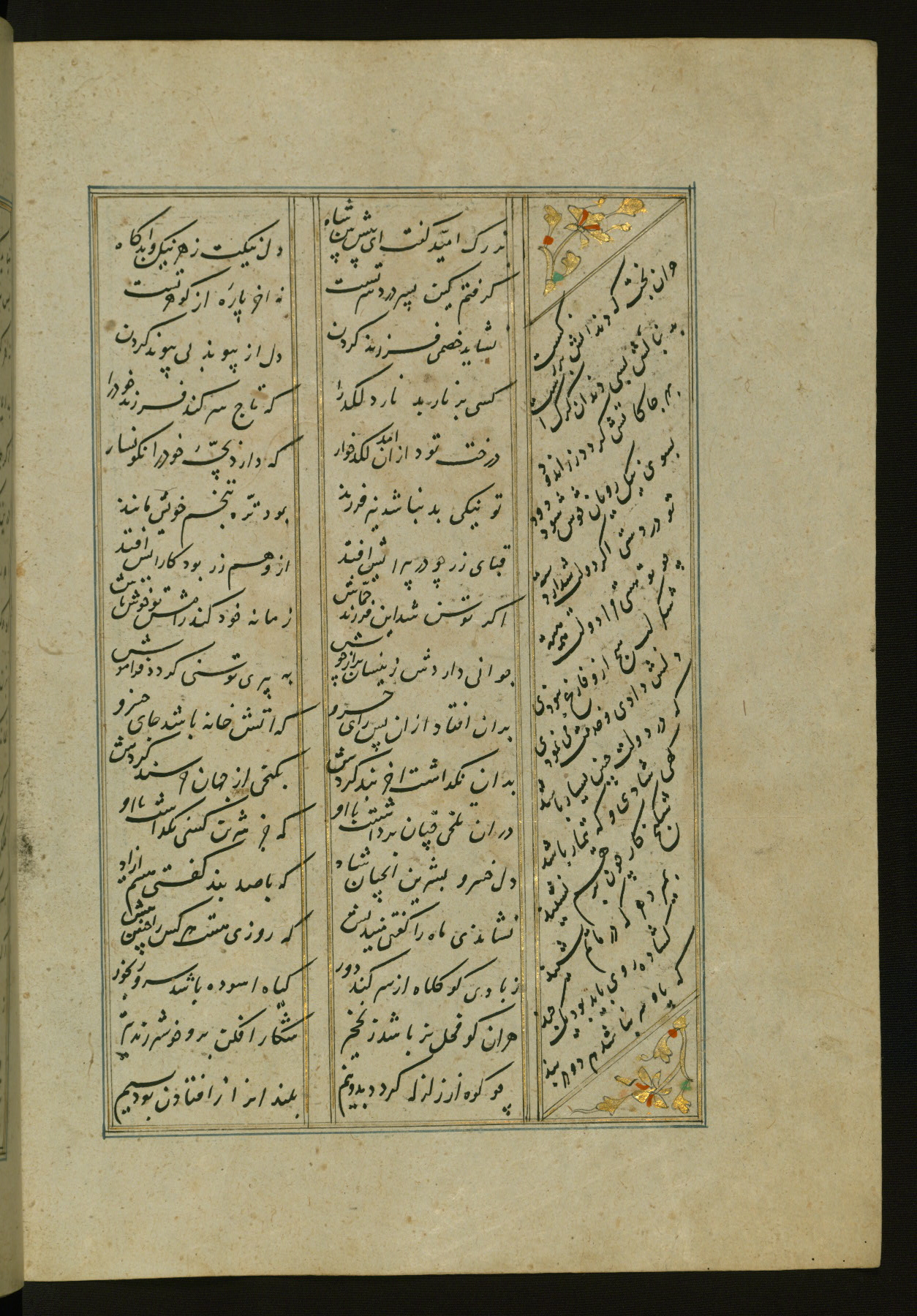 This copy of the Khamsah (quintet) of Niẓāmī Ganjavī (d. 605 AH / 1209 CE) was written by Abū Bakr Shāh ibn Ḥasan ibn ʿAlī al-Shahrastānī and illuminated by Jamāl al-Dīn ibn Muḥammad al-Ṣiddīqī al-Iṣfahānī between 892 AH / 1486 CE and 900 AH / 1494-5 CE. The manuscript opens with a double-page illuminated frontispiece with an inscription giving the title of the work and the name of the author (fols. 1b-2a). There are four illuminated titlepieces with the names of the individual poems and twenty-six repainted illustrations. According to evidence supplied by the colophons, the original binding was by the hand of Jamāl al-Dīn ibn Muḥammad al-Ṣiddīqī al-Iṣfahānī, as well. Unfortunately, it has not survived. The binding presently attached to the manuscript dates to the twelfth century AH / eighteenth CE.