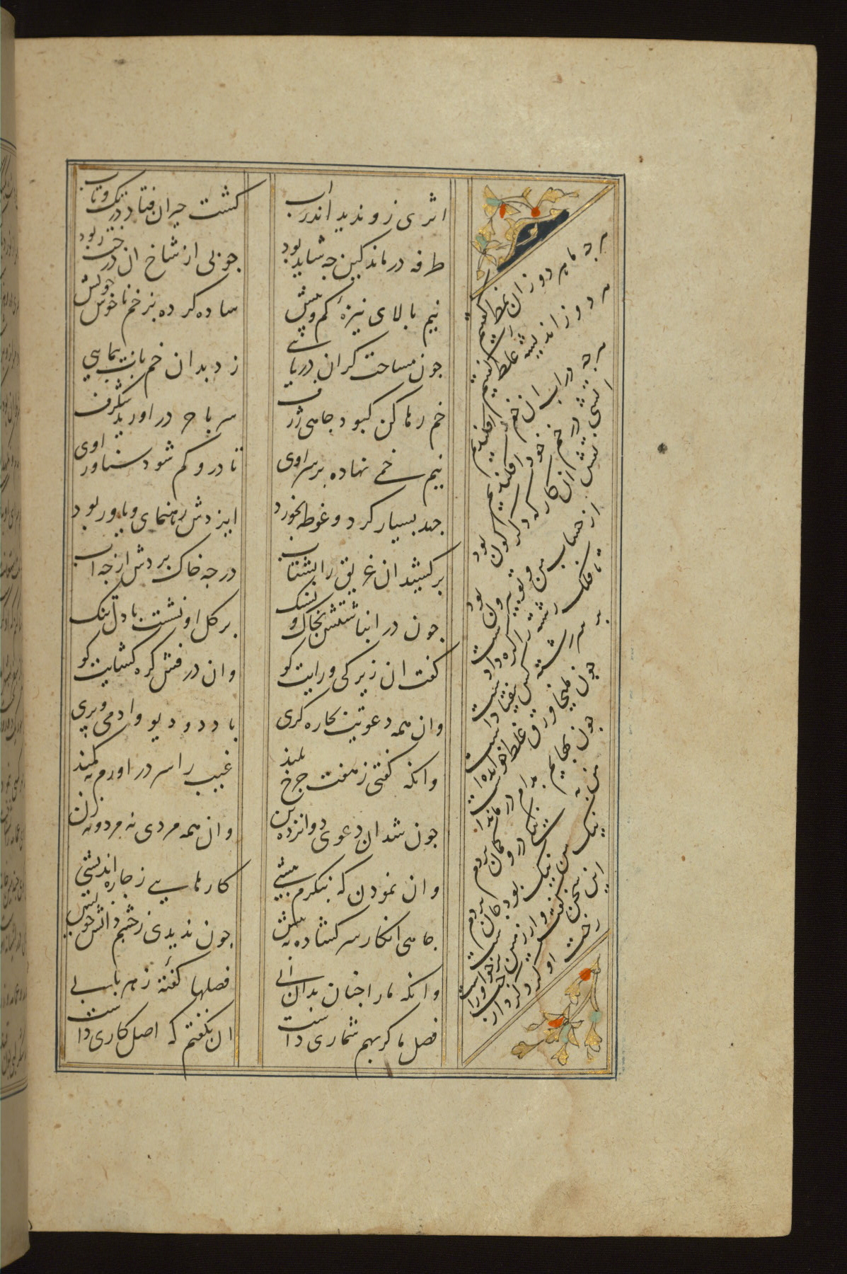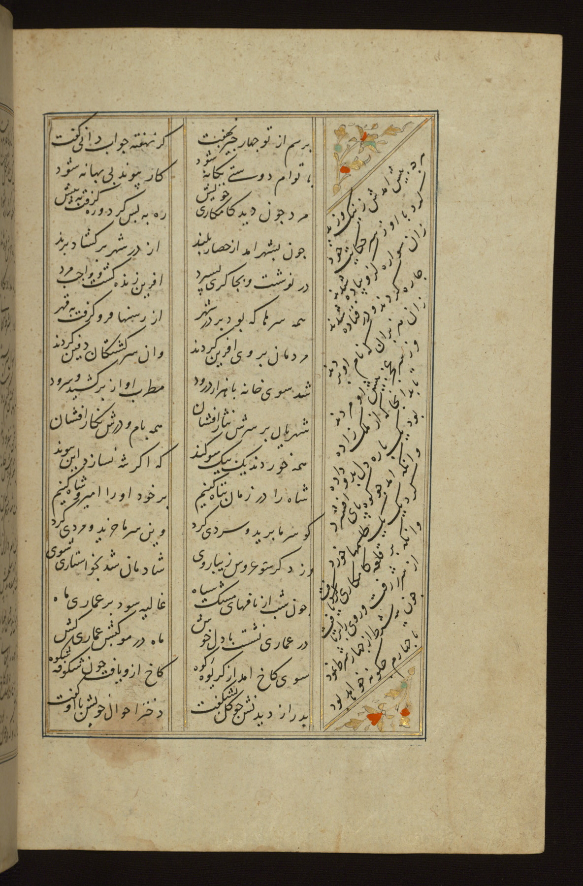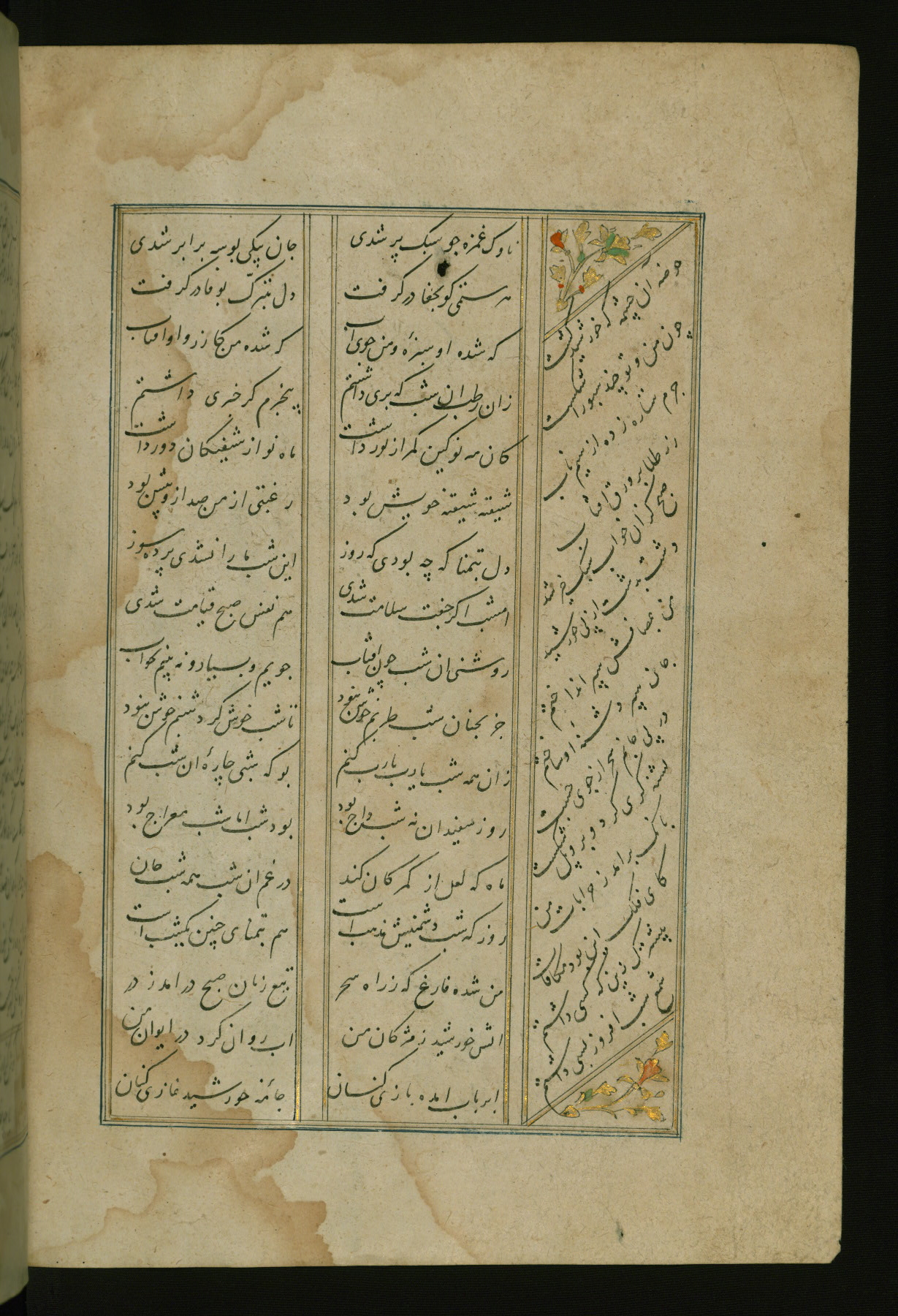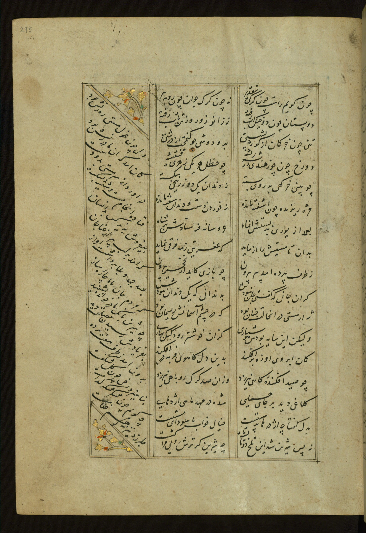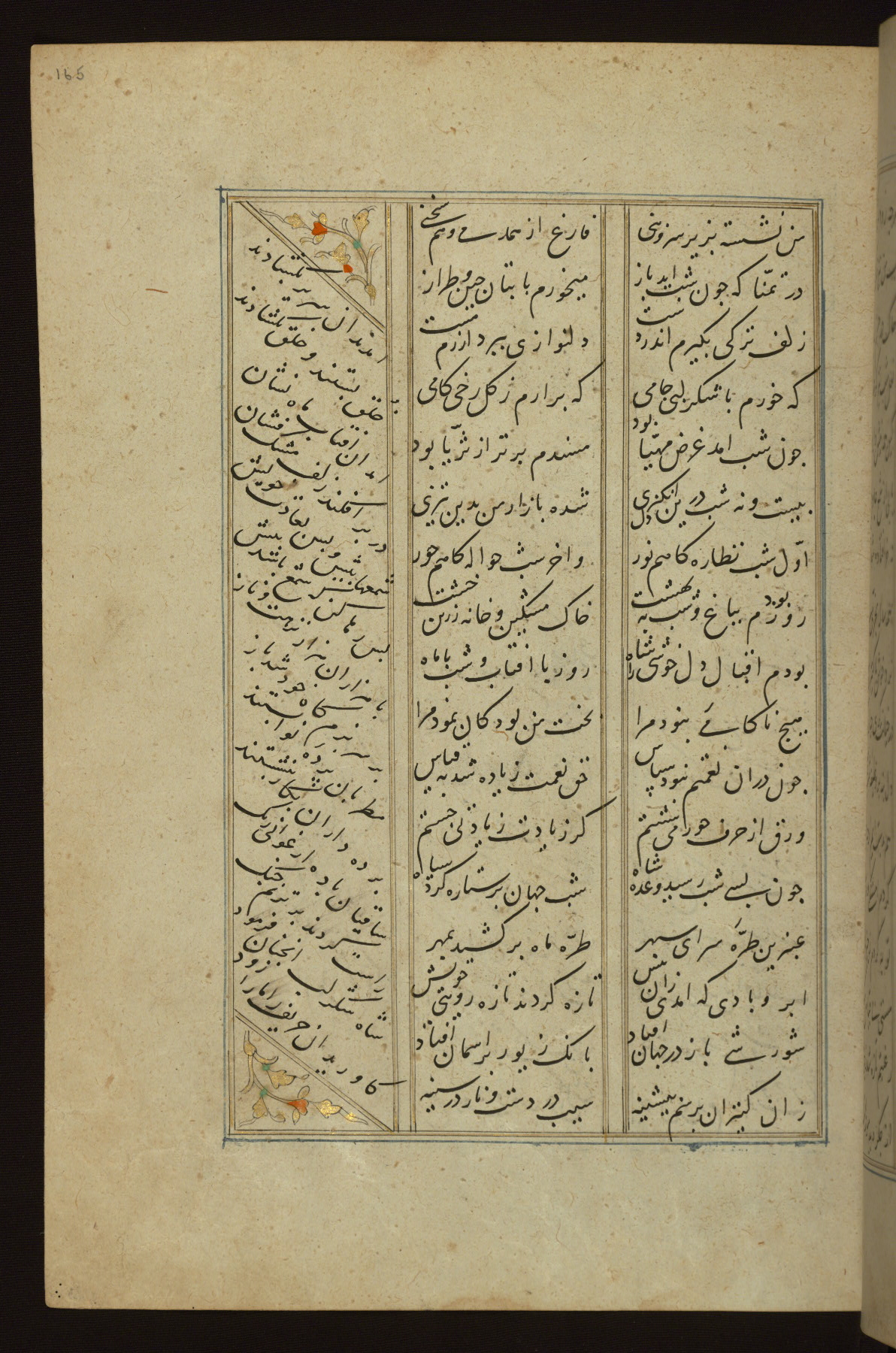 This copy of the Khamsah (quintet) of Niẓāmī Ganjavī (d. 605 AH / 1209 CE) was written by Abū Bakr Shāh ibn Ḥasan ibn ʿAlī al-Shahrastānī and illuminated by Jamāl al-Dīn ibn Muḥammad al-Ṣiddīqī al-Iṣfahānī between 892 AH / 1486 CE and 900 AH / 1494-5 CE. The manuscript opens with a double-page illuminated frontispiece with an inscription giving the title of the work and the name of the author (fols. 1b-2a). There are four illuminated titlepieces with the names of the individual poems and twenty-six repainted illustrations. According to evidence supplied by the colophons, the original binding was by the hand of Jamāl al-Dīn ibn Muḥammad al-Ṣiddīqī al-Iṣfahānī, as well. Unfortunately, it has not survived. The binding presently attached to the manuscript dates to the twelfth century AH / eighteenth CE.