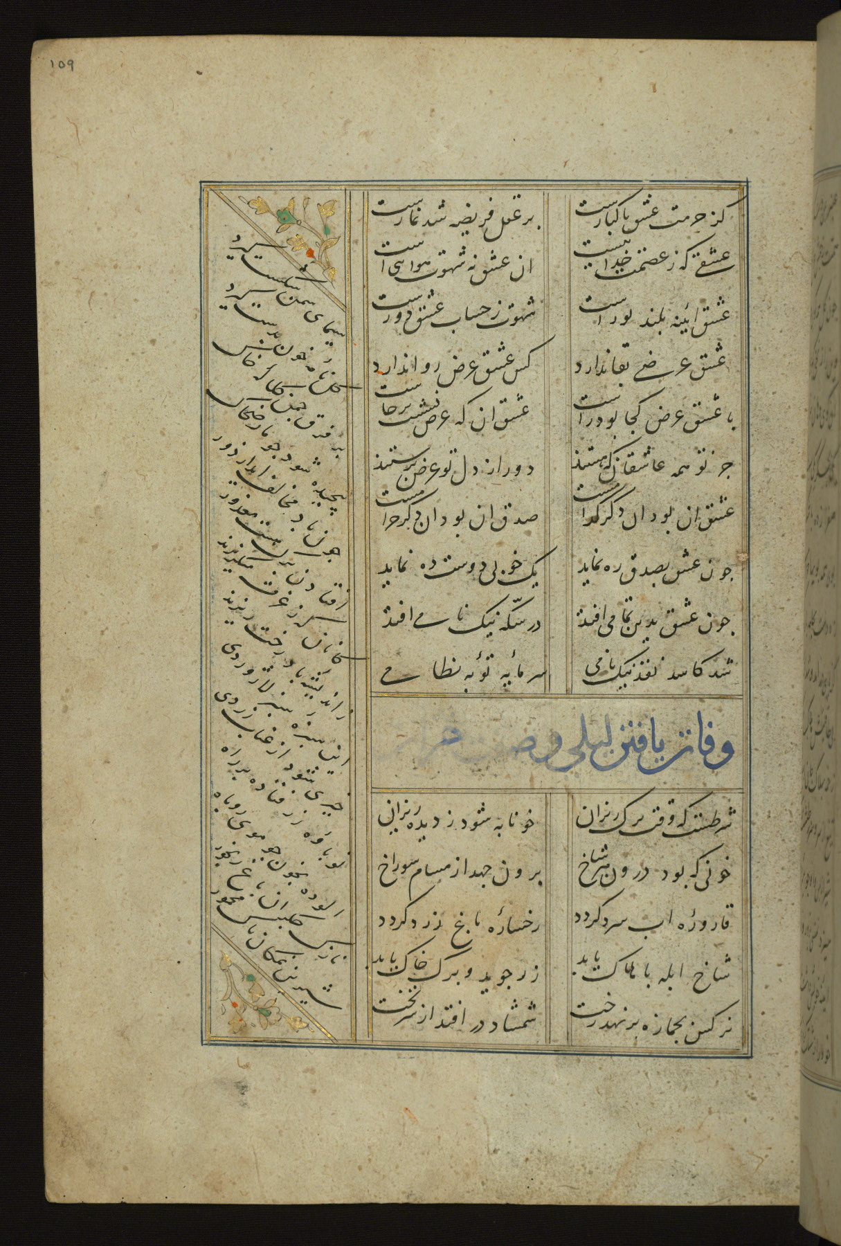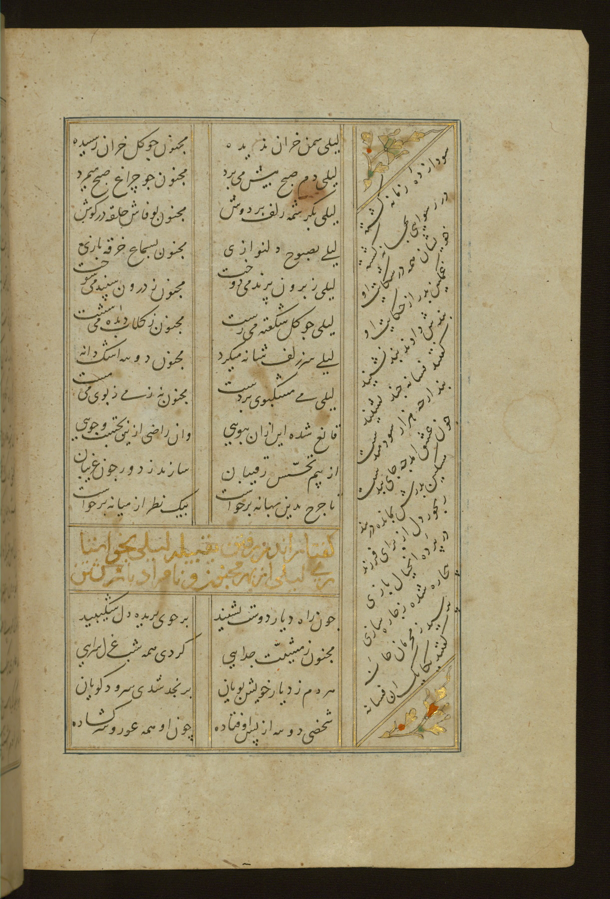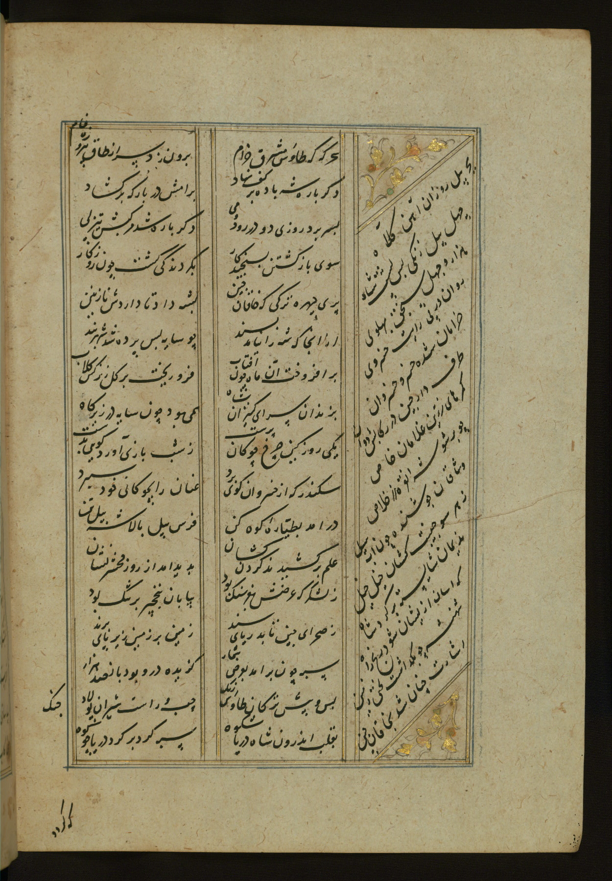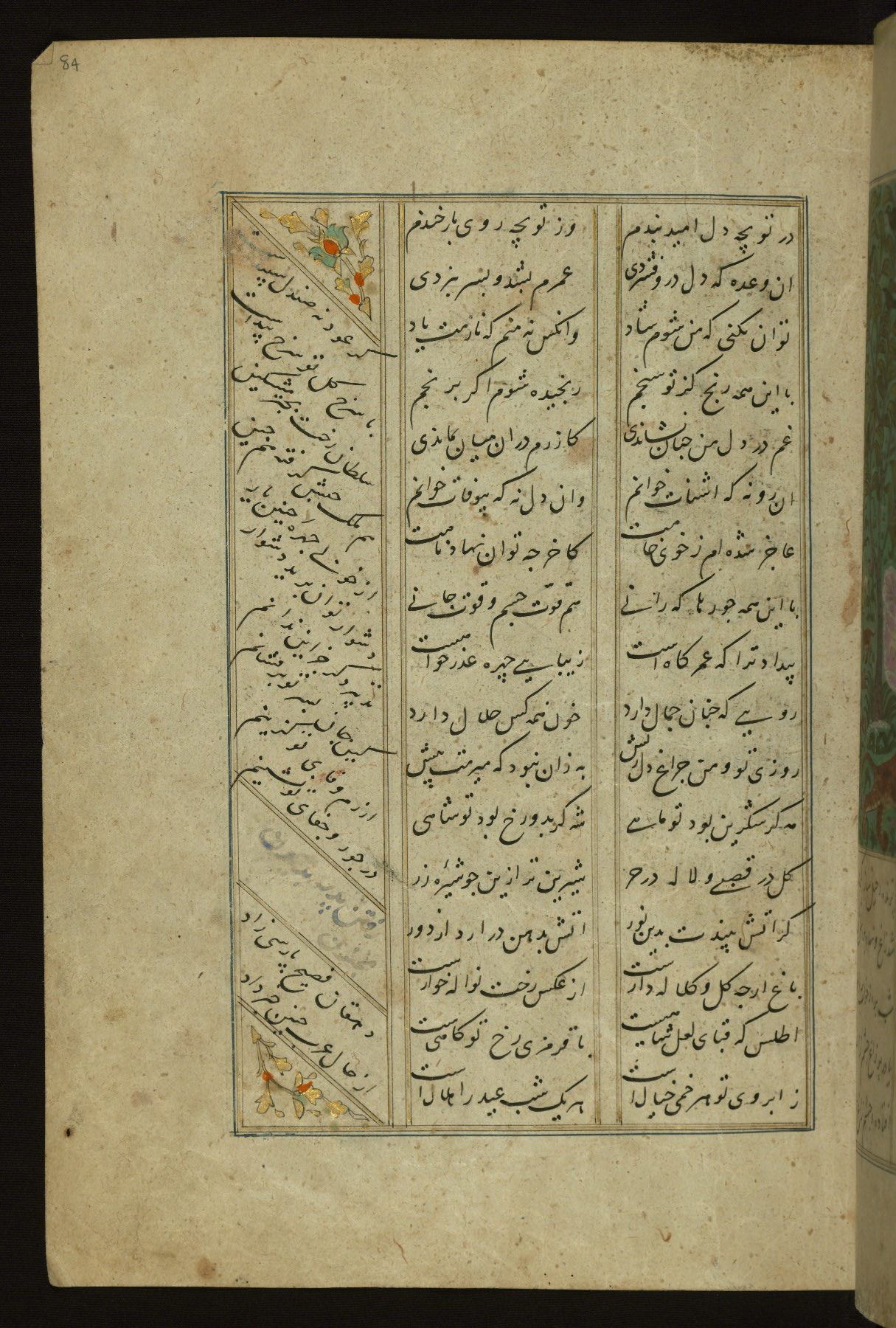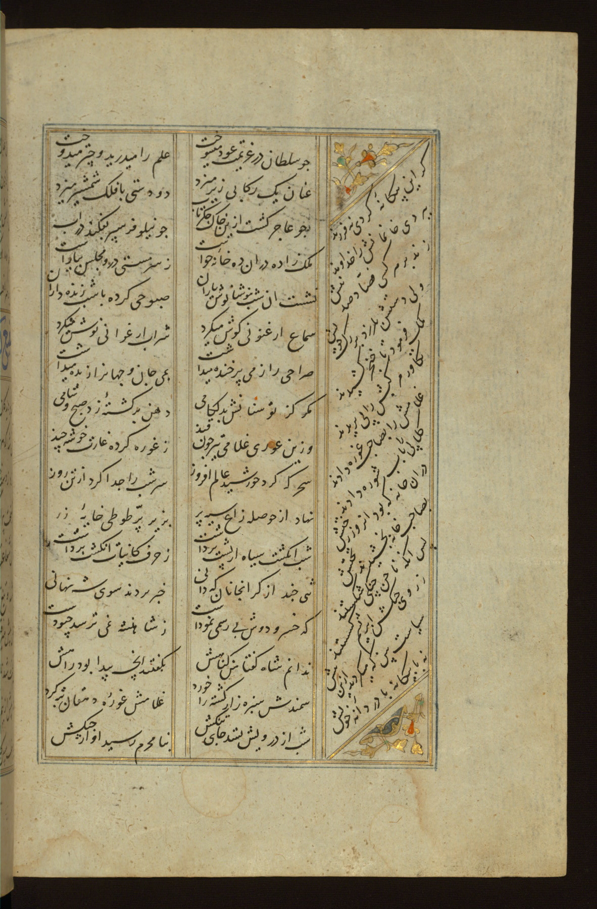 This copy of the Khamsah (quintet) of Niẓāmī Ganjavī (d. 605 AH / 1209 CE) was written by Abū Bakr Shāh ibn Ḥasan ibn ʿAlī al-Shahrastānī and illuminated by Jamāl al-Dīn ibn Muḥammad al-Ṣiddīqī al-Iṣfahānī between 892 AH / 1486 CE and 900 AH / 1494-5 CE. The manuscript opens with a double-page illuminated frontispiece with an inscription giving the title of the work and the name of the author (fols. 1b-2a). There are four illuminated titlepieces with the names of the individual poems and twenty-six repainted illustrations. According to evidence supplied by the colophons, the original binding was by the hand of Jamāl al-Dīn ibn Muḥammad al-Ṣiddīqī al-Iṣfahānī, as well. Unfortunately, it has not survived. The binding presently attached to the manuscript dates to the twelfth century AH / eighteenth CE.