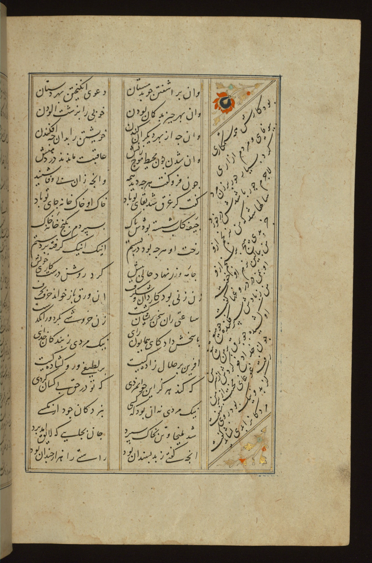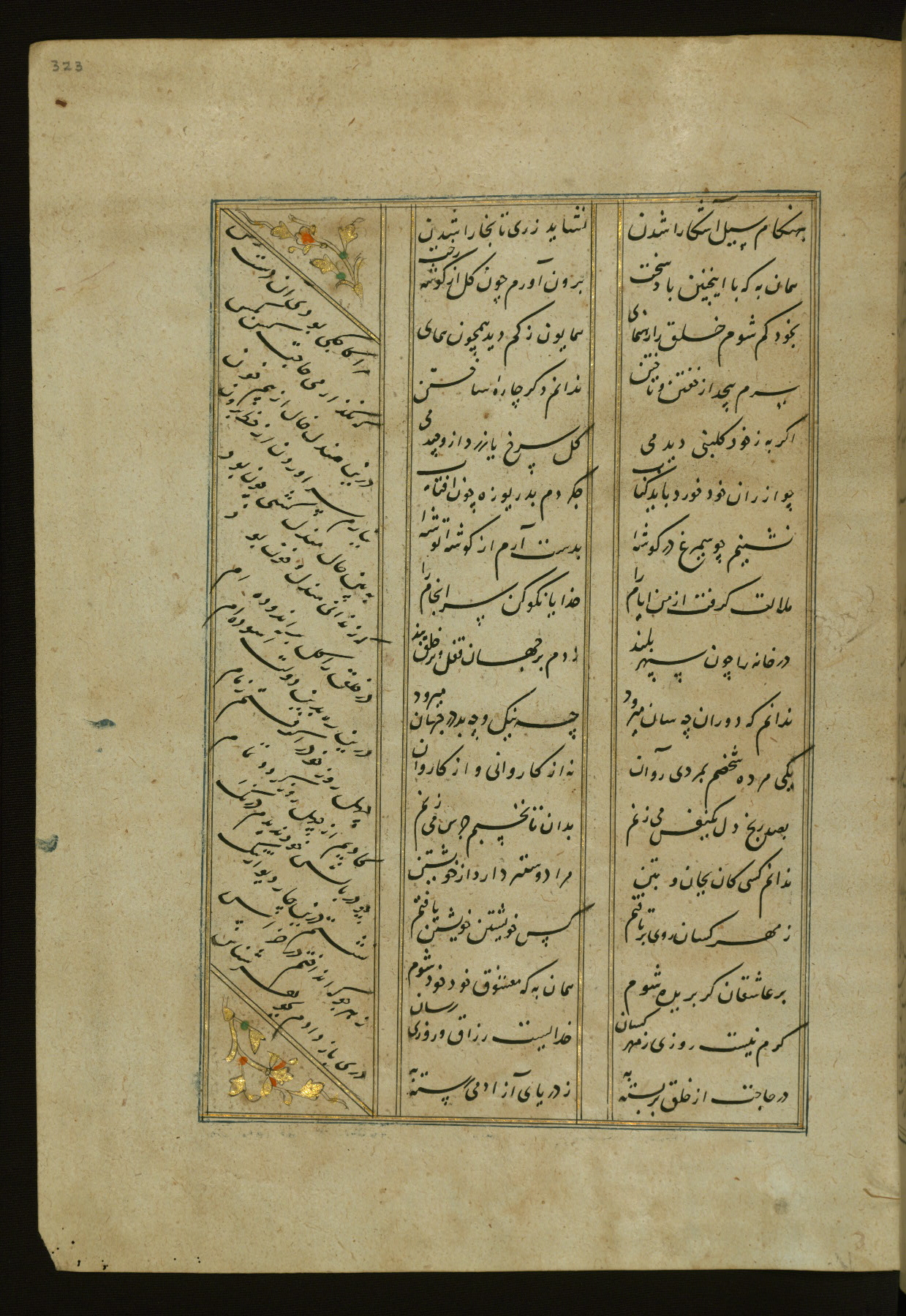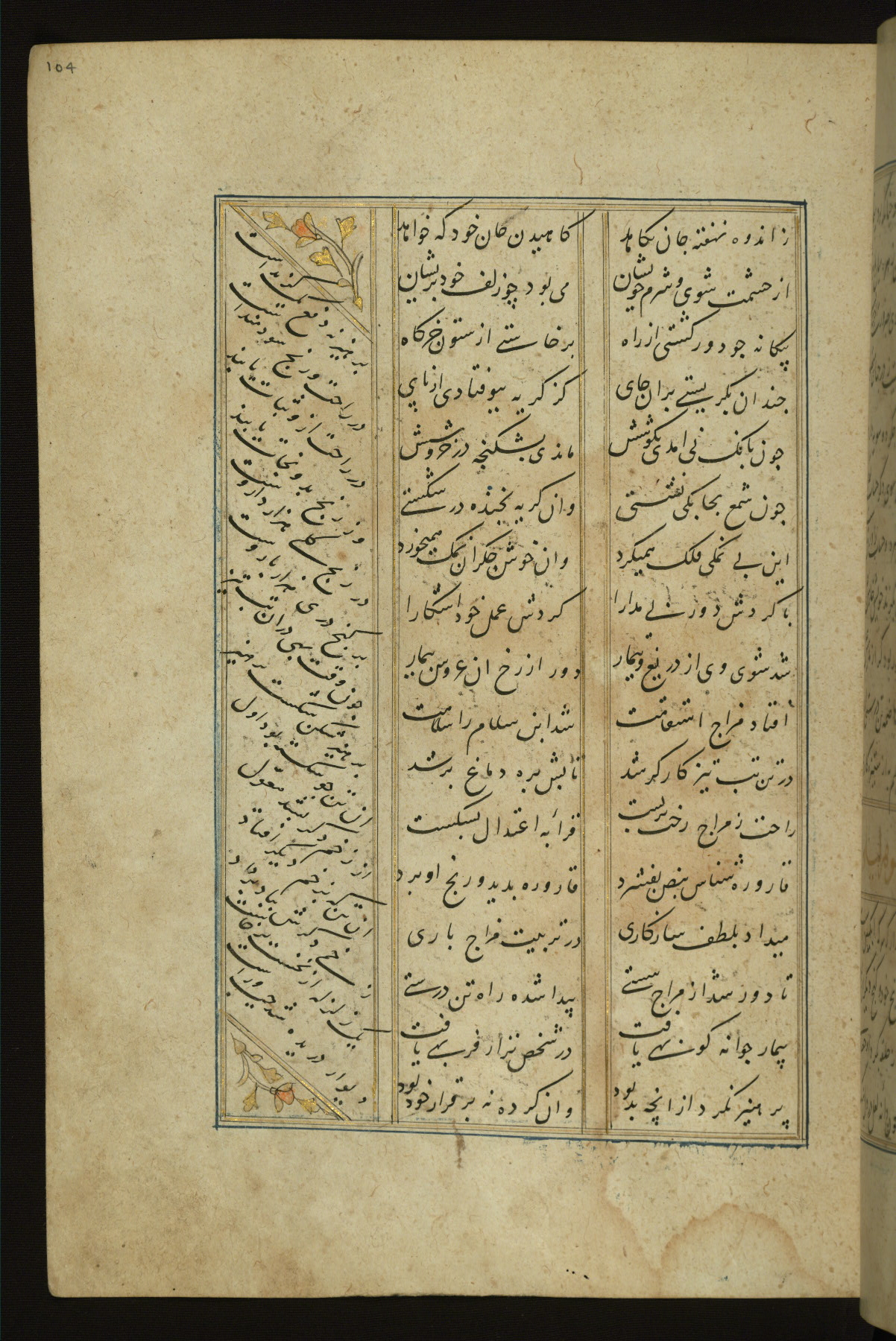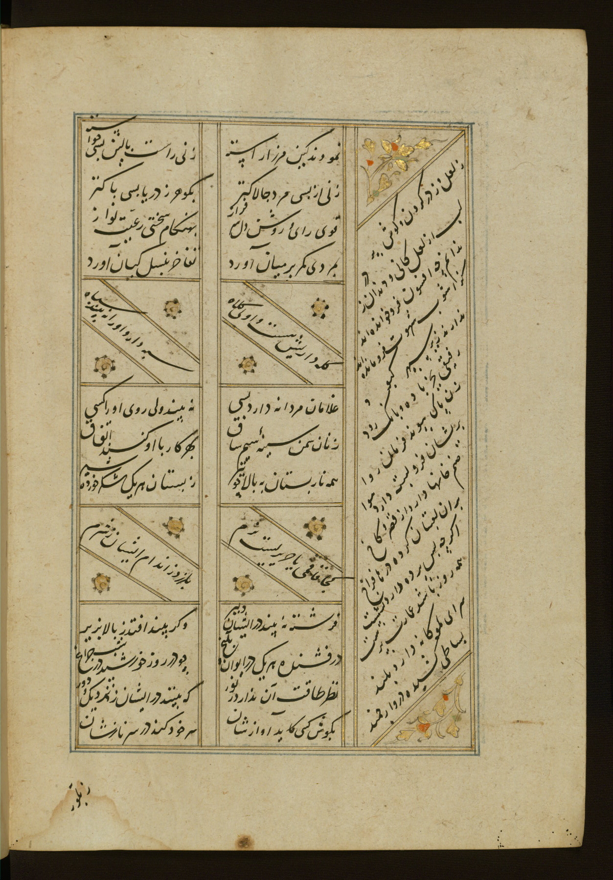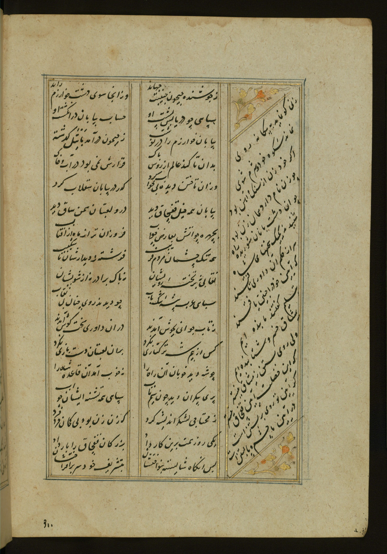 This copy of the Khamsah (quintet) of Niẓāmī Ganjavī (d. 605 AH / 1209 CE) was written by Abū Bakr Shāh ibn Ḥasan ibn ʿAlī al-Shahrastānī and illuminated by Jamāl al-Dīn ibn Muḥammad al-Ṣiddīqī al-Iṣfahānī between 892 AH / 1486 CE and 900 AH / 1494-5 CE. The manuscript opens with a double-page illuminated frontispiece with an inscription giving the title of the work and the name of the author (fols. 1b-2a). There are four illuminated titlepieces with the names of the individual poems and twenty-six repainted illustrations. According to evidence supplied by the colophons, the original binding was by the hand of Jamāl al-Dīn ibn Muḥammad al-Ṣiddīqī al-Iṣfahānī, as well. Unfortunately, it has not survived. The binding presently attached to the manuscript dates to the twelfth century AH / eighteenth CE.