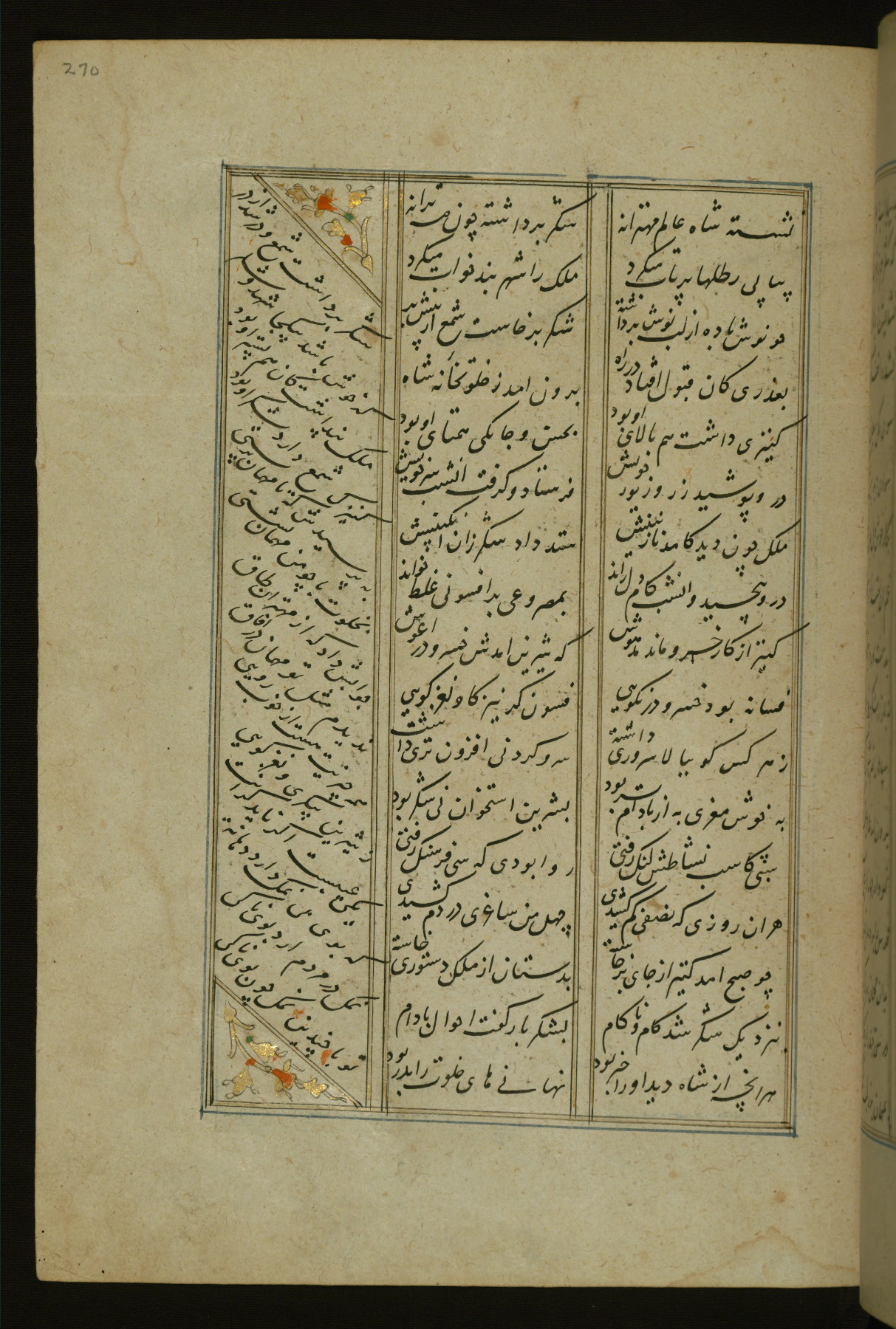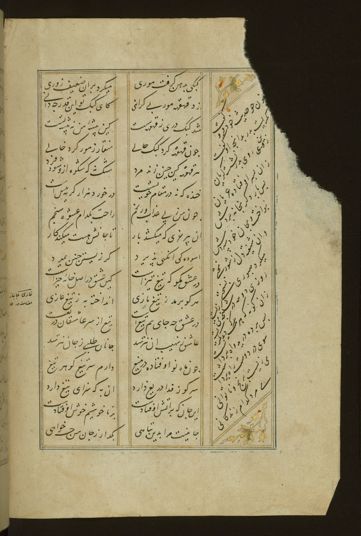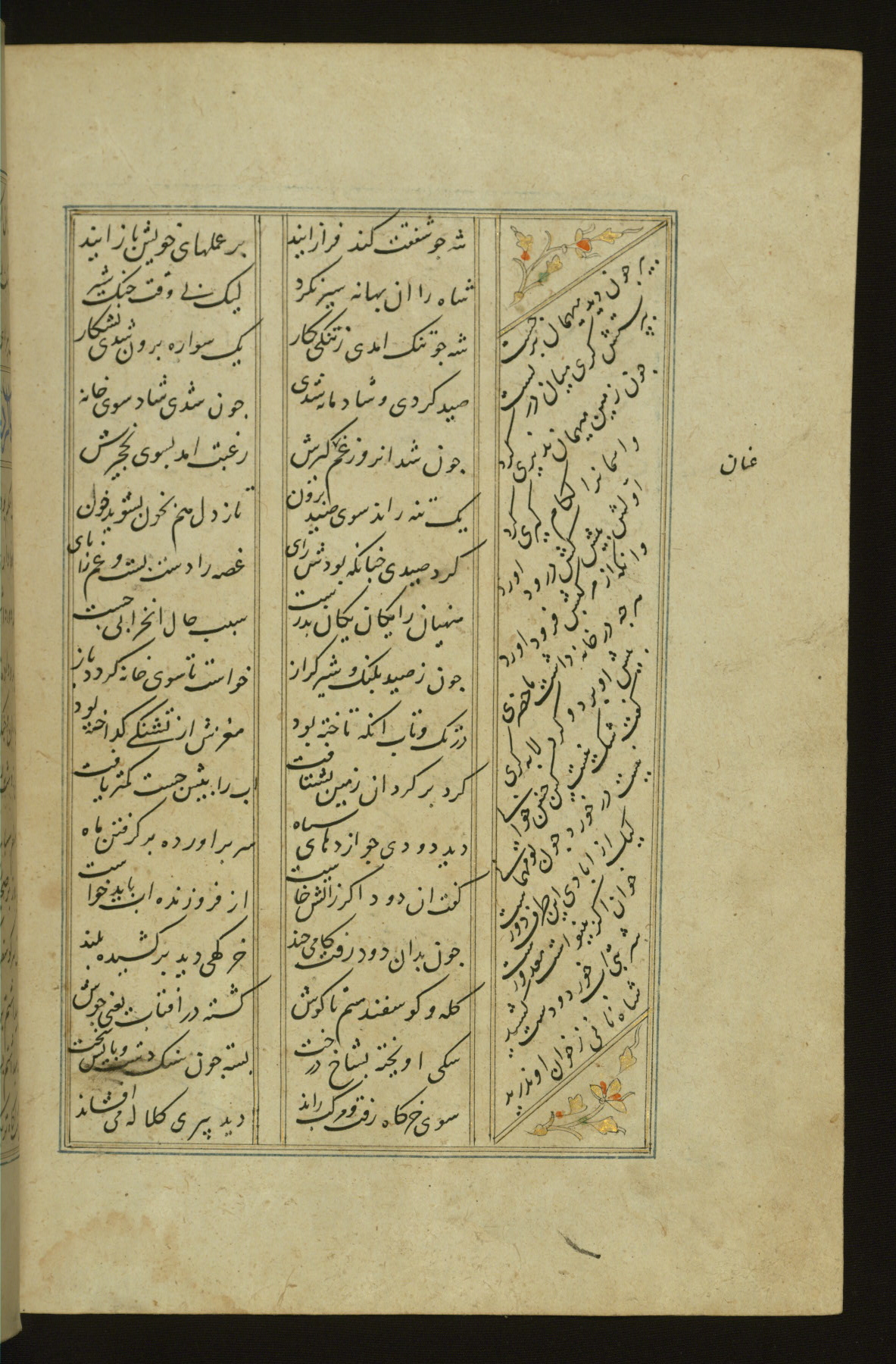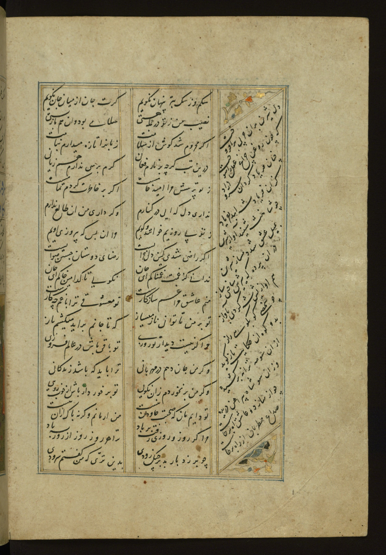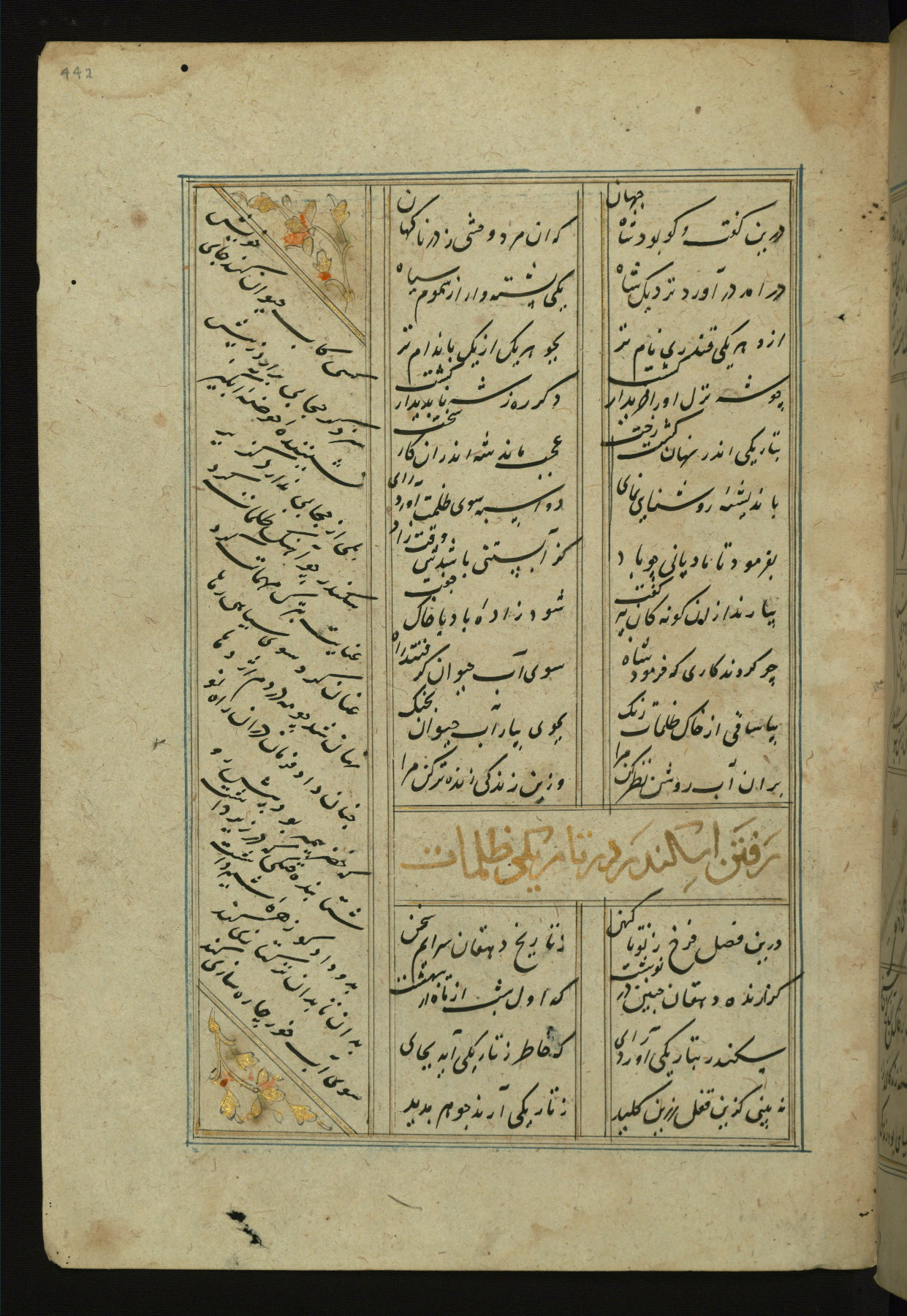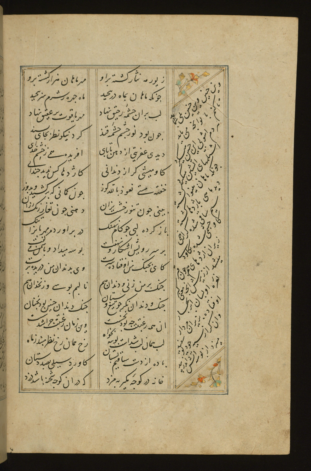 This copy of the Khamsah (quintet) of Niẓāmī Ganjavī (d. 605 AH / 1209 CE) was written by Abū Bakr Shāh ibn Ḥasan ibn ʿAlī al-Shahrastānī and illuminated by Jamāl al-Dīn ibn Muḥammad al-Ṣiddīqī al-Iṣfahānī between 892 AH / 1486 CE and 900 AH / 1494-5 CE. The manuscript opens with a double-page illuminated frontispiece with an inscription giving the title of the work and the name of the author (fols. 1b-2a). There are four illuminated titlepieces with the names of the individual poems and twenty-six repainted illustrations. According to evidence supplied by the colophons, the original binding was by the hand of Jamāl al-Dīn ibn Muḥammad al-Ṣiddīqī al-Iṣfahānī, as well. Unfortunately, it has not survived. The binding presently attached to the manuscript dates to the twelfth century AH / eighteenth CE.