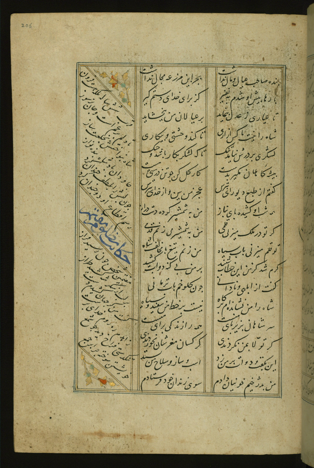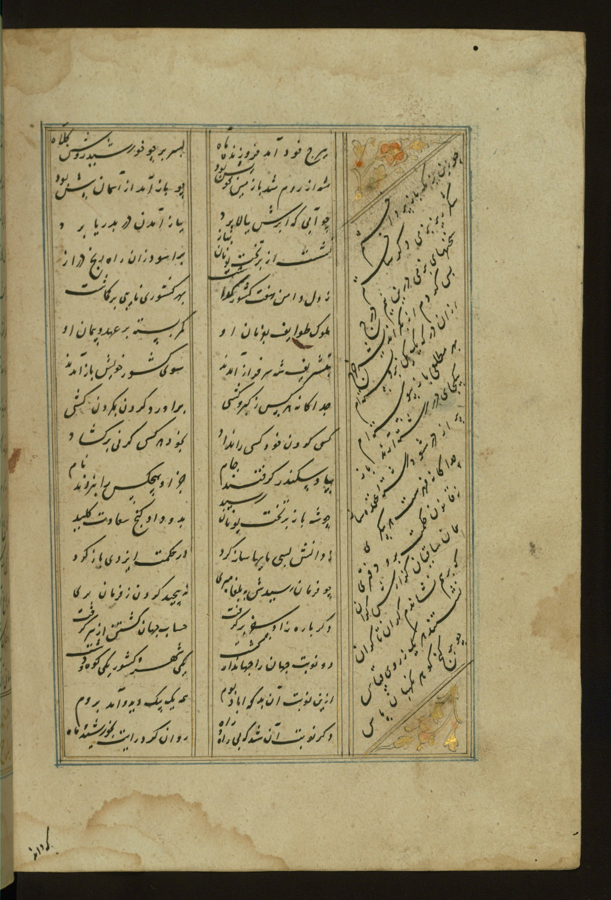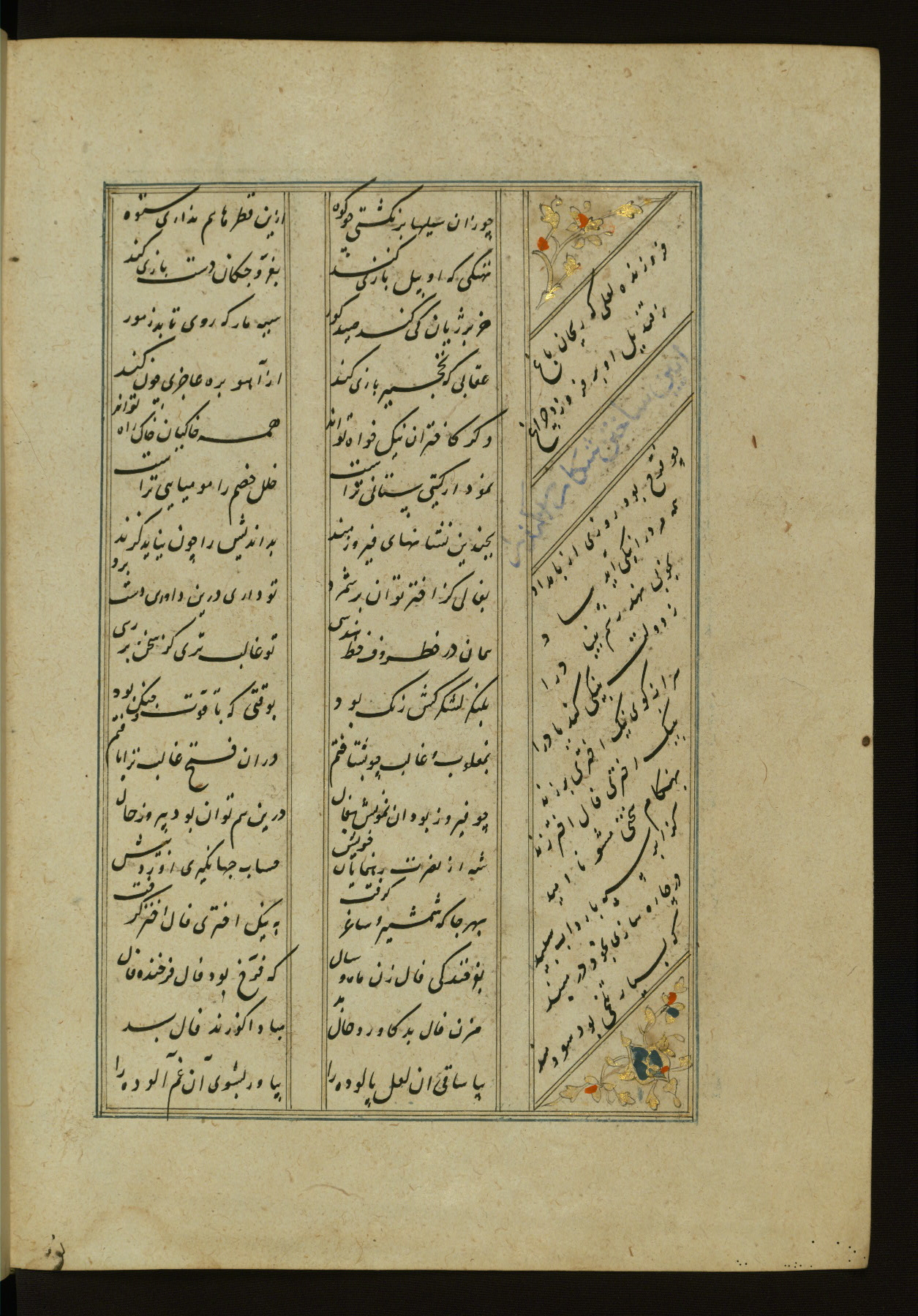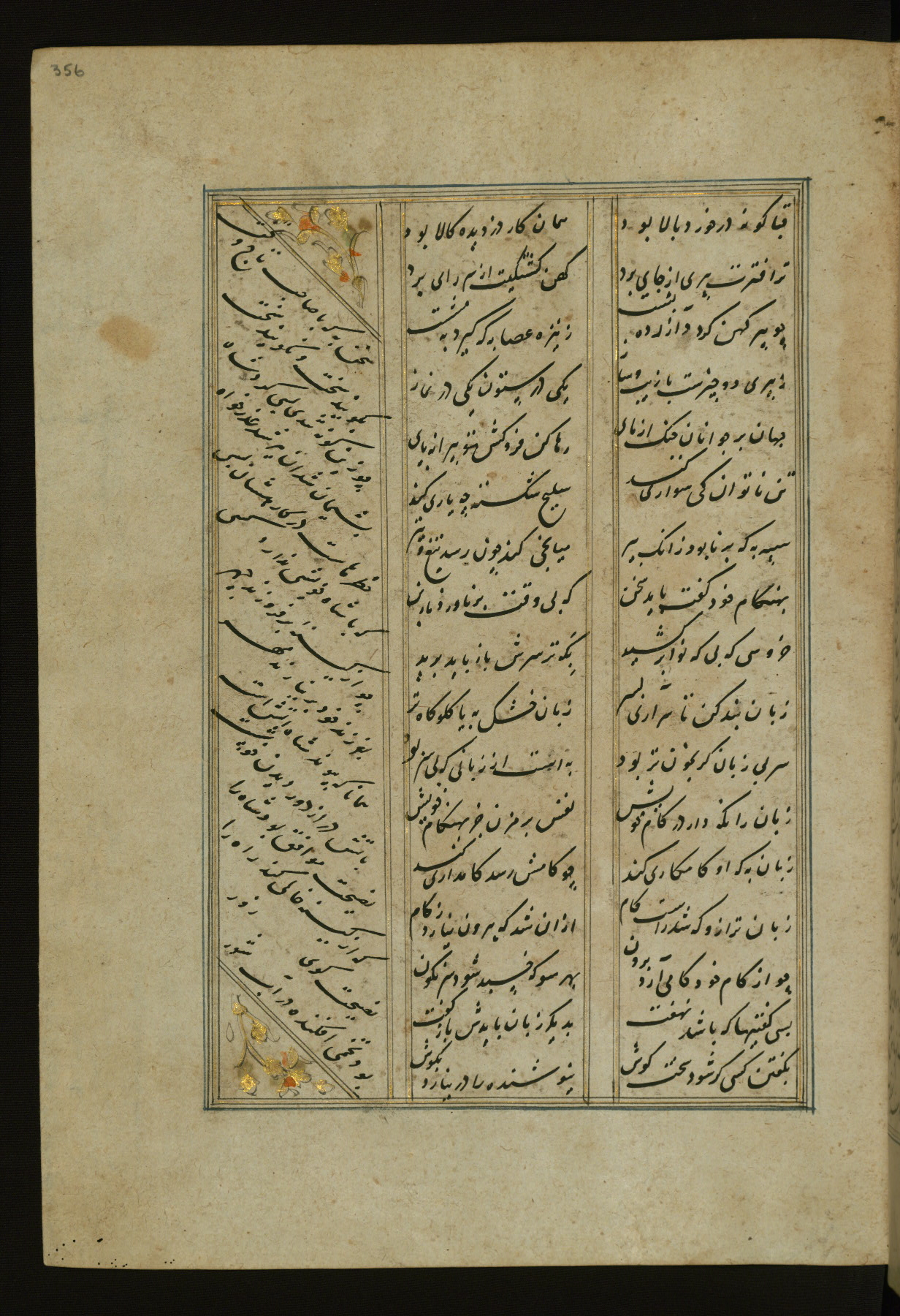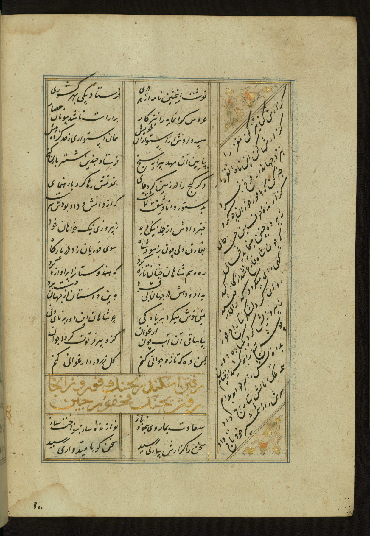 This copy of the Khamsah (quintet) of Niẓāmī Ganjavī (d. 605 AH / 1209 CE) was written by Abū Bakr Shāh ibn Ḥasan ibn ʿAlī al-Shahrastānī and illuminated by Jamāl al-Dīn ibn Muḥammad al-Ṣiddīqī al-Iṣfahānī between 892 AH / 1486 CE and 900 AH / 1494-5 CE. The manuscript opens with a double-page illuminated frontispiece with an inscription giving the title of the work and the name of the author (fols. 1b-2a). There are four illuminated titlepieces with the names of the individual poems and twenty-six repainted illustrations. According to evidence supplied by the colophons, the original binding was by the hand of Jamāl al-Dīn ibn Muḥammad al-Ṣiddīqī al-Iṣfahānī, as well. Unfortunately, it has not survived. The binding presently attached to the manuscript dates to the twelfth century AH / eighteenth CE.