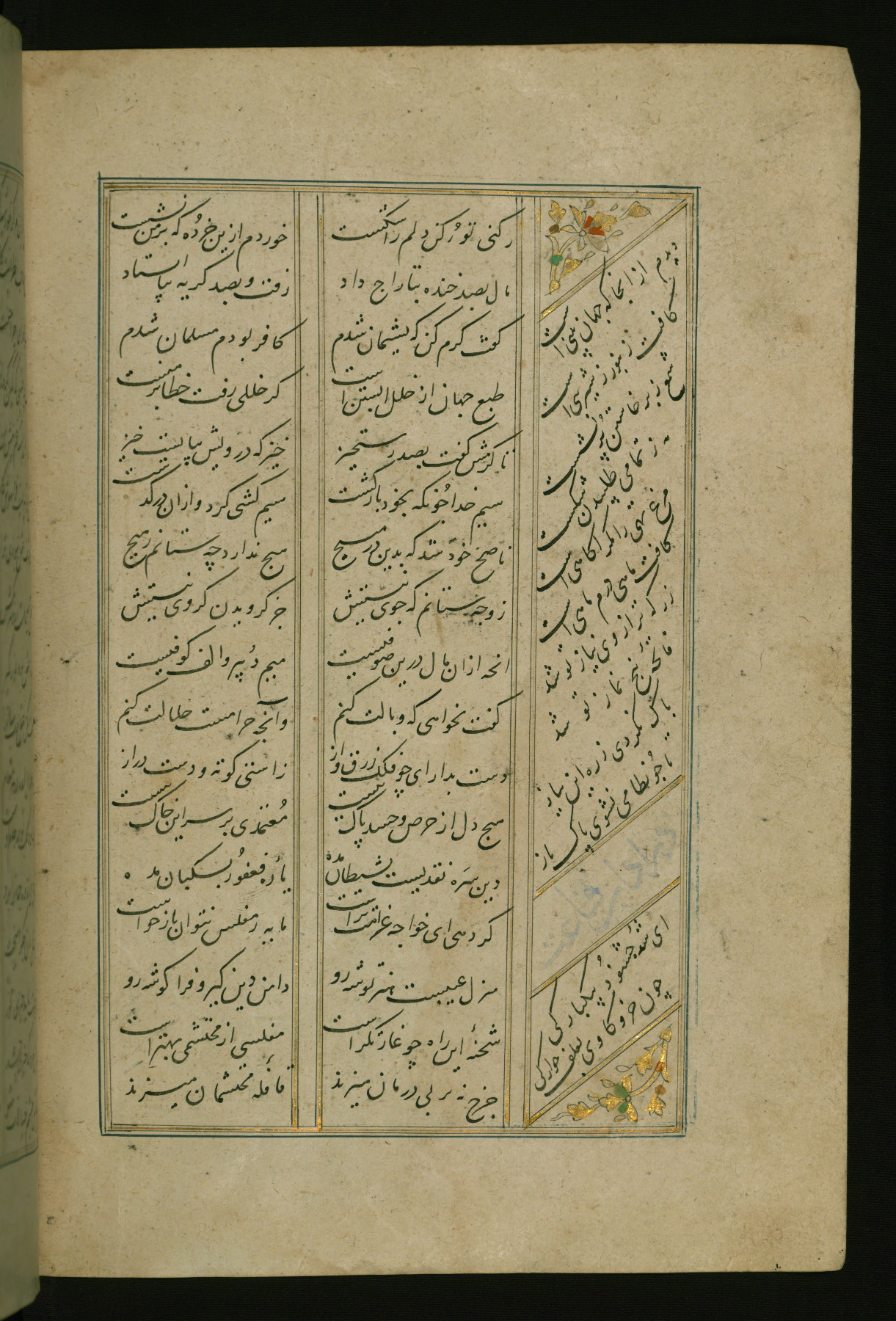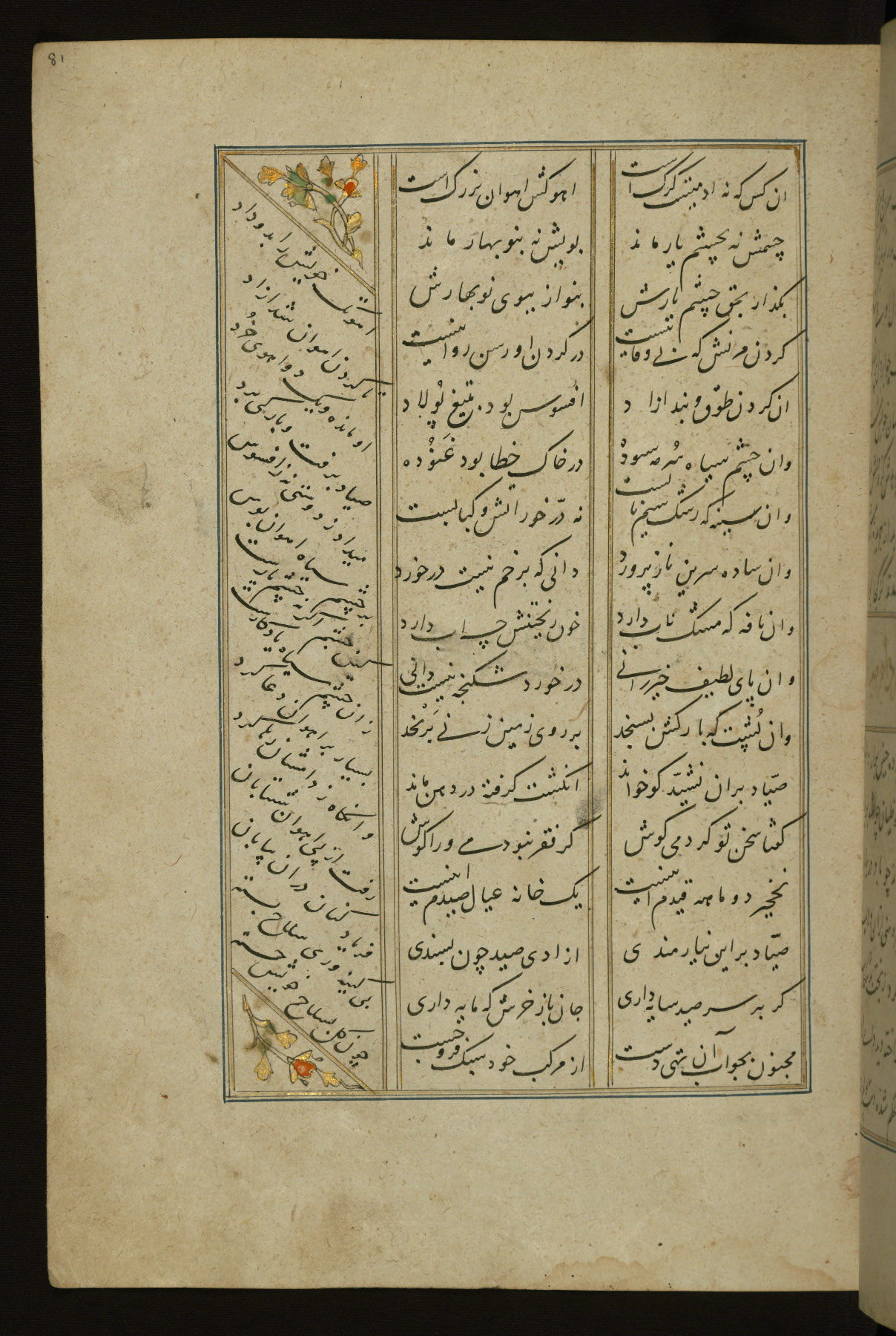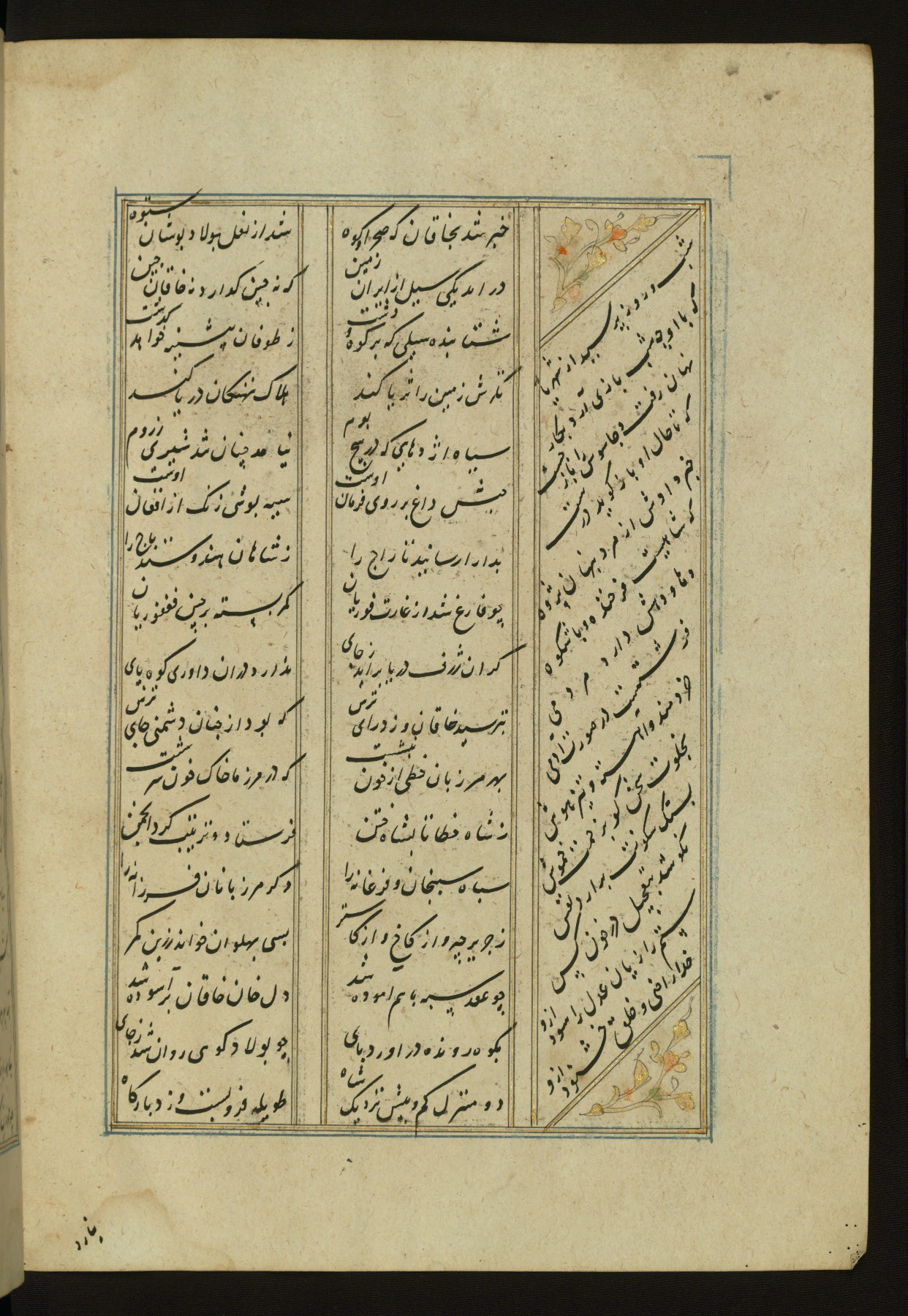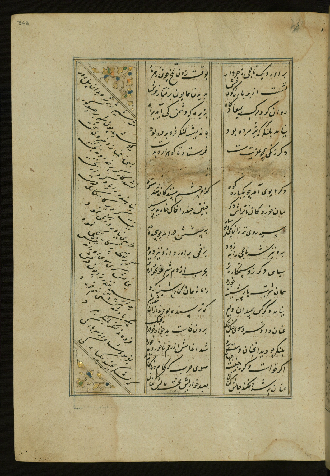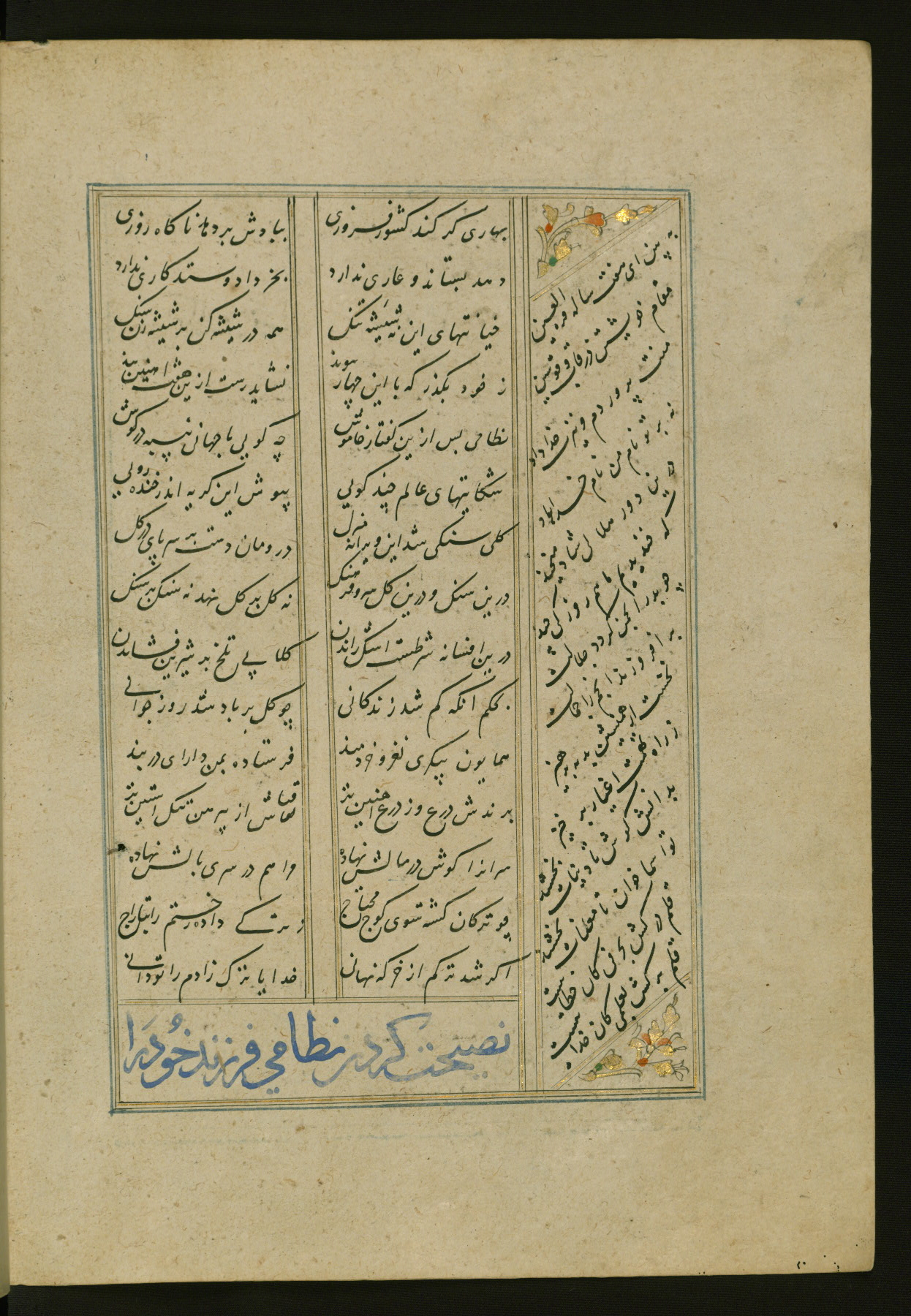 This copy of the Khamsah (quintet) of Niẓāmī Ganjavī (d. 605 AH / 1209 CE) was written by Abū Bakr Shāh ibn Ḥasan ibn ʿAlī al-Shahrastānī and illuminated by Jamāl al-Dīn ibn Muḥammad al-Ṣiddīqī al-Iṣfahānī between 892 AH / 1486 CE and 900 AH / 1494-5 CE. The manuscript opens with a double-page illuminated frontispiece with an inscription giving the title of the work and the name of the author (fols. 1b-2a). There are four illuminated titlepieces with the names of the individual poems and twenty-six repainted illustrations. According to evidence supplied by the colophons, the original binding was by the hand of Jamāl al-Dīn ibn Muḥammad al-Ṣiddīqī al-Iṣfahānī, as well. Unfortunately, it has not survived. The binding presently attached to the manuscript dates to the twelfth century AH / eighteenth CE.