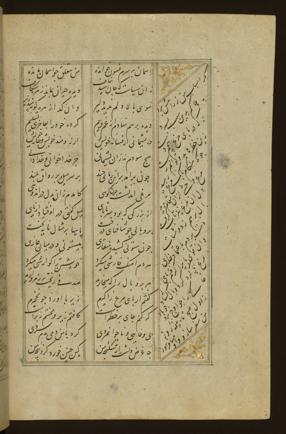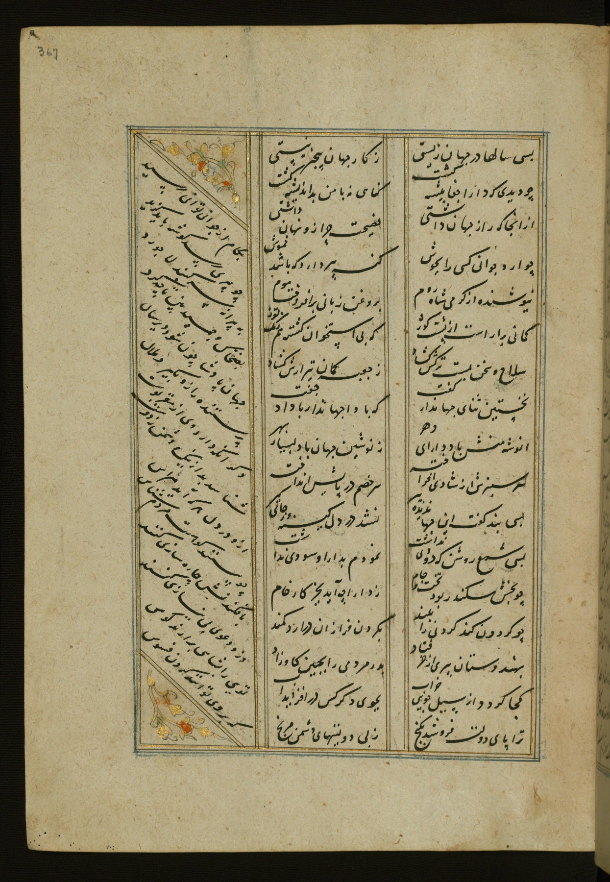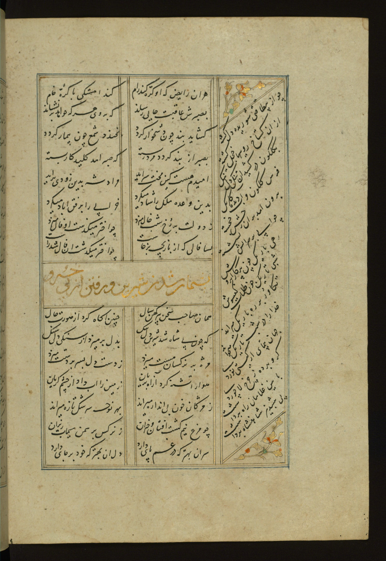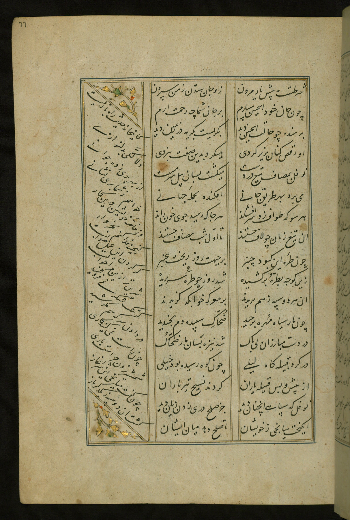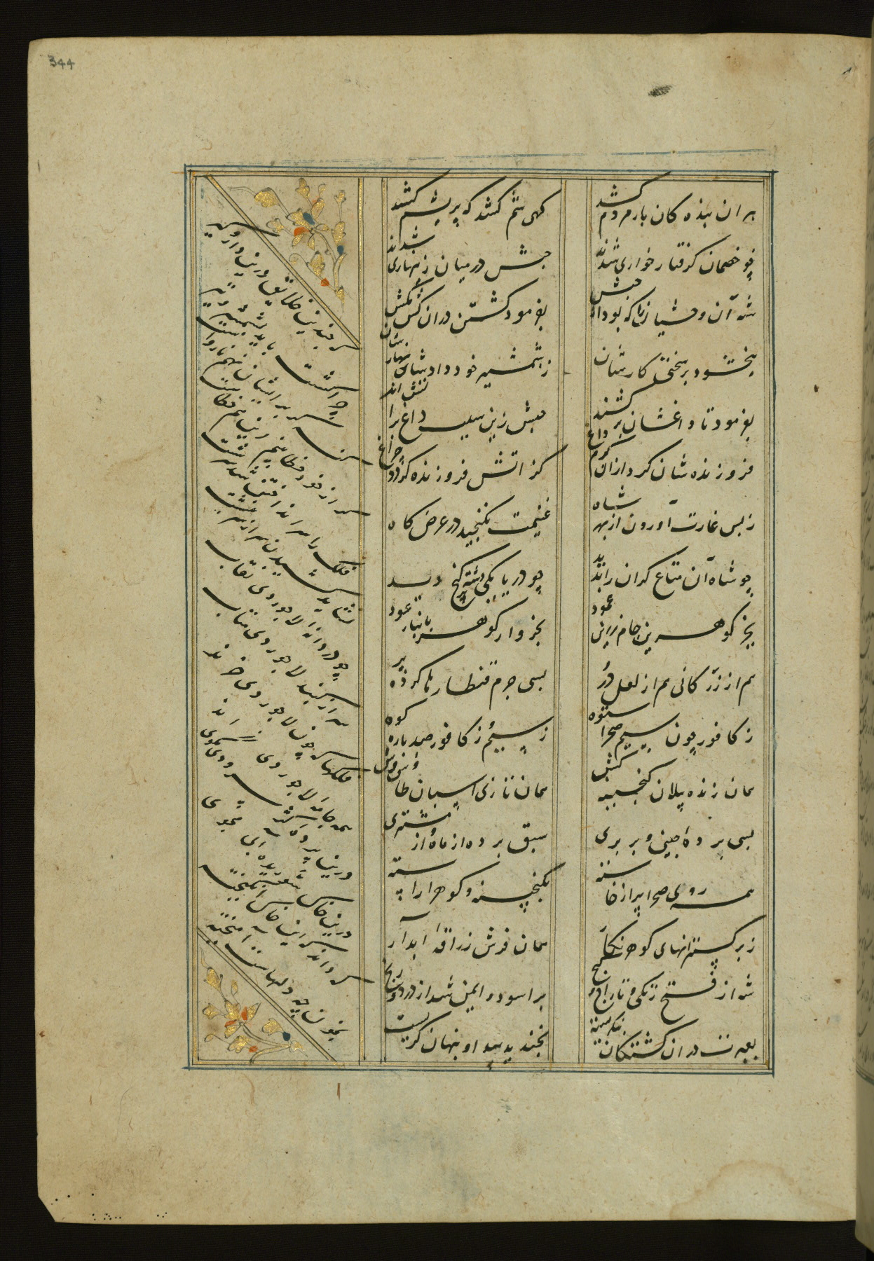 This copy of the Khamsah (quintet) of Niẓāmī Ganjavī (d. 605 AH / 1209 CE) was written by Abū Bakr Shāh ibn Ḥasan ibn ʿAlī al-Shahrastānī and illuminated by Jamāl al-Dīn ibn Muḥammad al-Ṣiddīqī al-Iṣfahānī between 892 AH / 1486 CE and 900 AH / 1494-5 CE. The manuscript opens with a double-page illuminated frontispiece with an inscription giving the title of the work and the name of the author (fols. 1b-2a). There are four illuminated titlepieces with the names of the individual poems and twenty-six repainted illustrations. According to evidence supplied by the colophons, the original binding was by the hand of Jamāl al-Dīn ibn Muḥammad al-Ṣiddīqī al-Iṣfahānī, as well. Unfortunately, it has not survived. The binding presently attached to the manuscript dates to the twelfth century AH / eighteenth CE.