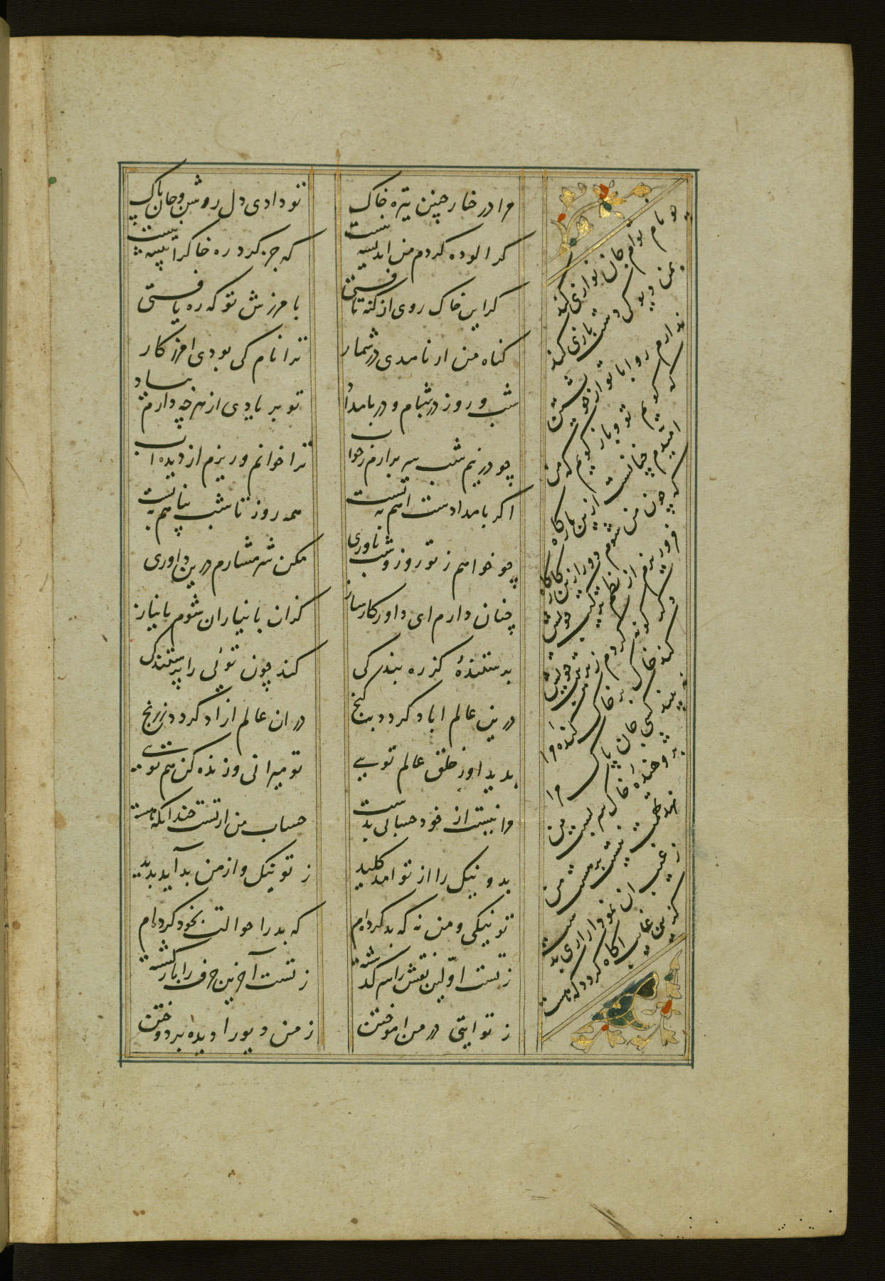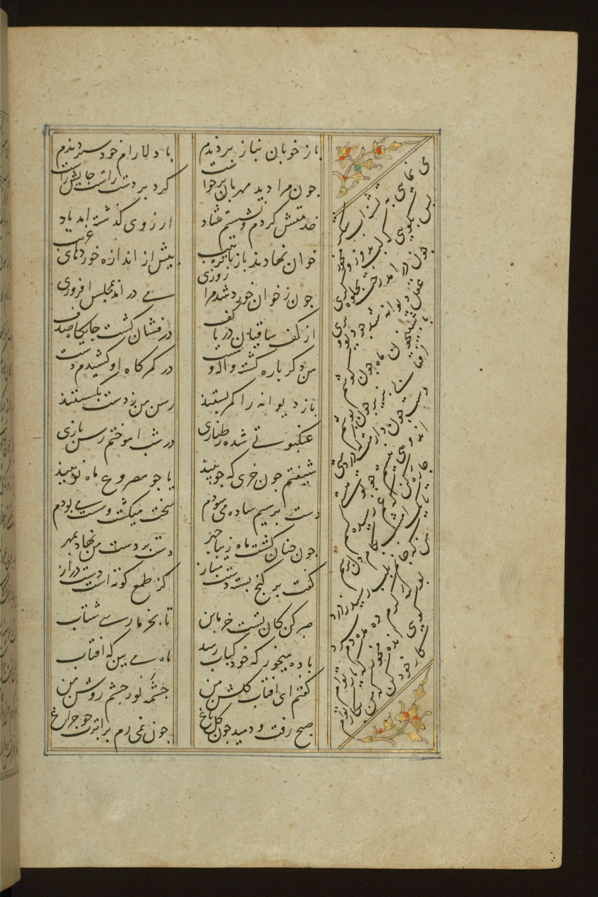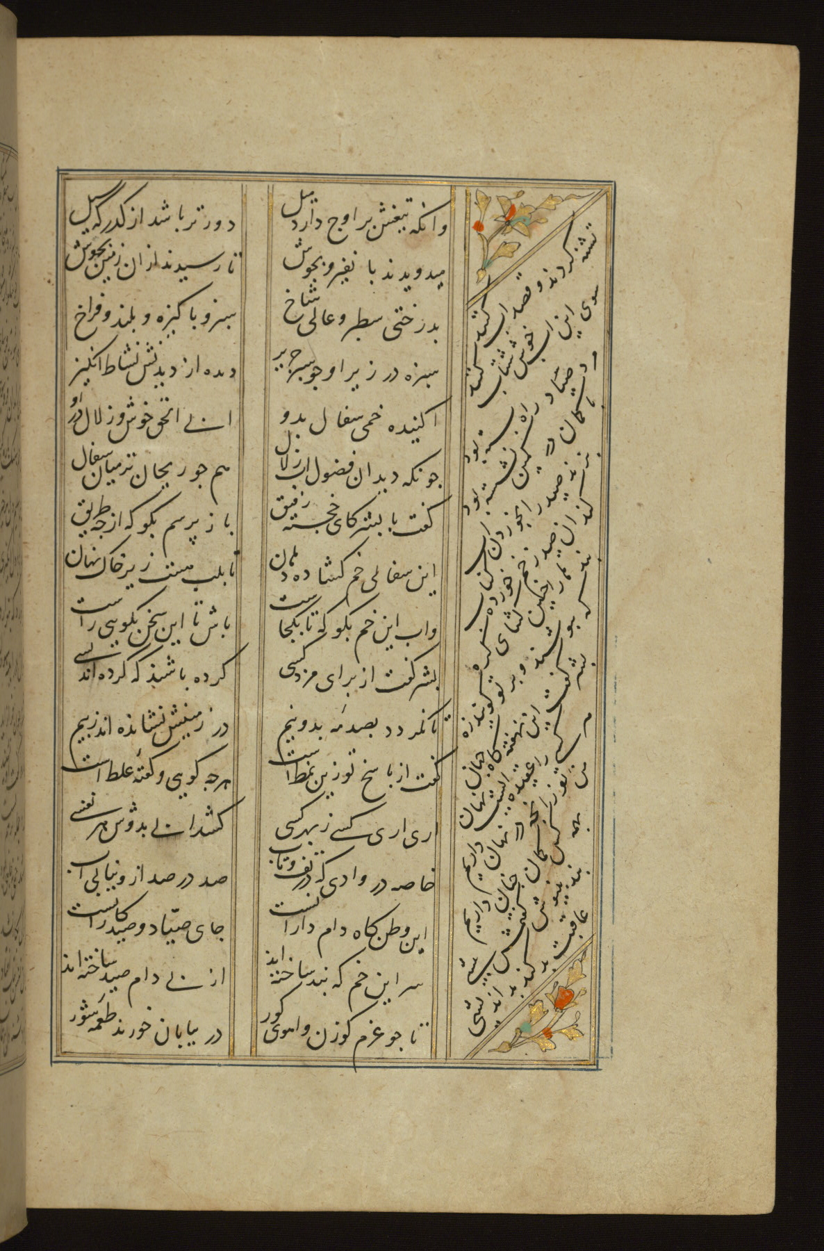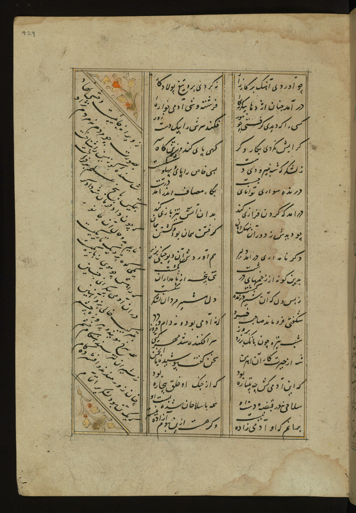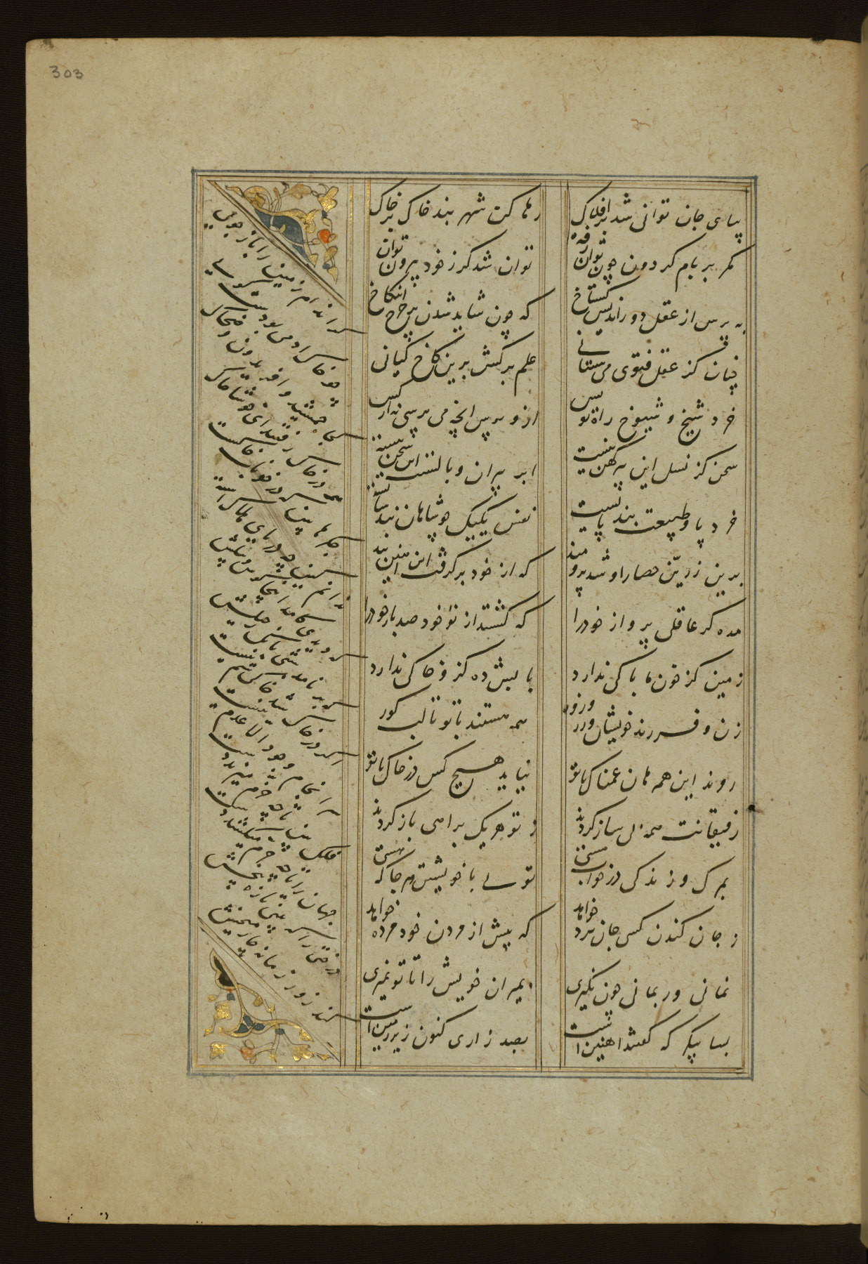 This copy of the Khamsah (quintet) of Niẓāmī Ganjavī (d. 605 AH / 1209 CE) was written by Abū Bakr Shāh ibn Ḥasan ibn ʿAlī al-Shahrastānī and illuminated by Jamāl al-Dīn ibn Muḥammad al-Ṣiddīqī al-Iṣfahānī between 892 AH / 1486 CE and 900 AH / 1494-5 CE. The manuscript opens with a double-page illuminated frontispiece with an inscription giving the title of the work and the name of the author (fols. 1b-2a). There are four illuminated titlepieces with the names of the individual poems and twenty-six repainted illustrations. According to evidence supplied by the colophons, the original binding was by the hand of Jamāl al-Dīn ibn Muḥammad al-Ṣiddīqī al-Iṣfahānī, as well. Unfortunately, it has not survived. The binding presently attached to the manuscript dates to the twelfth century AH / eighteenth CE.