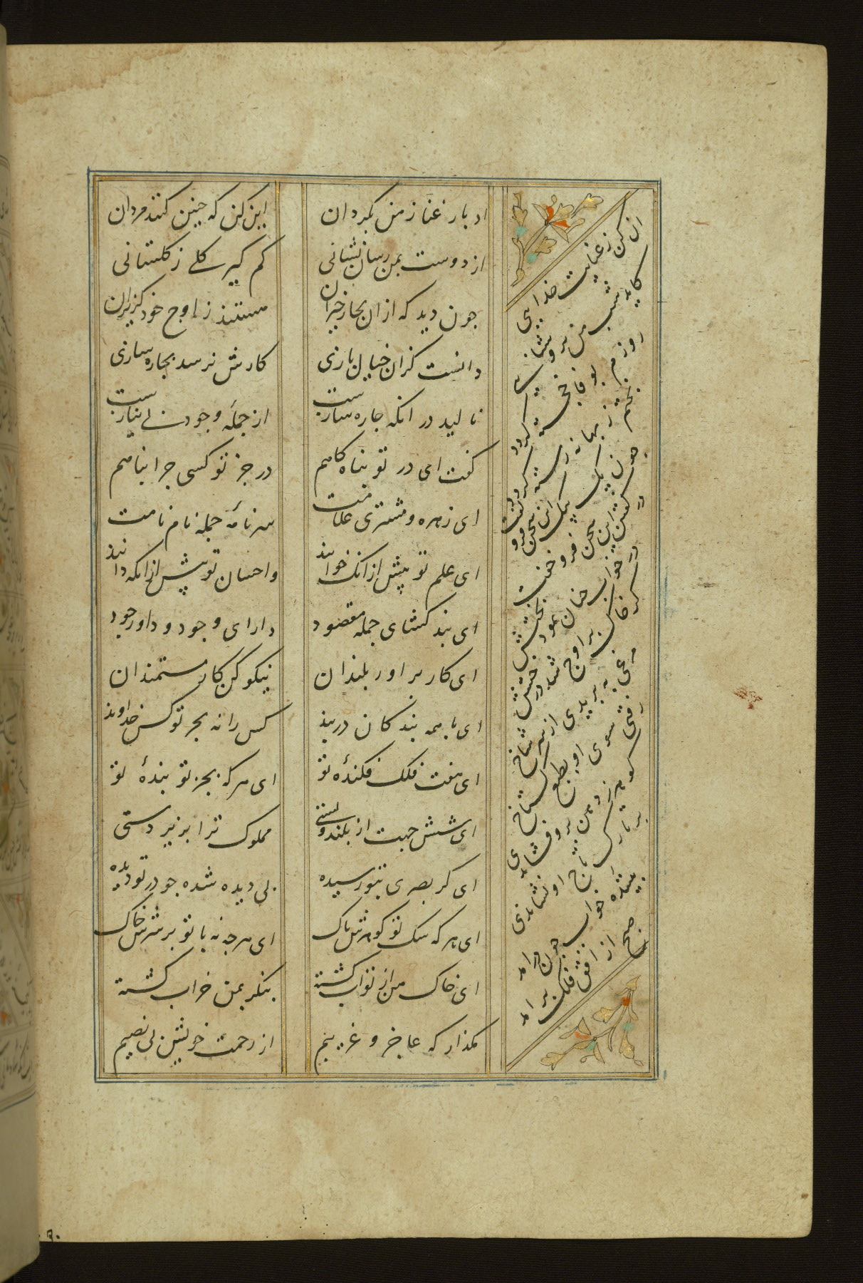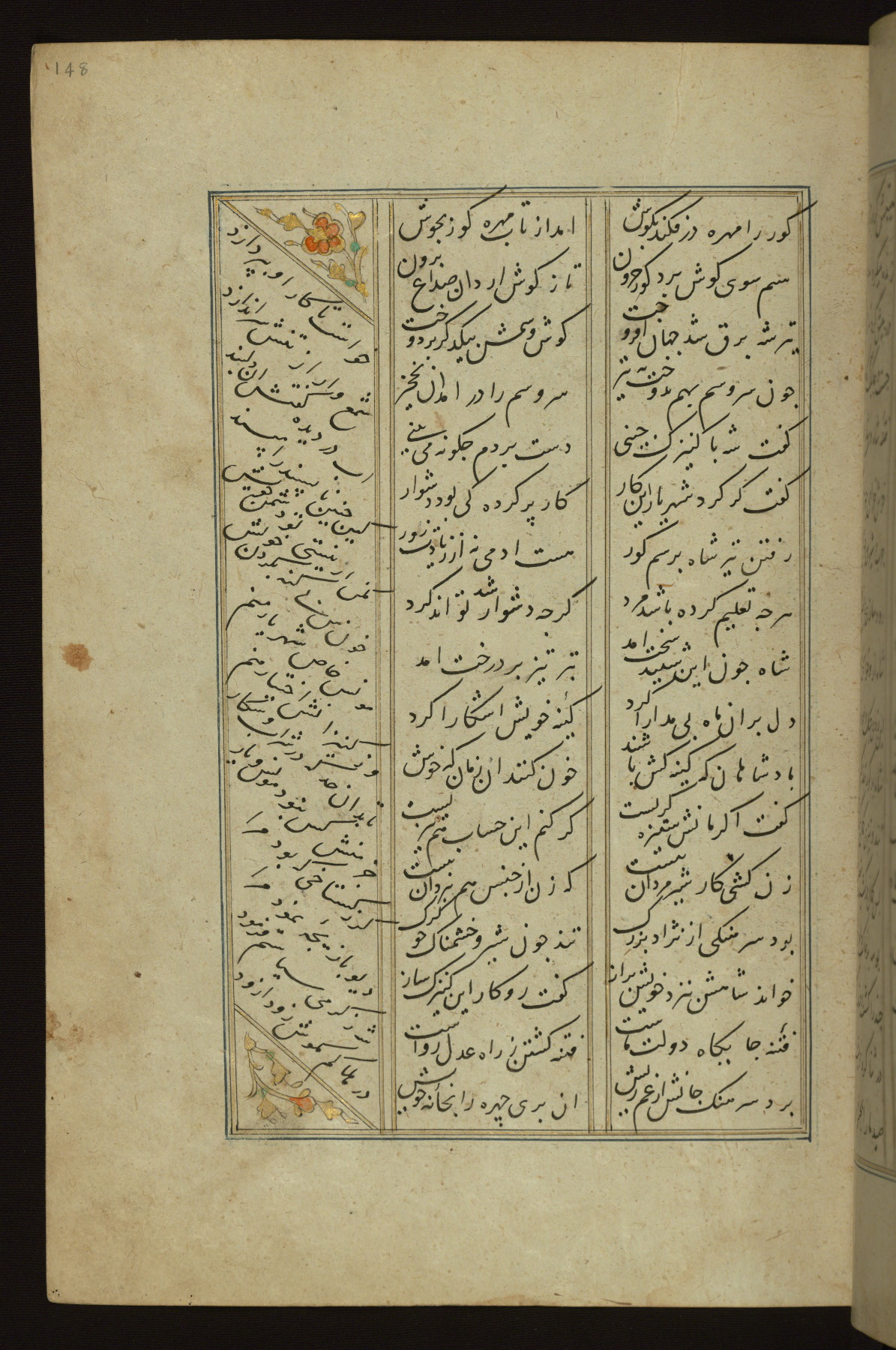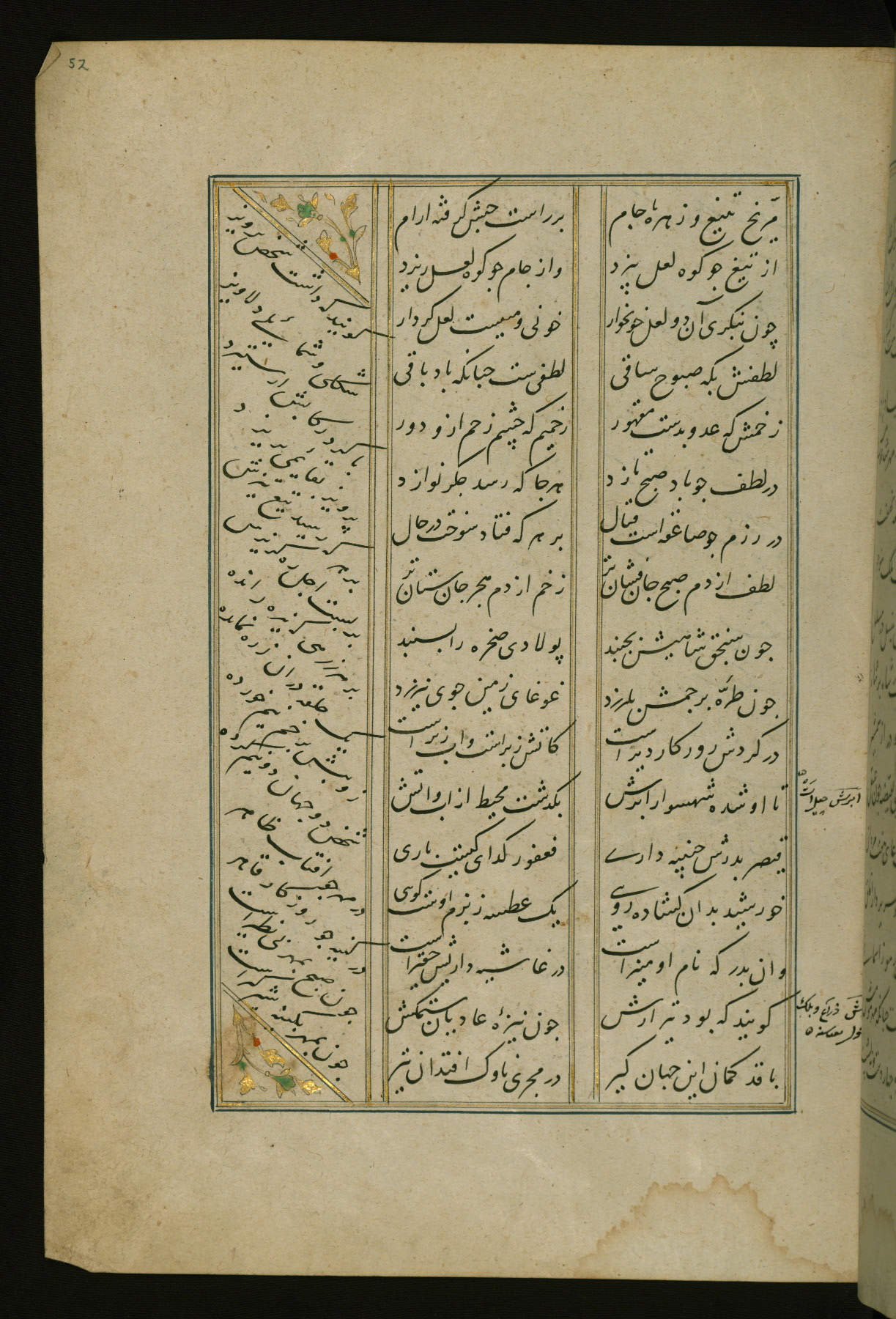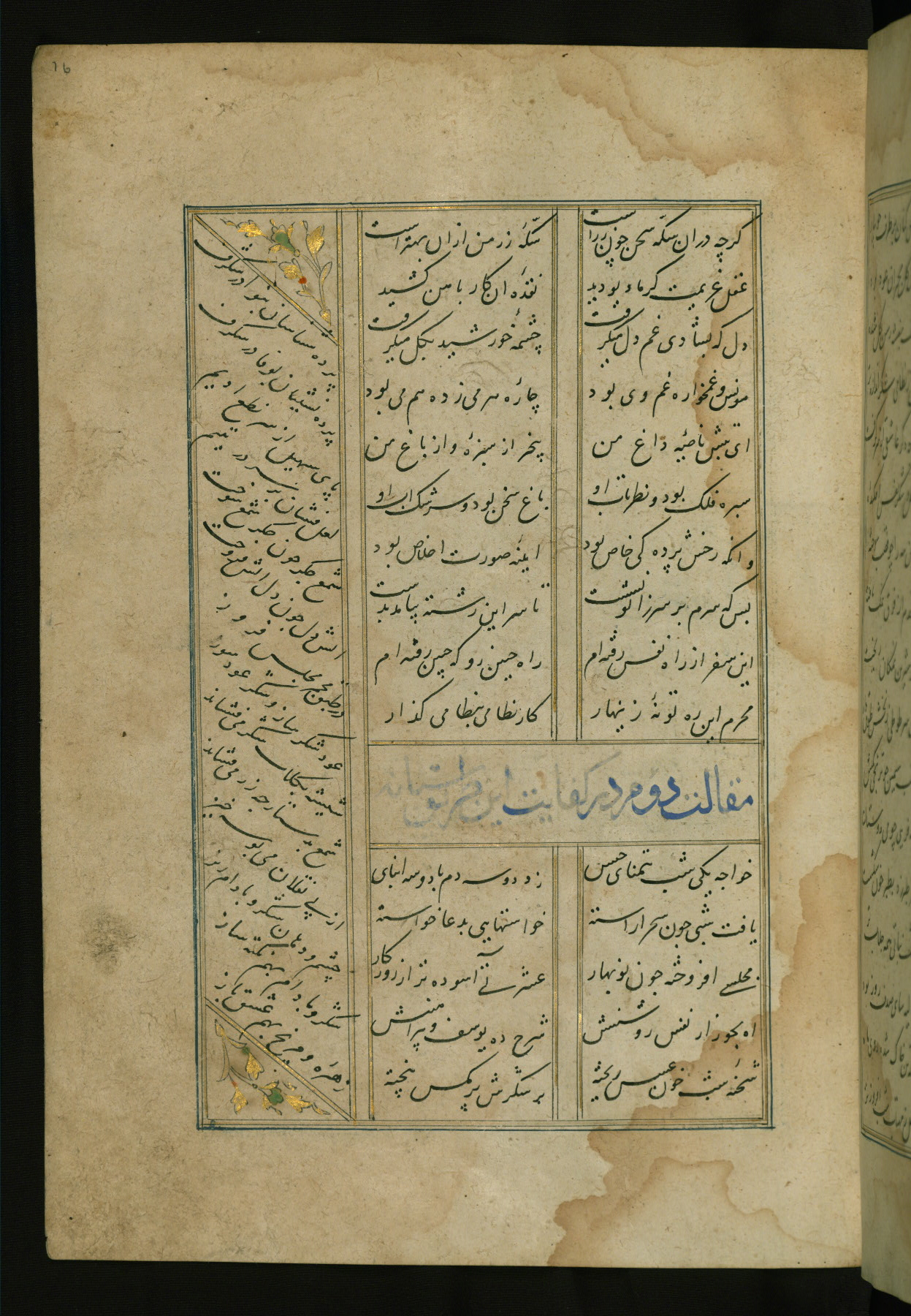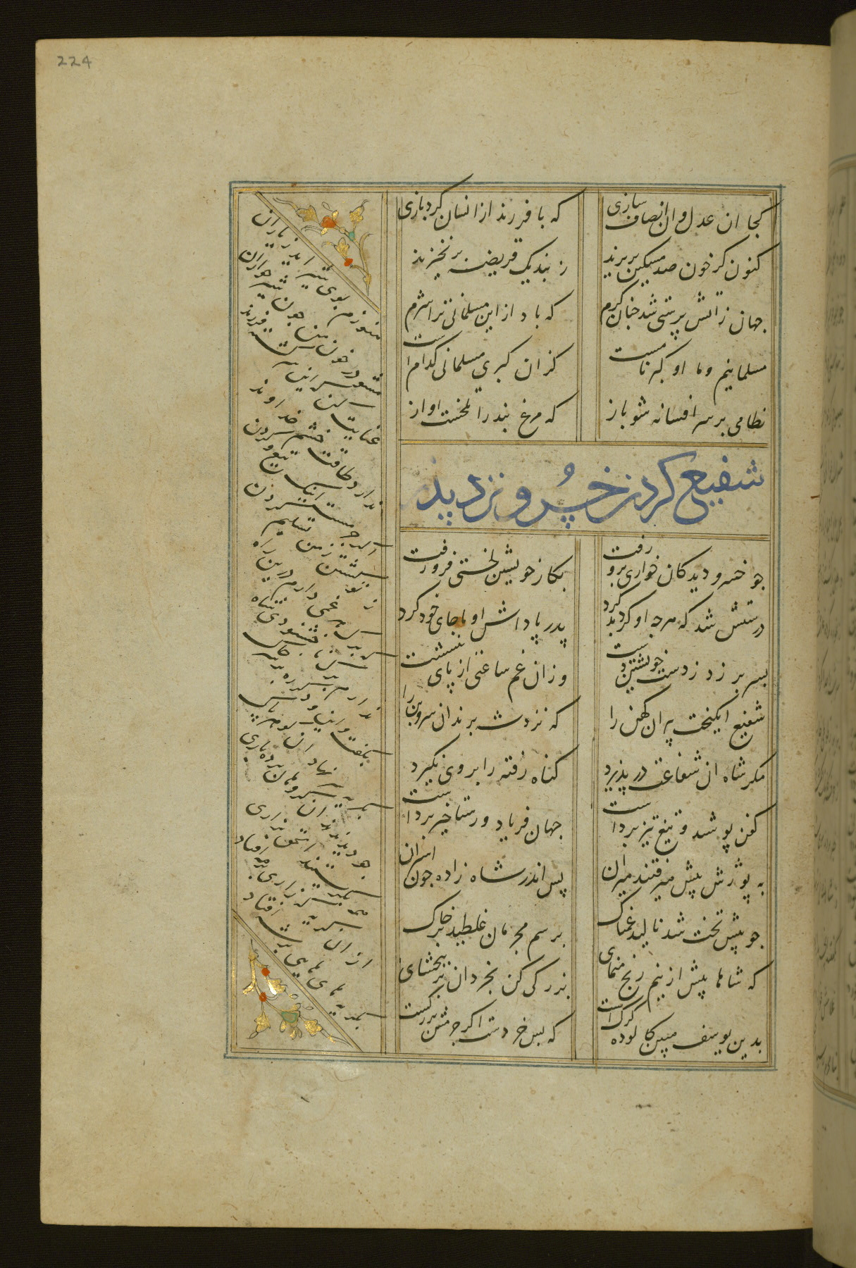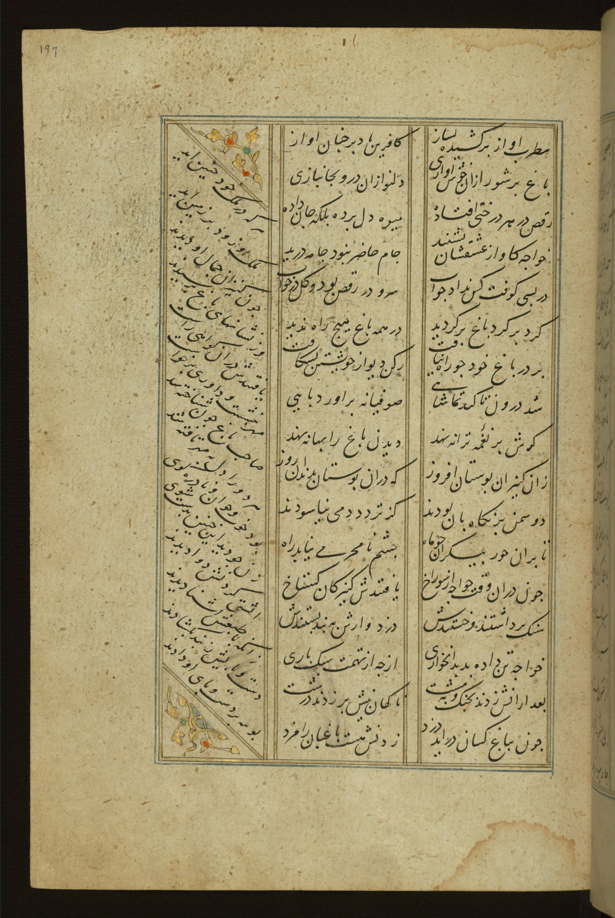 This copy of the Khamsah (quintet) of Niẓāmī Ganjavī (d. 605 AH / 1209 CE) was written by Abū Bakr Shāh ibn Ḥasan ibn ʿAlī al-Shahrastānī and illuminated by Jamāl al-Dīn ibn Muḥammad al-Ṣiddīqī al-Iṣfahānī between 892 AH / 1486 CE and 900 AH / 1494-5 CE. The manuscript opens with a double-page illuminated frontispiece with an inscription giving the title of the work and the name of the author (fols. 1b-2a). There are four illuminated titlepieces with the names of the individual poems and twenty-six repainted illustrations. According to evidence supplied by the colophons, the original binding was by the hand of Jamāl al-Dīn ibn Muḥammad al-Ṣiddīqī al-Iṣfahānī, as well. Unfortunately, it has not survived. The binding presently attached to the manuscript dates to the twelfth century AH / eighteenth CE.