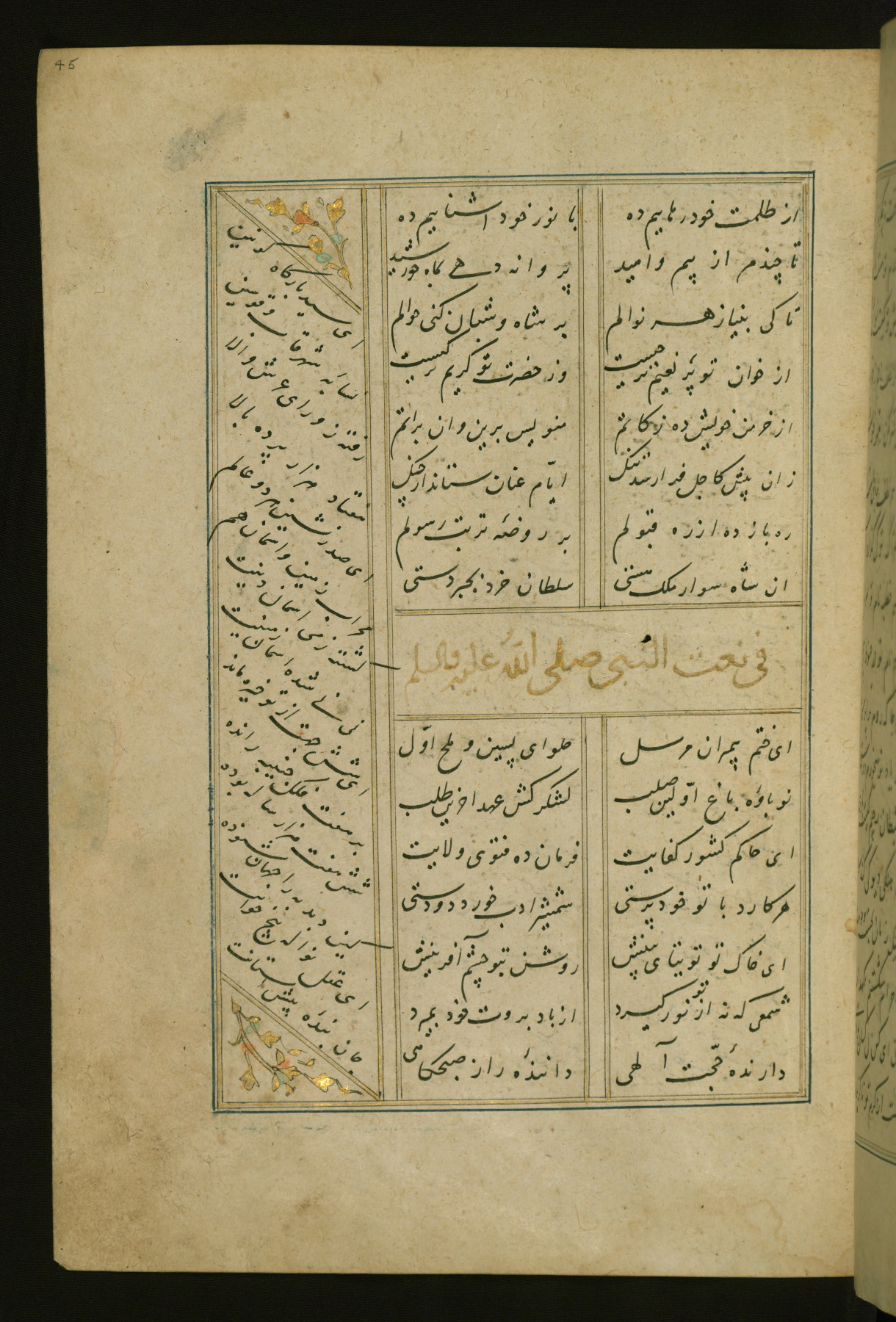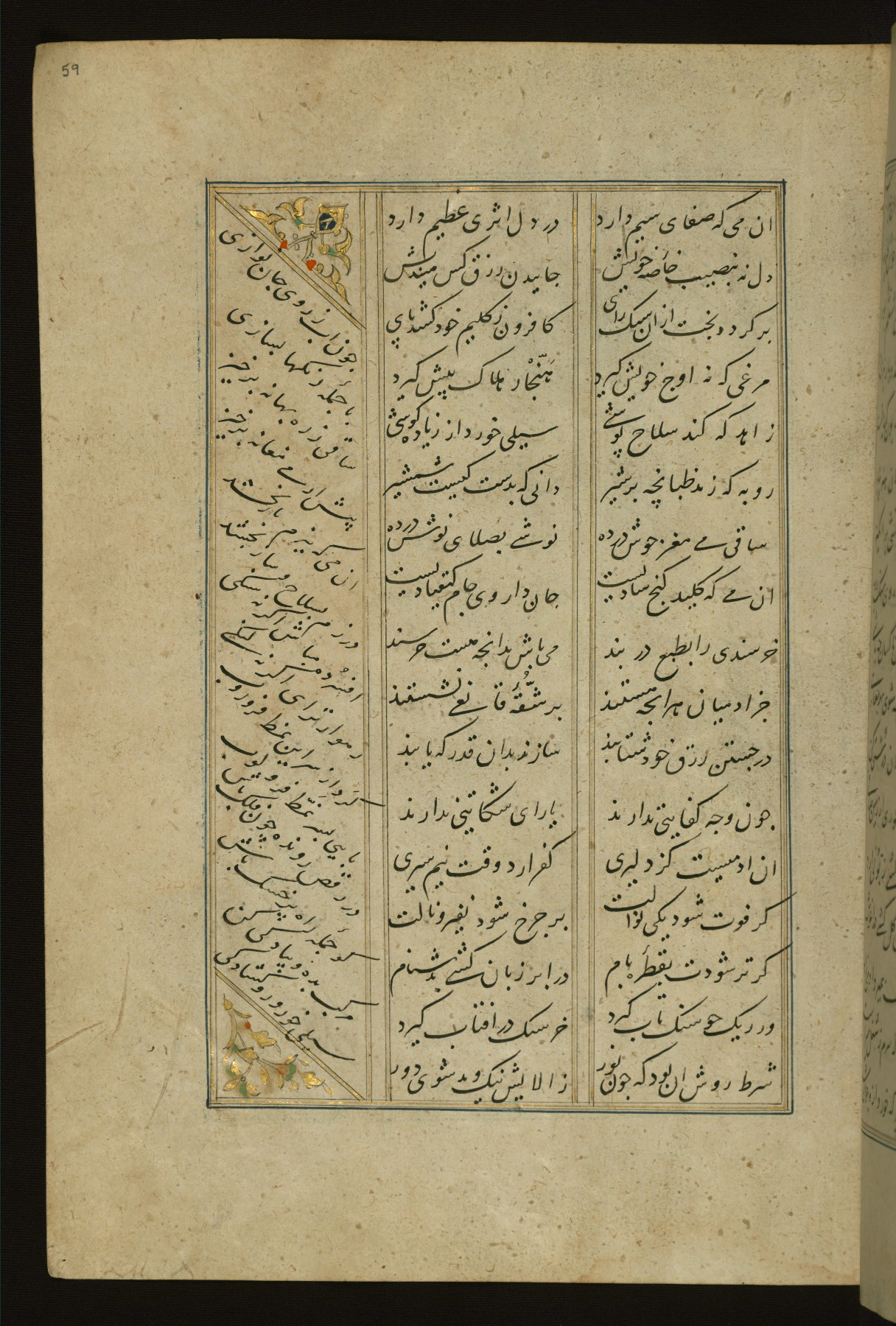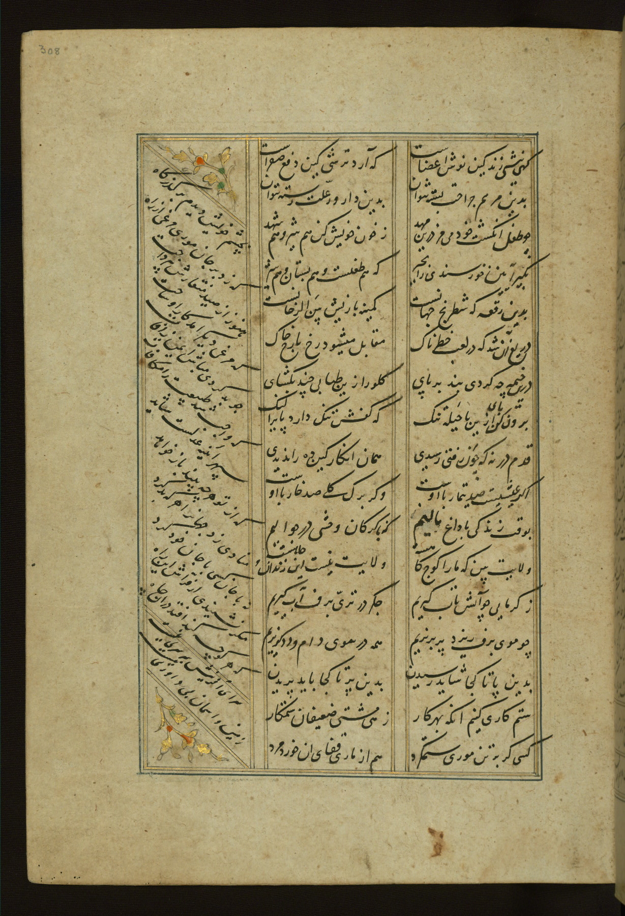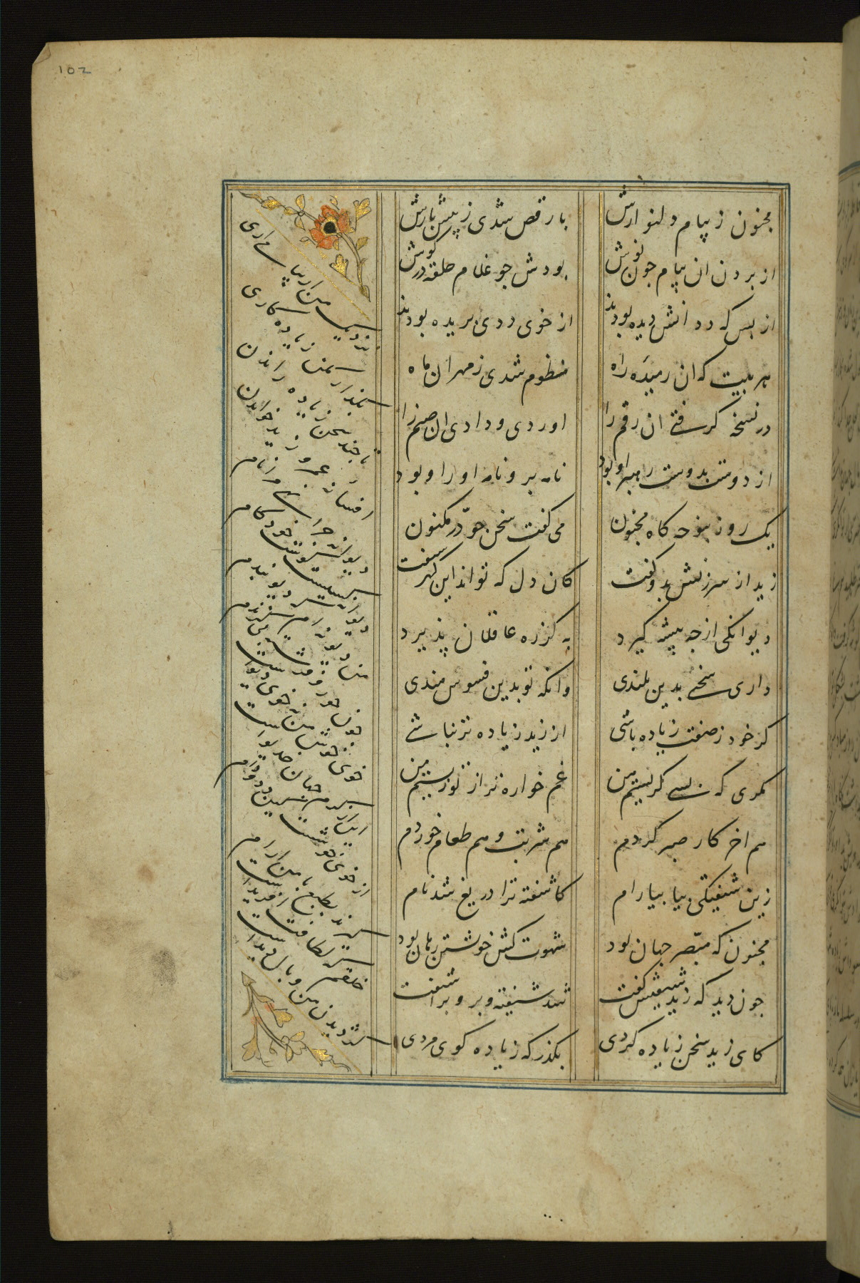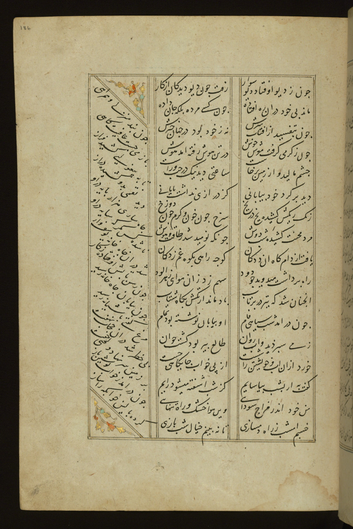 This copy of the Khamsah (quintet) of Niẓāmī Ganjavī (d. 605 AH / 1209 CE) was written by Abū Bakr Shāh ibn Ḥasan ibn ʿAlī al-Shahrastānī and illuminated by Jamāl al-Dīn ibn Muḥammad al-Ṣiddīqī al-Iṣfahānī between 892 AH / 1486 CE and 900 AH / 1494-5 CE. The manuscript opens with a double-page illuminated frontispiece with an inscription giving the title of the work and the name of the author (fols. 1b-2a). There are four illuminated titlepieces with the names of the individual poems and twenty-six repainted illustrations. According to evidence supplied by the colophons, the original binding was by the hand of Jamāl al-Dīn ibn Muḥammad al-Ṣiddīqī al-Iṣfahānī, as well. Unfortunately, it has not survived. The binding presently attached to the manuscript dates to the twelfth century AH / eighteenth CE.