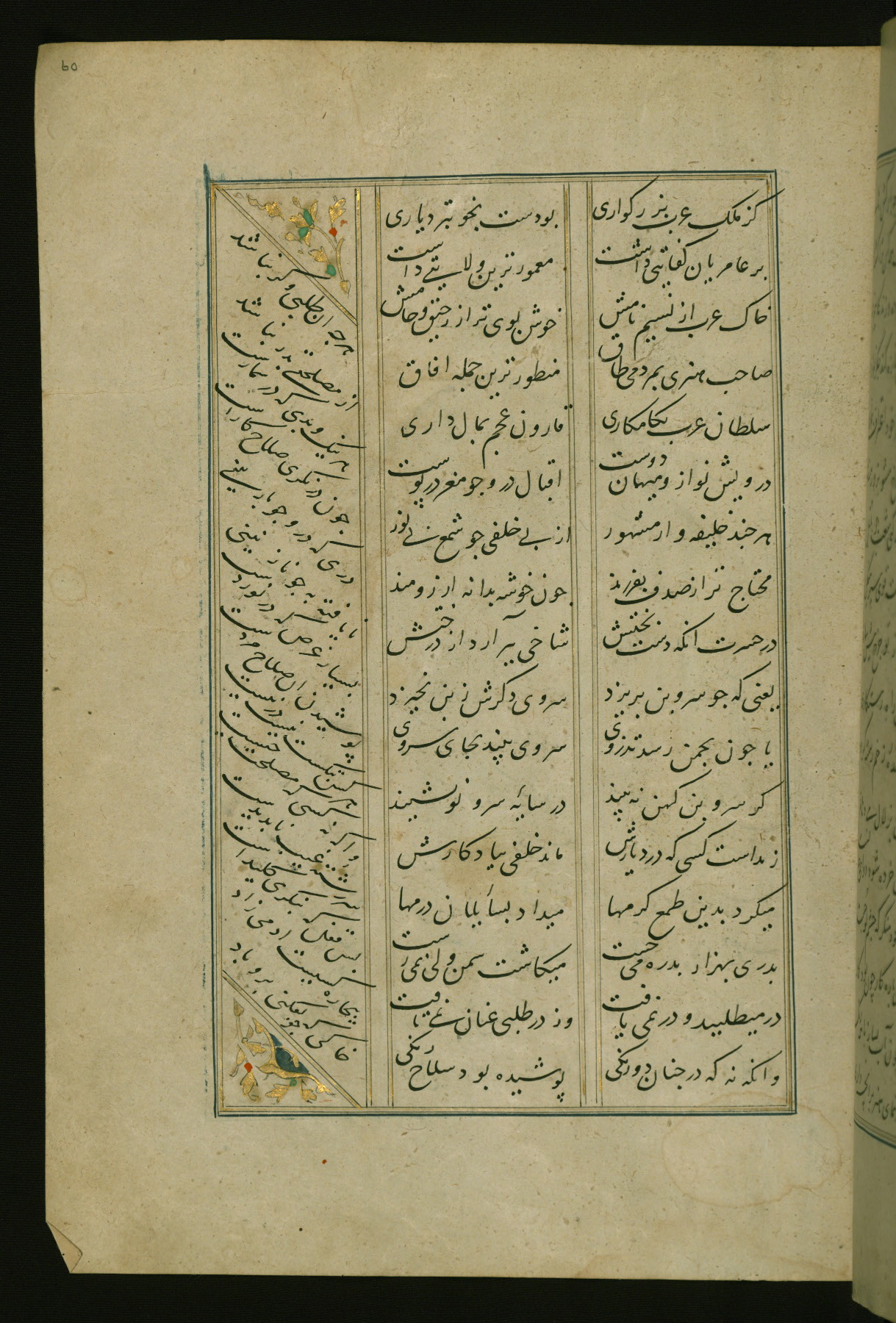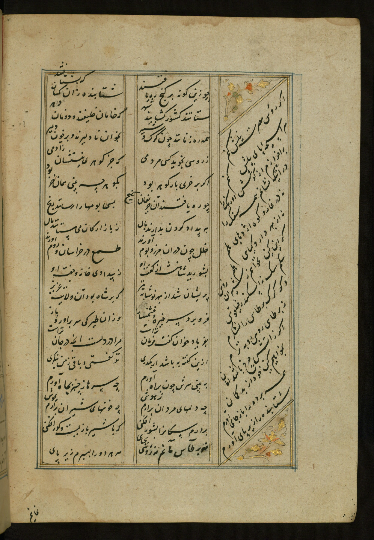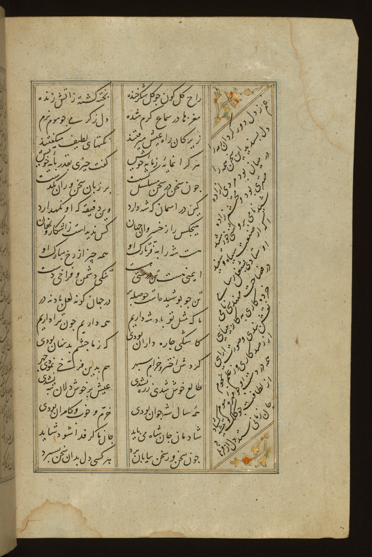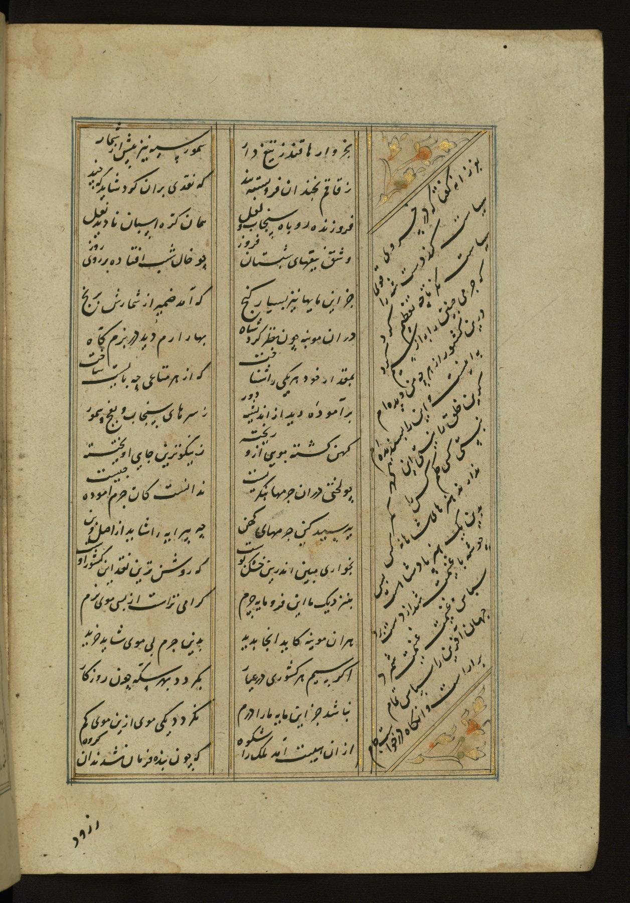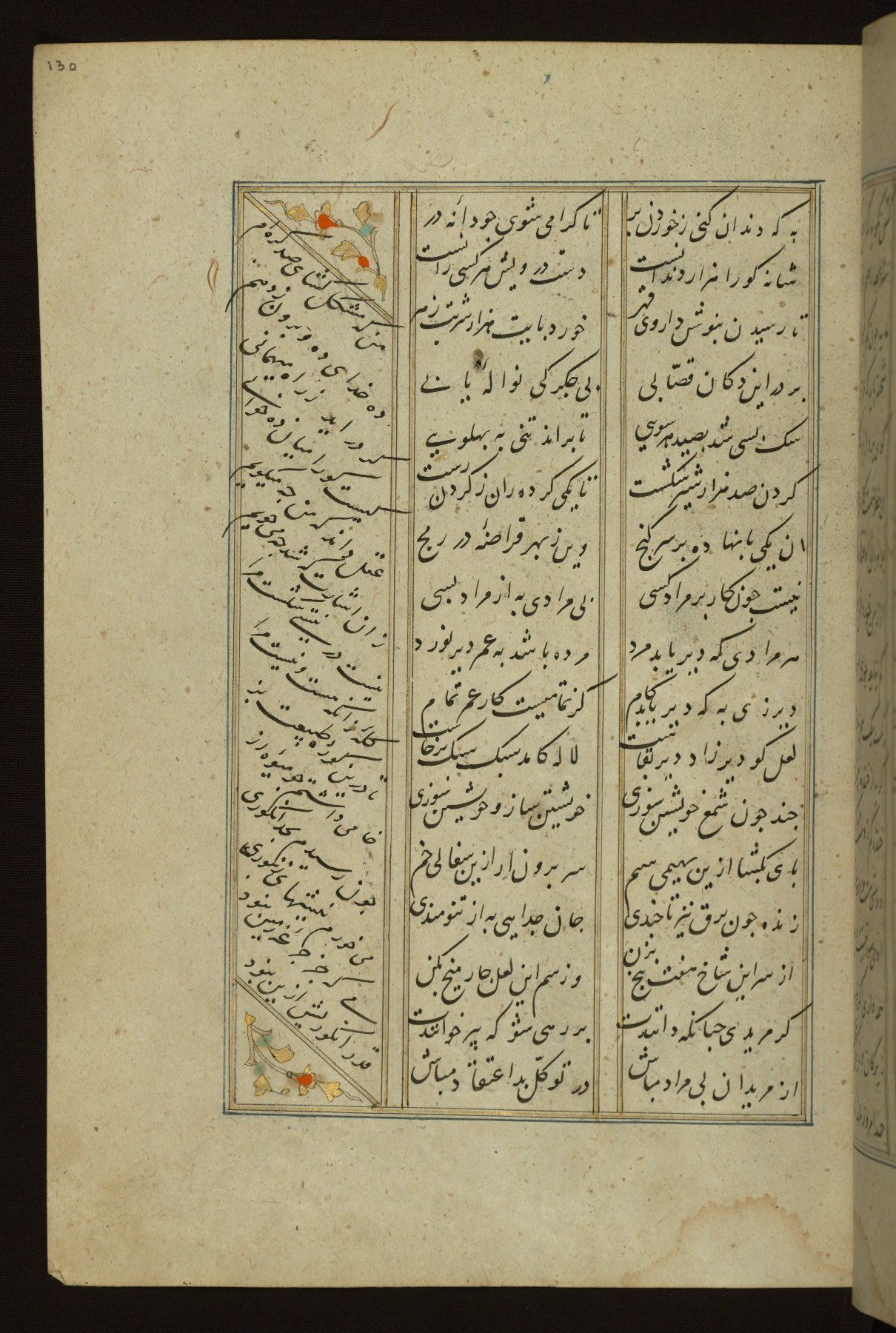 This copy of the Khamsah (quintet) of Niẓāmī Ganjavī (d. 605 AH / 1209 CE) was written by Abū Bakr Shāh ibn Ḥasan ibn ʿAlī al-Shahrastānī and illuminated by Jamāl al-Dīn ibn Muḥammad al-Ṣiddīqī al-Iṣfahānī between 892 AH / 1486 CE and 900 AH / 1494-5 CE. The manuscript opens with a double-page illuminated frontispiece with an inscription giving the title of the work and the name of the author (fols. 1b-2a). There are four illuminated titlepieces with the names of the individual poems and twenty-six repainted illustrations. According to evidence supplied by the colophons, the original binding was by the hand of Jamāl al-Dīn ibn Muḥammad al-Ṣiddīqī al-Iṣfahānī, as well. Unfortunately, it has not survived. The binding presently attached to the manuscript dates to the twelfth century AH / eighteenth CE.