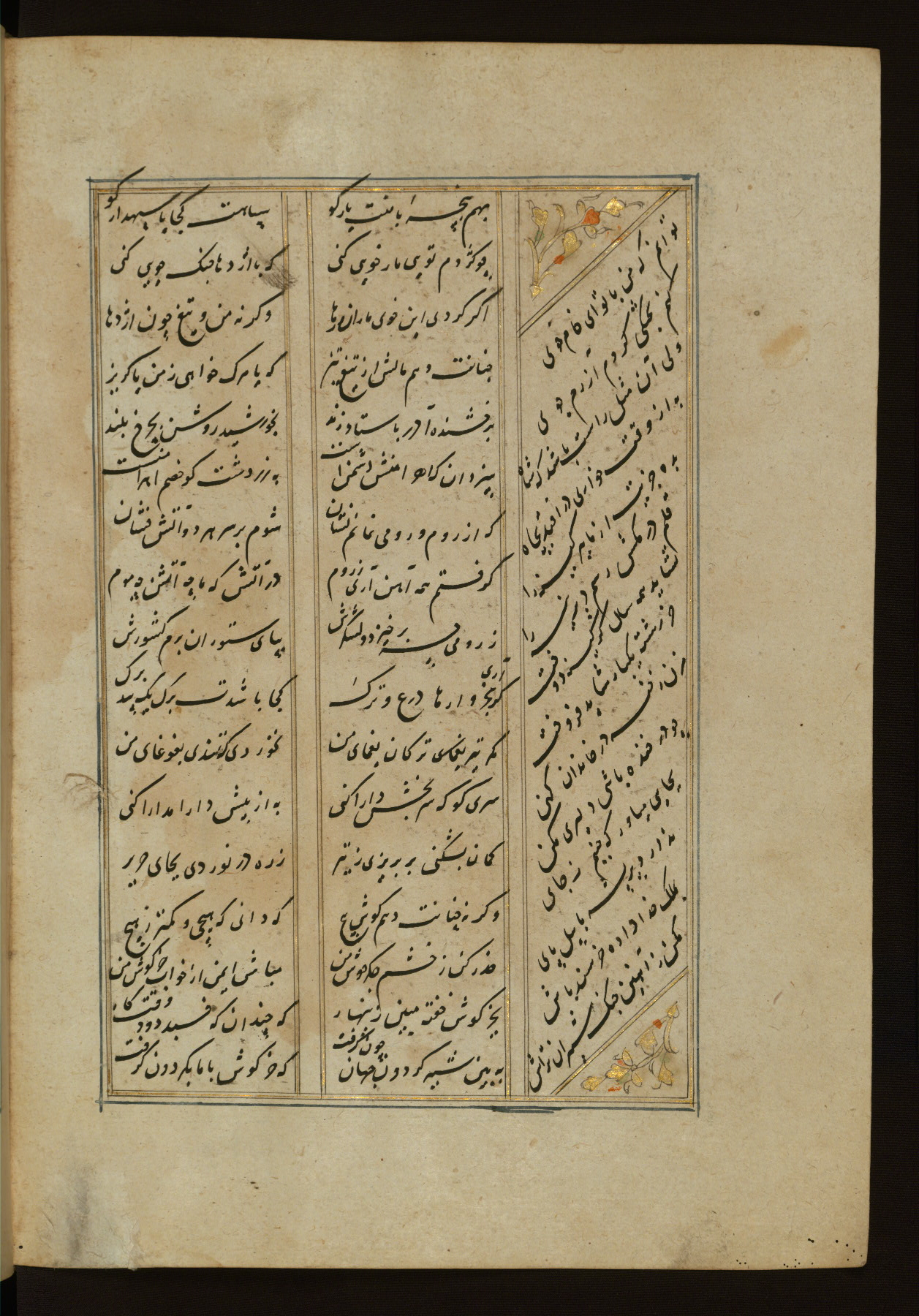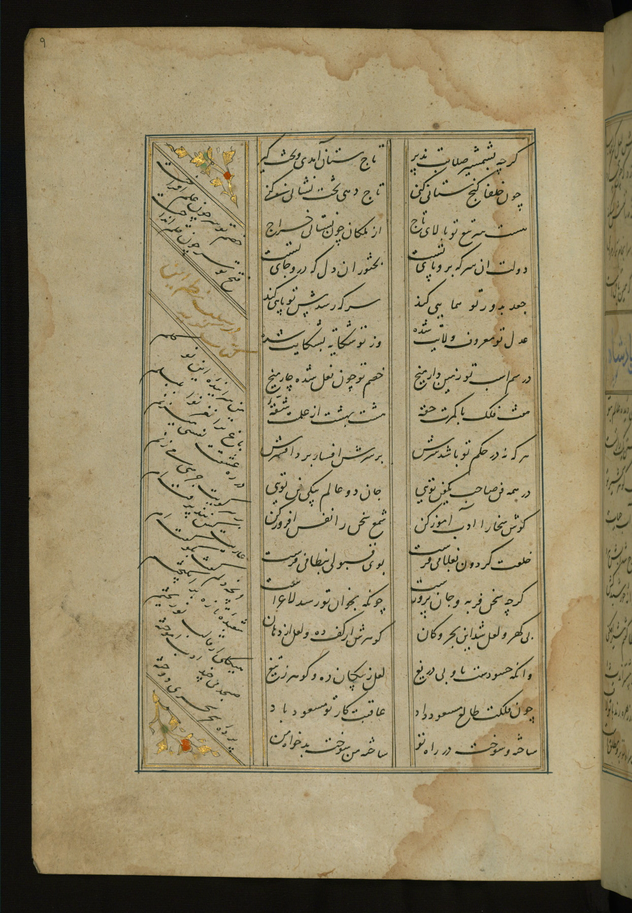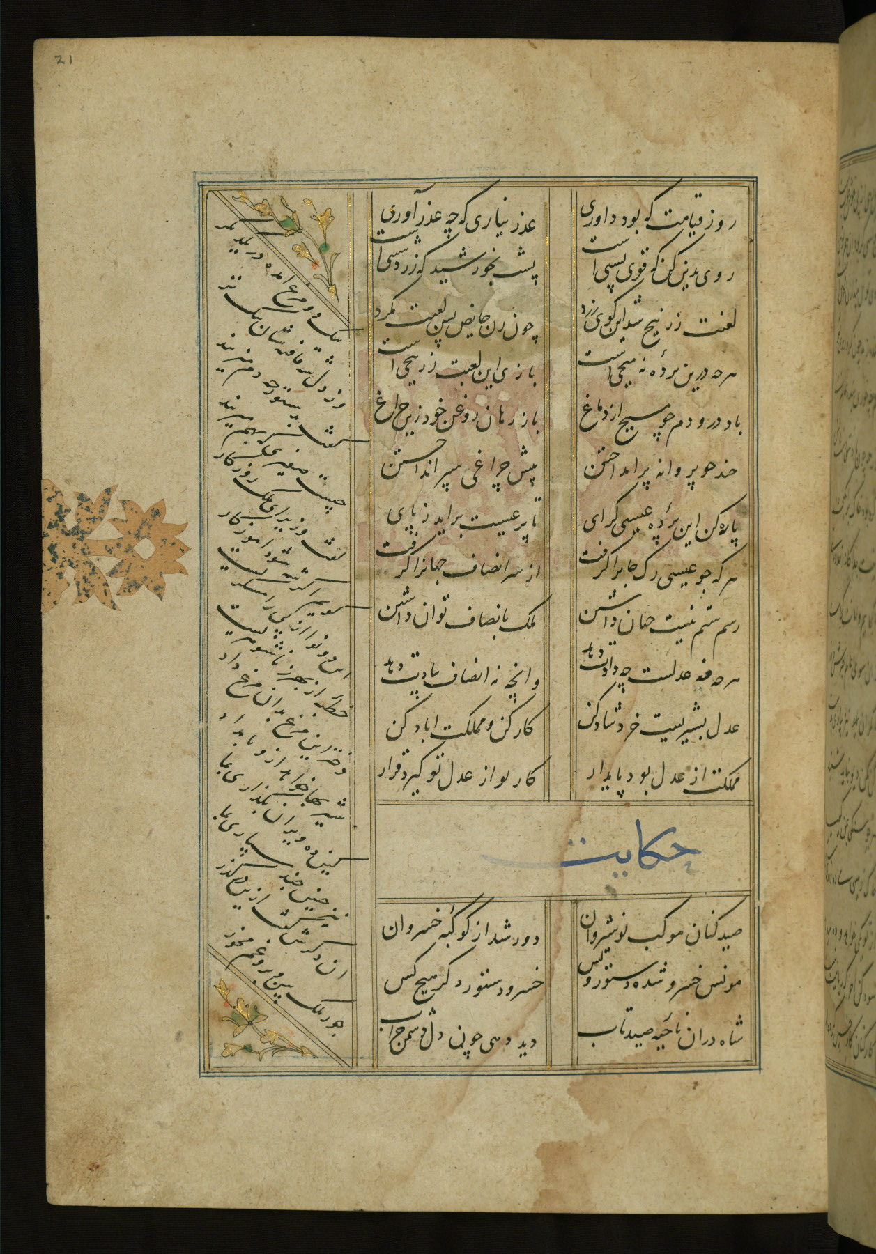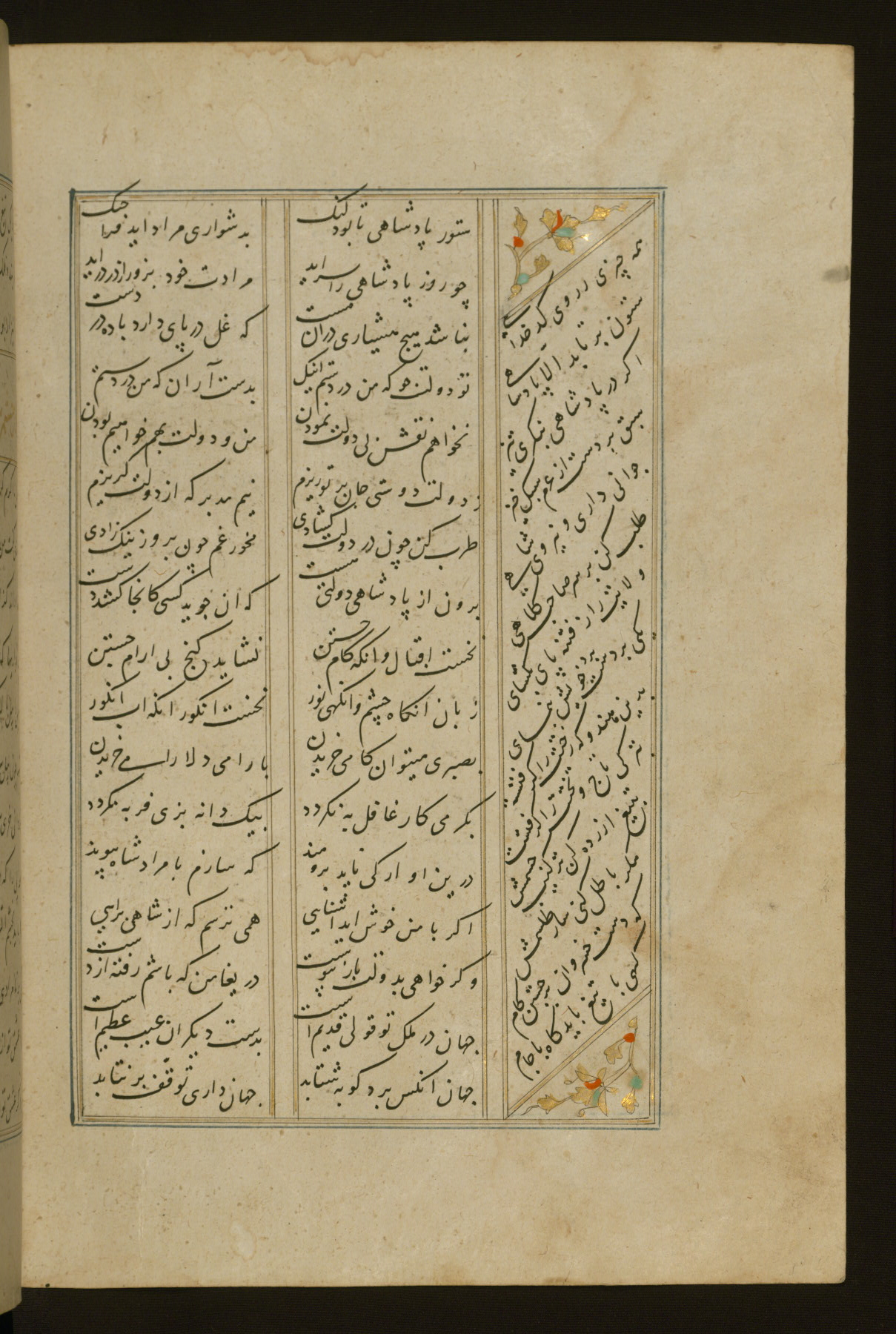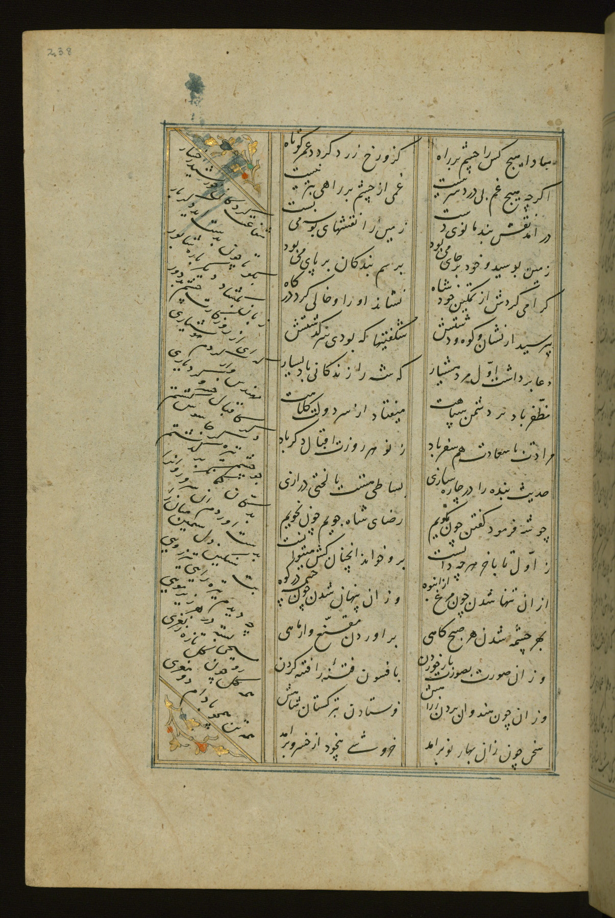 This copy of the Khamsah (quintet) of Niẓāmī Ganjavī (d. 605 AH / 1209 CE) was written by Abū Bakr Shāh ibn Ḥasan ibn ʿAlī al-Shahrastānī and illuminated by Jamāl al-Dīn ibn Muḥammad al-Ṣiddīqī al-Iṣfahānī between 892 AH / 1486 CE and 900 AH / 1494-5 CE. The manuscript opens with a double-page illuminated frontispiece with an inscription giving the title of the work and the name of the author (fols. 1b-2a). There are four illuminated titlepieces with the names of the individual poems and twenty-six repainted illustrations. According to evidence supplied by the colophons, the original binding was by the hand of Jamāl al-Dīn ibn Muḥammad al-Ṣiddīqī al-Iṣfahānī, as well. Unfortunately, it has not survived. The binding presently attached to the manuscript dates to the twelfth century AH / eighteenth CE.