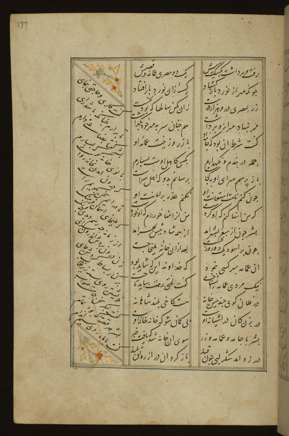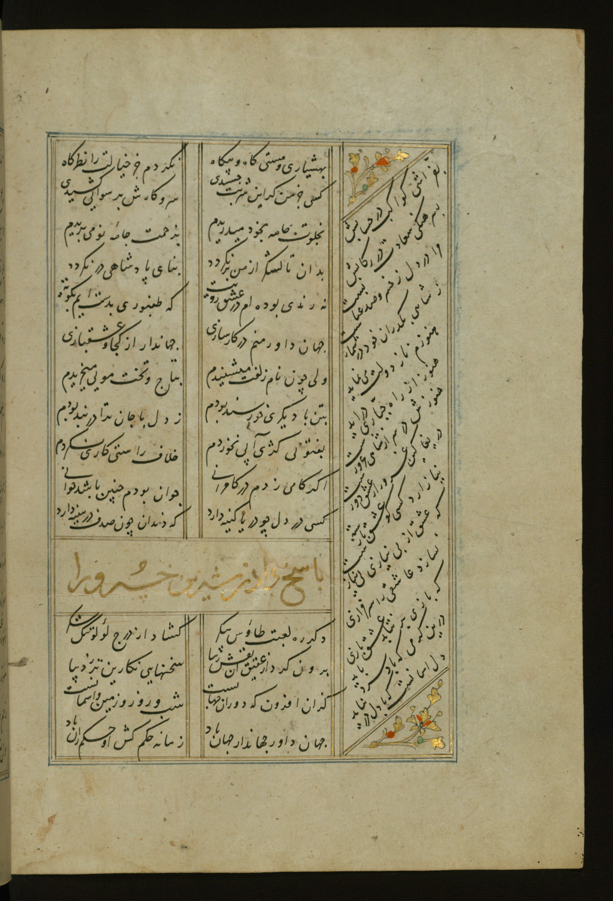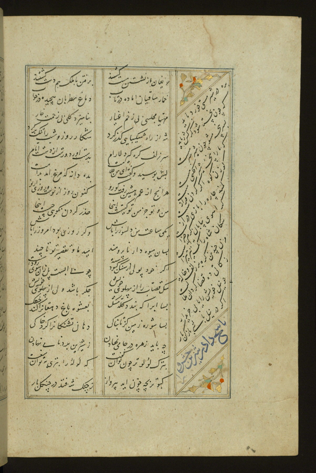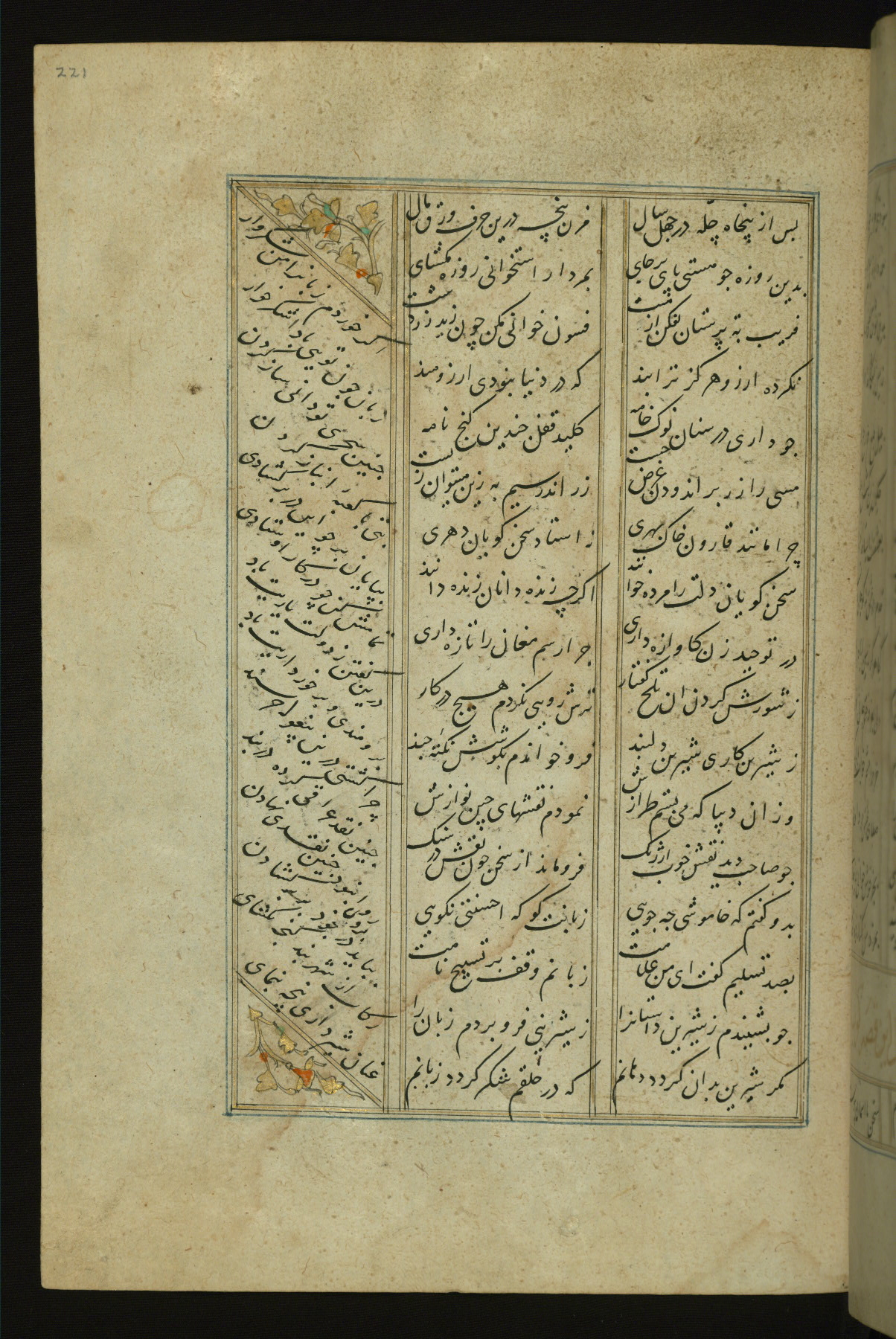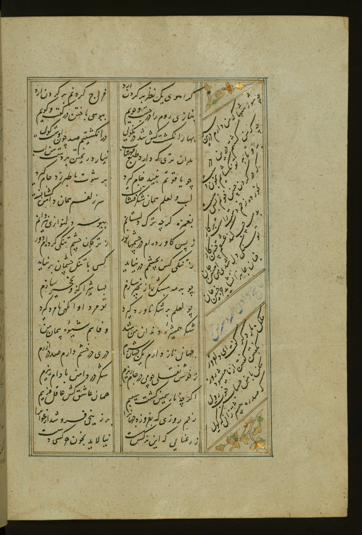 This copy of the Khamsah (quintet) of Niẓāmī Ganjavī (d. 605 AH / 1209 CE) was written by Abū Bakr Shāh ibn Ḥasan ibn ʿAlī al-Shahrastānī and illuminated by Jamāl al-Dīn ibn Muḥammad al-Ṣiddīqī al-Iṣfahānī between 892 AH / 1486 CE and 900 AH / 1494-5 CE. The manuscript opens with a double-page illuminated frontispiece with an inscription giving the title of the work and the name of the author (fols. 1b-2a). There are four illuminated titlepieces with the names of the individual poems and twenty-six repainted illustrations. According to evidence supplied by the colophons, the original binding was by the hand of Jamāl al-Dīn ibn Muḥammad al-Ṣiddīqī al-Iṣfahānī, as well. Unfortunately, it has not survived. The binding presently attached to the manuscript dates to the twelfth century AH / eighteenth CE.