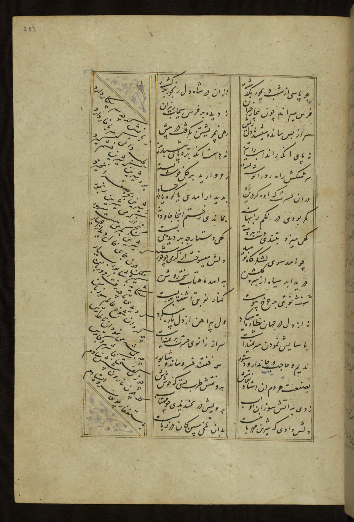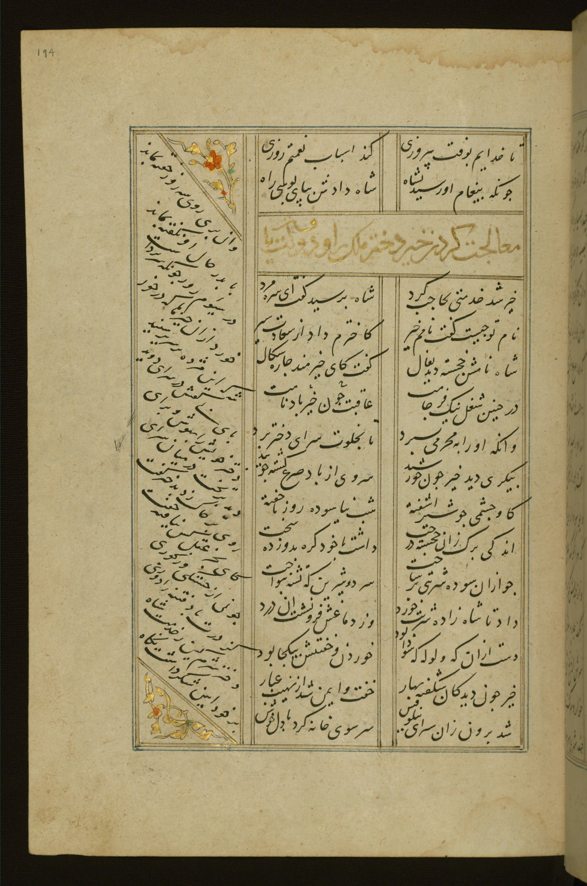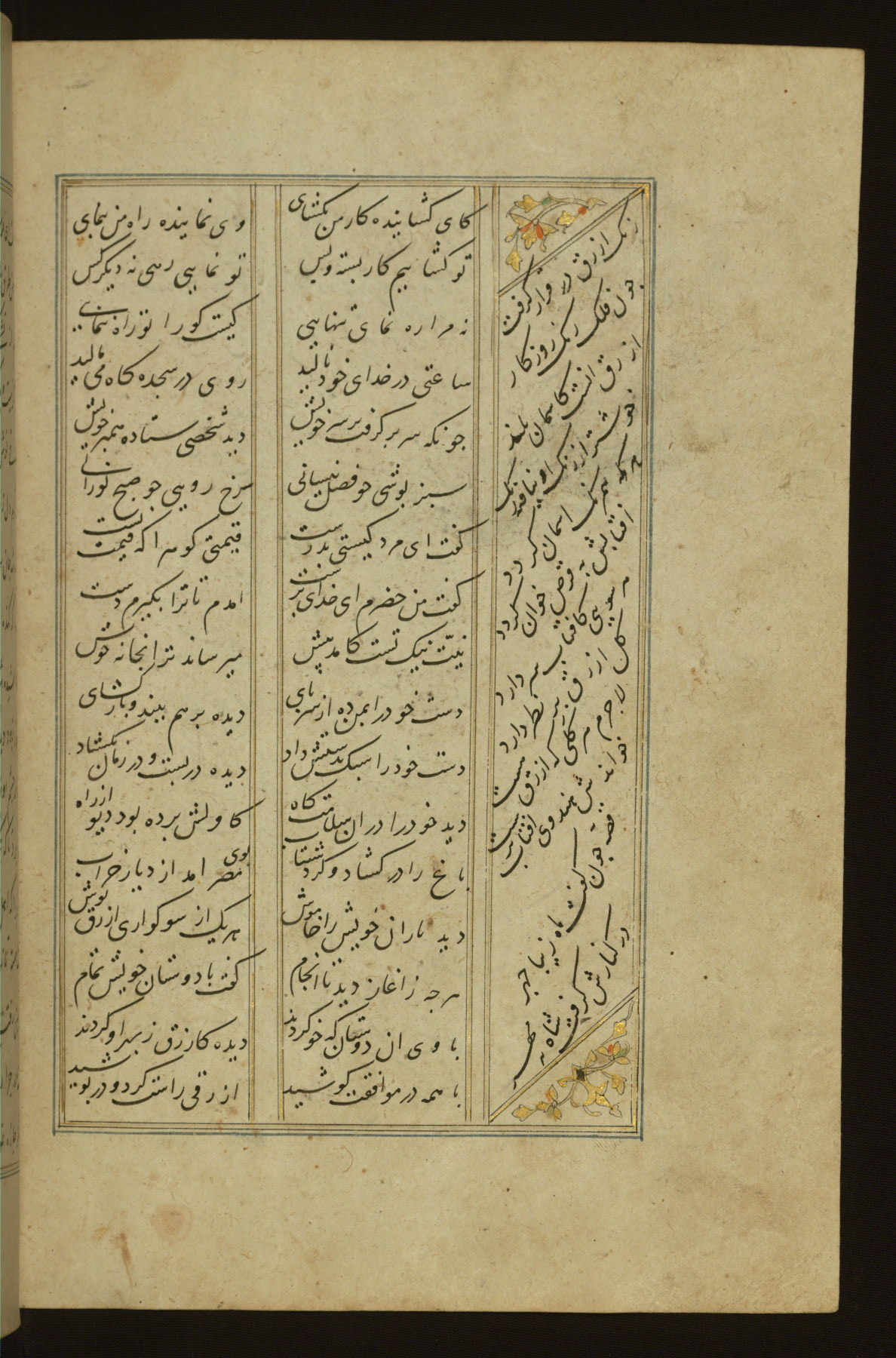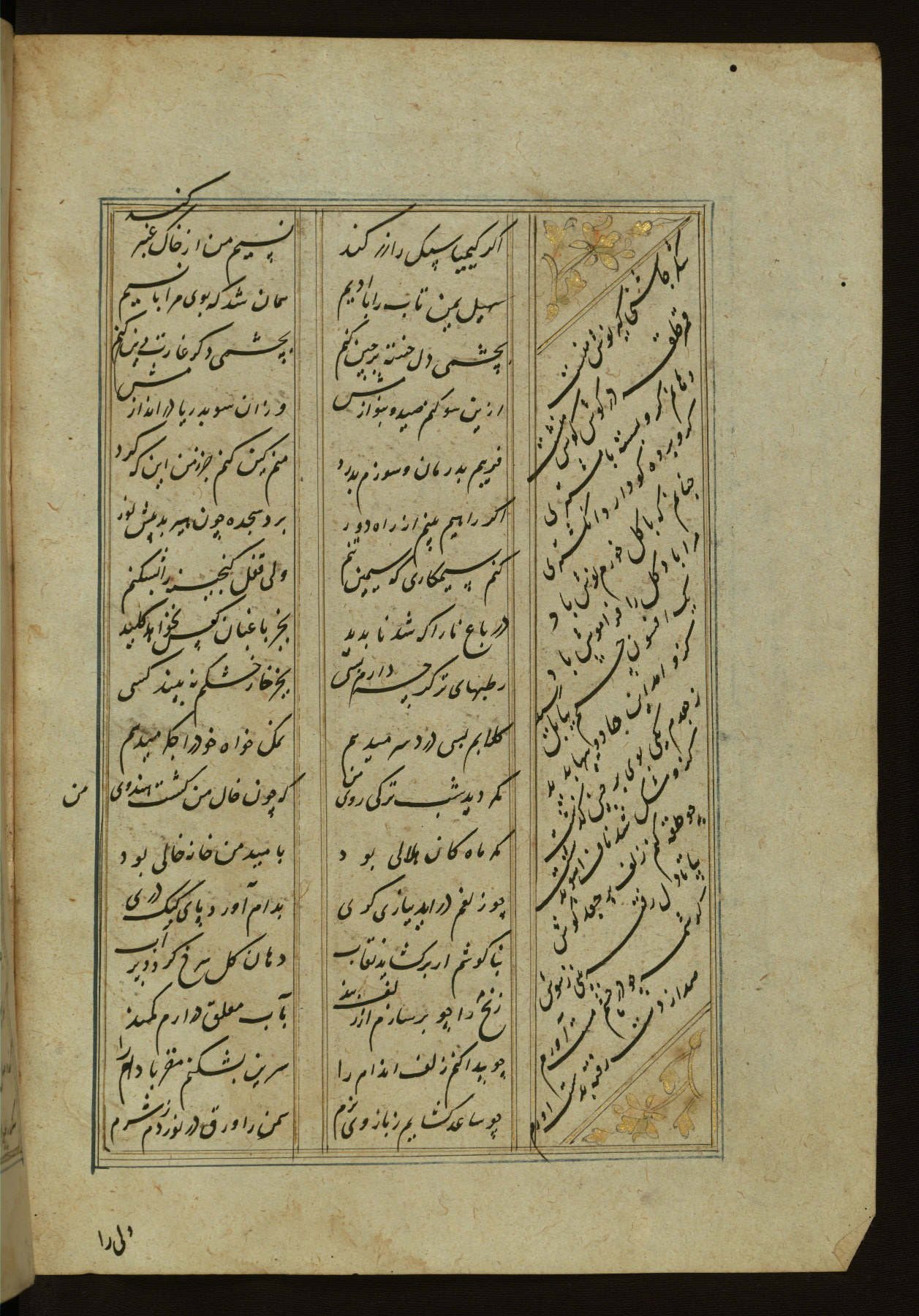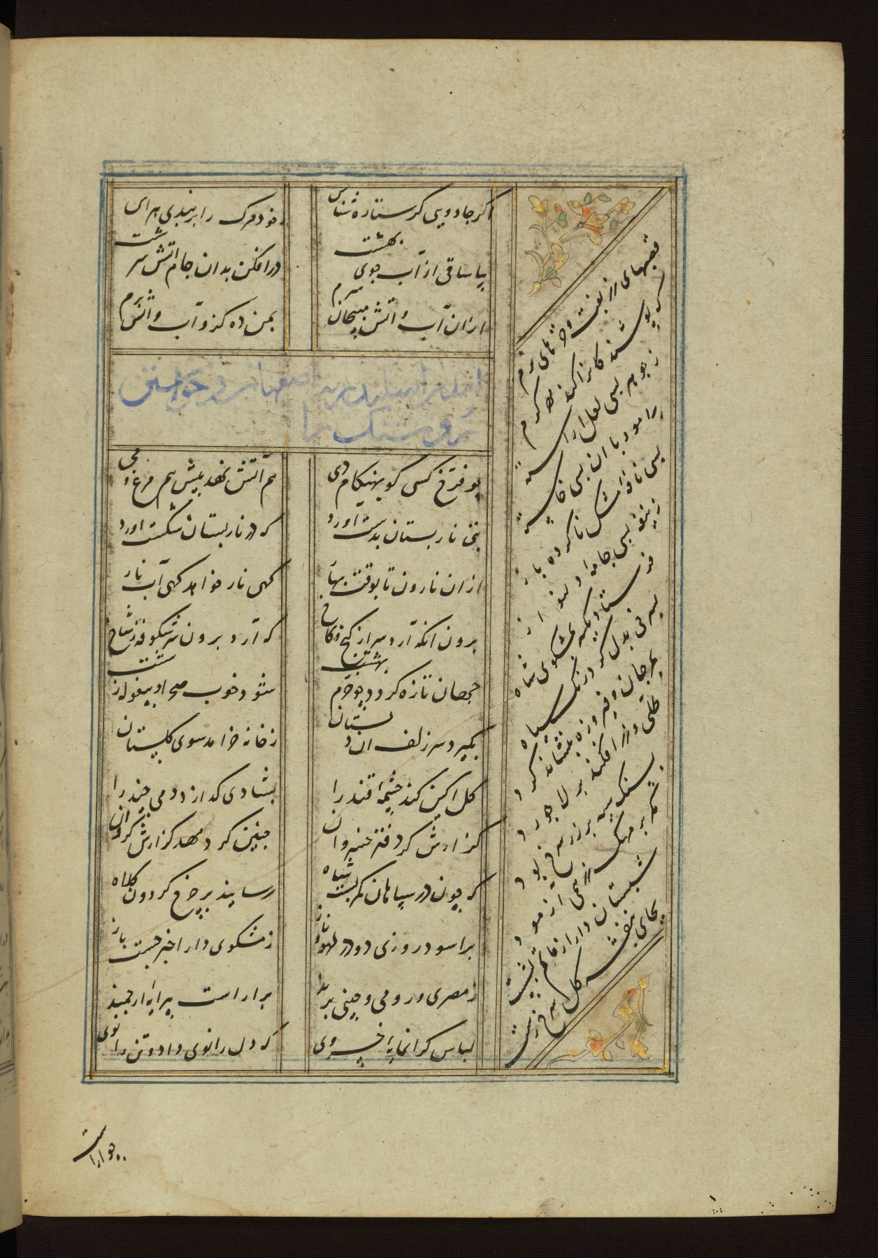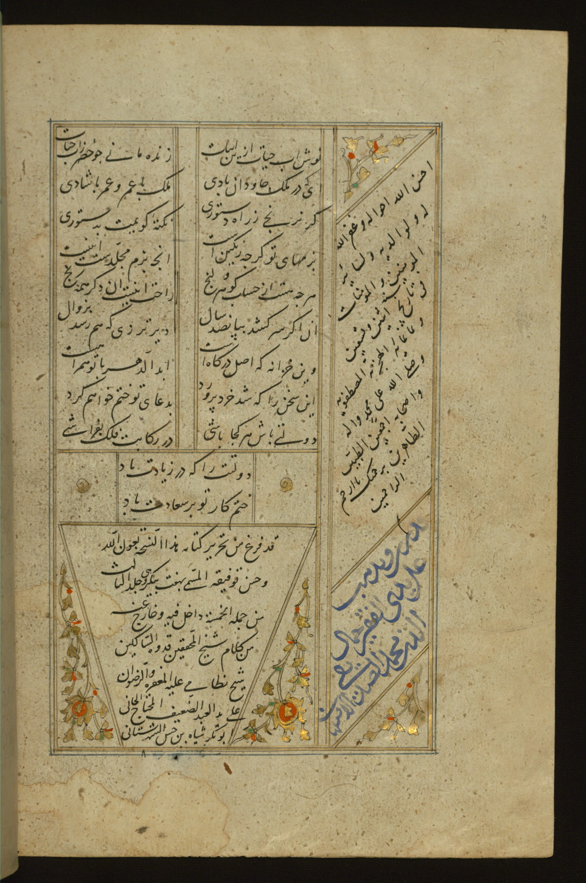 This copy of the Khamsah (quintet) of Niẓāmī Ganjavī (d. 605 AH / 1209 CE) was written by Abū Bakr Shāh ibn Ḥasan ibn ʿAlī al-Shahrastānī and illuminated by Jamāl al-Dīn ibn Muḥammad al-Ṣiddīqī al-Iṣfahānī between 892 AH / 1486 CE and 900 AH / 1494-5 CE. The manuscript opens with a double-page illuminated frontispiece with an inscription giving the title of the work and the name of the author (fols. 1b-2a). There are four illuminated titlepieces with the names of the individual poems and twenty-six repainted illustrations. According to evidence supplied by the colophons, the original binding was by the hand of Jamāl al-Dīn ibn Muḥammad al-Ṣiddīqī al-Iṣfahānī, as well. Unfortunately, it has not survived. The binding presently attached to the manuscript dates to the twelfth century AH / eighteenth CE.