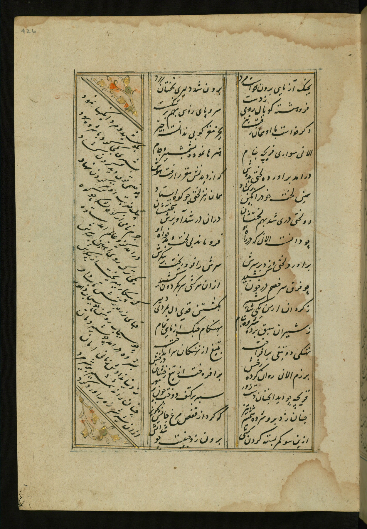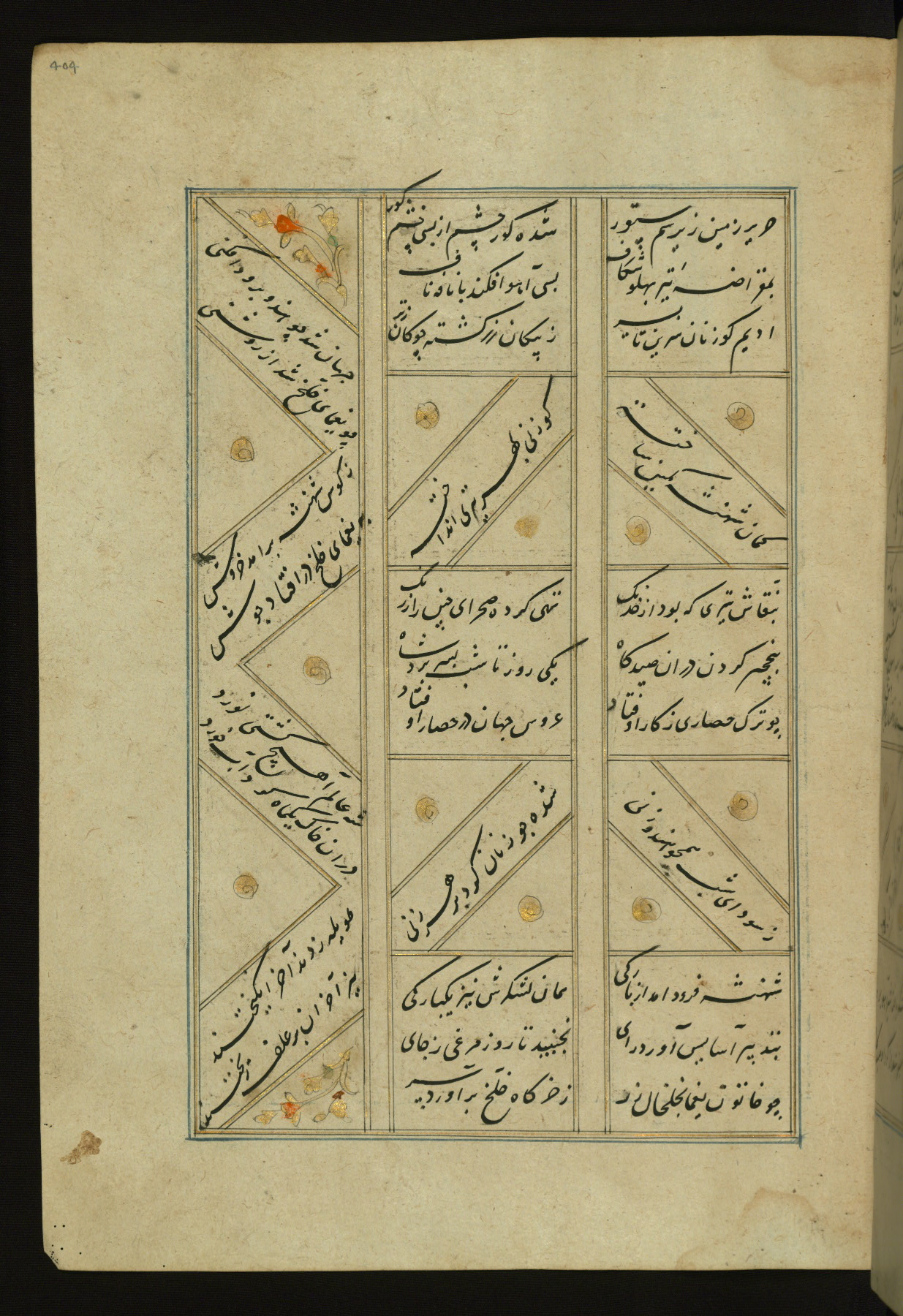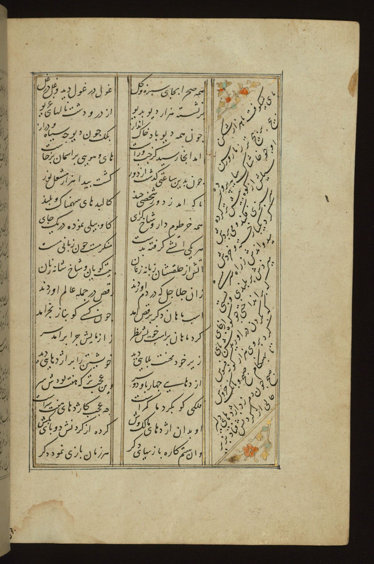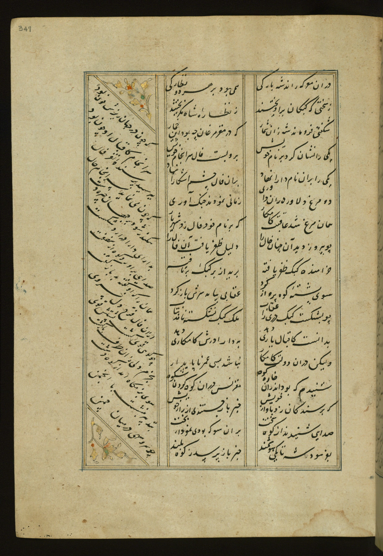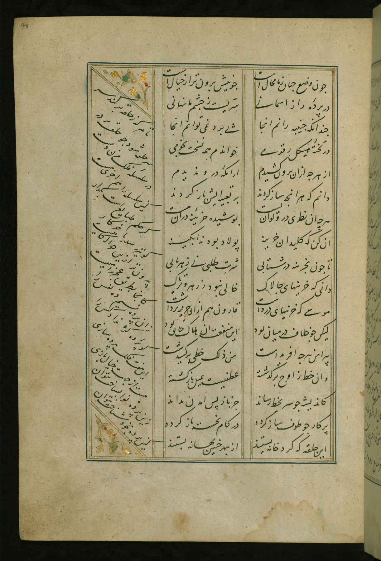 This copy of the Khamsah (quintet) of Niẓāmī Ganjavī (d. 605 AH / 1209 CE) was written by Abū Bakr Shāh ibn Ḥasan ibn ʿAlī al-Shahrastānī and illuminated by Jamāl al-Dīn ibn Muḥammad al-Ṣiddīqī al-Iṣfahānī between 892 AH / 1486 CE and 900 AH / 1494-5 CE. The manuscript opens with a double-page illuminated frontispiece with an inscription giving the title of the work and the name of the author (fols. 1b-2a). There are four illuminated titlepieces with the names of the individual poems and twenty-six repainted illustrations. According to evidence supplied by the colophons, the original binding was by the hand of Jamāl al-Dīn ibn Muḥammad al-Ṣiddīqī al-Iṣfahānī, as well. Unfortunately, it has not survived. The binding presently attached to the manuscript dates to the twelfth century AH / eighteenth CE.