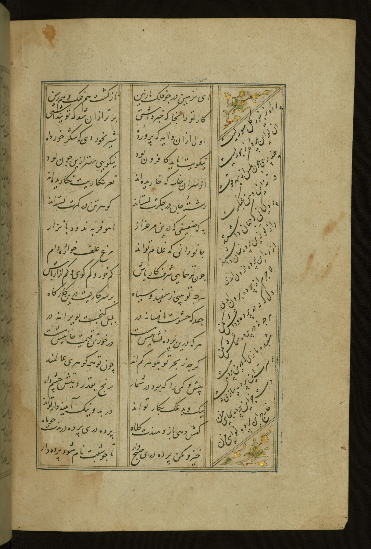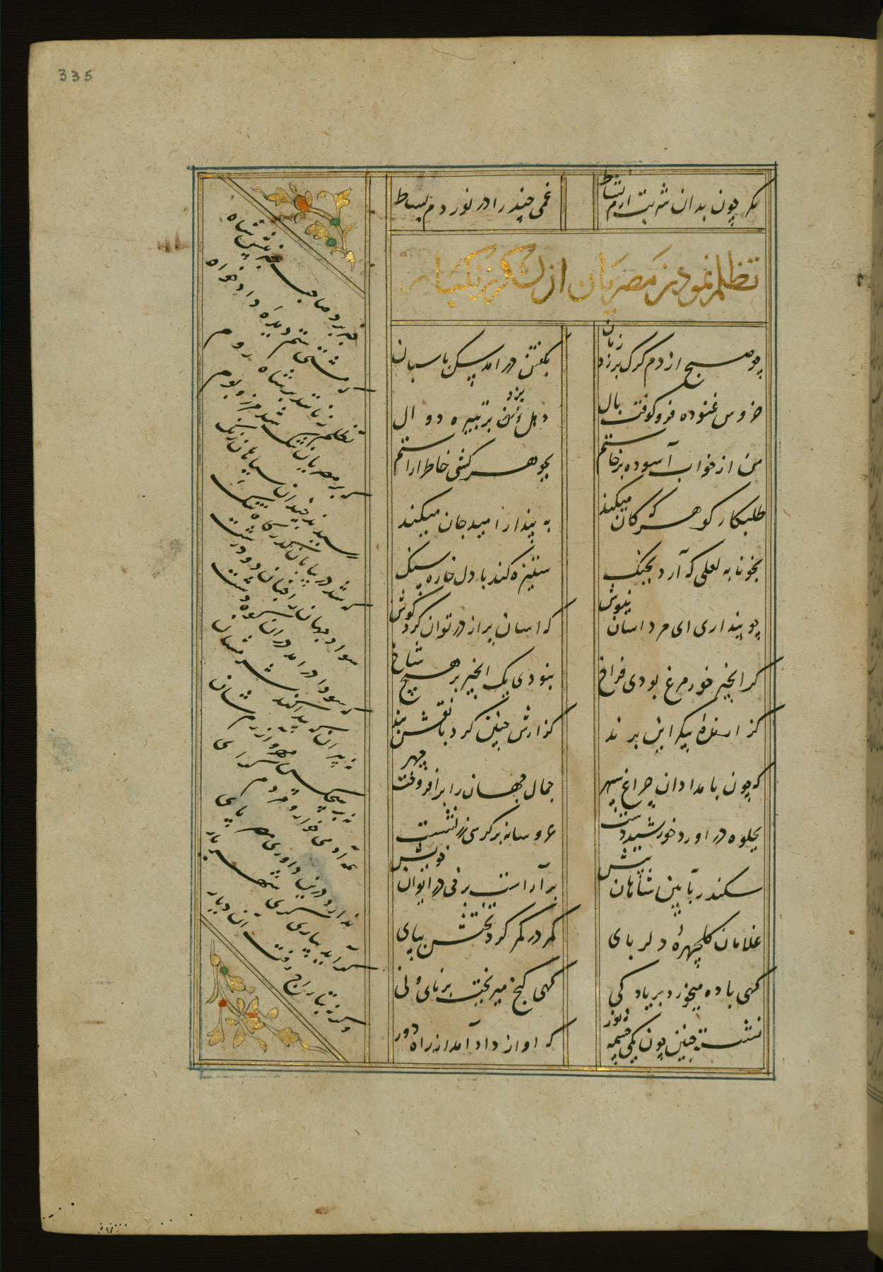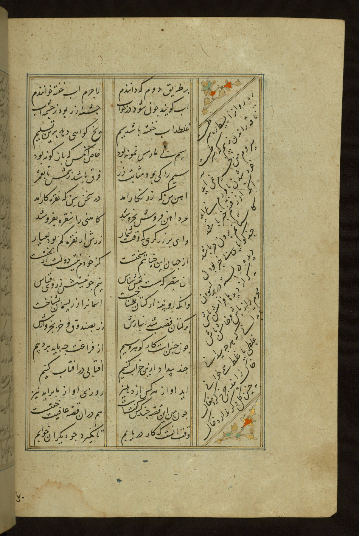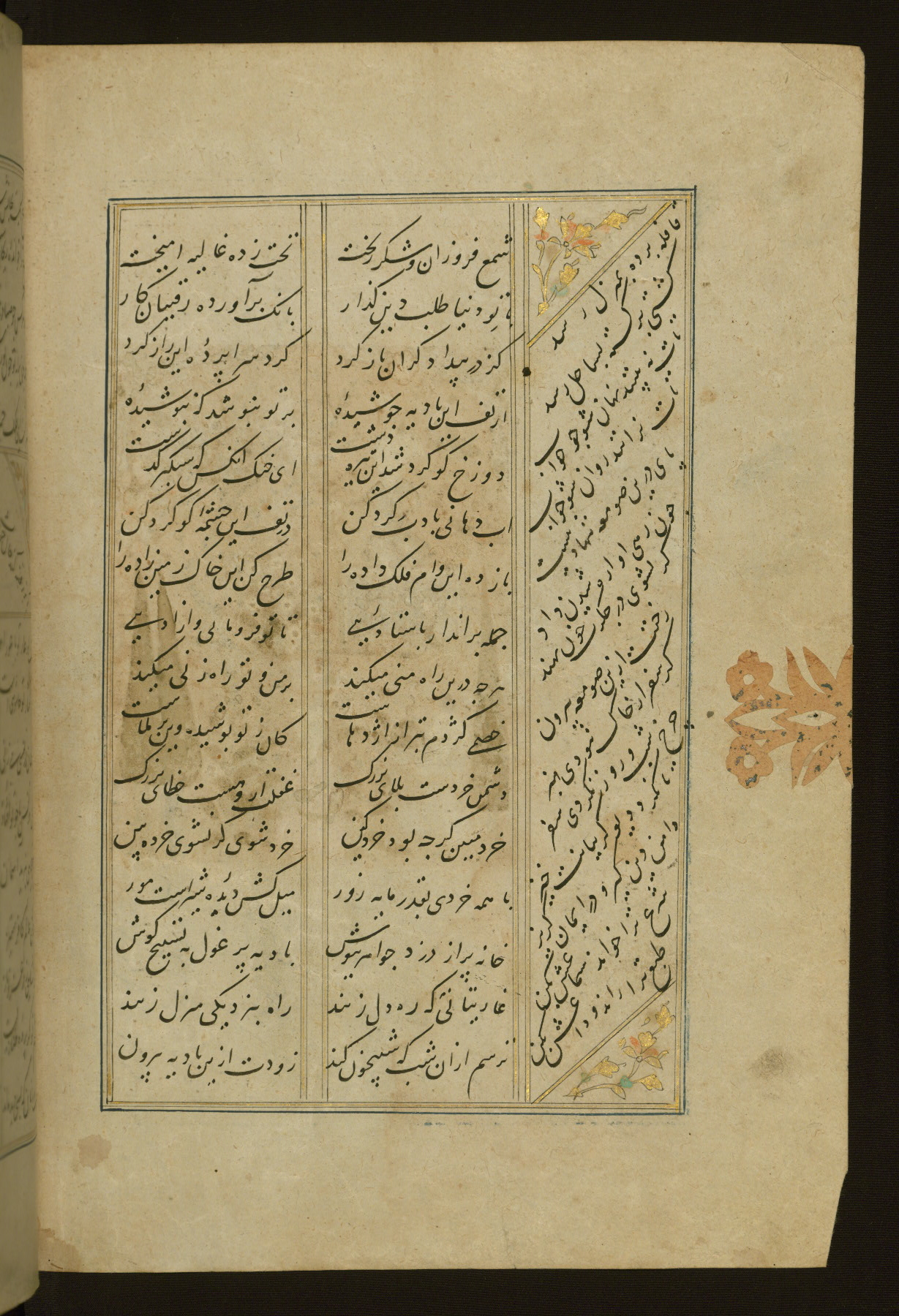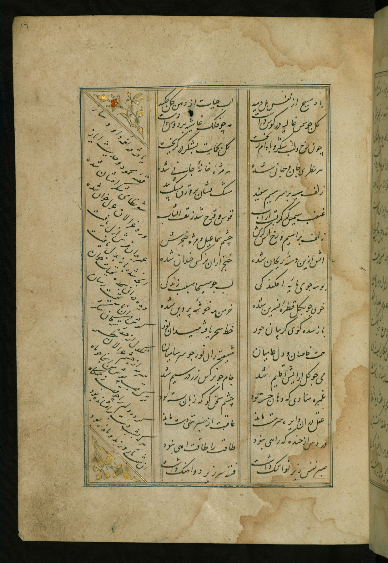 This copy of the Khamsah (quintet) of Niẓāmī Ganjavī (d. 605 AH / 1209 CE) was written by Abū Bakr Shāh ibn Ḥasan ibn ʿAlī al-Shahrastānī and illuminated by Jamāl al-Dīn ibn Muḥammad al-Ṣiddīqī al-Iṣfahānī between 892 AH / 1486 CE and 900 AH / 1494-5 CE. The manuscript opens with a double-page illuminated frontispiece with an inscription giving the title of the work and the name of the author (fols. 1b-2a). There are four illuminated titlepieces with the names of the individual poems and twenty-six repainted illustrations. According to evidence supplied by the colophons, the original binding was by the hand of Jamāl al-Dīn ibn Muḥammad al-Ṣiddīqī al-Iṣfahānī, as well. Unfortunately, it has not survived. The binding presently attached to the manuscript dates to the twelfth century AH / eighteenth CE.