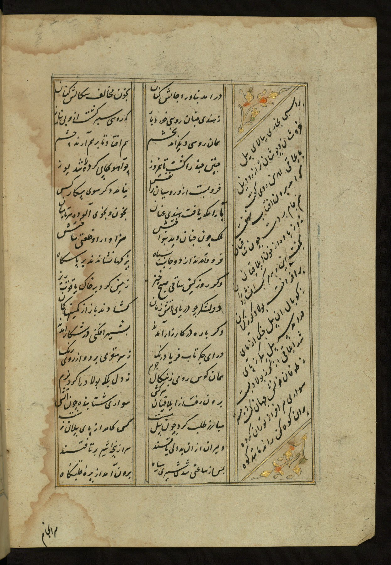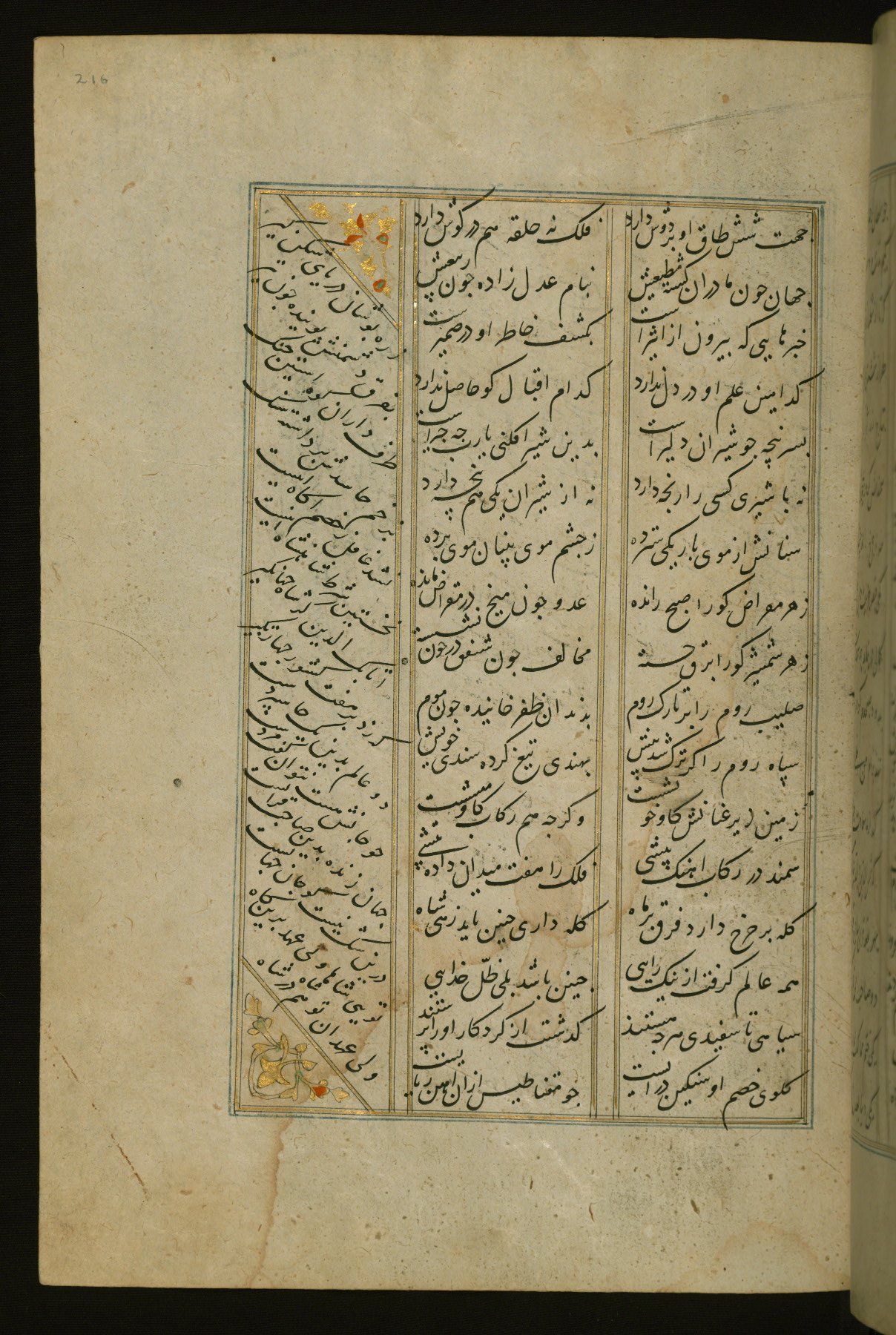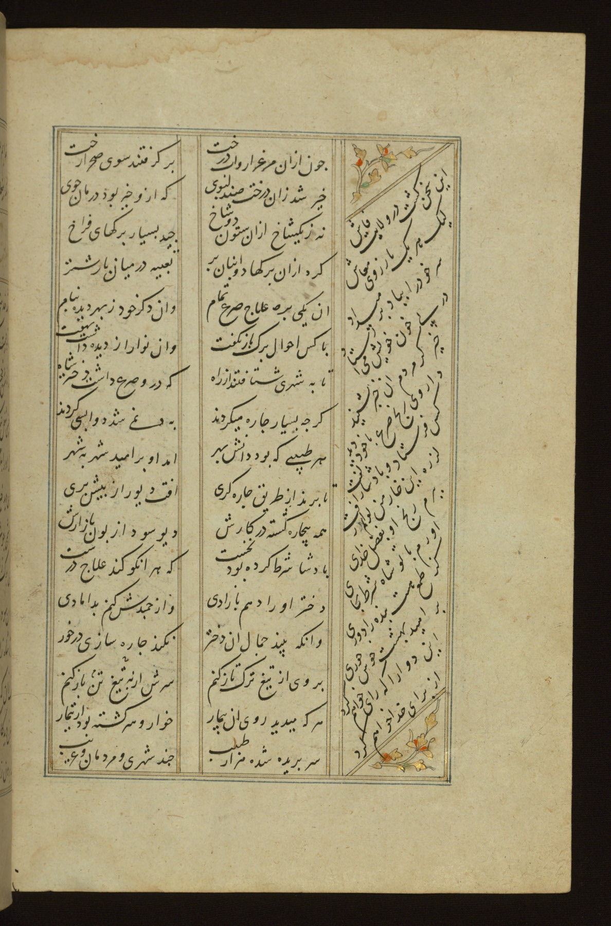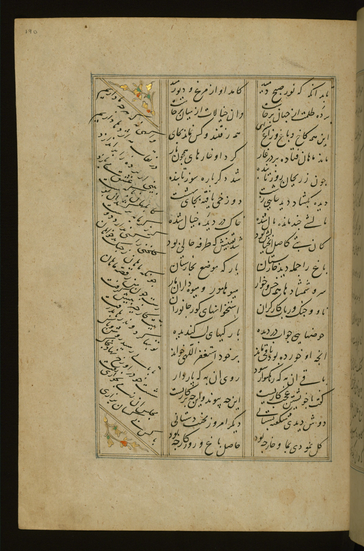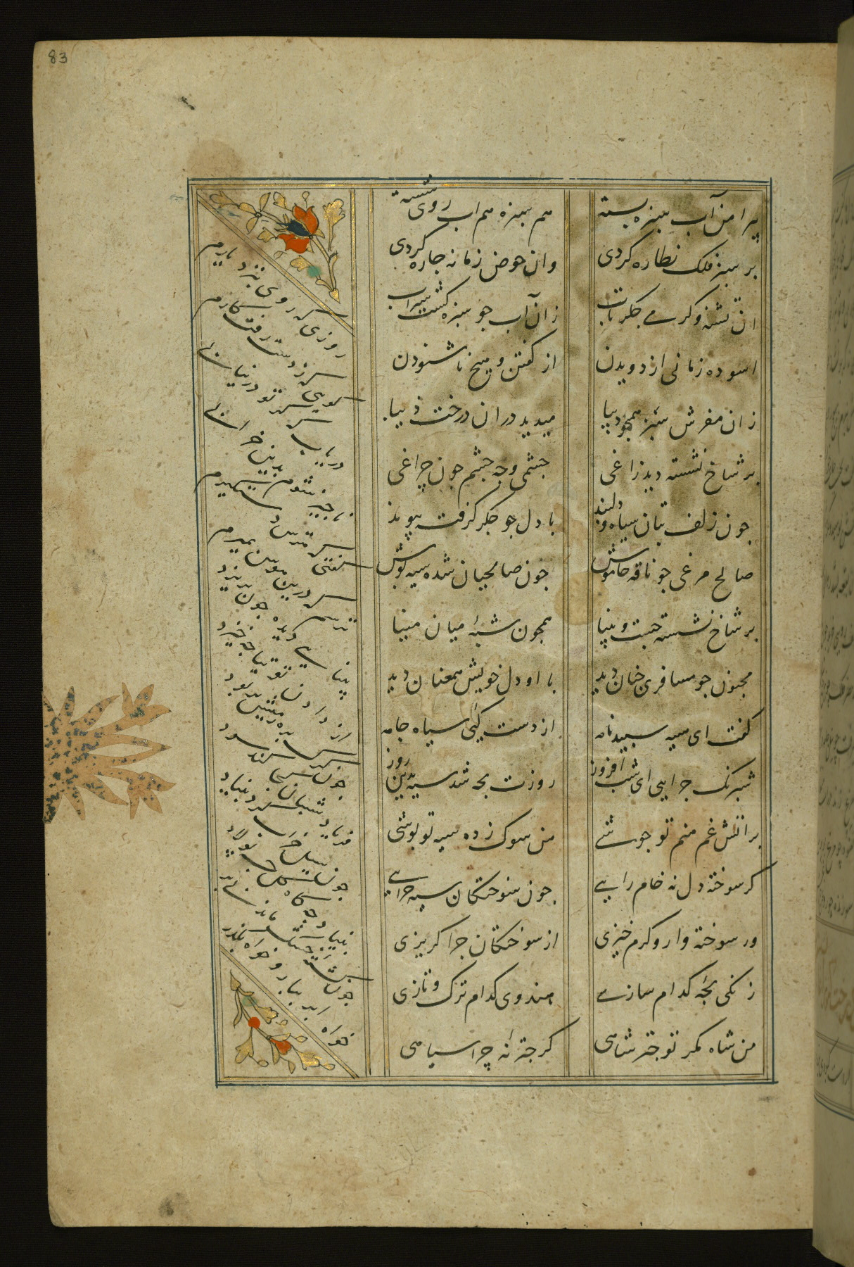 This copy of the Khamsah (quintet) of Niẓāmī Ganjavī (d. 605 AH / 1209 CE) was written by Abū Bakr Shāh ibn Ḥasan ibn ʿAlī al-Shahrastānī and illuminated by Jamāl al-Dīn ibn Muḥammad al-Ṣiddīqī al-Iṣfahānī between 892 AH / 1486 CE and 900 AH / 1494-5 CE. The manuscript opens with a double-page illuminated frontispiece with an inscription giving the title of the work and the name of the author (fols. 1b-2a). There are four illuminated titlepieces with the names of the individual poems and twenty-six repainted illustrations. According to evidence supplied by the colophons, the original binding was by the hand of Jamāl al-Dīn ibn Muḥammad al-Ṣiddīqī al-Iṣfahānī, as well. Unfortunately, it has not survived. The binding presently attached to the manuscript dates to the twelfth century AH / eighteenth CE.