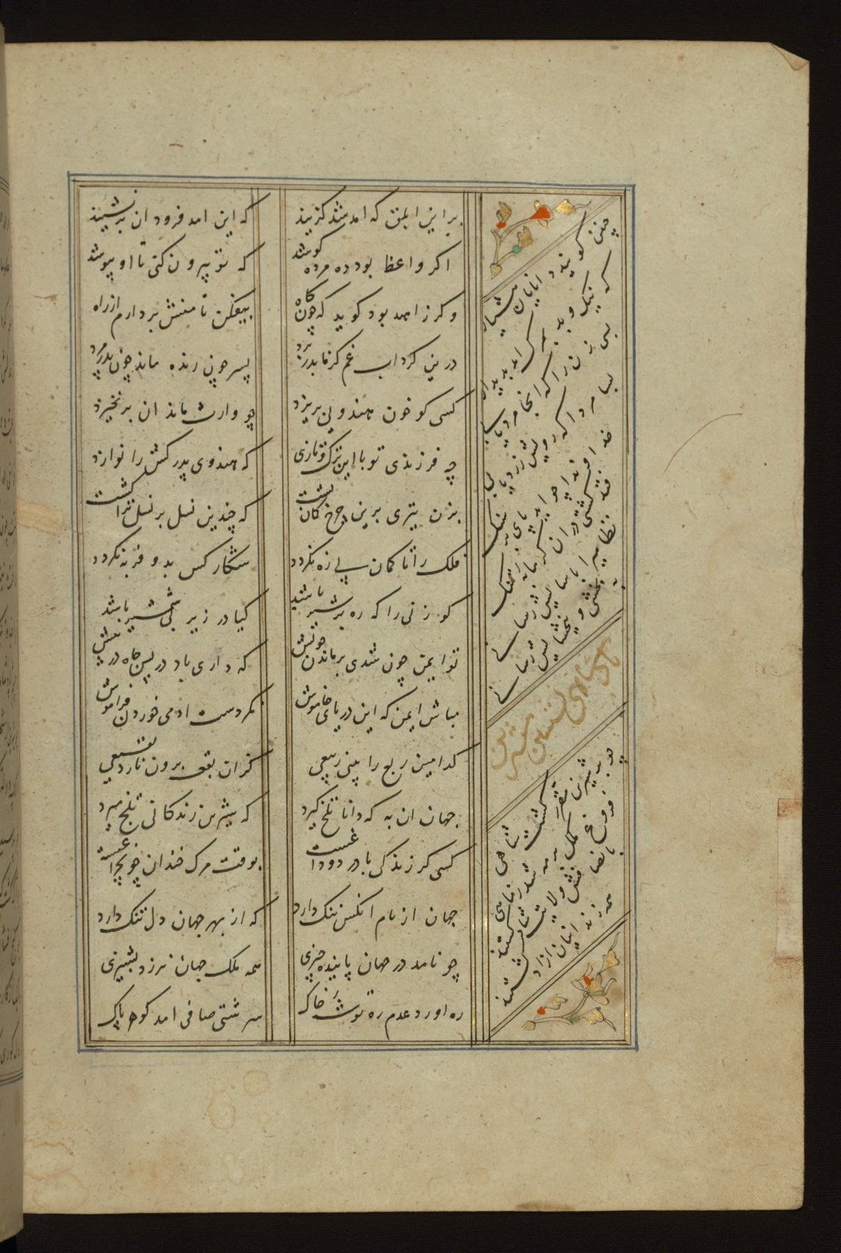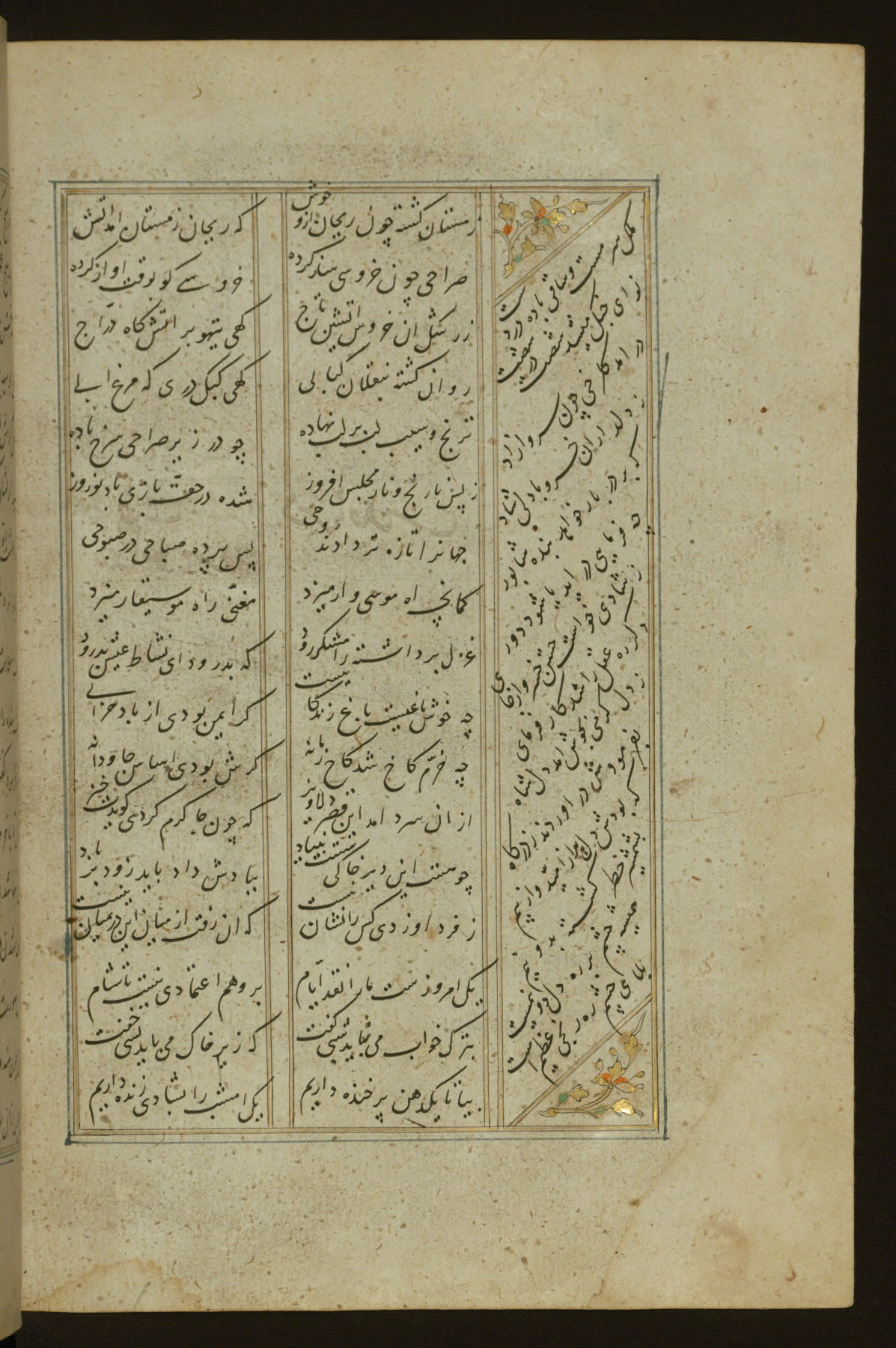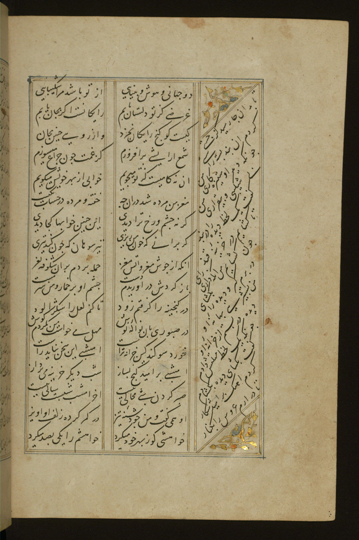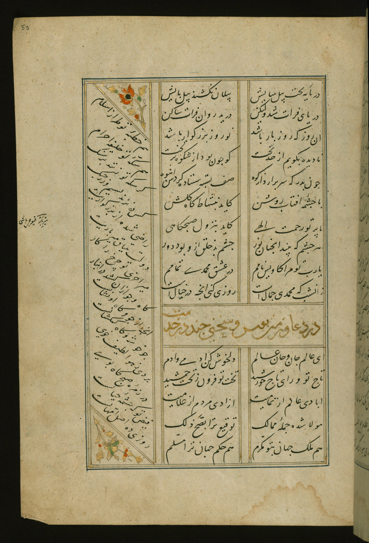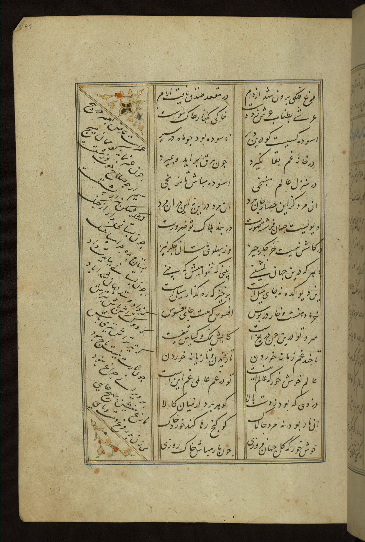 This copy of the Khamsah (quintet) of Niẓāmī Ganjavī (d. 605 AH / 1209 CE) was written by Abū Bakr Shāh ibn Ḥasan ibn ʿAlī al-Shahrastānī and illuminated by Jamāl al-Dīn ibn Muḥammad al-Ṣiddīqī al-Iṣfahānī between 892 AH / 1486 CE and 900 AH / 1494-5 CE. The manuscript opens with a double-page illuminated frontispiece with an inscription giving the title of the work and the name of the author (fols. 1b-2a). There are four illuminated titlepieces with the names of the individual poems and twenty-six repainted illustrations. According to evidence supplied by the colophons, the original binding was by the hand of Jamāl al-Dīn ibn Muḥammad al-Ṣiddīqī al-Iṣfahānī, as well. Unfortunately, it has not survived. The binding presently attached to the manuscript dates to the twelfth century AH / eighteenth CE.