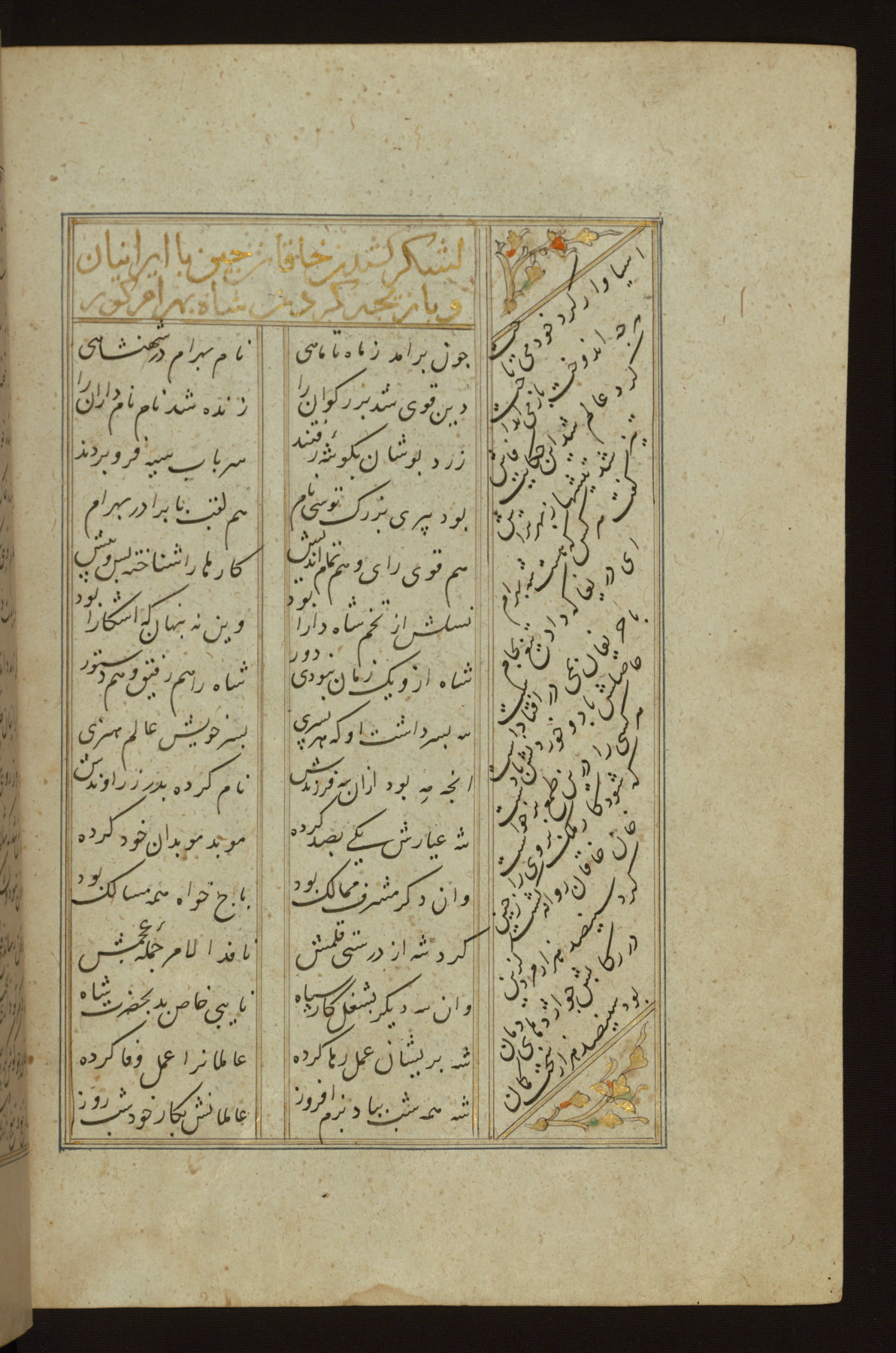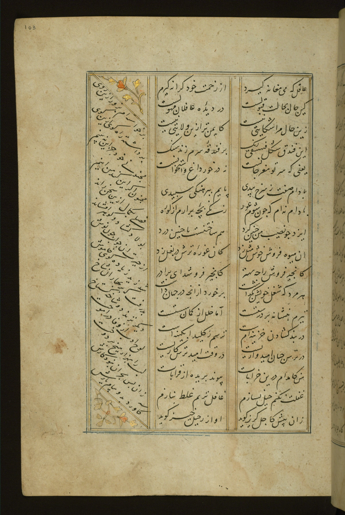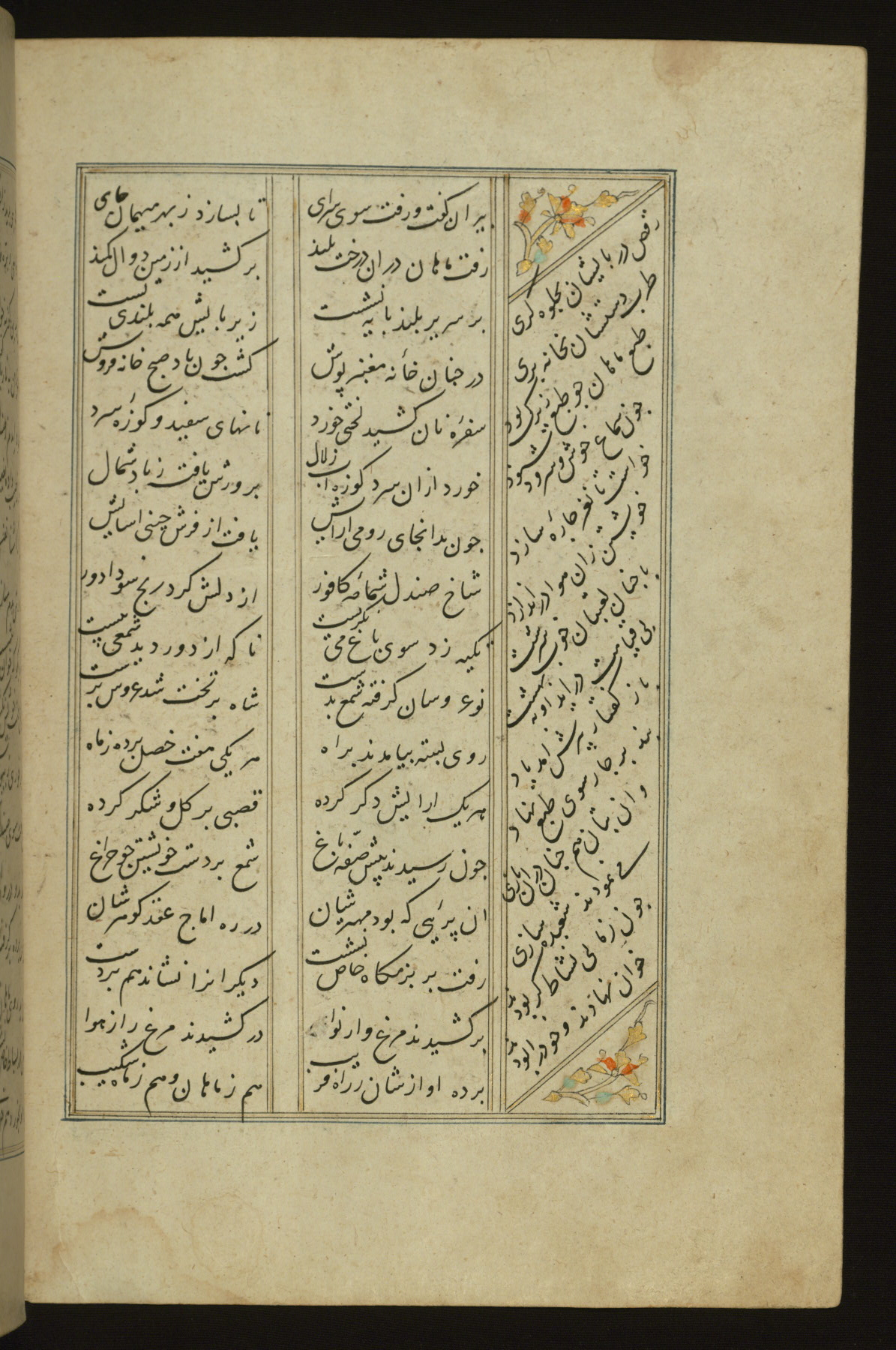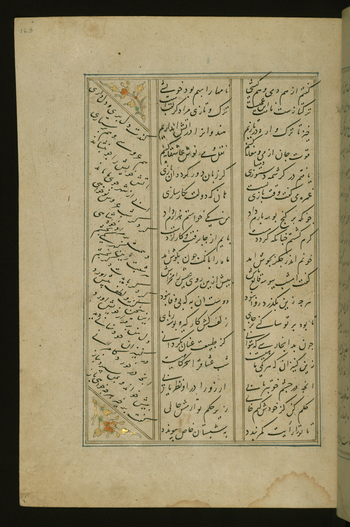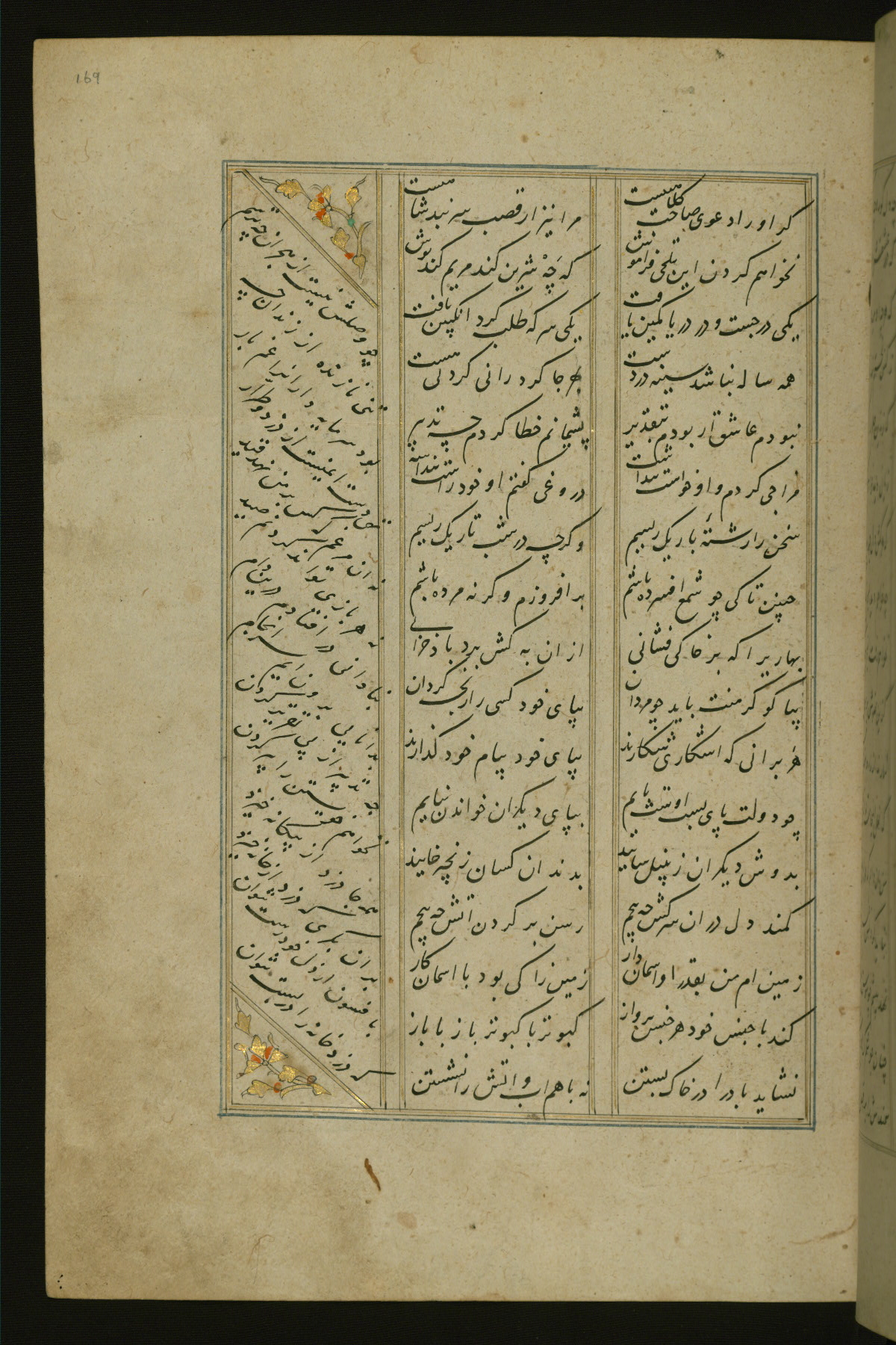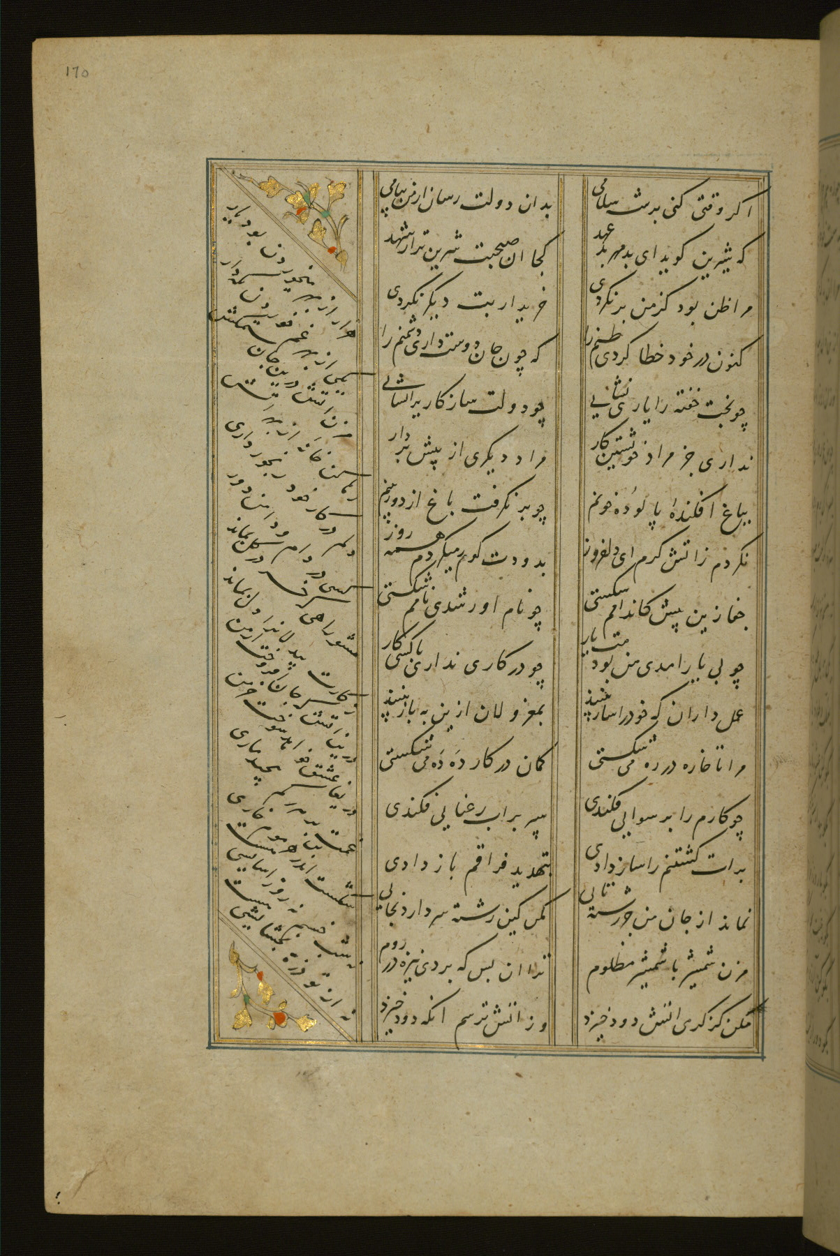 This copy of the Khamsah (quintet) of Niẓāmī Ganjavī (d. 605 AH / 1209 CE) was written by Abū Bakr Shāh ibn Ḥasan ibn ʿAlī al-Shahrastānī and illuminated by Jamāl al-Dīn ibn Muḥammad al-Ṣiddīqī al-Iṣfahānī between 892 AH / 1486 CE and 900 AH / 1494-5 CE. The manuscript opens with a double-page illuminated frontispiece with an inscription giving the title of the work and the name of the author (fols. 1b-2a). There are four illuminated titlepieces with the names of the individual poems and twenty-six repainted illustrations. According to evidence supplied by the colophons, the original binding was by the hand of Jamāl al-Dīn ibn Muḥammad al-Ṣiddīqī al-Iṣfahānī, as well. Unfortunately, it has not survived. The binding presently attached to the manuscript dates to the twelfth century AH / eighteenth CE.