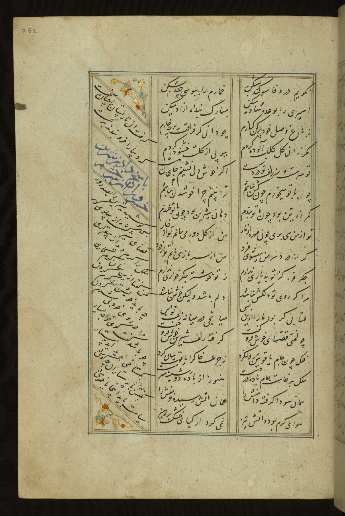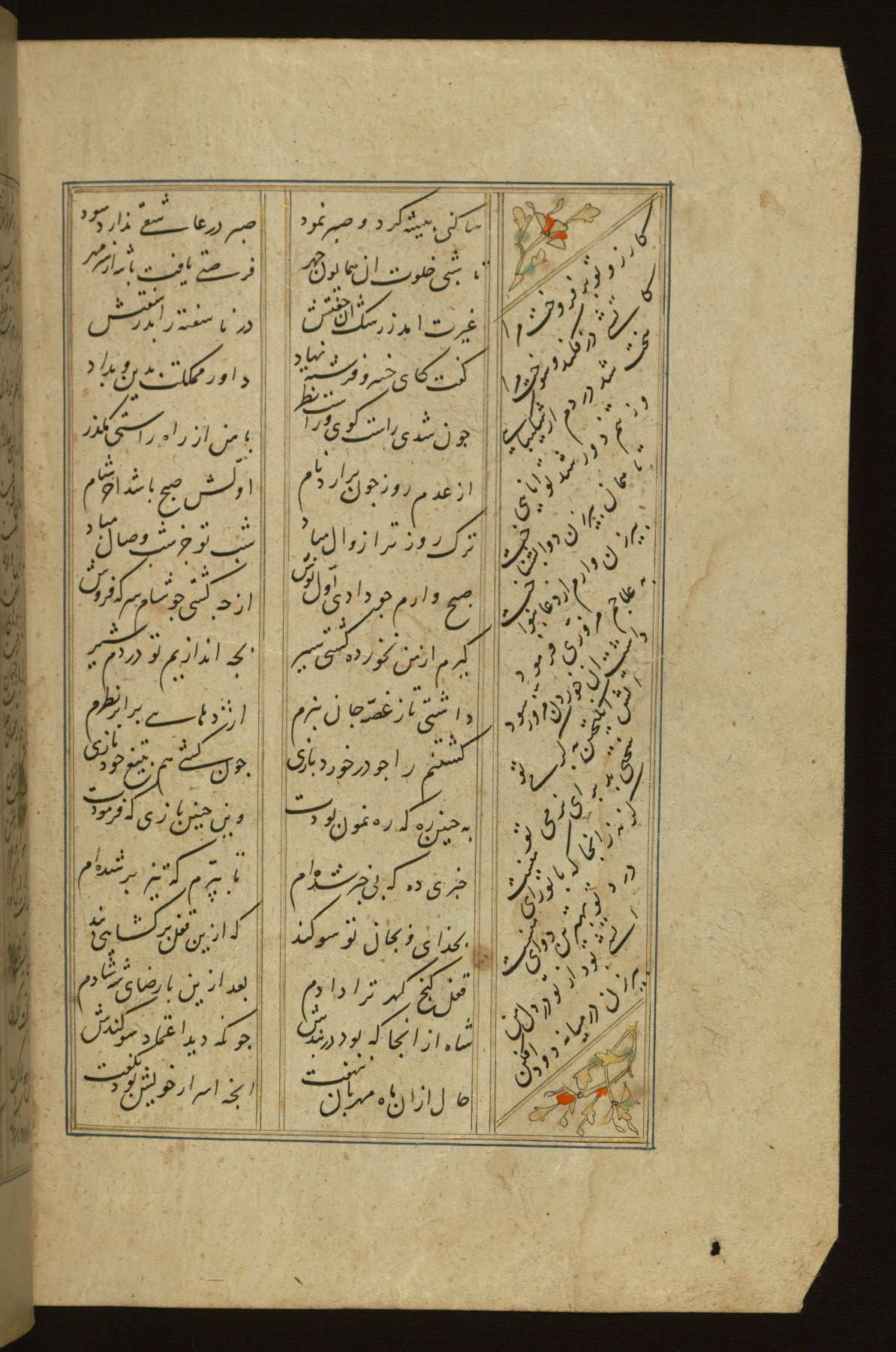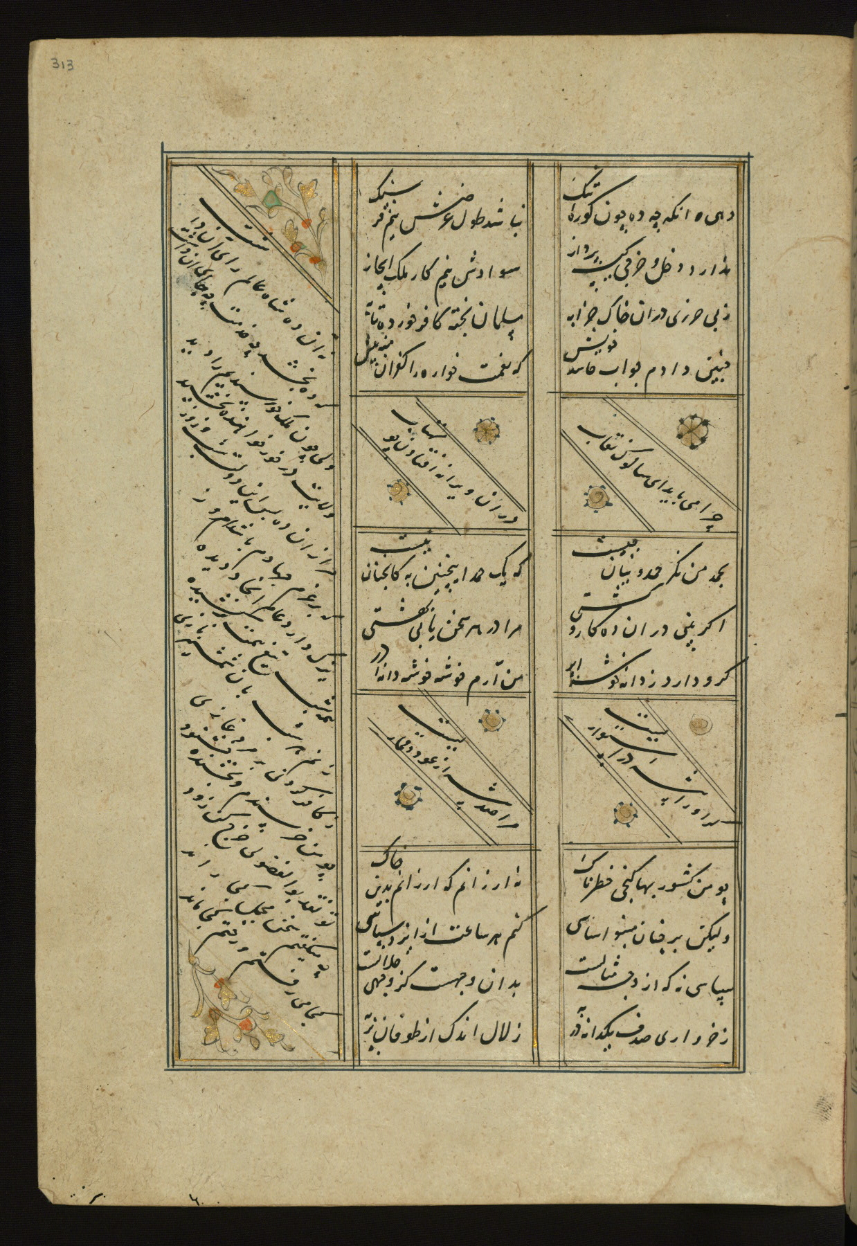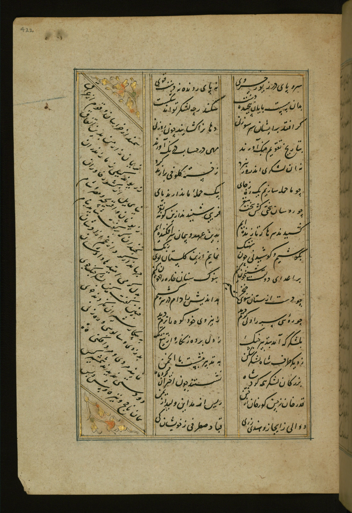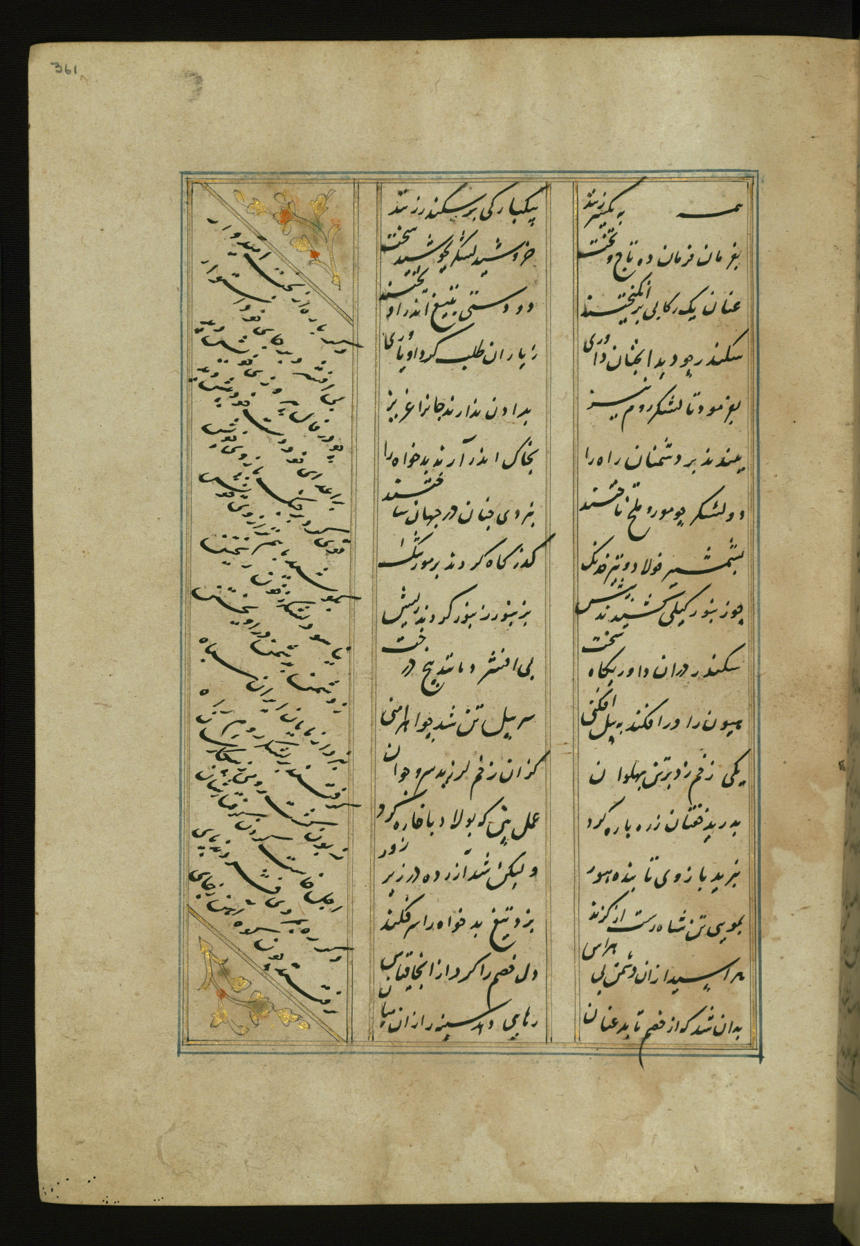 This copy of the Khamsah (quintet) of Niẓāmī Ganjavī (d. 605 AH / 1209 CE) was written by Abū Bakr Shāh ibn Ḥasan ibn ʿAlī al-Shahrastānī and illuminated by Jamāl al-Dīn ibn Muḥammad al-Ṣiddīqī al-Iṣfahānī between 892 AH / 1486 CE and 900 AH / 1494-5 CE. The manuscript opens with a double-page illuminated frontispiece with an inscription giving the title of the work and the name of the author (fols. 1b-2a). There are four illuminated titlepieces with the names of the individual poems and twenty-six repainted illustrations. According to evidence supplied by the colophons, the original binding was by the hand of Jamāl al-Dīn ibn Muḥammad al-Ṣiddīqī al-Iṣfahānī, as well. Unfortunately, it has not survived. The binding presently attached to the manuscript dates to the twelfth century AH / eighteenth CE.