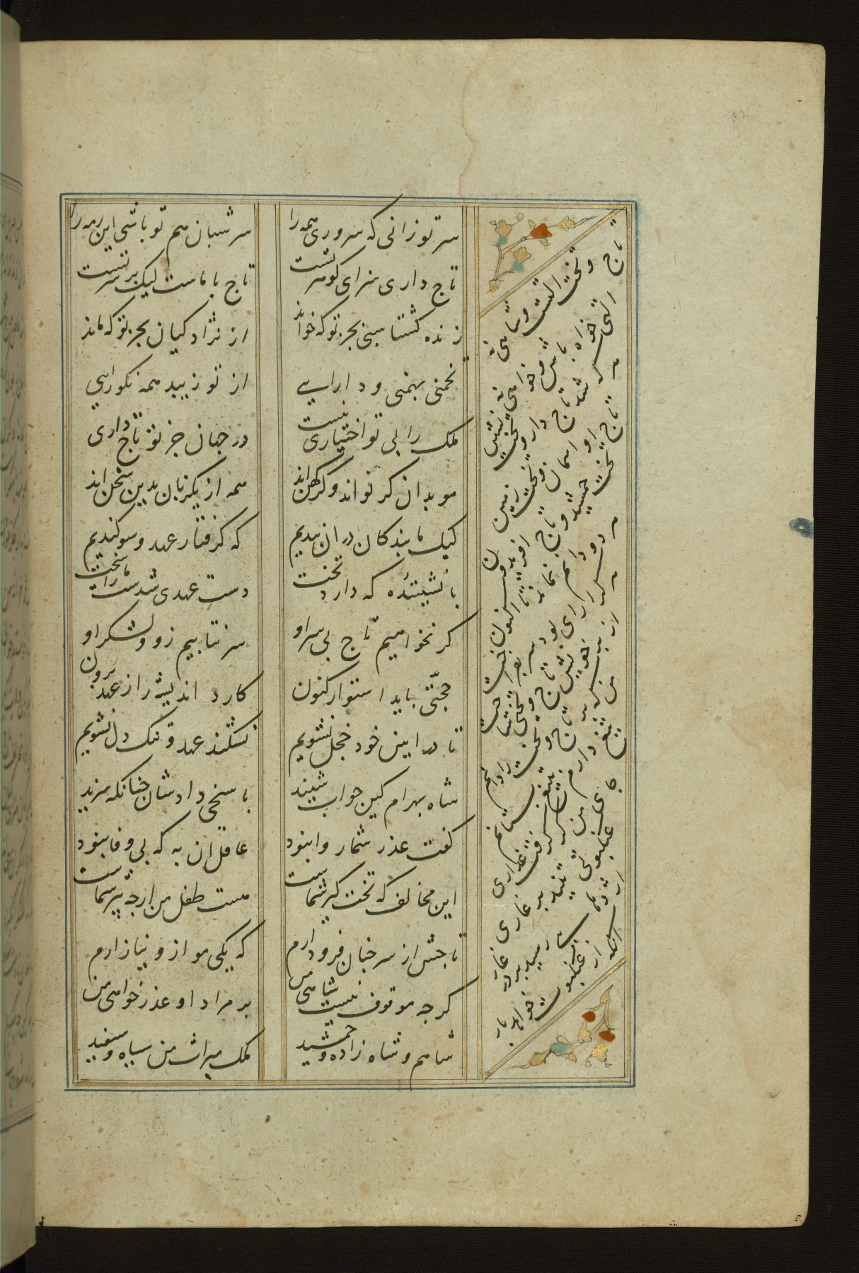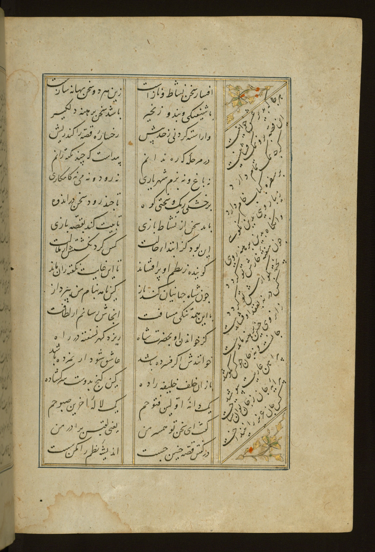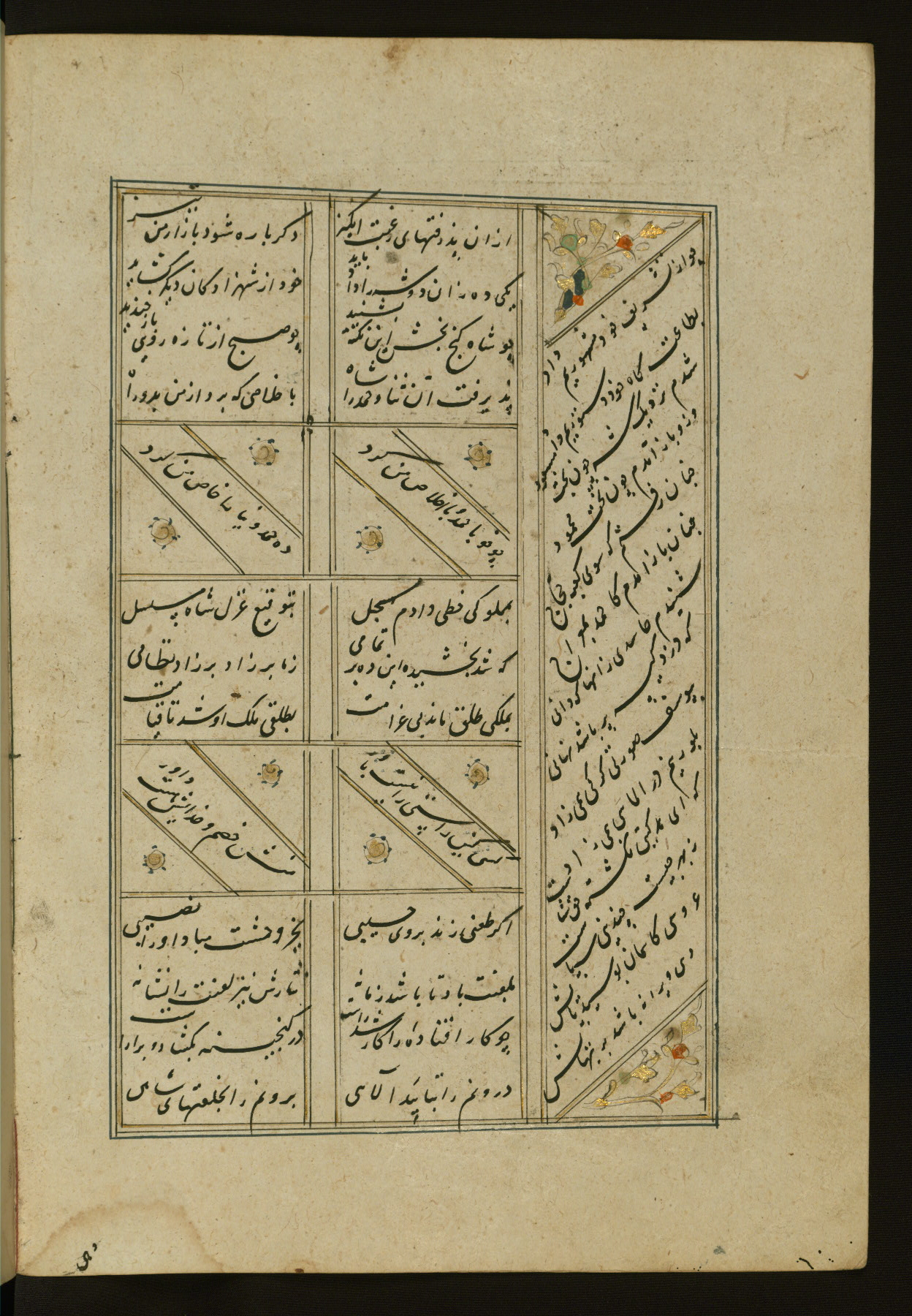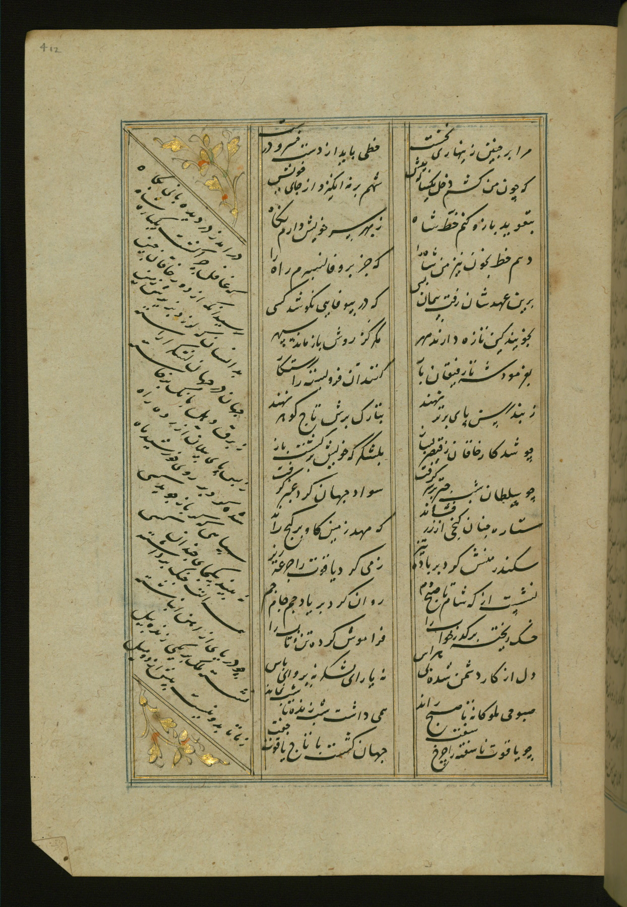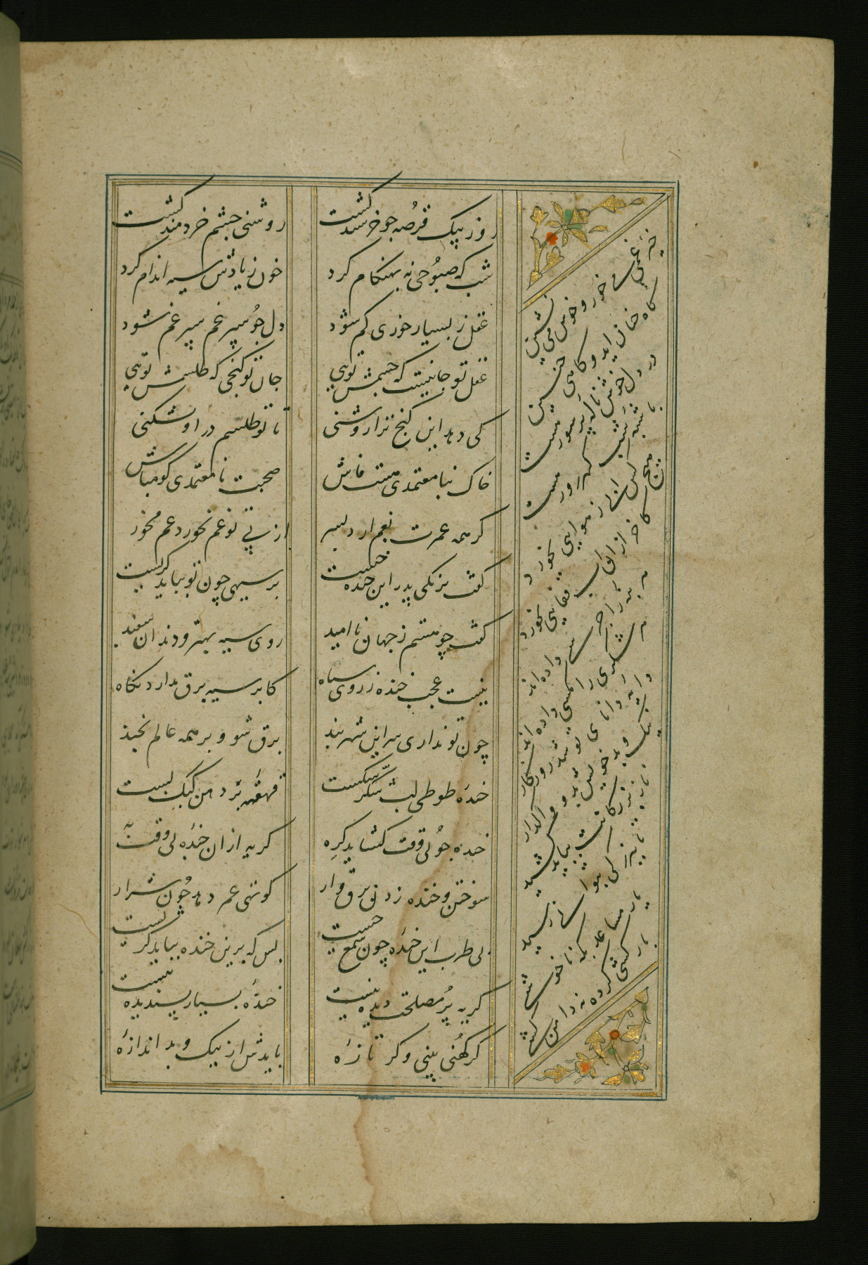 This copy of the Khamsah (quintet) of Niẓāmī Ganjavī (d. 605 AH / 1209 CE) was written by Abū Bakr Shāh ibn Ḥasan ibn ʿAlī al-Shahrastānī and illuminated by Jamāl al-Dīn ibn Muḥammad al-Ṣiddīqī al-Iṣfahānī between 892 AH / 1486 CE and 900 AH / 1494-5 CE. The manuscript opens with a double-page illuminated frontispiece with an inscription giving the title of the work and the name of the author (fols. 1b-2a). There are four illuminated titlepieces with the names of the individual poems and twenty-six repainted illustrations. According to evidence supplied by the colophons, the original binding was by the hand of Jamāl al-Dīn ibn Muḥammad al-Ṣiddīqī al-Iṣfahānī, as well. Unfortunately, it has not survived. The binding presently attached to the manuscript dates to the twelfth century AH / eighteenth CE.