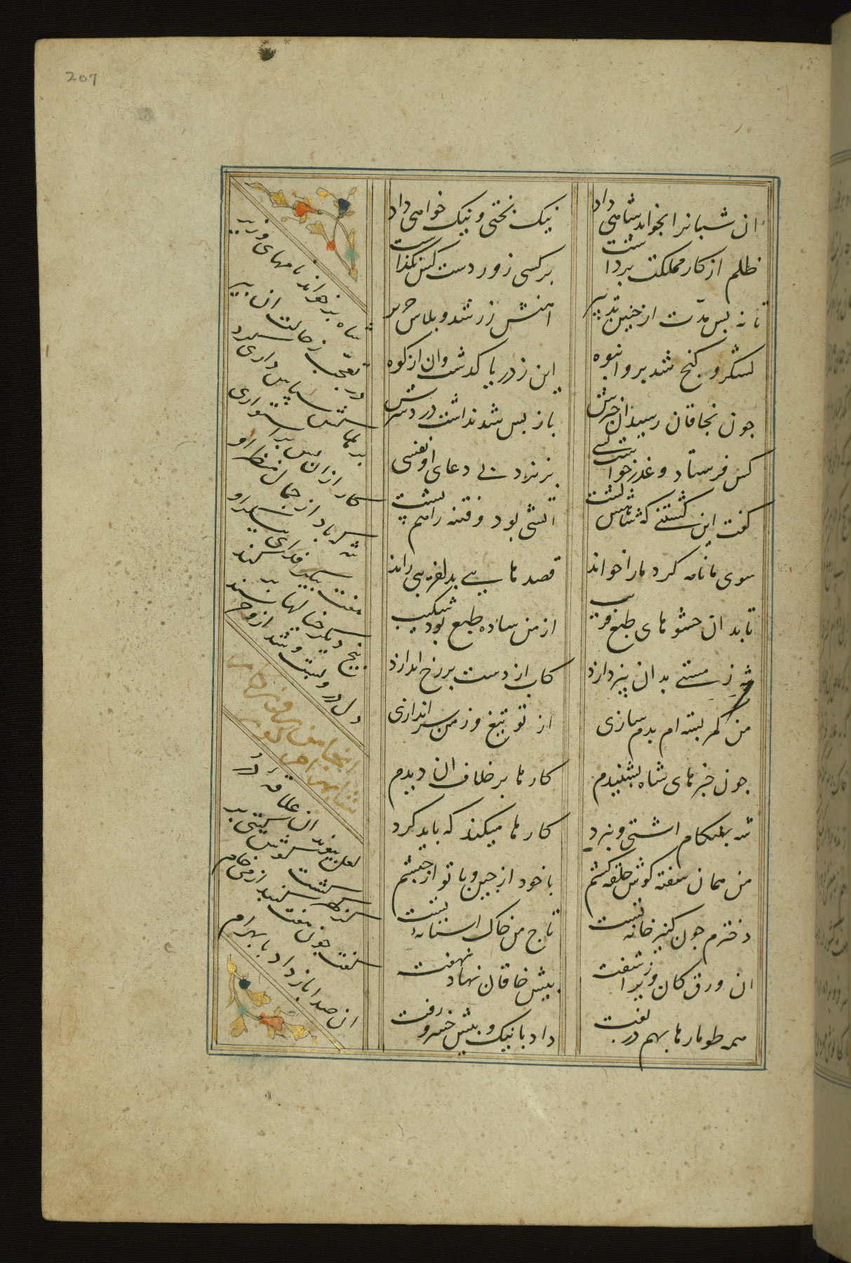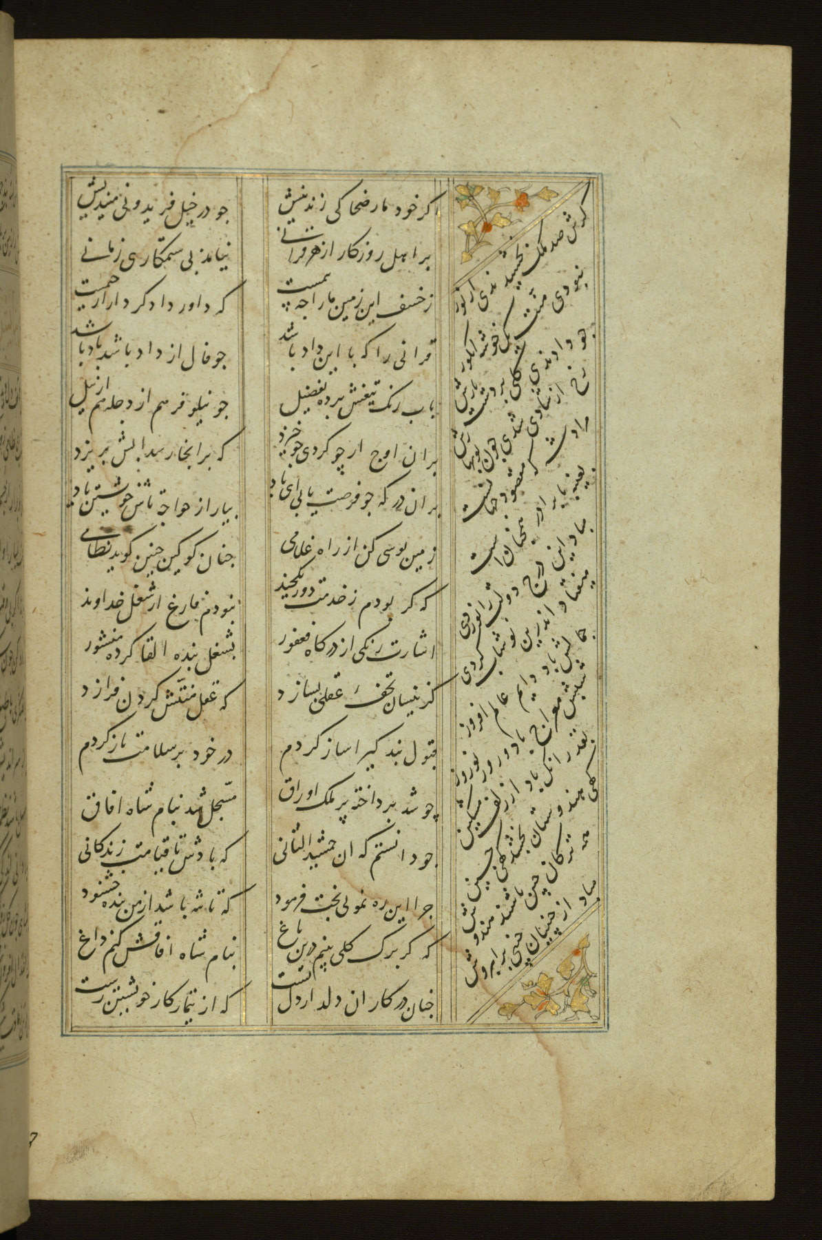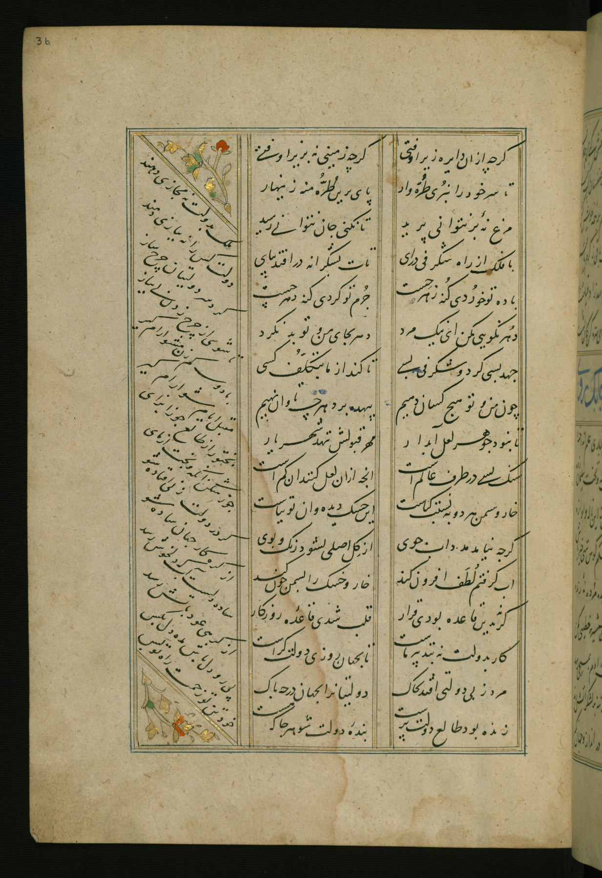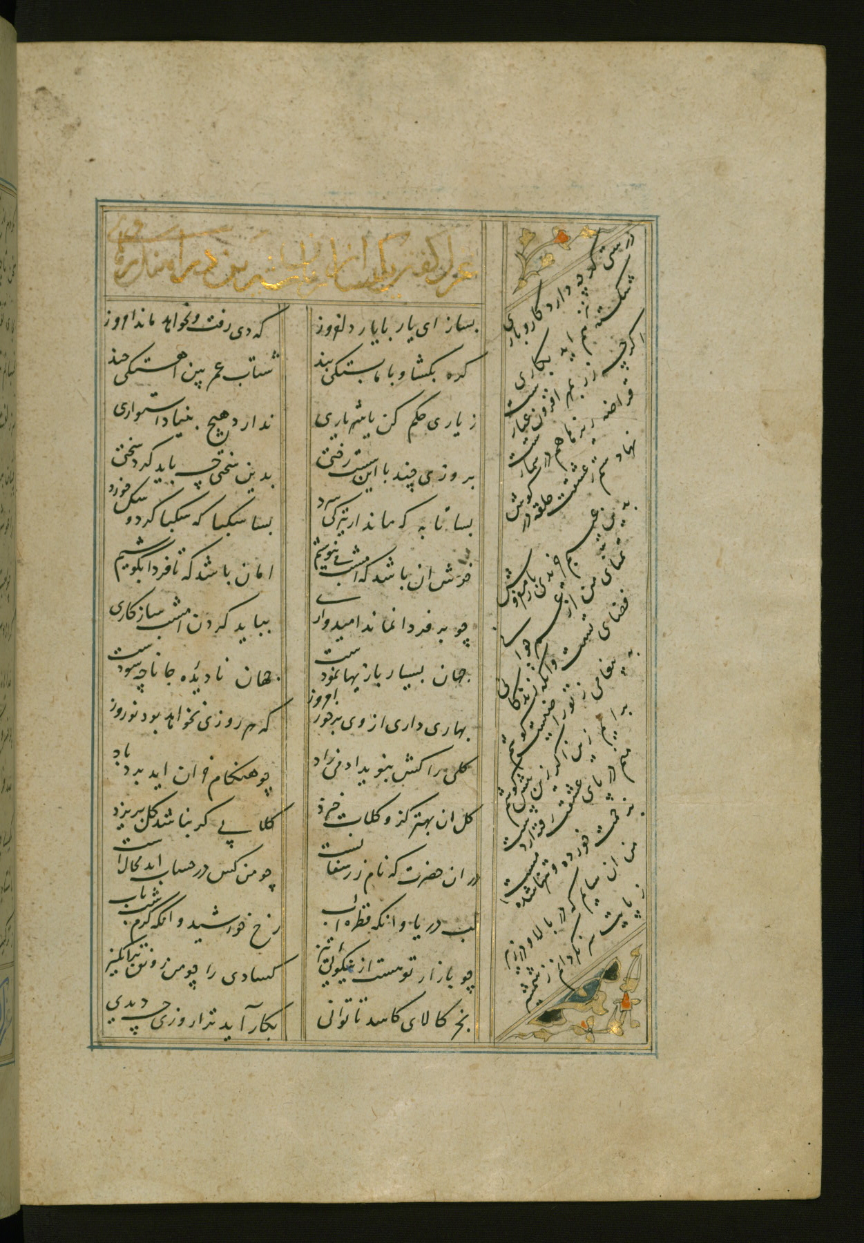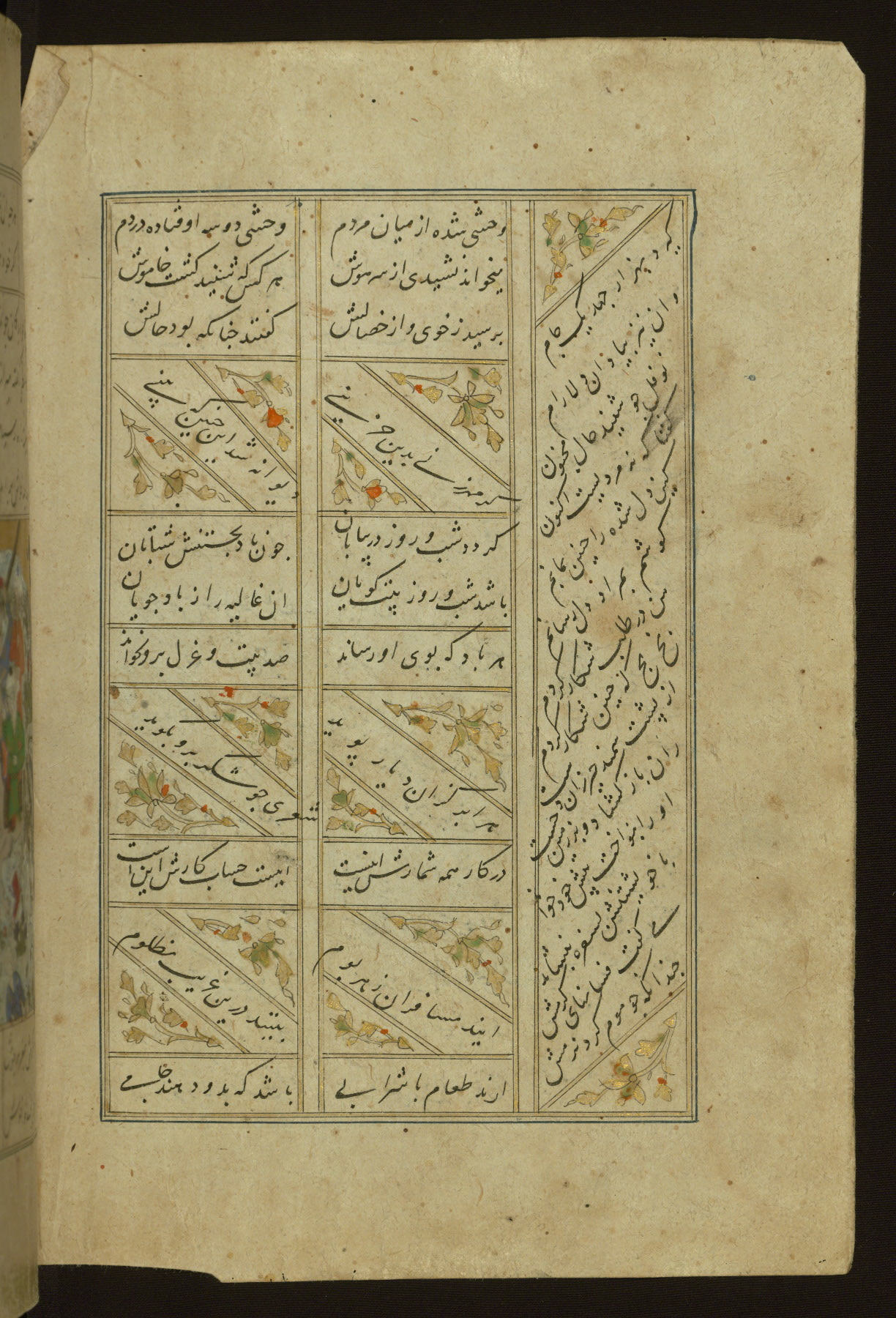 This copy of the Khamsah (quintet) of Niẓāmī Ganjavī (d. 605 AH / 1209 CE) was written by Abū Bakr Shāh ibn Ḥasan ibn ʿAlī al-Shahrastānī and illuminated by Jamāl al-Dīn ibn Muḥammad al-Ṣiddīqī al-Iṣfahānī between 892 AH / 1486 CE and 900 AH / 1494-5 CE. The manuscript opens with a double-page illuminated frontispiece with an inscription giving the title of the work and the name of the author (fols. 1b-2a). There are four illuminated titlepieces with the names of the individual poems and twenty-six repainted illustrations. According to evidence supplied by the colophons, the original binding was by the hand of Jamāl al-Dīn ibn Muḥammad al-Ṣiddīqī al-Iṣfahānī, as well. Unfortunately, it has not survived. The binding presently attached to the manuscript dates to the twelfth century AH / eighteenth CE.