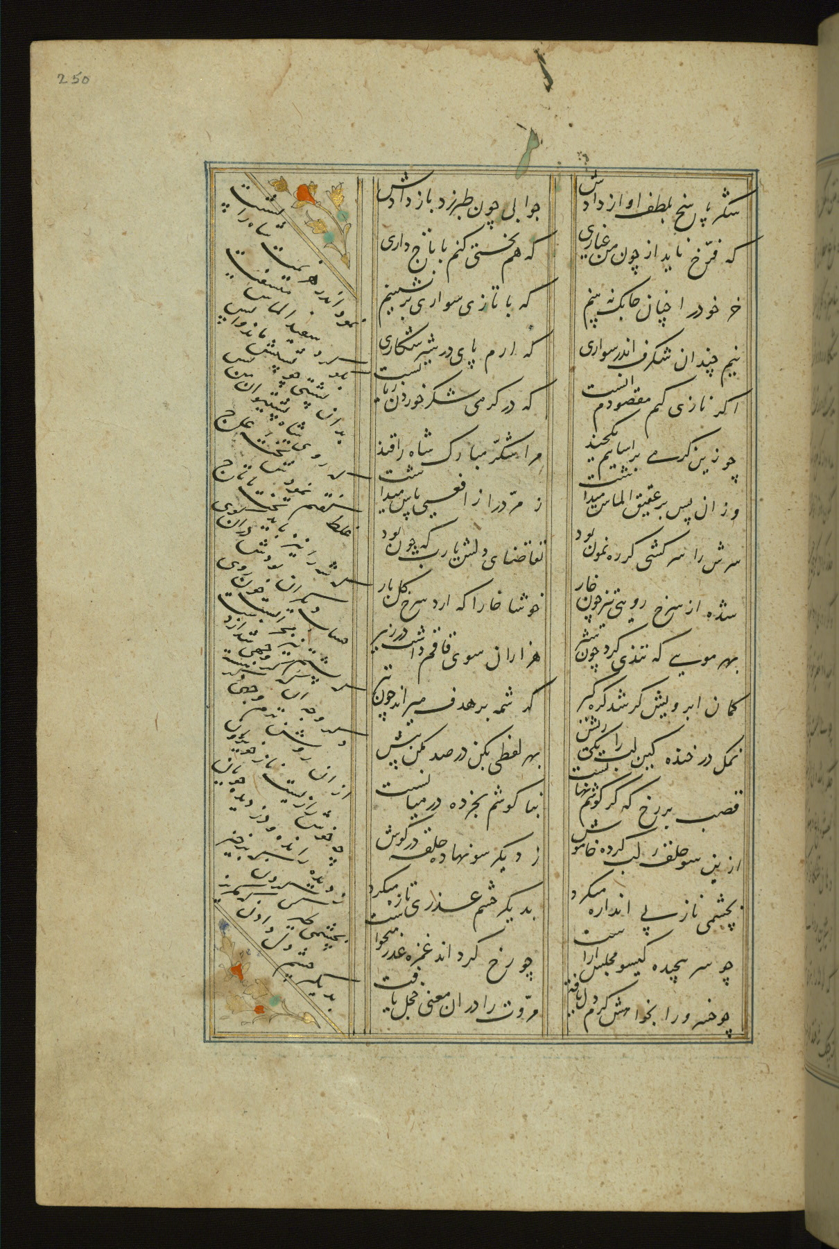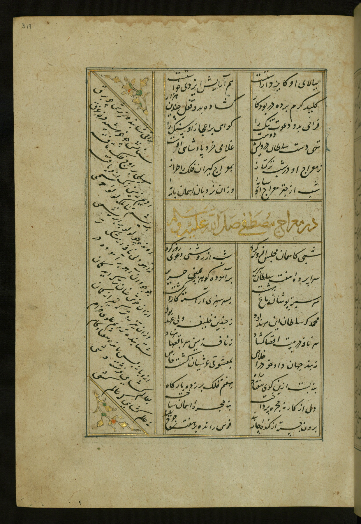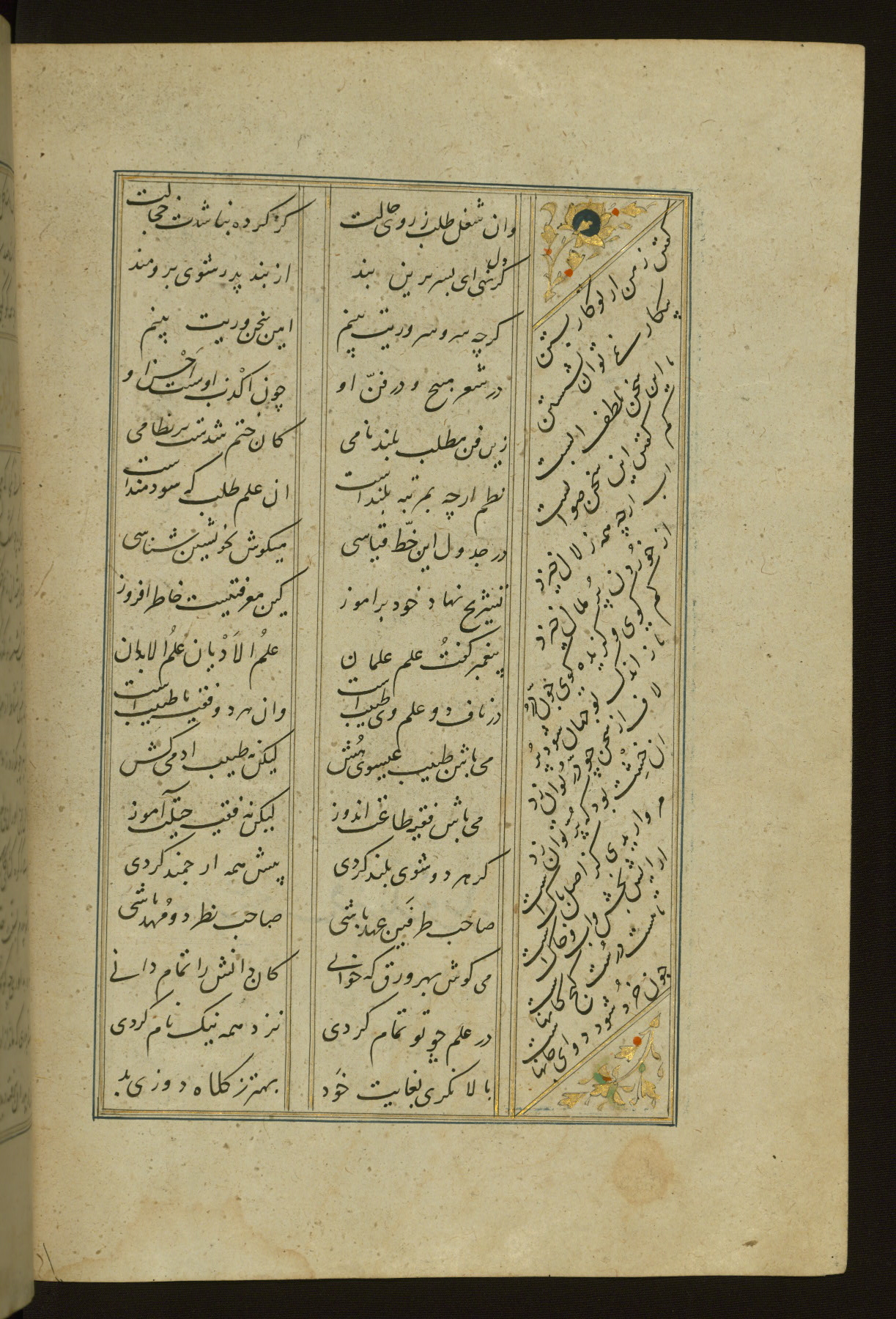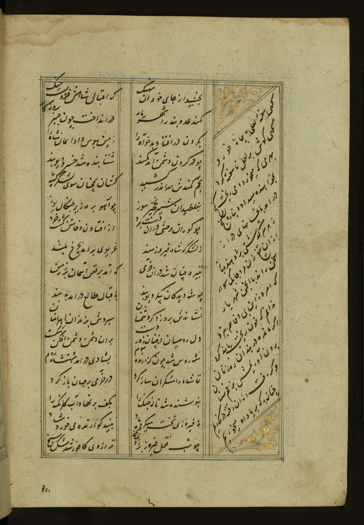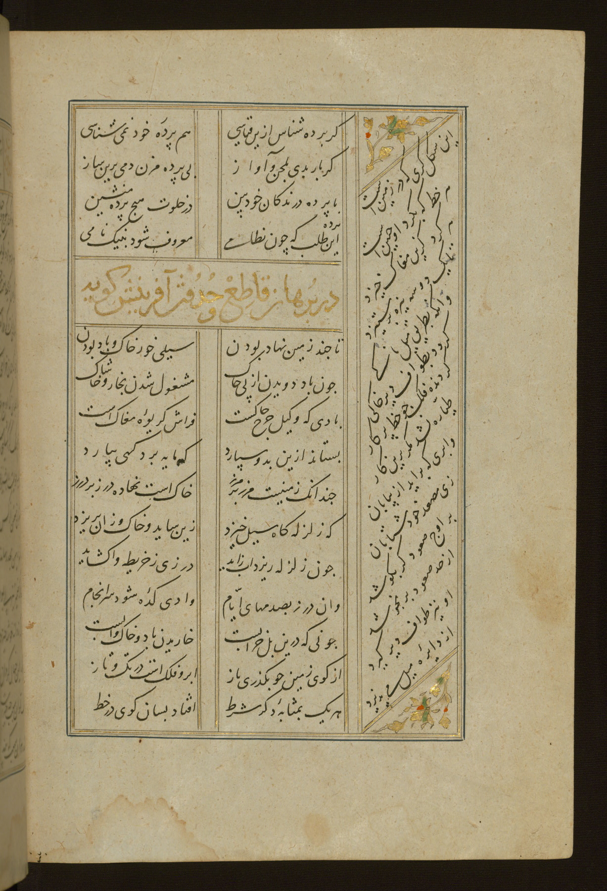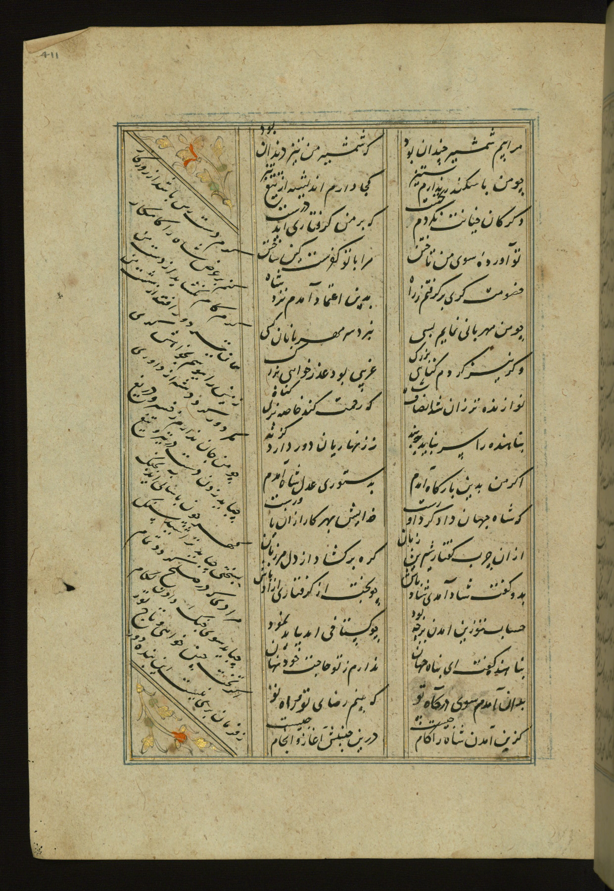 This copy of the Khamsah (quintet) of Niẓāmī Ganjavī (d. 605 AH / 1209 CE) was written by Abū Bakr Shāh ibn Ḥasan ibn ʿAlī al-Shahrastānī and illuminated by Jamāl al-Dīn ibn Muḥammad al-Ṣiddīqī al-Iṣfahānī between 892 AH / 1486 CE and 900 AH / 1494-5 CE. The manuscript opens with a double-page illuminated frontispiece with an inscription giving the title of the work and the name of the author (fols. 1b-2a). There are four illuminated titlepieces with the names of the individual poems and twenty-six repainted illustrations. According to evidence supplied by the colophons, the original binding was by the hand of Jamāl al-Dīn ibn Muḥammad al-Ṣiddīqī al-Iṣfahānī, as well. Unfortunately, it has not survived. The binding presently attached to the manuscript dates to the twelfth century AH / eighteenth CE.