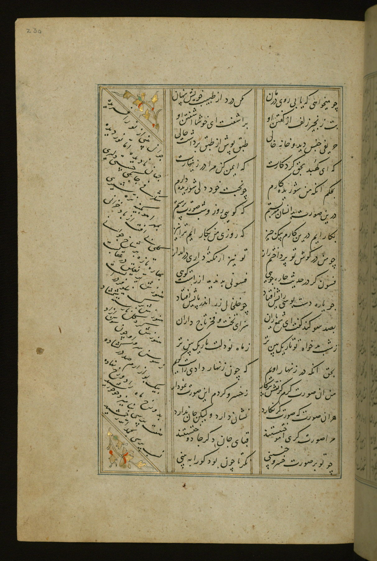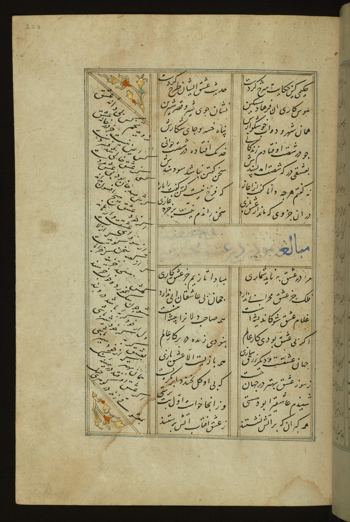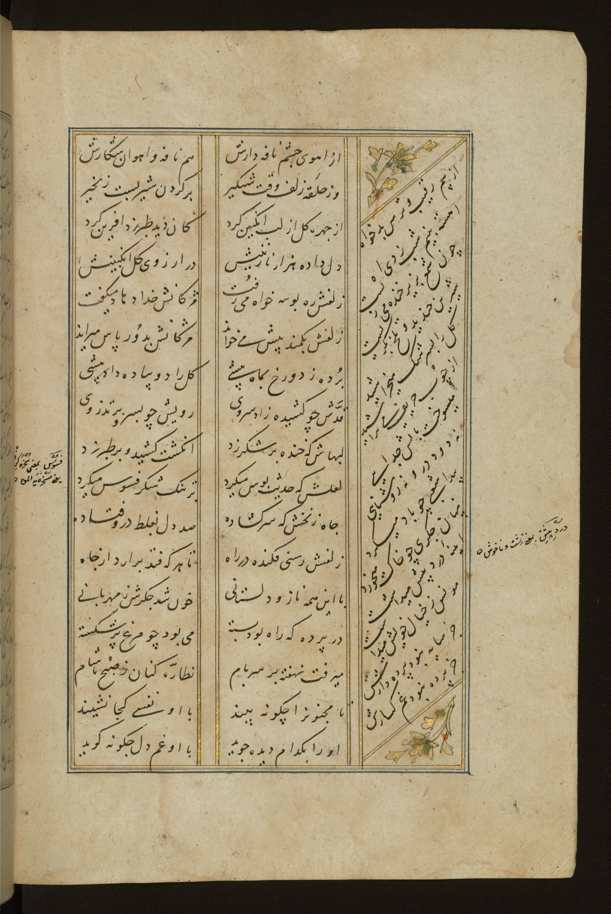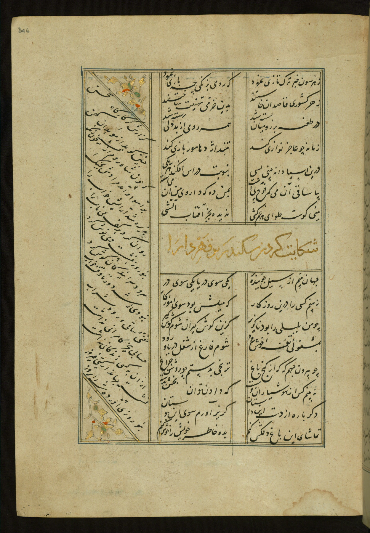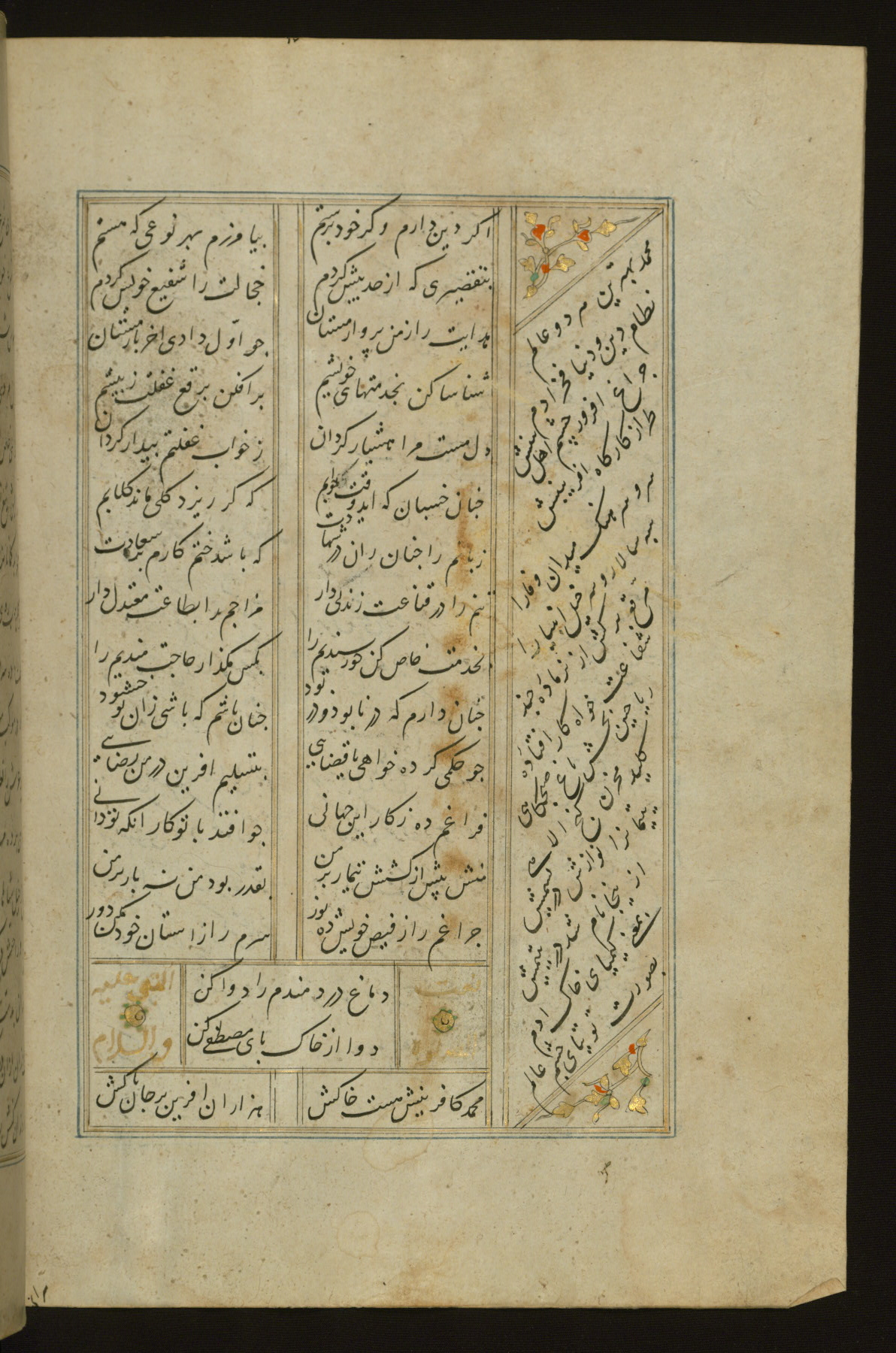 This copy of the Khamsah (quintet) of Niẓāmī Ganjavī (d. 605 AH / 1209 CE) was written by Abū Bakr Shāh ibn Ḥasan ibn ʿAlī al-Shahrastānī and illuminated by Jamāl al-Dīn ibn Muḥammad al-Ṣiddīqī al-Iṣfahānī between 892 AH / 1486 CE and 900 AH / 1494-5 CE. The manuscript opens with a double-page illuminated frontispiece with an inscription giving the title of the work and the name of the author (fols. 1b-2a). There are four illuminated titlepieces with the names of the individual poems and twenty-six repainted illustrations. According to evidence supplied by the colophons, the original binding was by the hand of Jamāl al-Dīn ibn Muḥammad al-Ṣiddīqī al-Iṣfahānī, as well. Unfortunately, it has not survived. The binding presently attached to the manuscript dates to the twelfth century AH / eighteenth CE.