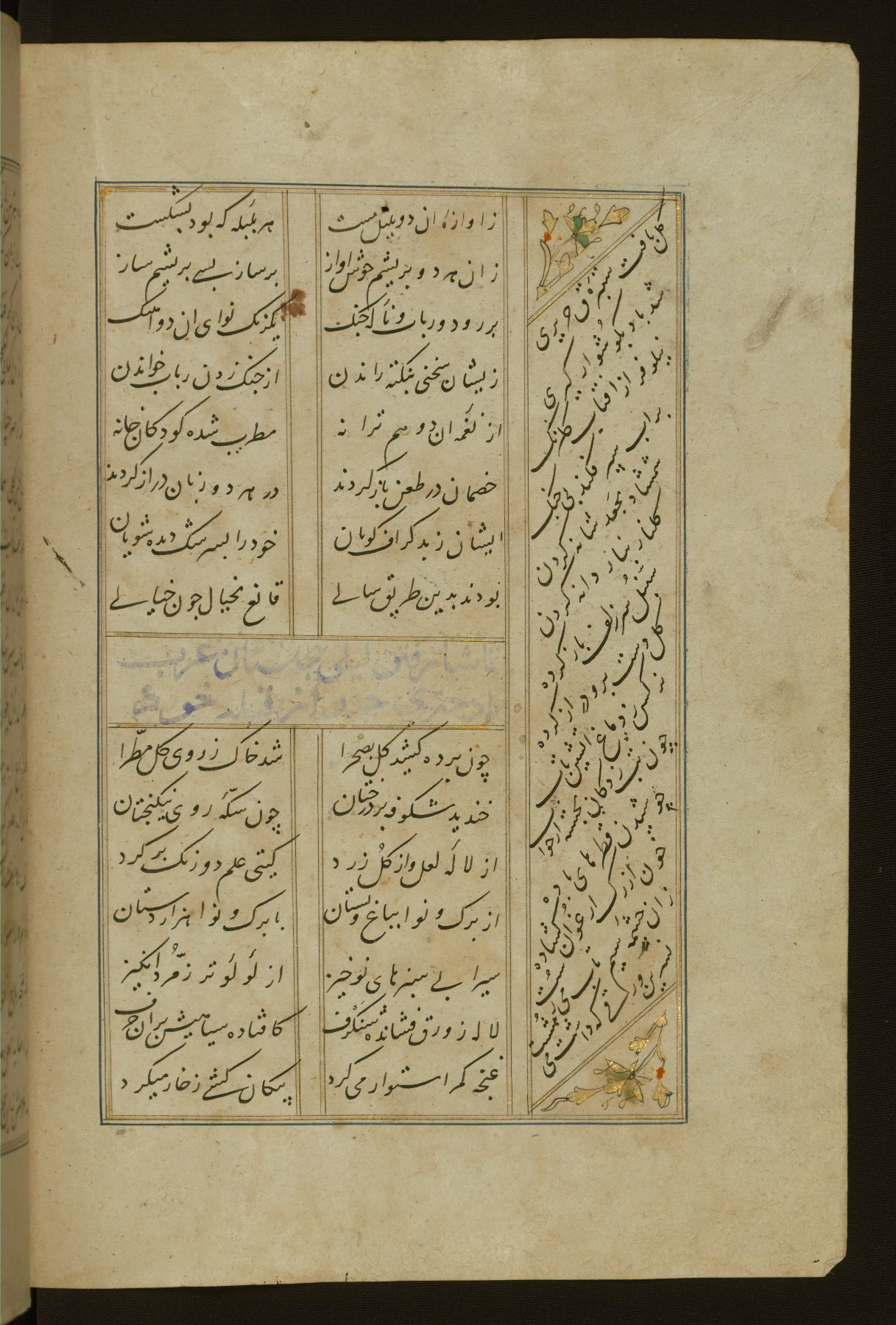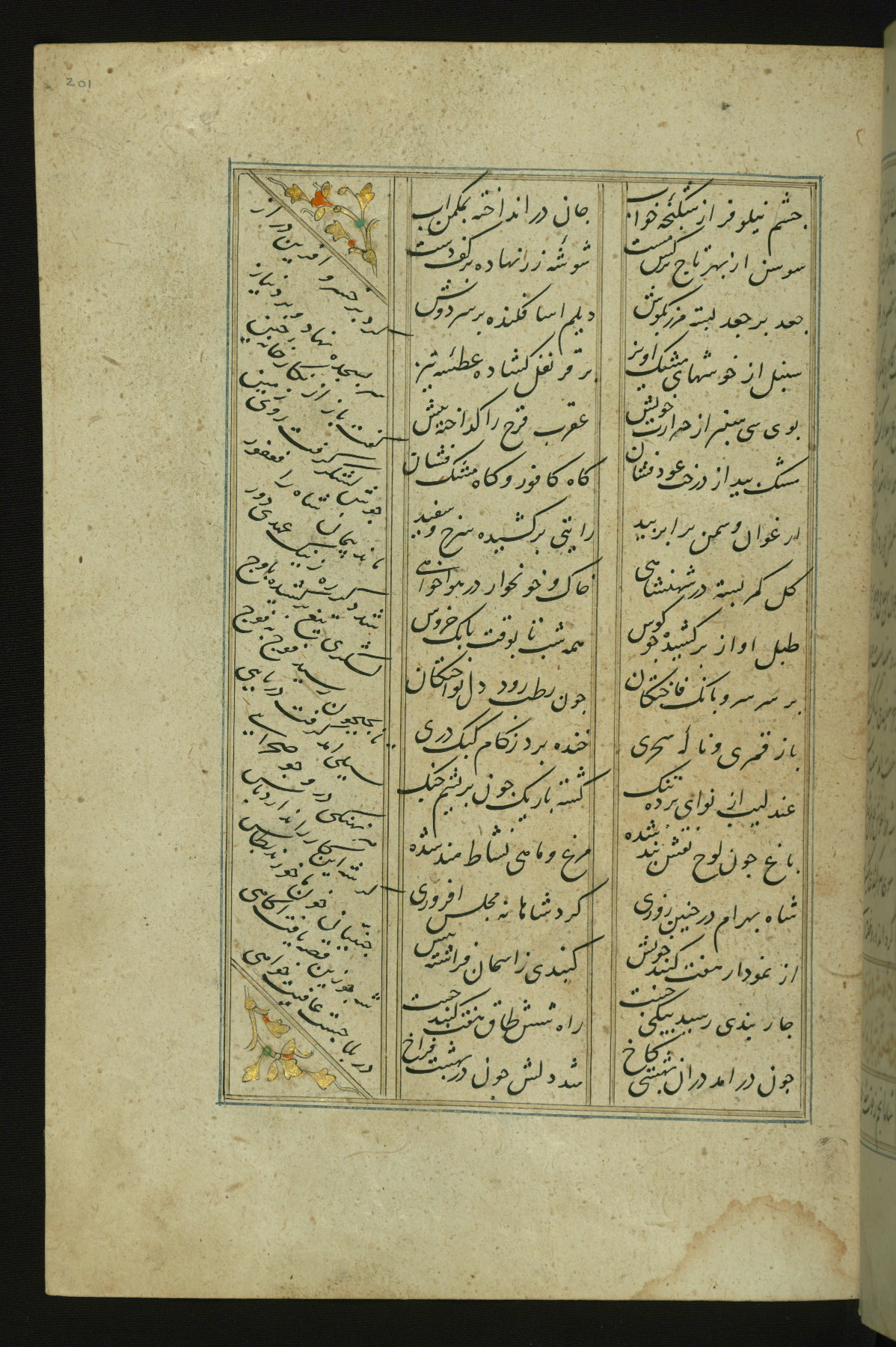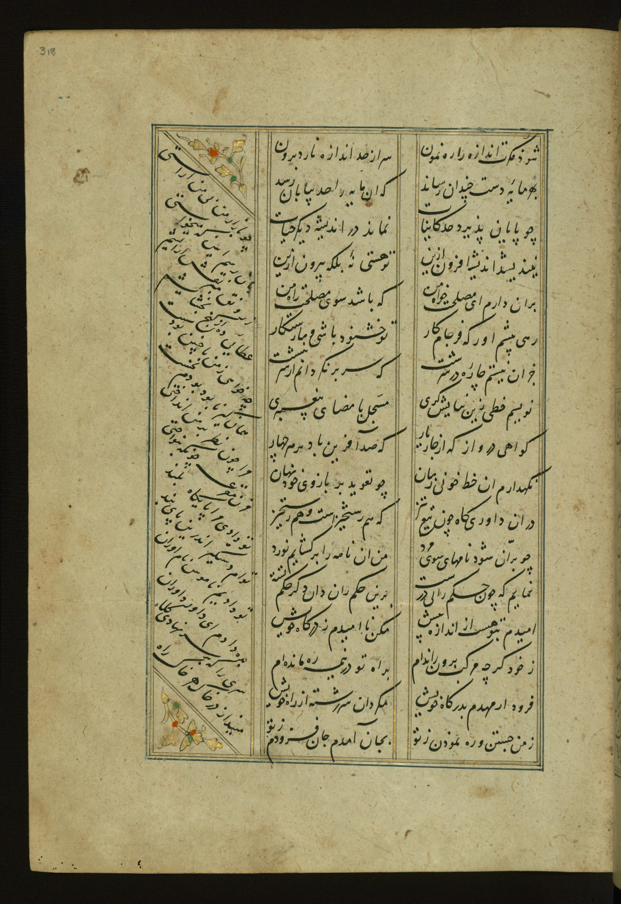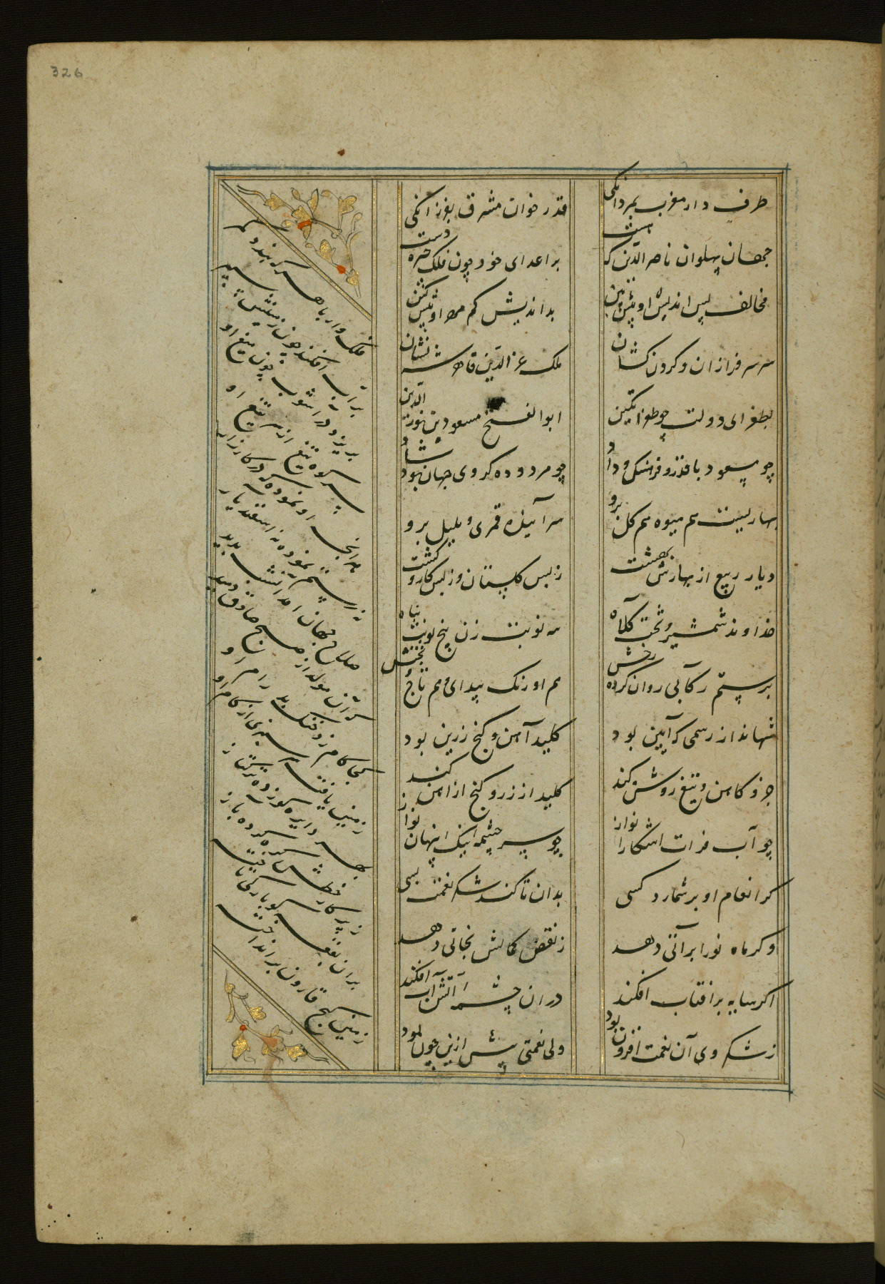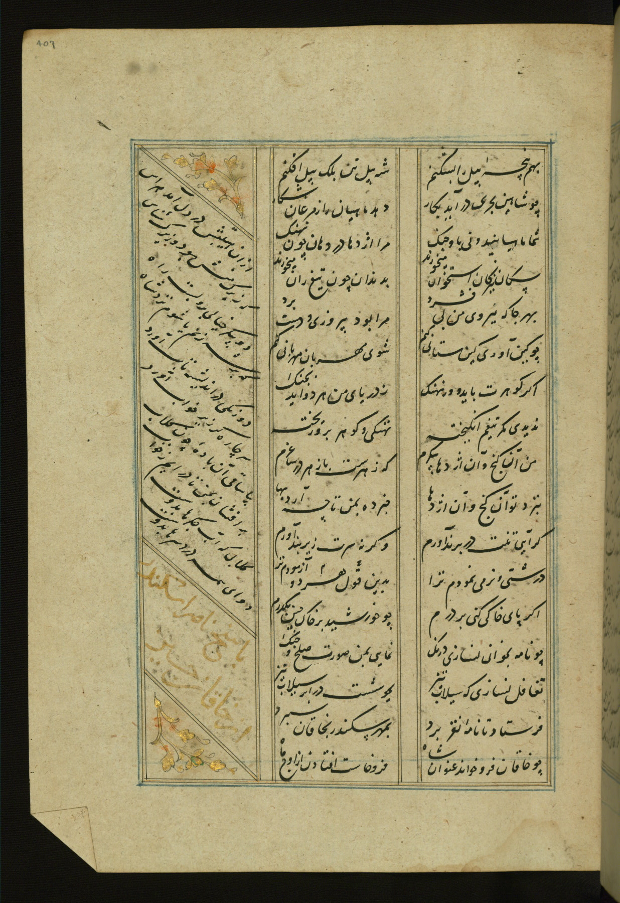This copy of the Khamsah (quintet) of Niẓāmī Ganjavī (d. 605 AH / 1209 CE) was written by Abū Bakr Shāh ibn Ḥasan ibn ʿAlī al-Shahrastānī and illuminated by Jamāl al-Dīn ibn Muḥammad al-Ṣiddīqī al-Iṣfahānī between 892 AH / 1486 CE and 900 AH / 1494-5 CE. The manuscript opens with a double-page illuminated frontispiece with an inscription giving the title of the work and the name of the author (fols. 1b-2a). There are four illuminated titlepieces with the names of the individual poems and twenty-six repainted illustrations. According to evidence supplied by the colophons, the original binding was by the hand of Jamāl al-Dīn ibn Muḥammad al-Ṣiddīqī al-Iṣfahānī, as well. Unfortunately, it has not survived. The binding presently attached to the manuscript dates to the twelfth century AH / eighteenth CE.
