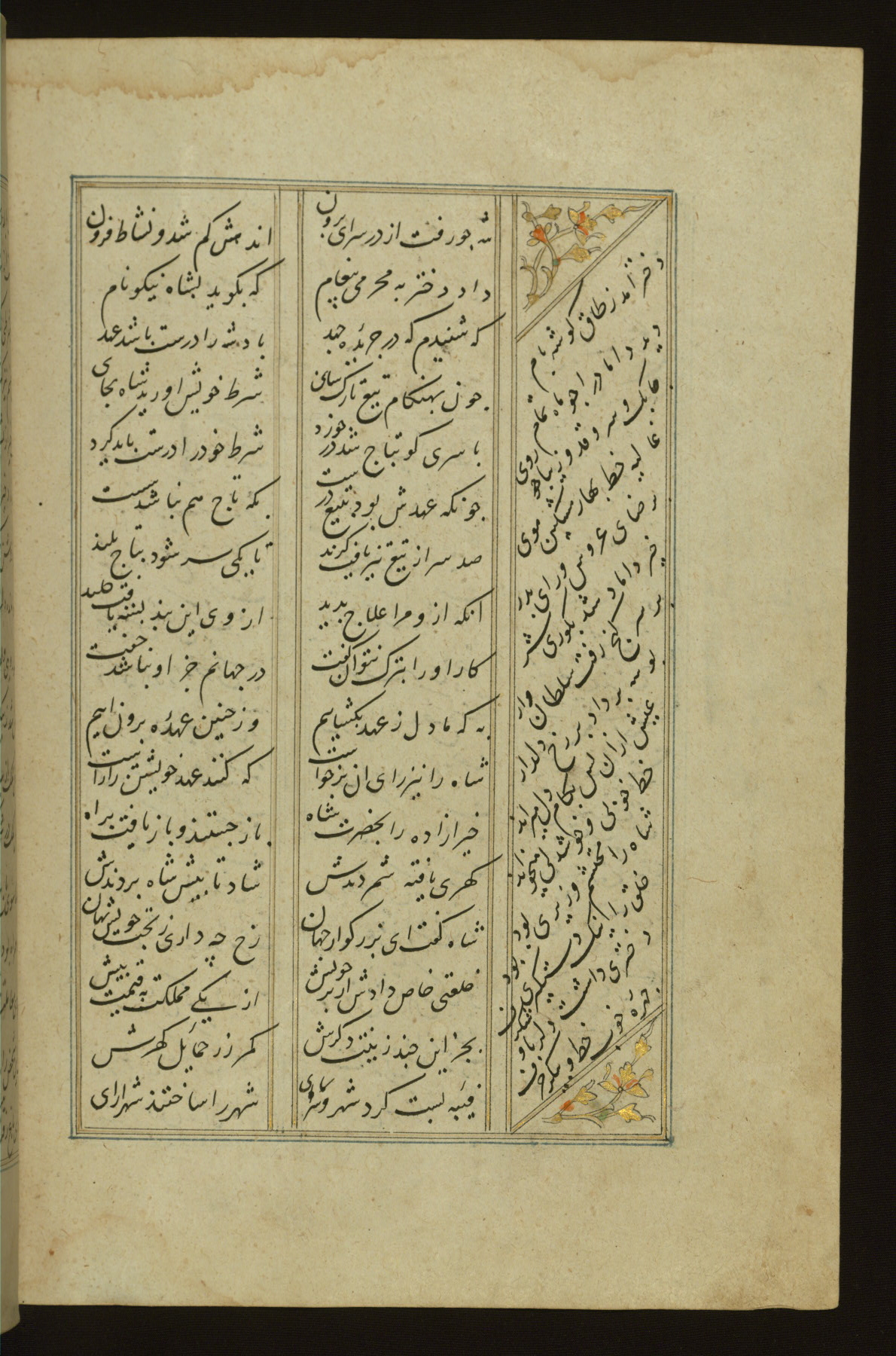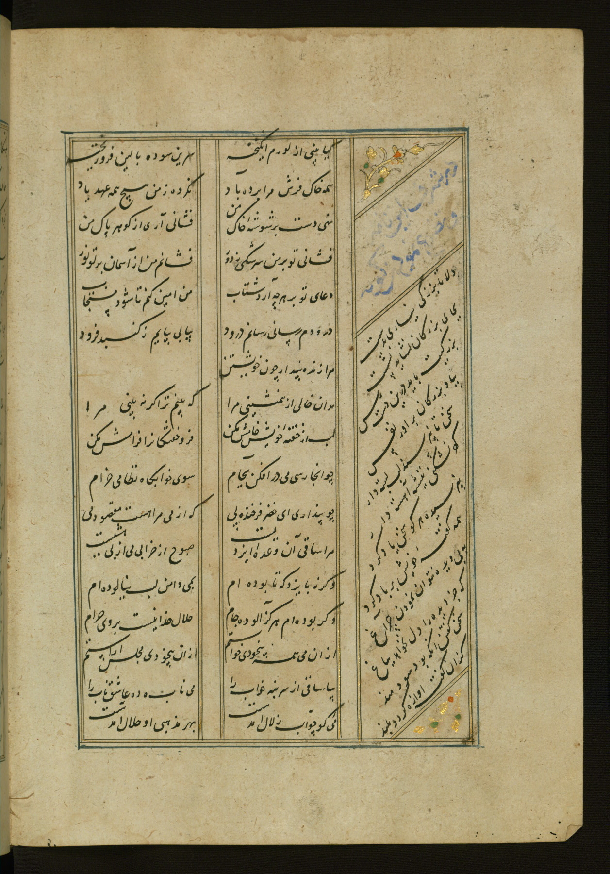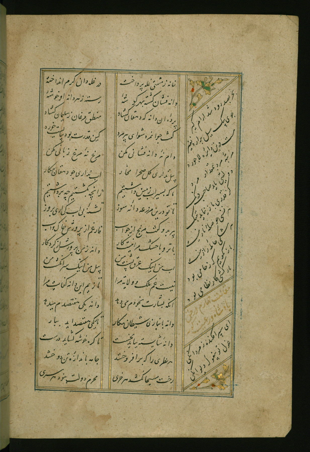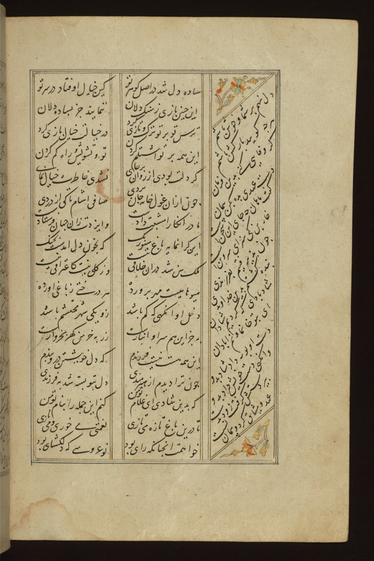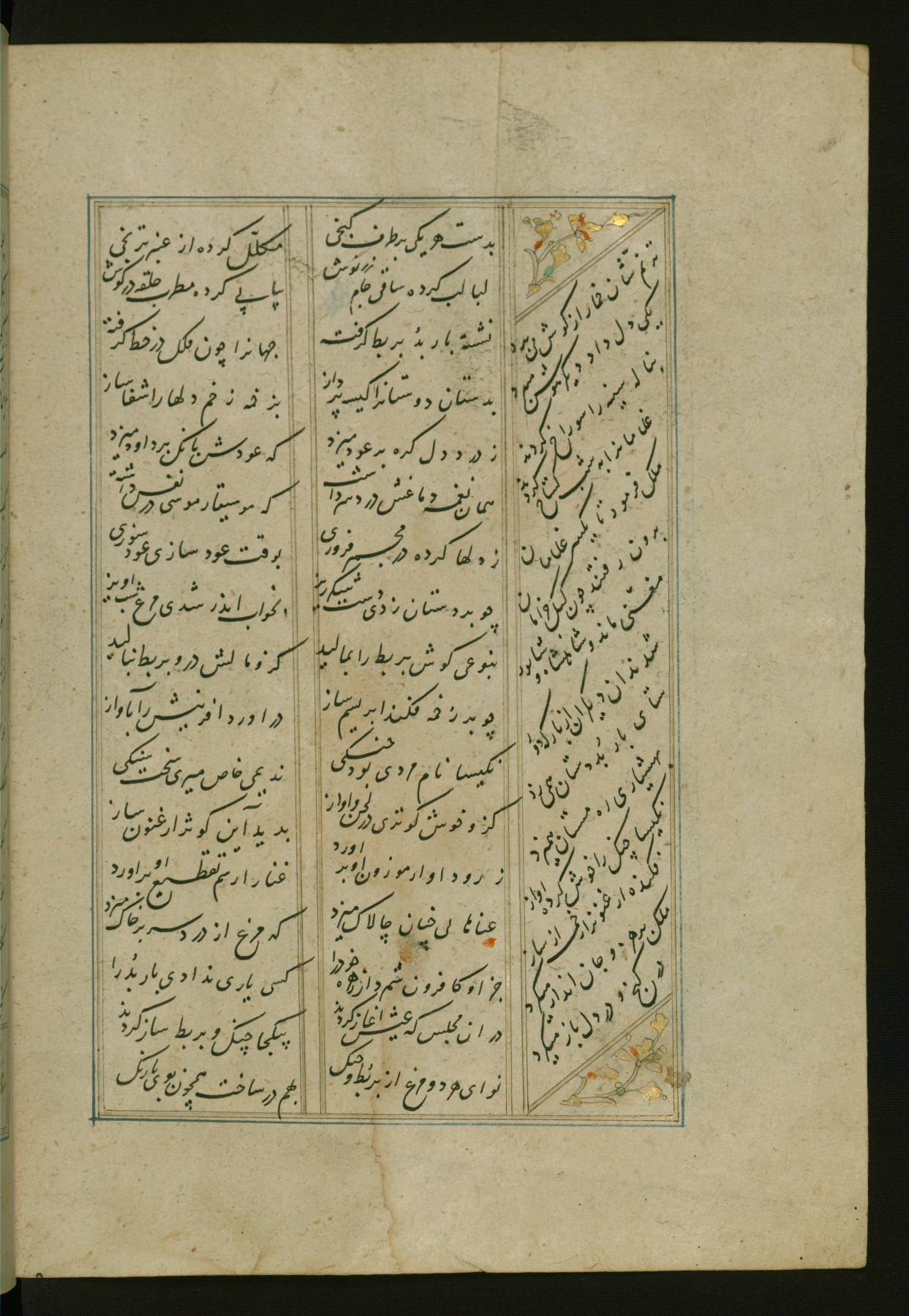This copy of the Khamsah (quintet) of Niẓāmī Ganjavī (d. 605 AH / 1209 CE) was written by Abū Bakr Shāh ibn Ḥasan ibn ʿAlī al-Shahrastānī and illuminated by Jamāl al-Dīn ibn Muḥammad al-Ṣiddīqī al-Iṣfahānī between 892 AH / 1486 CE and 900 AH / 1494-5 CE. The manuscript opens with a double-page illuminated frontispiece with an inscription giving the title of the work and the name of the author (fols. 1b-2a). There are four illuminated titlepieces with the names of the individual poems and twenty-six repainted illustrations. According to evidence supplied by the colophons, the original binding was by the hand of Jamāl al-Dīn ibn Muḥammad al-Ṣiddīqī al-Iṣfahānī, as well. Unfortunately, it has not survived. The binding presently attached to the manuscript dates to the twelfth century AH / eighteenth CE.
