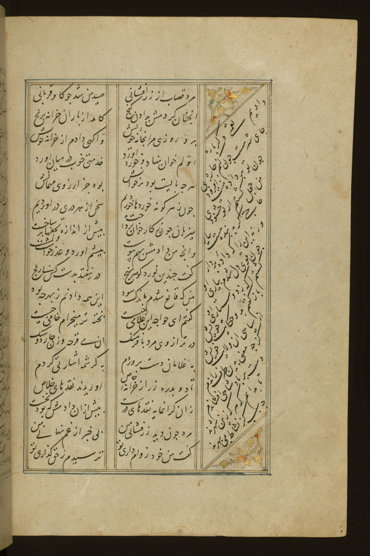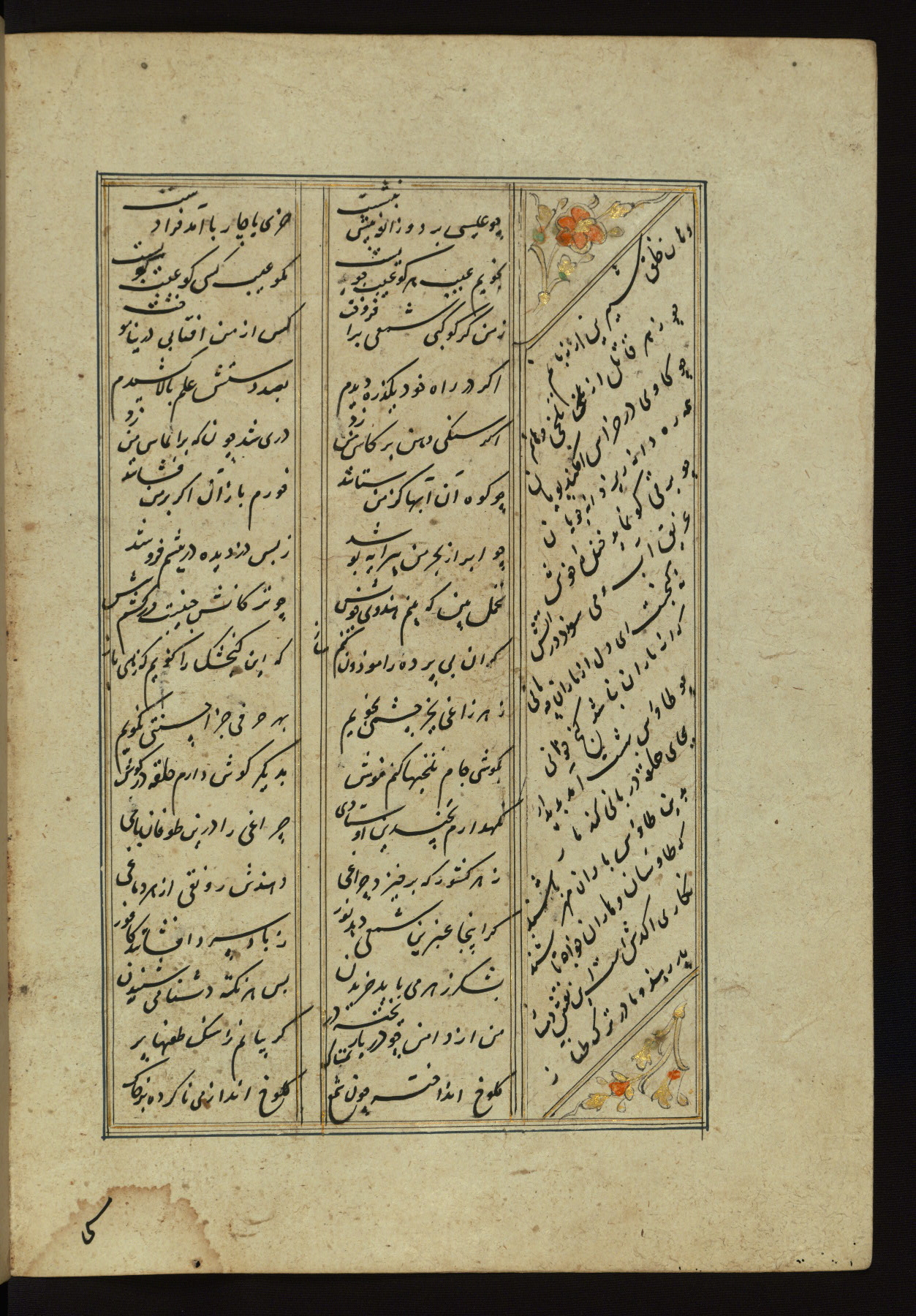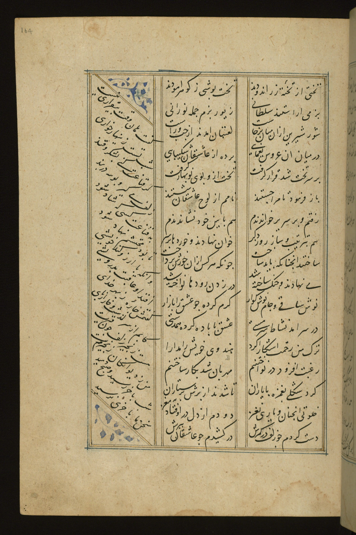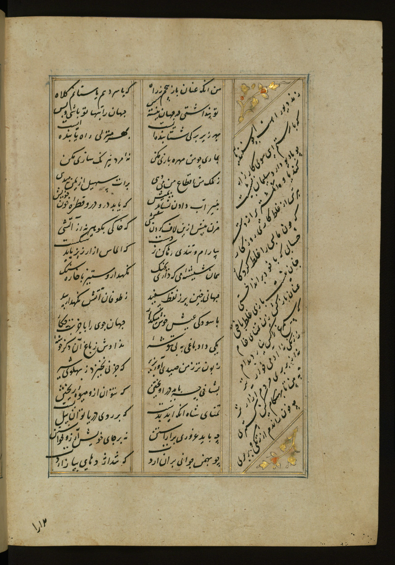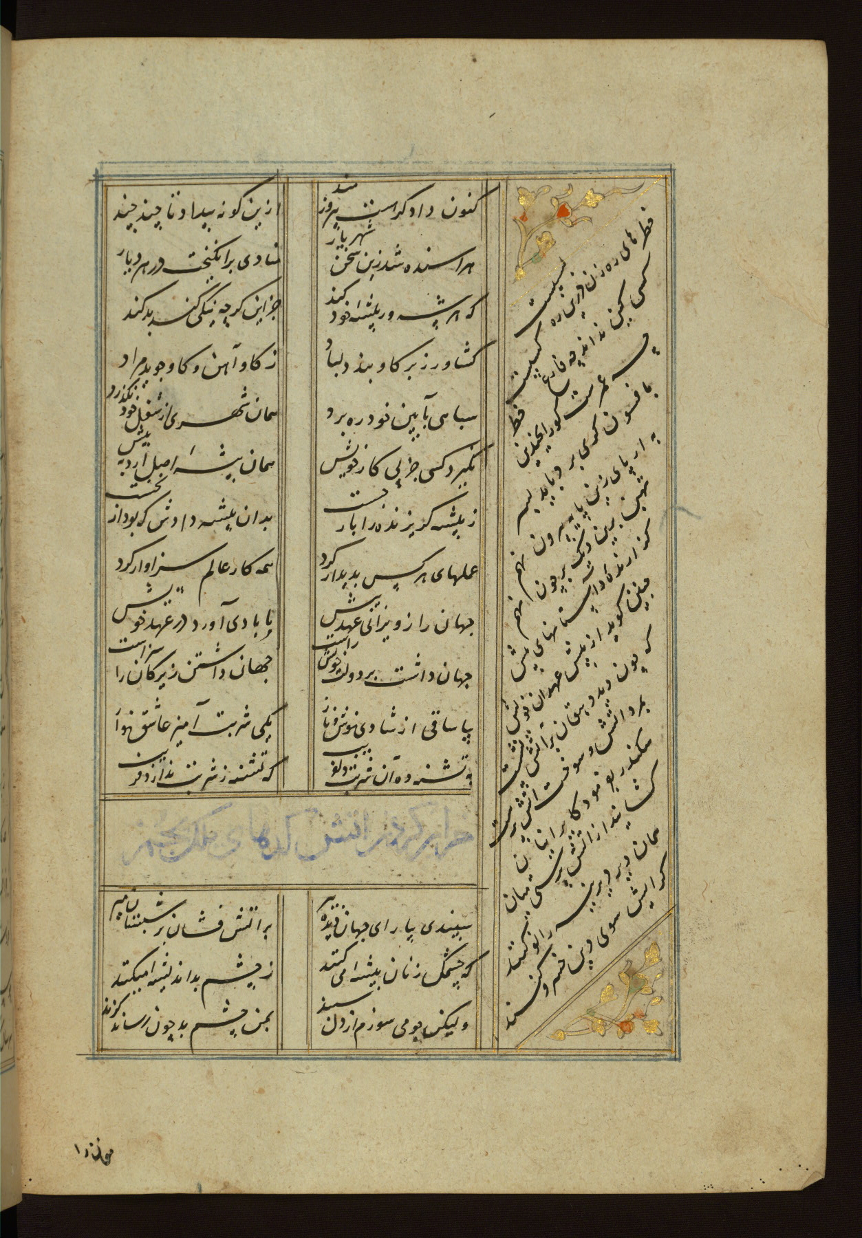 This copy of the Khamsah (quintet) of Niẓāmī Ganjavī (d. 605 AH / 1209 CE) was written by Abū Bakr Shāh ibn Ḥasan ibn ʿAlī al-Shahrastānī and illuminated by Jamāl al-Dīn ibn Muḥammad al-Ṣiddīqī al-Iṣfahānī between 892 AH / 1486 CE and 900 AH / 1494-5 CE. The manuscript opens with a double-page illuminated frontispiece with an inscription giving the title of the work and the name of the author (fols. 1b-2a). There are four illuminated titlepieces with the names of the individual poems and twenty-six repainted illustrations. According to evidence supplied by the colophons, the original binding was by the hand of Jamāl al-Dīn ibn Muḥammad al-Ṣiddīqī al-Iṣfahānī, as well. Unfortunately, it has not survived. The binding presently attached to the manuscript dates to the twelfth century AH / eighteenth CE.