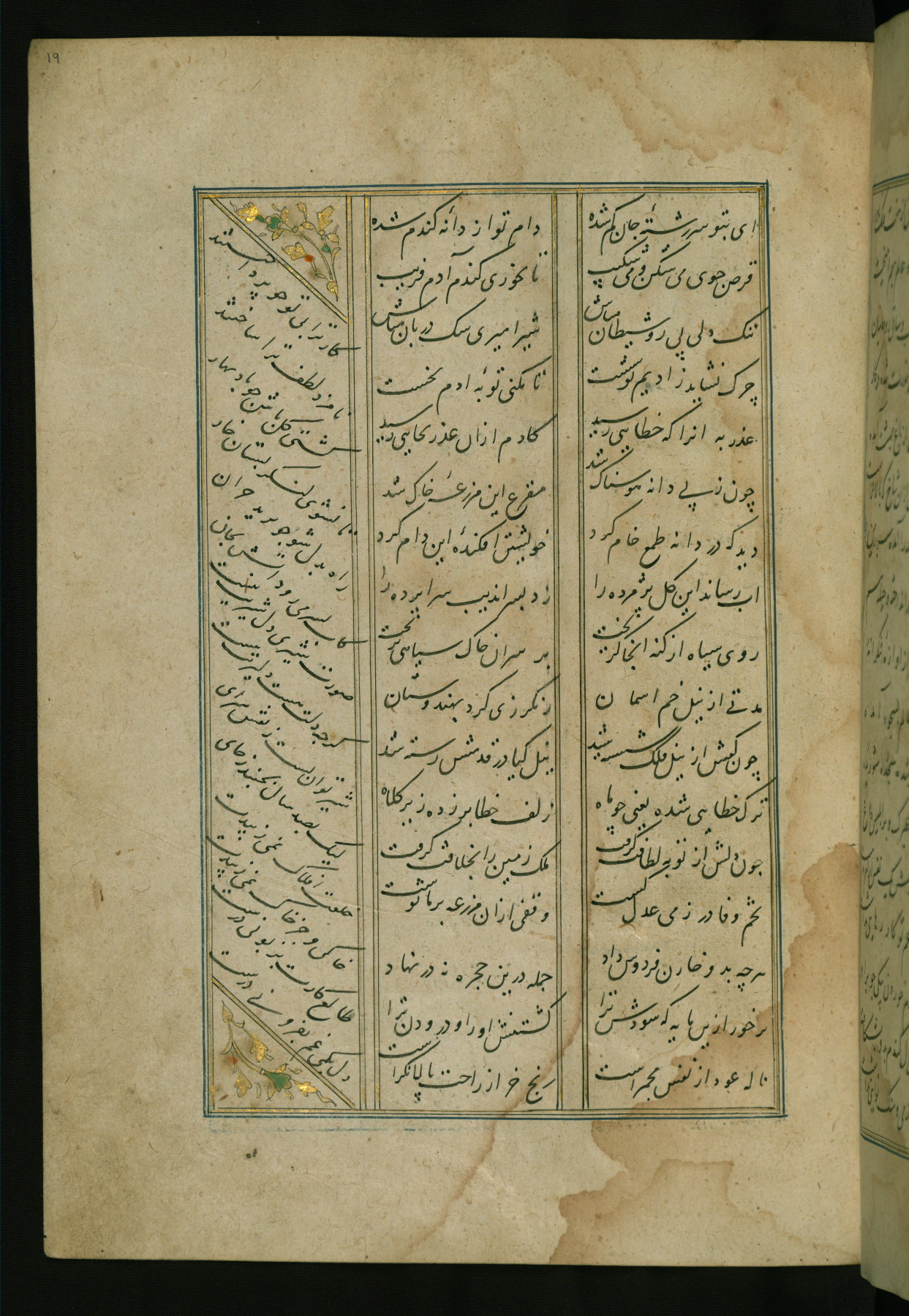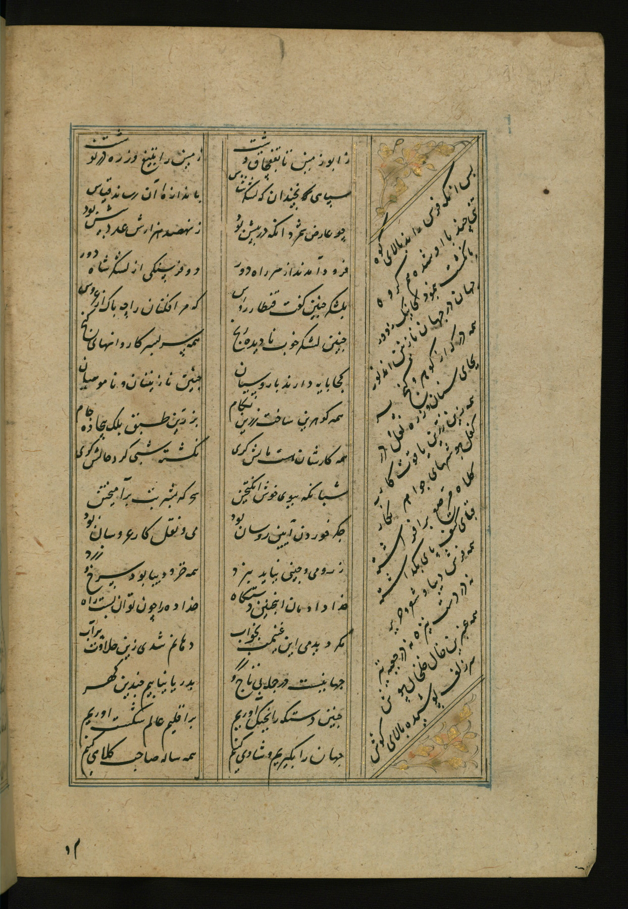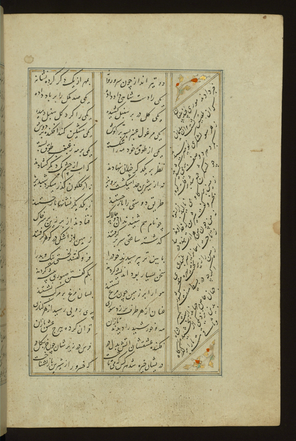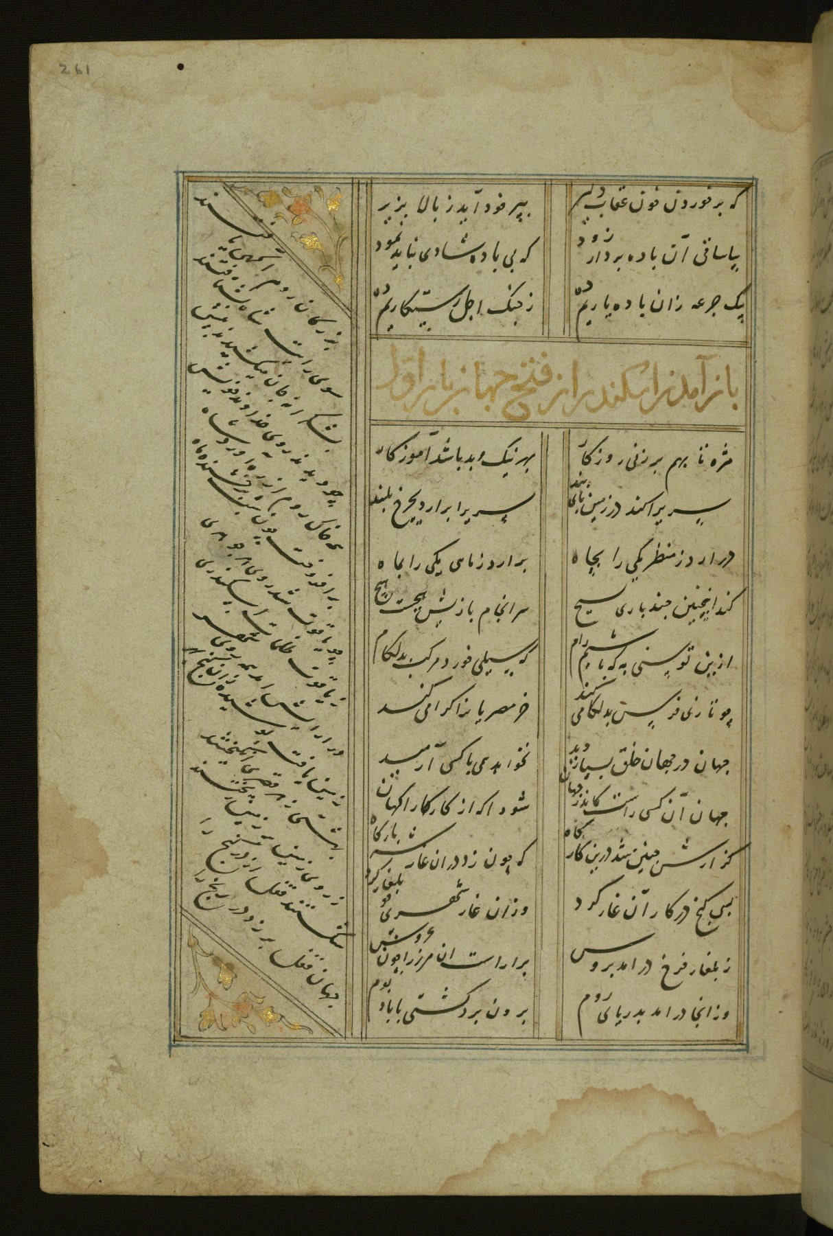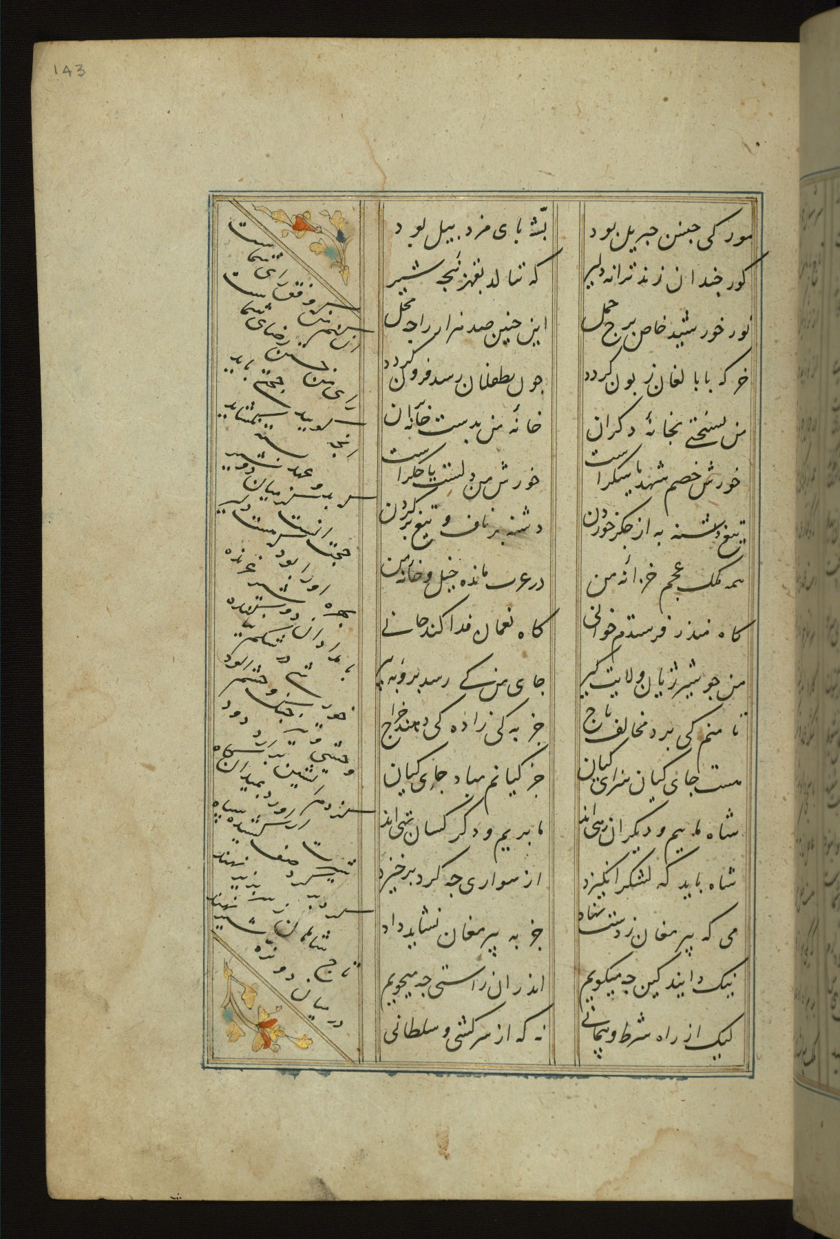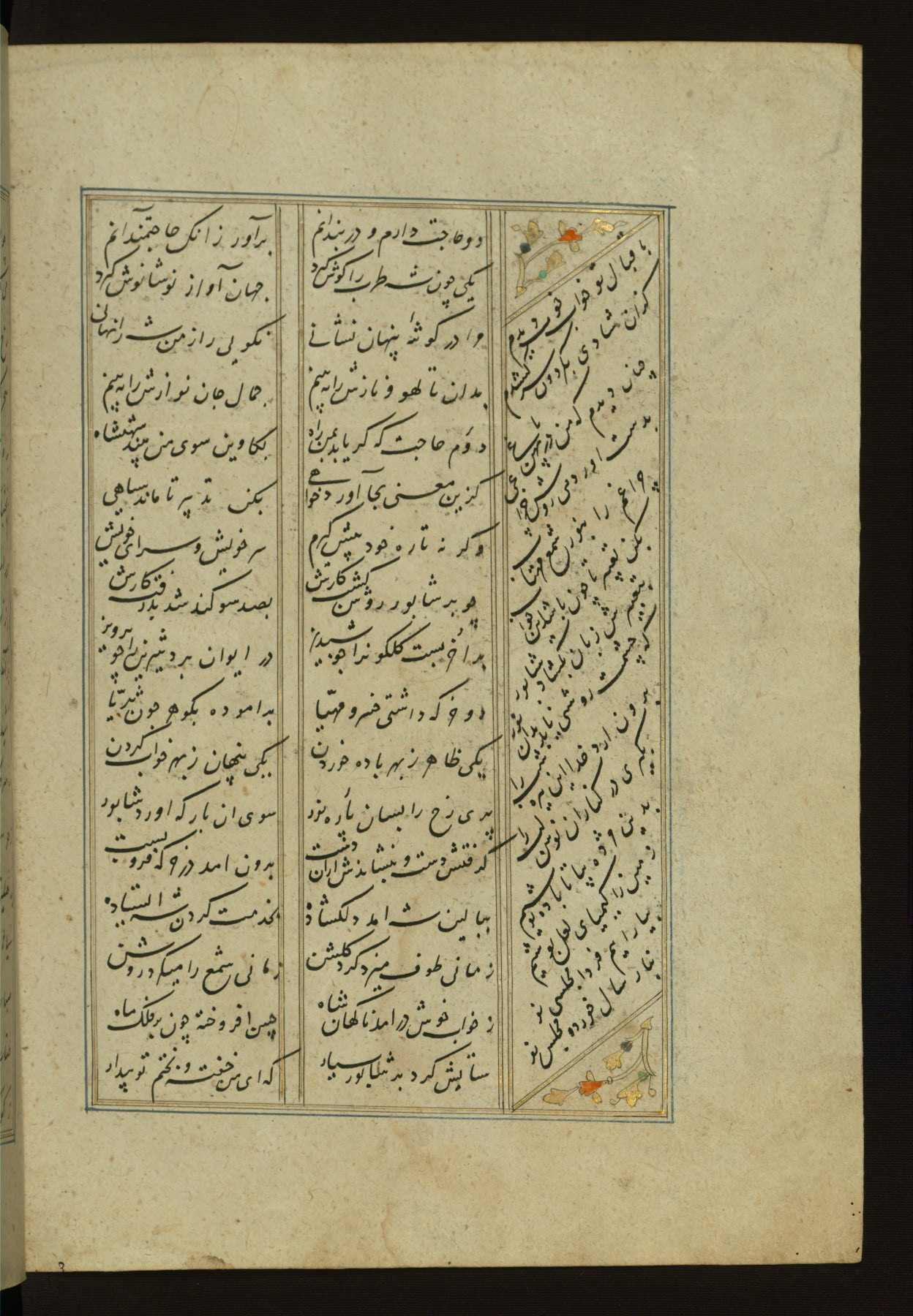 This copy of the Khamsah (quintet) of Niẓāmī Ganjavī (d. 605 AH / 1209 CE) was written by Abū Bakr Shāh ibn Ḥasan ibn ʿAlī al-Shahrastānī and illuminated by Jamāl al-Dīn ibn Muḥammad al-Ṣiddīqī al-Iṣfahānī between 892 AH / 1486 CE and 900 AH / 1494-5 CE. The manuscript opens with a double-page illuminated frontispiece with an inscription giving the title of the work and the name of the author (fols. 1b-2a). There are four illuminated titlepieces with the names of the individual poems and twenty-six repainted illustrations. According to evidence supplied by the colophons, the original binding was by the hand of Jamāl al-Dīn ibn Muḥammad al-Ṣiddīqī al-Iṣfahānī, as well. Unfortunately, it has not survived. The binding presently attached to the manuscript dates to the twelfth century AH / eighteenth CE.