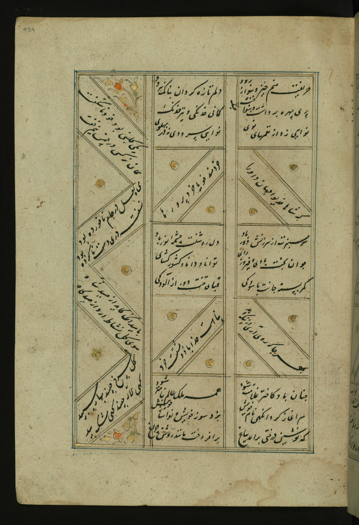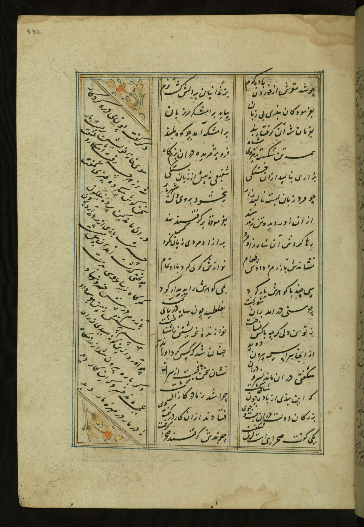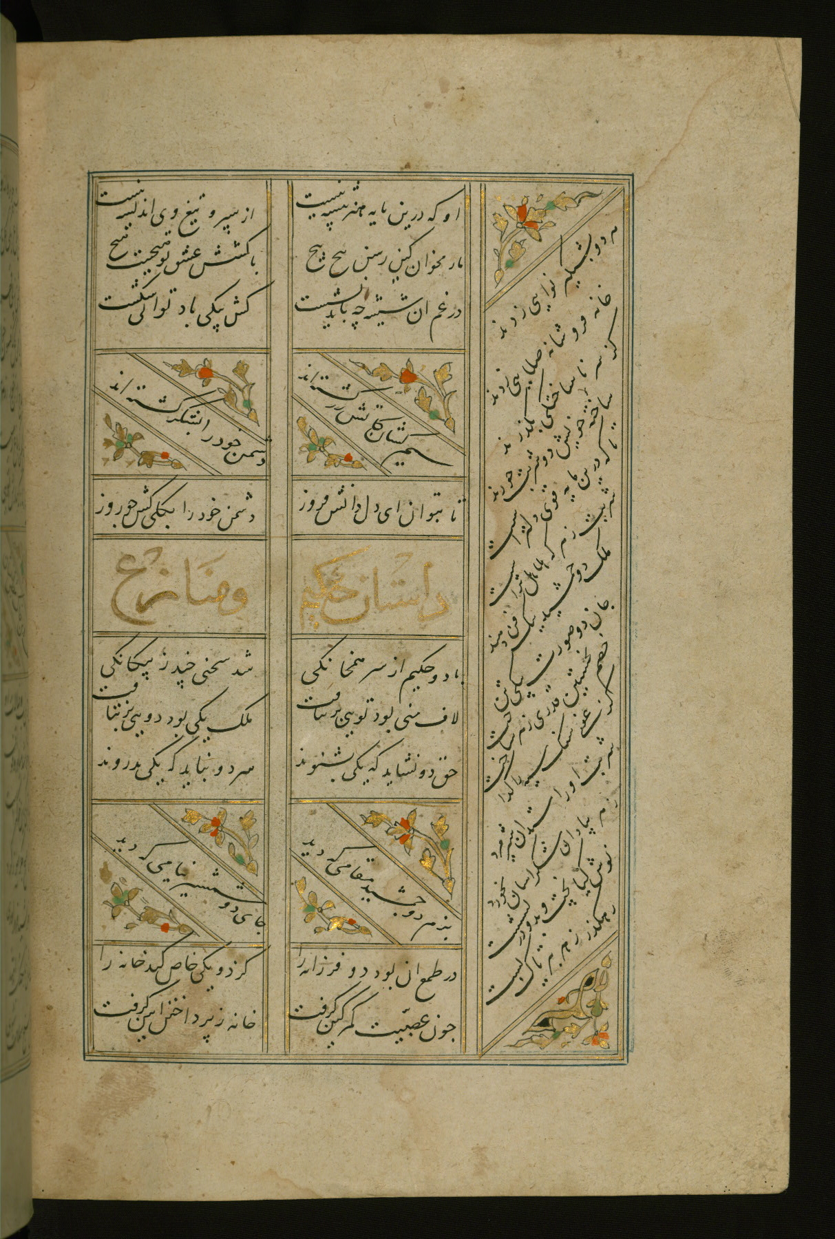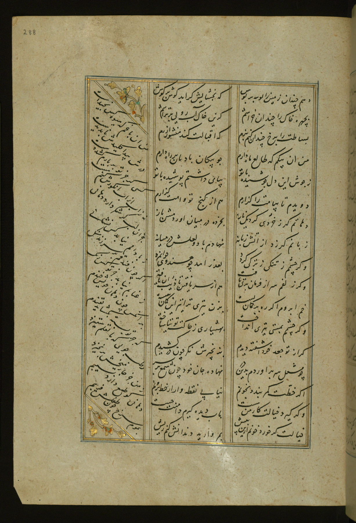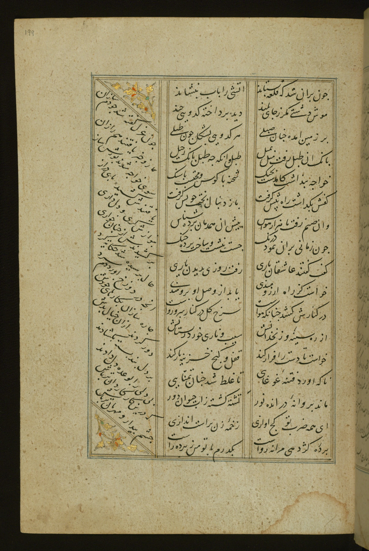 This copy of the Khamsah (quintet) of Niẓāmī Ganjavī (d. 605 AH / 1209 CE) was written by Abū Bakr Shāh ibn Ḥasan ibn ʿAlī al-Shahrastānī and illuminated by Jamāl al-Dīn ibn Muḥammad al-Ṣiddīqī al-Iṣfahānī between 892 AH / 1486 CE and 900 AH / 1494-5 CE. The manuscript opens with a double-page illuminated frontispiece with an inscription giving the title of the work and the name of the author (fols. 1b-2a). There are four illuminated titlepieces with the names of the individual poems and twenty-six repainted illustrations. According to evidence supplied by the colophons, the original binding was by the hand of Jamāl al-Dīn ibn Muḥammad al-Ṣiddīqī al-Iṣfahānī, as well. Unfortunately, it has not survived. The binding presently attached to the manuscript dates to the twelfth century AH / eighteenth CE.