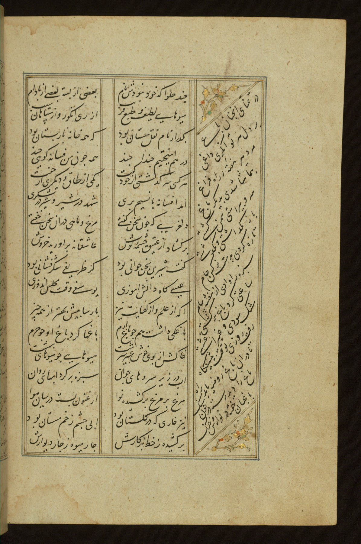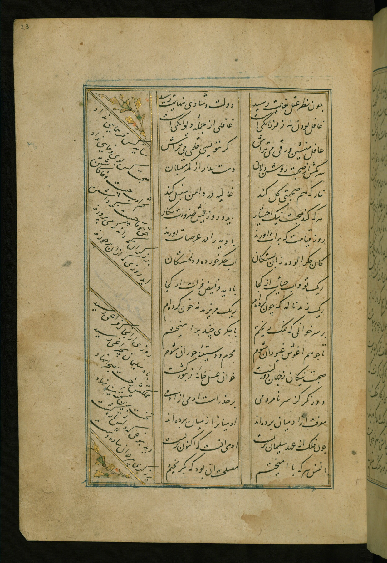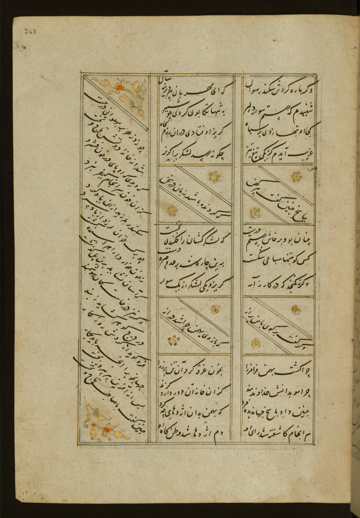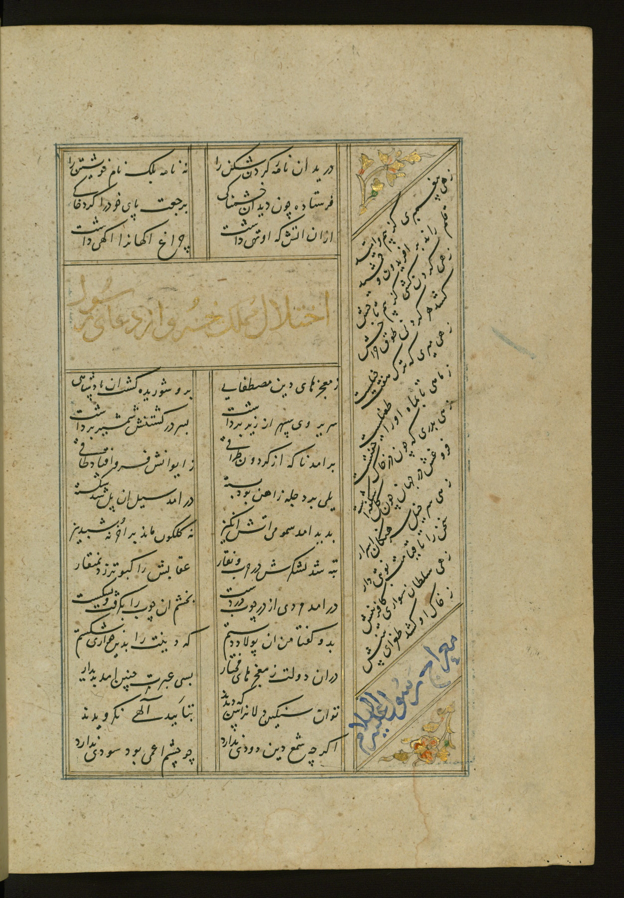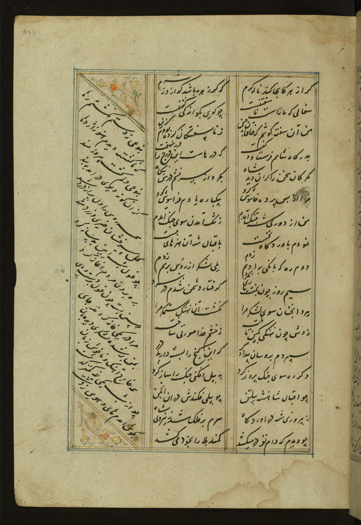 This copy of the Khamsah (quintet) of Niẓāmī Ganjavī (d. 605 AH / 1209 CE) was written by Abū Bakr Shāh ibn Ḥasan ibn ʿAlī al-Shahrastānī and illuminated by Jamāl al-Dīn ibn Muḥammad al-Ṣiddīqī al-Iṣfahānī between 892 AH / 1486 CE and 900 AH / 1494-5 CE. The manuscript opens with a double-page illuminated frontispiece with an inscription giving the title of the work and the name of the author (fols. 1b-2a). There are four illuminated titlepieces with the names of the individual poems and twenty-six repainted illustrations. According to evidence supplied by the colophons, the original binding was by the hand of Jamāl al-Dīn ibn Muḥammad al-Ṣiddīqī al-Iṣfahānī, as well. Unfortunately, it has not survived. The binding presently attached to the manuscript dates to the twelfth century AH / eighteenth CE.