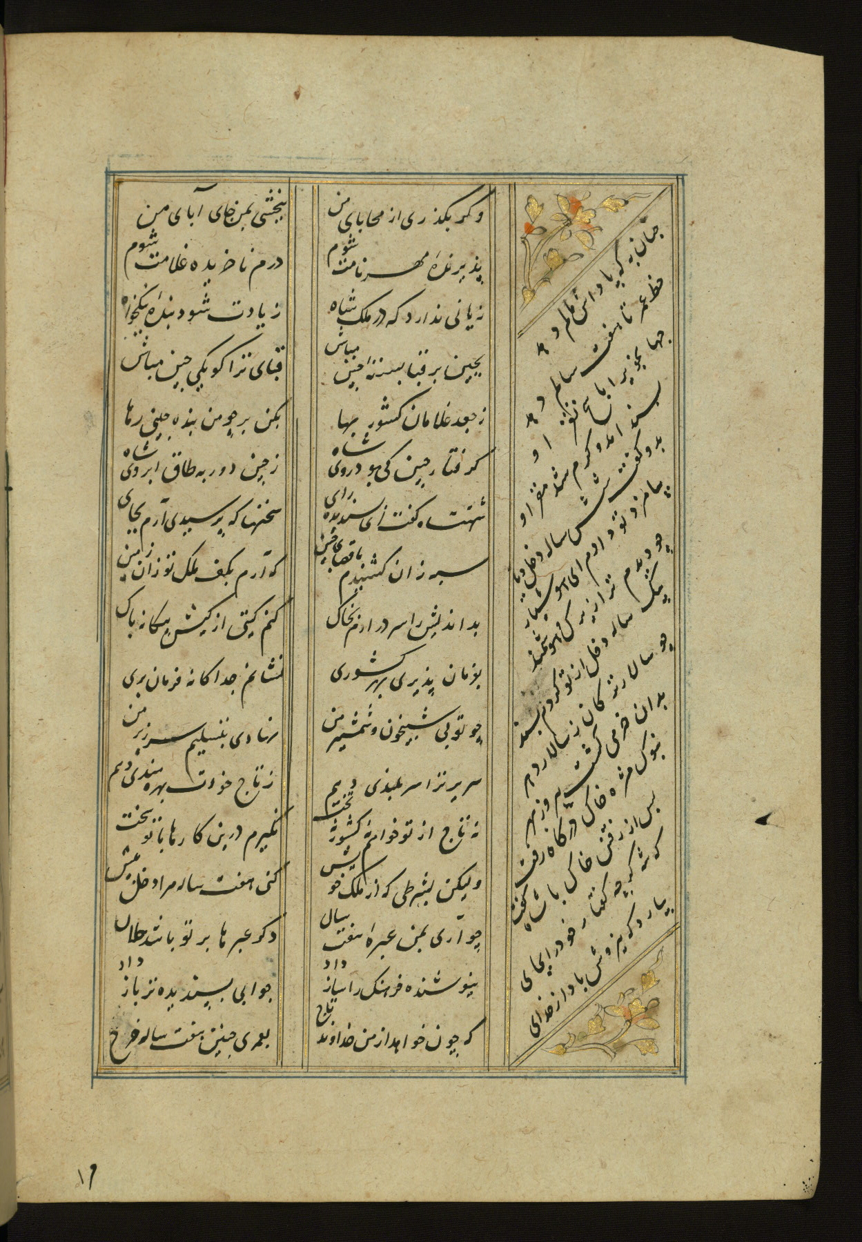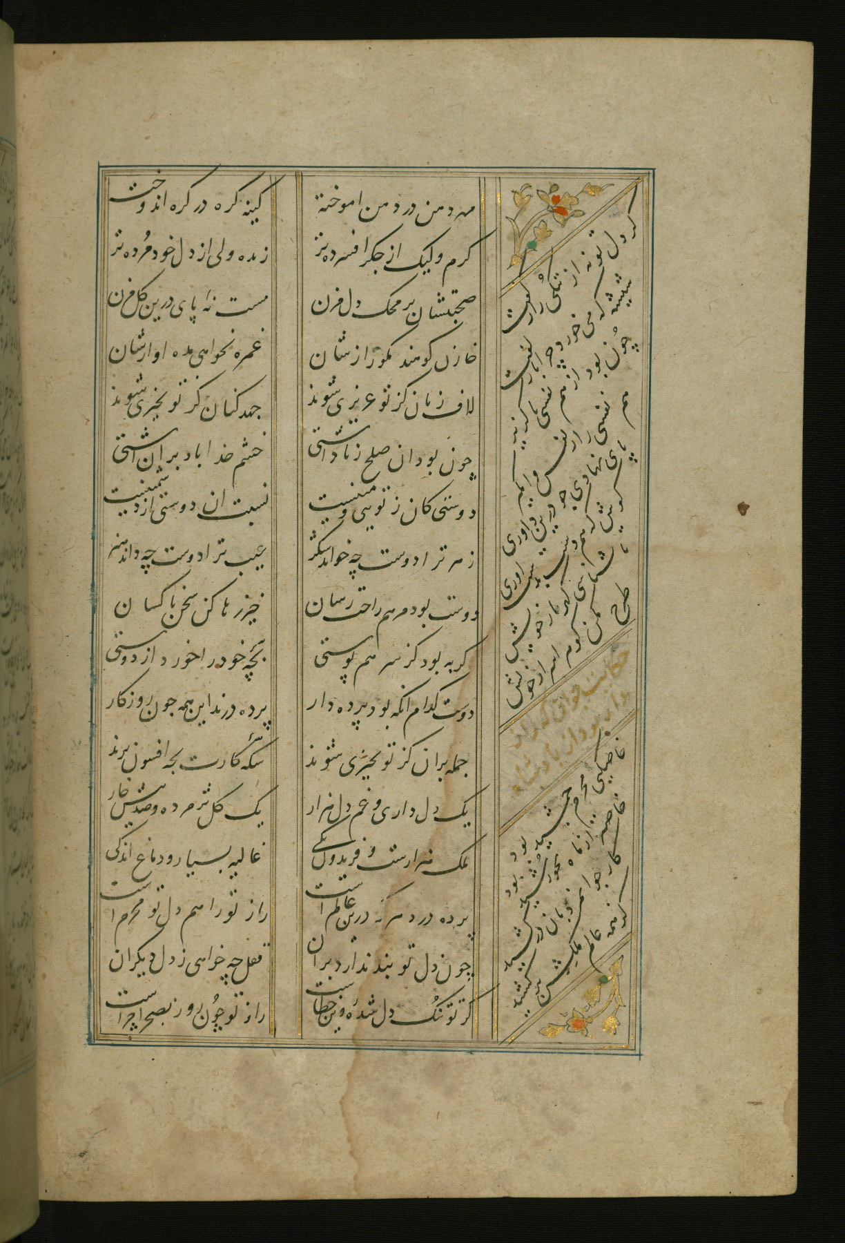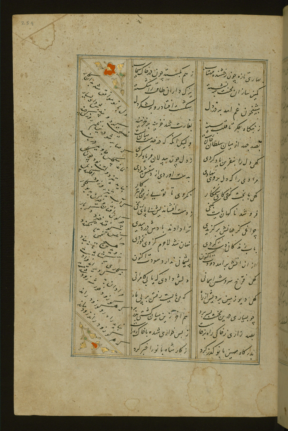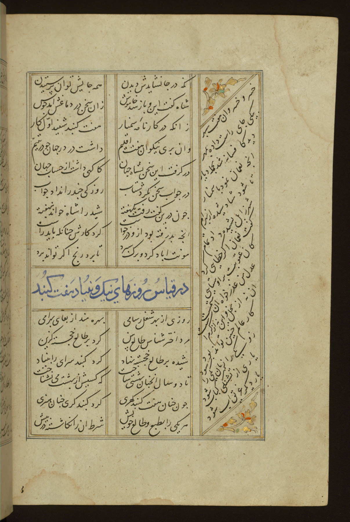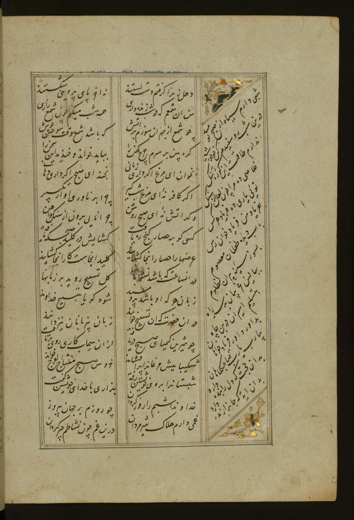 This copy of the Khamsah (quintet) of Niẓāmī Ganjavī (d. 605 AH / 1209 CE) was written by Abū Bakr Shāh ibn Ḥasan ibn ʿAlī al-Shahrastānī and illuminated by Jamāl al-Dīn ibn Muḥammad al-Ṣiddīqī al-Iṣfahānī between 892 AH / 1486 CE and 900 AH / 1494-5 CE. The manuscript opens with a double-page illuminated frontispiece with an inscription giving the title of the work and the name of the author (fols. 1b-2a). There are four illuminated titlepieces with the names of the individual poems and twenty-six repainted illustrations. According to evidence supplied by the colophons, the original binding was by the hand of Jamāl al-Dīn ibn Muḥammad al-Ṣiddīqī al-Iṣfahānī, as well. Unfortunately, it has not survived. The binding presently attached to the manuscript dates to the twelfth century AH / eighteenth CE.