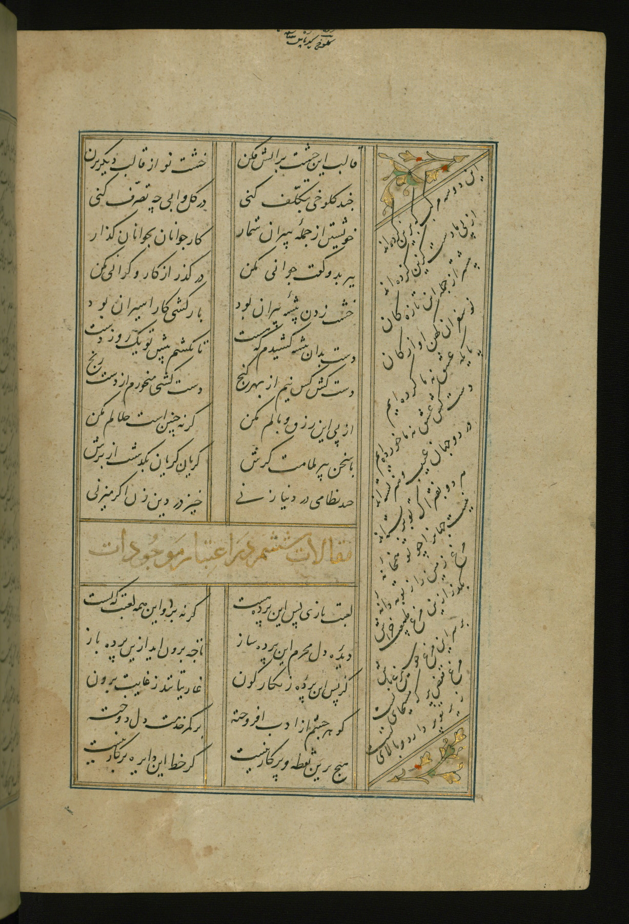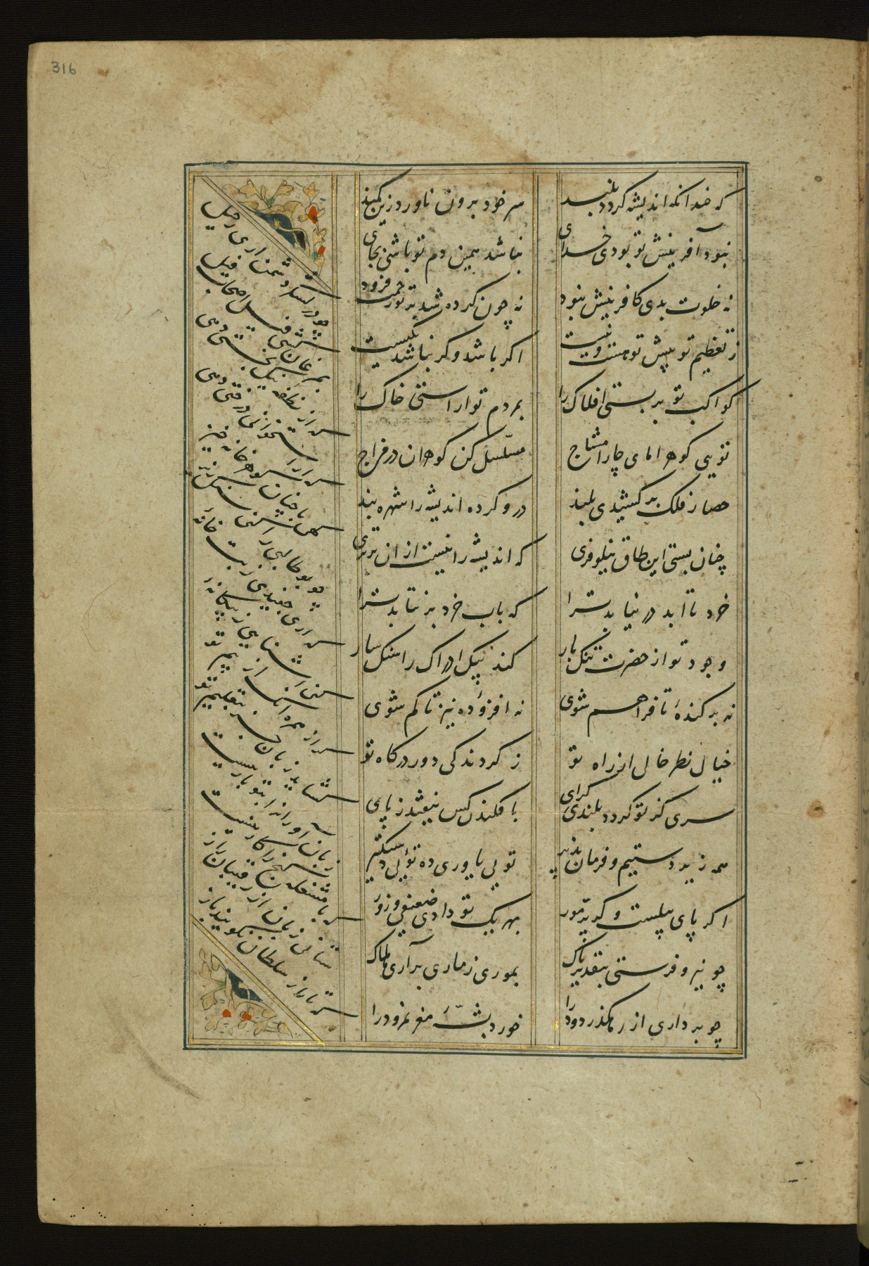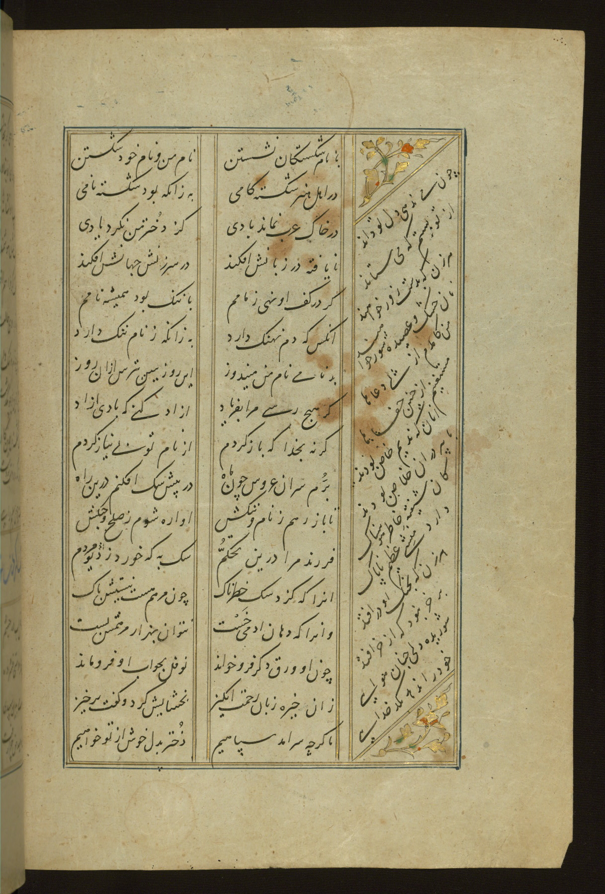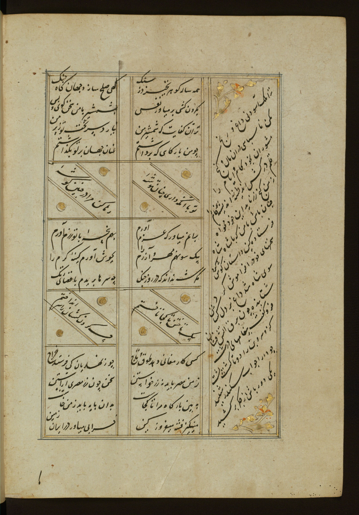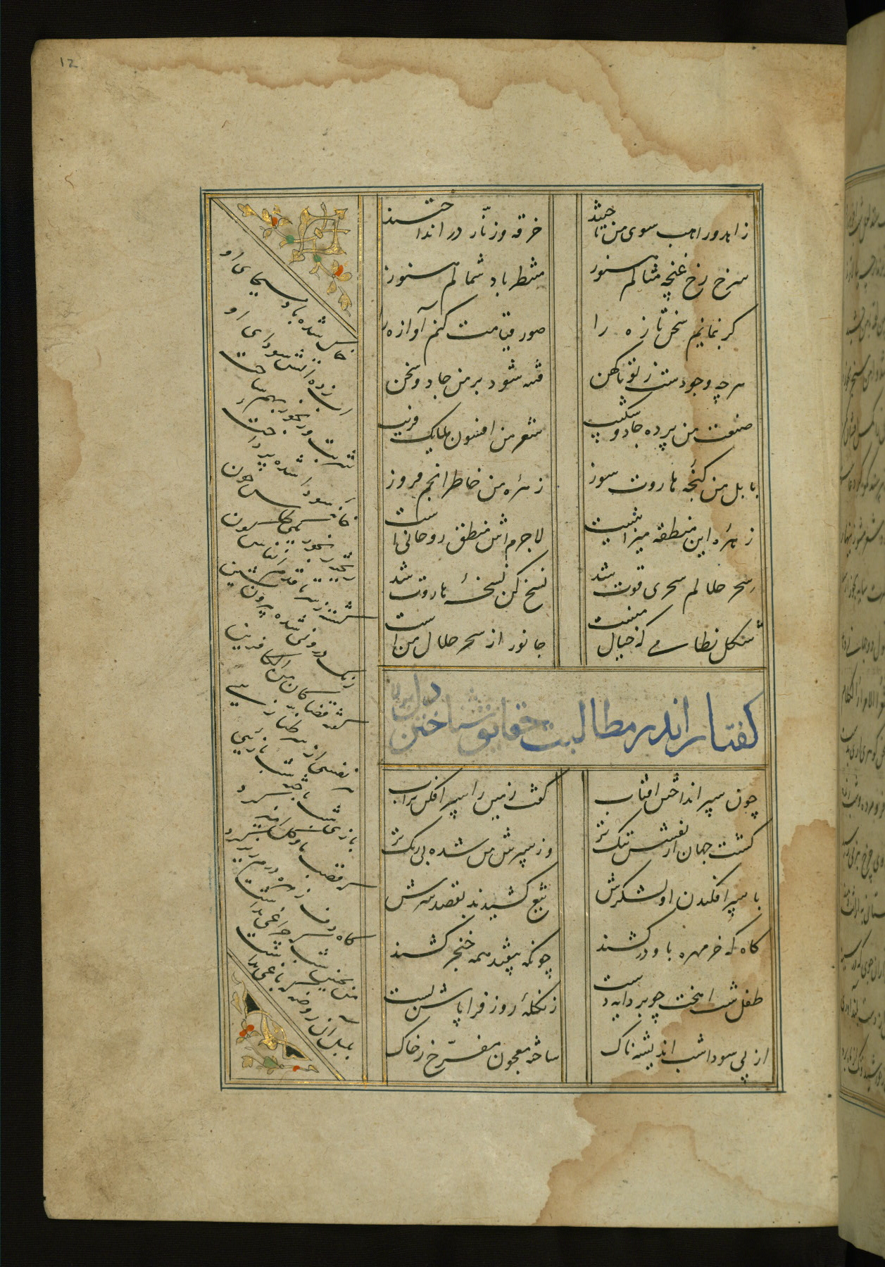 This copy of the Khamsah (quintet) of Niẓāmī Ganjavī (d. 605 AH / 1209 CE) was written by Abū Bakr Shāh ibn Ḥasan ibn ʿAlī al-Shahrastānī and illuminated by Jamāl al-Dīn ibn Muḥammad al-Ṣiddīqī al-Iṣfahānī between 892 AH / 1486 CE and 900 AH / 1494-5 CE. The manuscript opens with a double-page illuminated frontispiece with an inscription giving the title of the work and the name of the author (fols. 1b-2a). There are four illuminated titlepieces with the names of the individual poems and twenty-six repainted illustrations. According to evidence supplied by the colophons, the original binding was by the hand of Jamāl al-Dīn ibn Muḥammad al-Ṣiddīqī al-Iṣfahānī, as well. Unfortunately, it has not survived. The binding presently attached to the manuscript dates to the twelfth century AH / eighteenth CE.