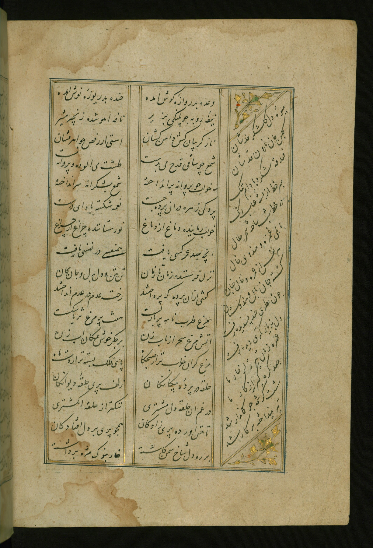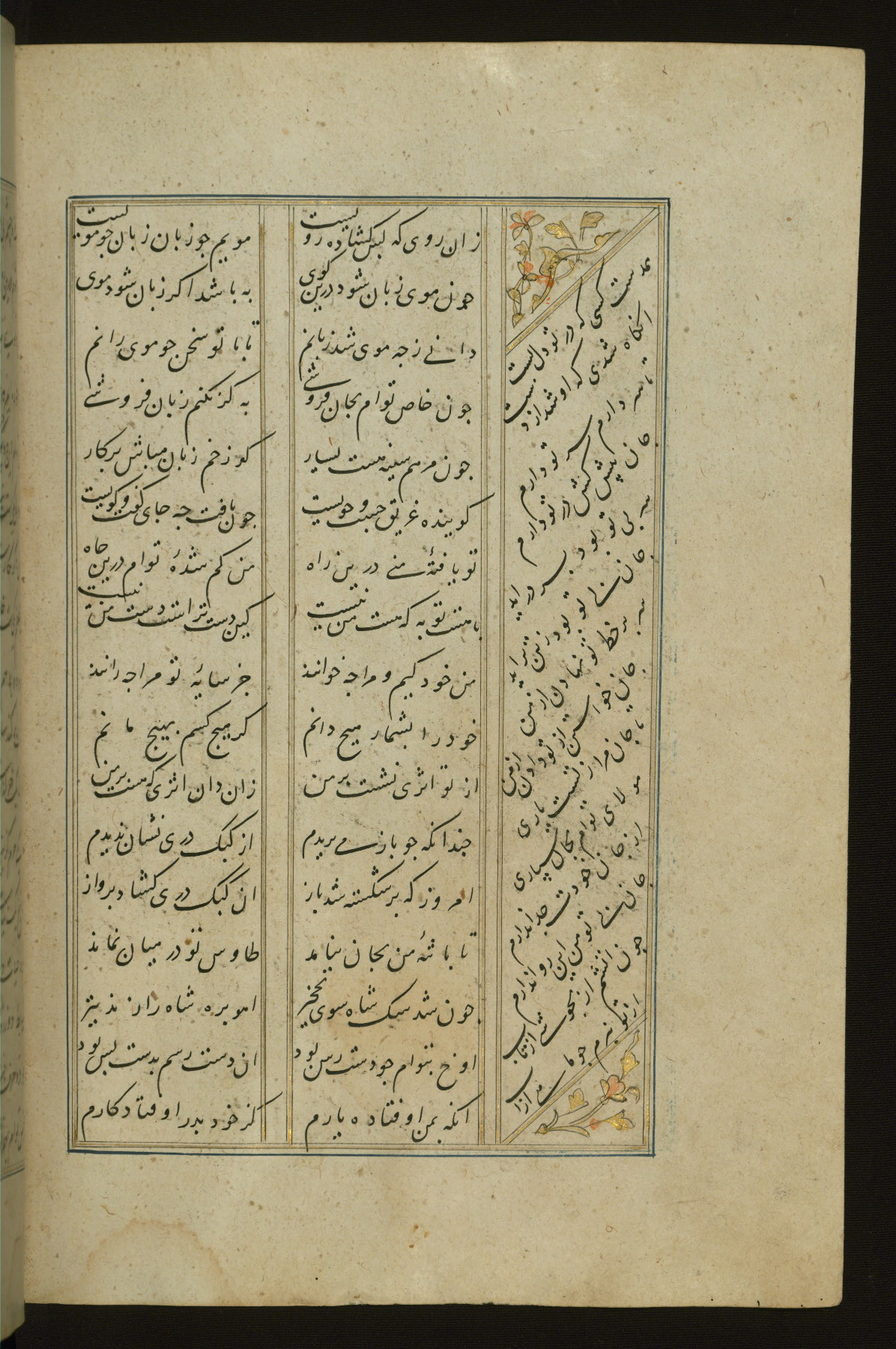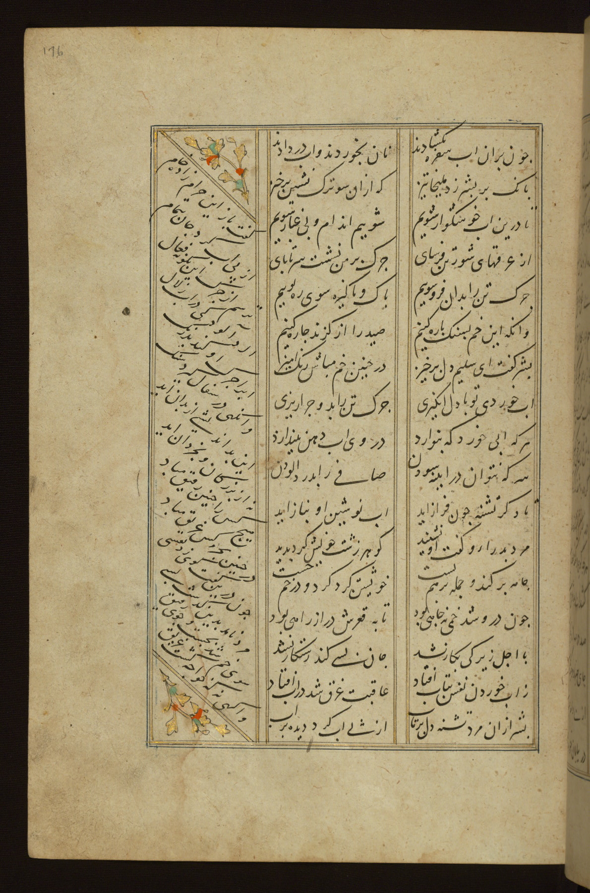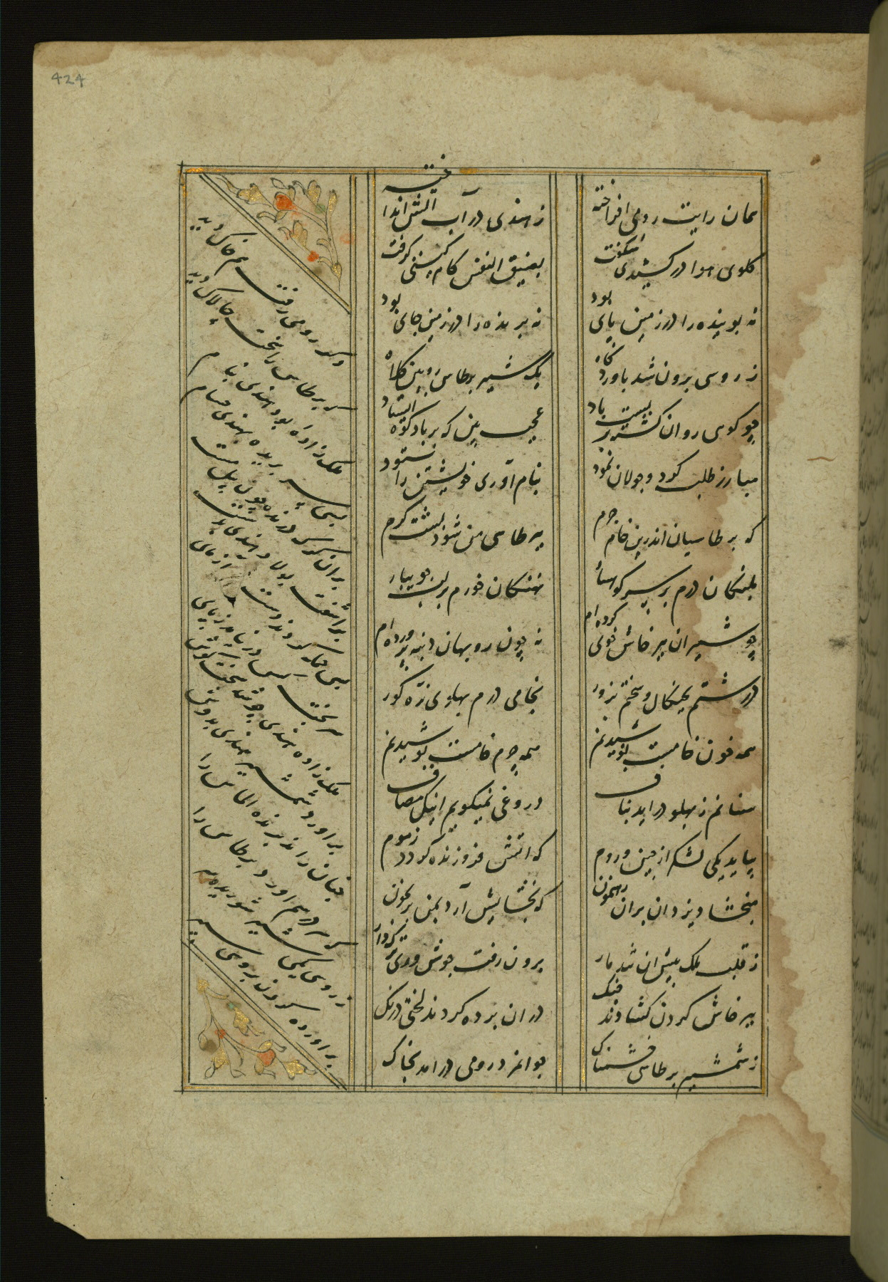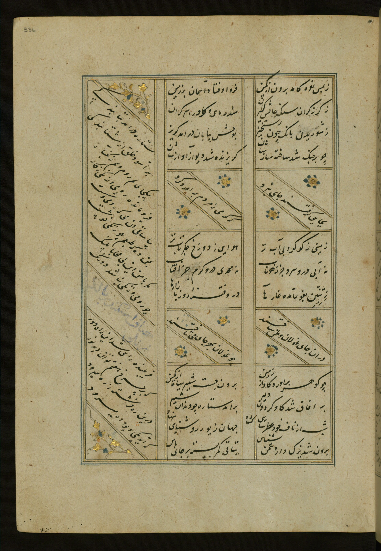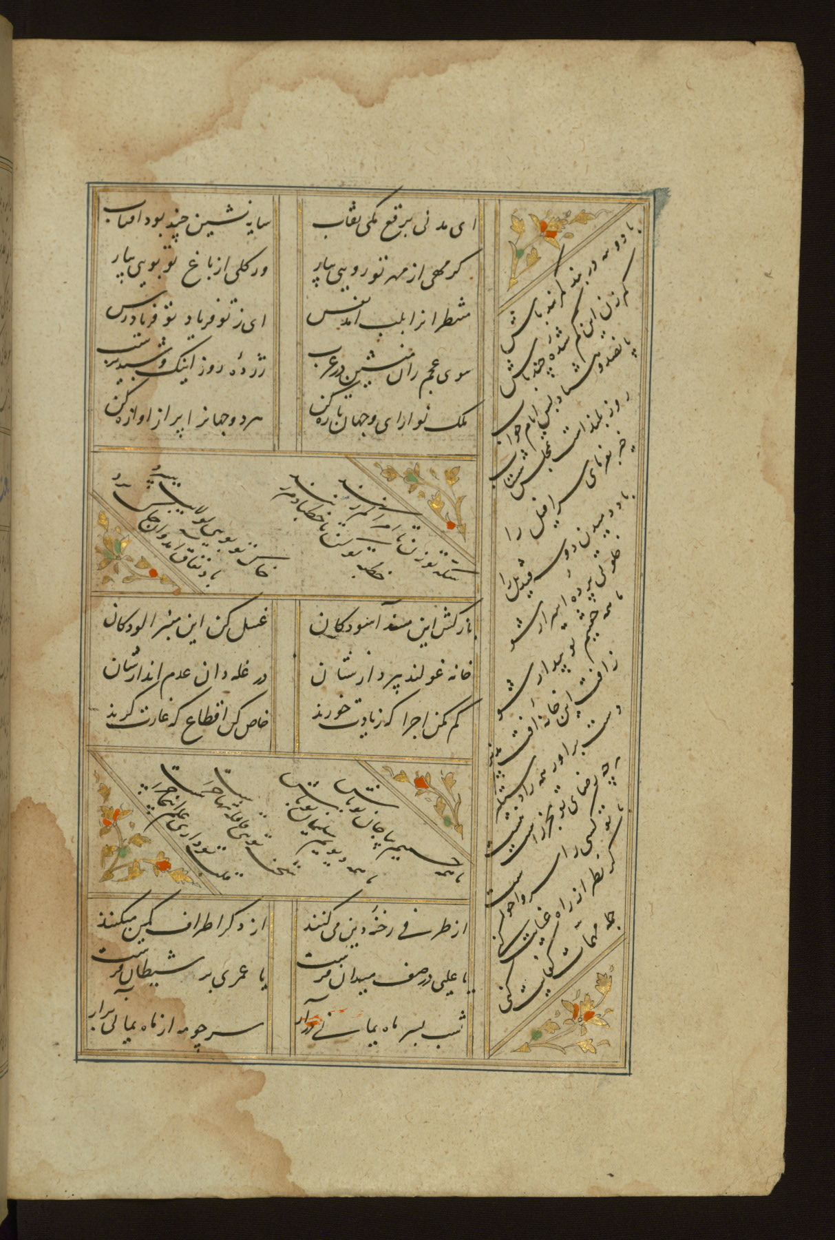 This copy of the Khamsah (quintet) of Niẓāmī Ganjavī (d. 605 AH / 1209 CE) was written by Abū Bakr Shāh ibn Ḥasan ibn ʿAlī al-Shahrastānī and illuminated by Jamāl al-Dīn ibn Muḥammad al-Ṣiddīqī al-Iṣfahānī between 892 AH / 1486 CE and 900 AH / 1494-5 CE. The manuscript opens with a double-page illuminated frontispiece with an inscription giving the title of the work and the name of the author (fols. 1b-2a). There are four illuminated titlepieces with the names of the individual poems and twenty-six repainted illustrations. According to evidence supplied by the colophons, the original binding was by the hand of Jamāl al-Dīn ibn Muḥammad al-Ṣiddīqī al-Iṣfahānī, as well. Unfortunately, it has not survived. The binding presently attached to the manuscript dates to the twelfth century AH / eighteenth CE.
