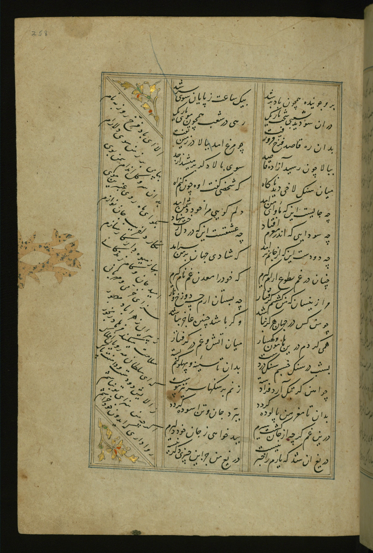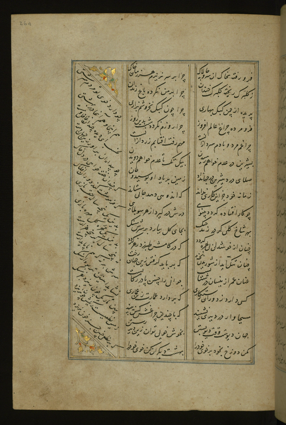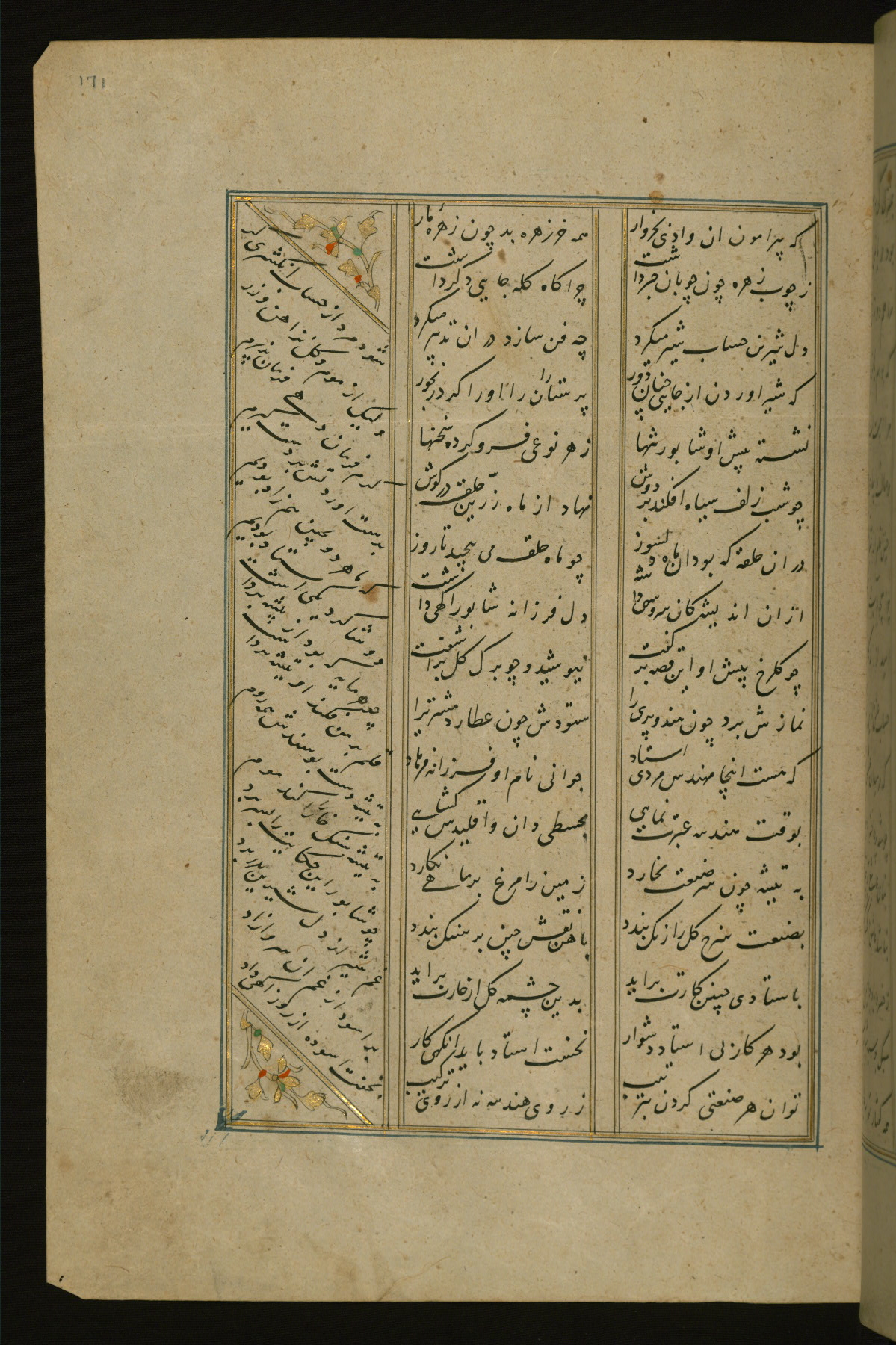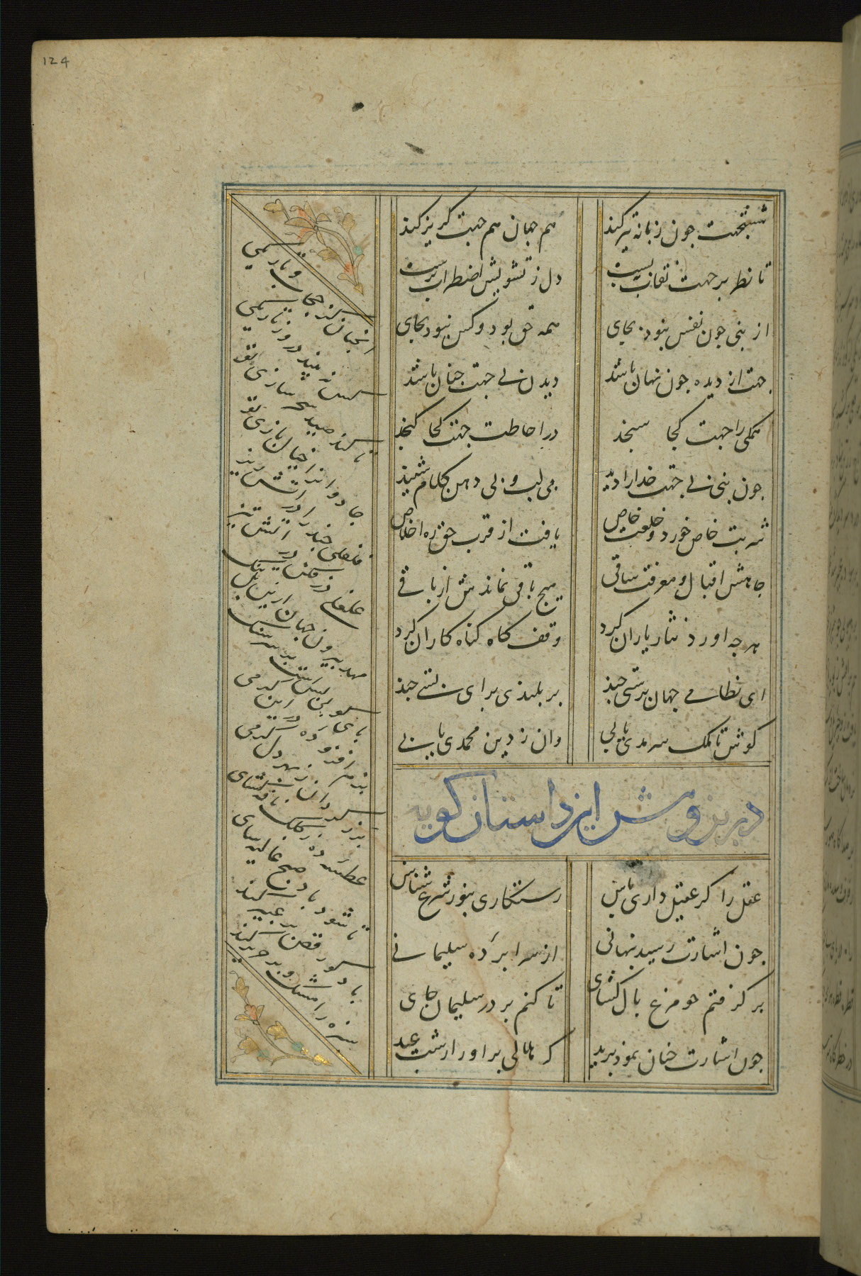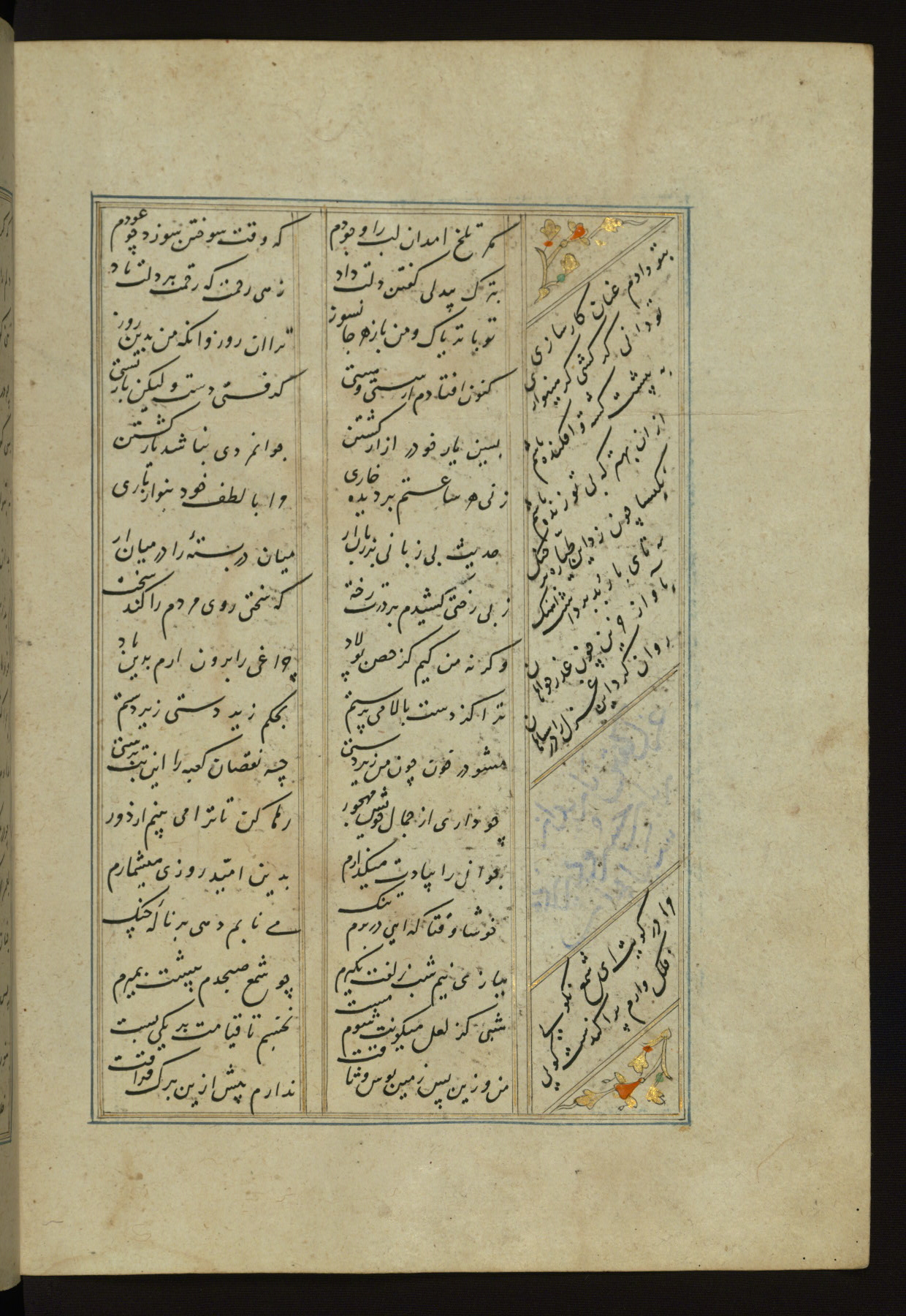 This copy of the Khamsah (quintet) of Niẓāmī Ganjavī (d. 605 AH / 1209 CE) was written by Abū Bakr Shāh ibn Ḥasan ibn ʿAlī al-Shahrastānī and illuminated by Jamāl al-Dīn ibn Muḥammad al-Ṣiddīqī al-Iṣfahānī between 892 AH / 1486 CE and 900 AH / 1494-5 CE. The manuscript opens with a double-page illuminated frontispiece with an inscription giving the title of the work and the name of the author (fols. 1b-2a). There are four illuminated titlepieces with the names of the individual poems and twenty-six repainted illustrations. According to evidence supplied by the colophons, the original binding was by the hand of Jamāl al-Dīn ibn Muḥammad al-Ṣiddīqī al-Iṣfahānī, as well. Unfortunately, it has not survived. The binding presently attached to the manuscript dates to the twelfth century AH / eighteenth CE.