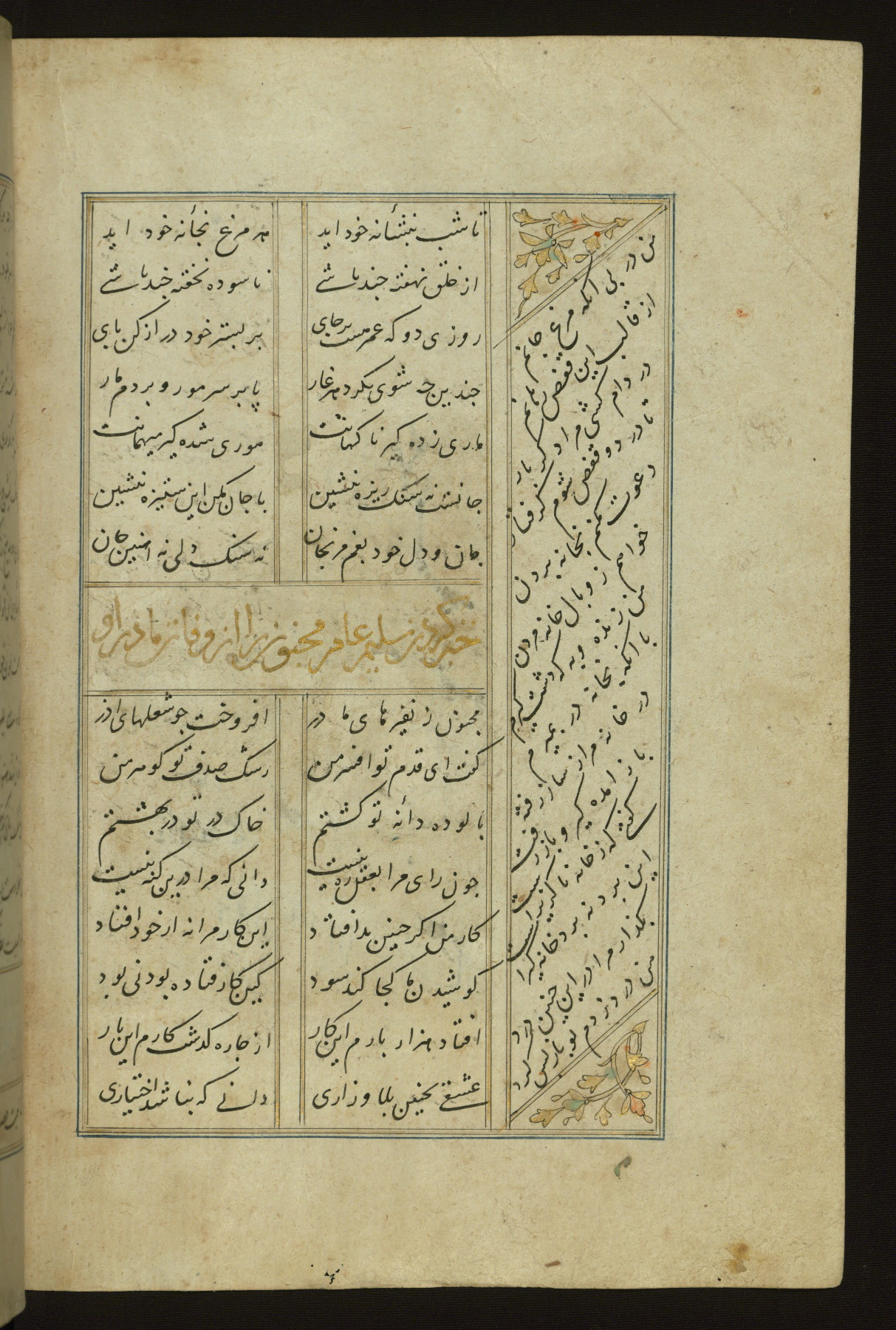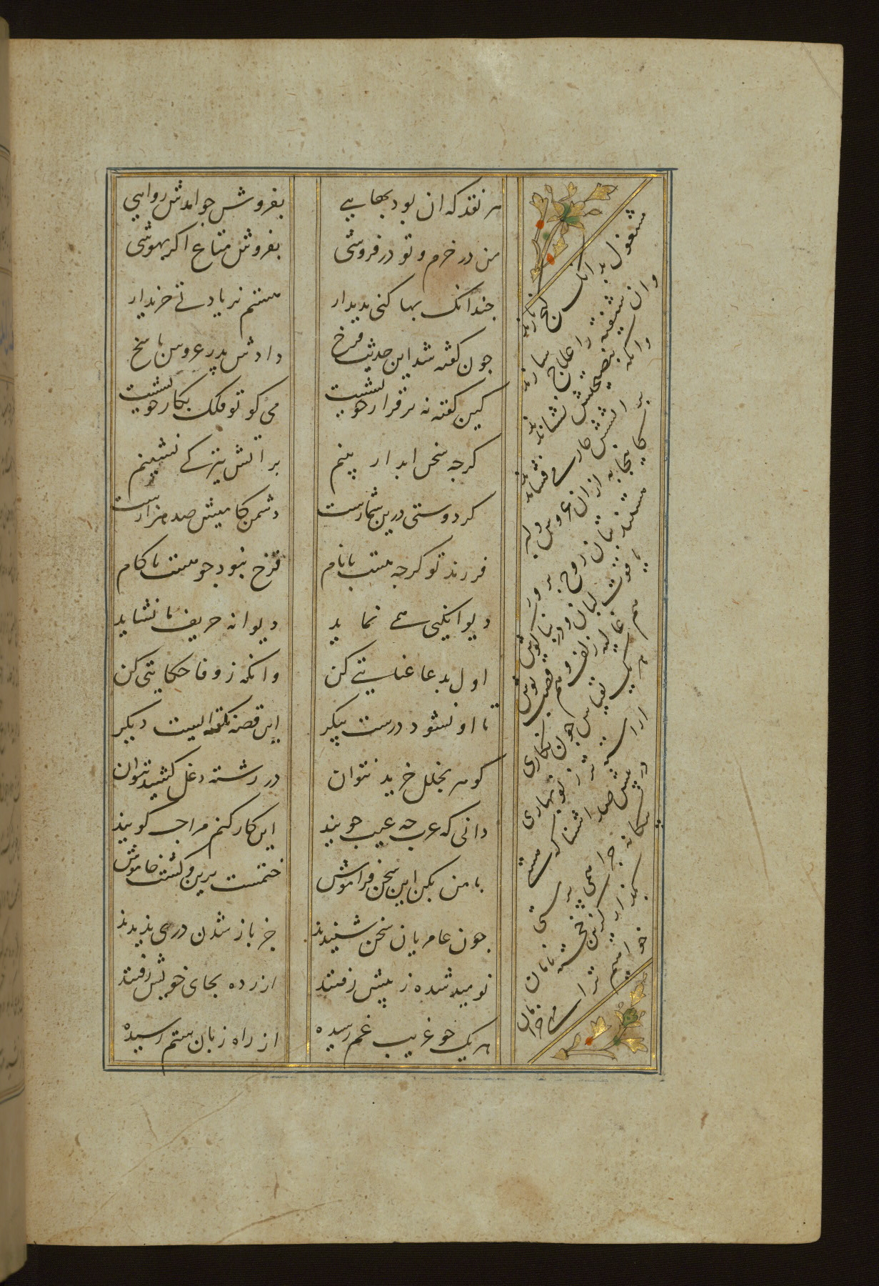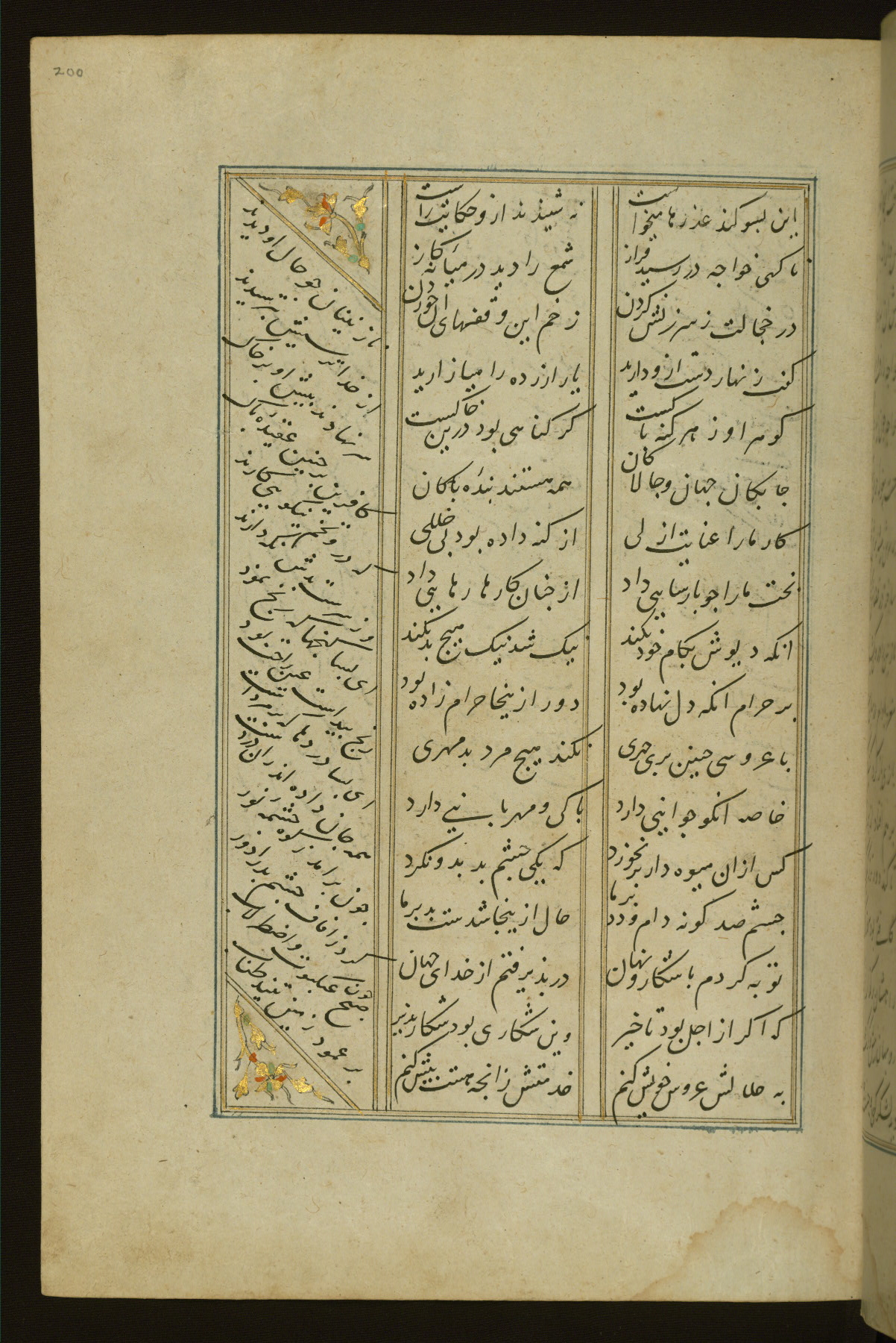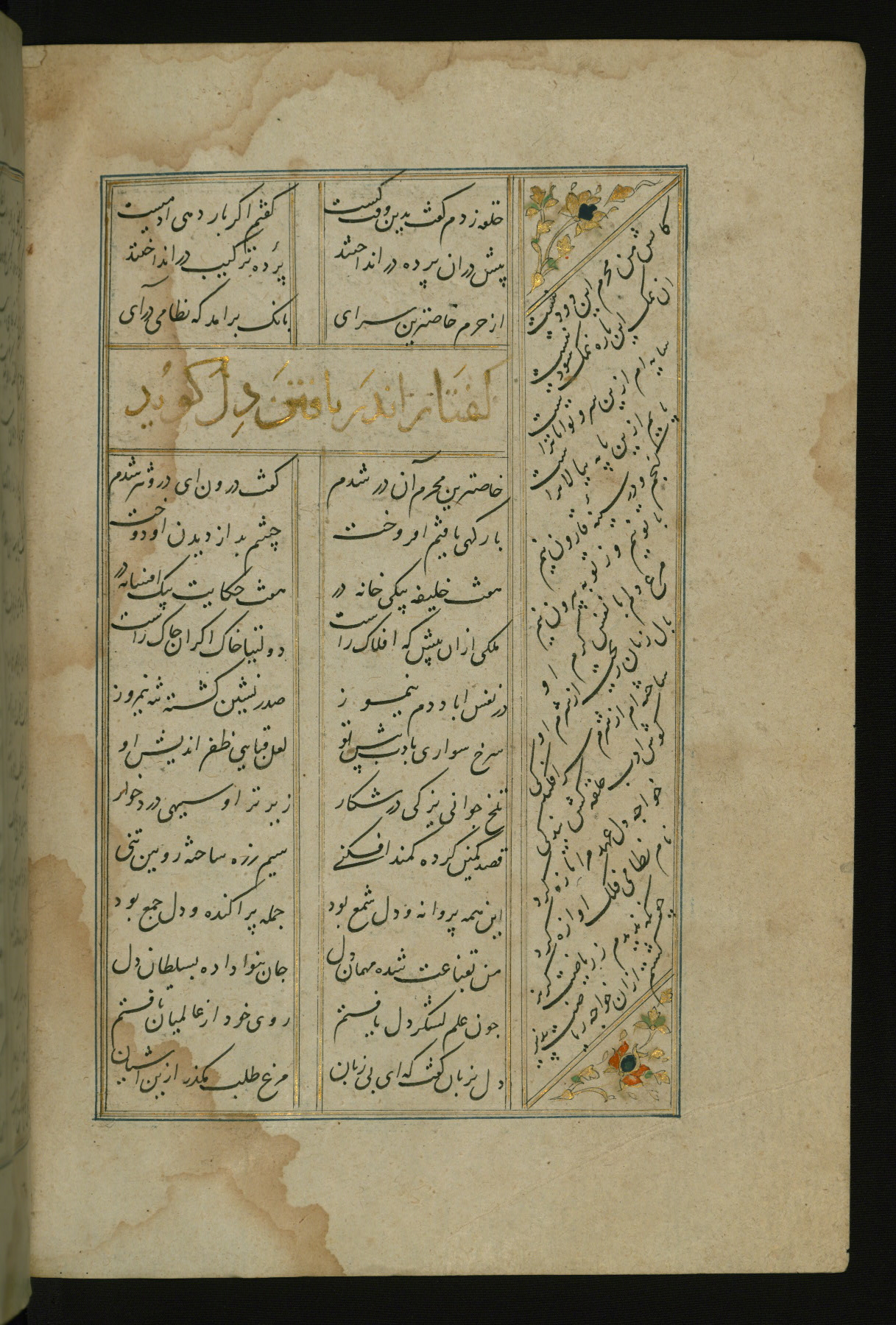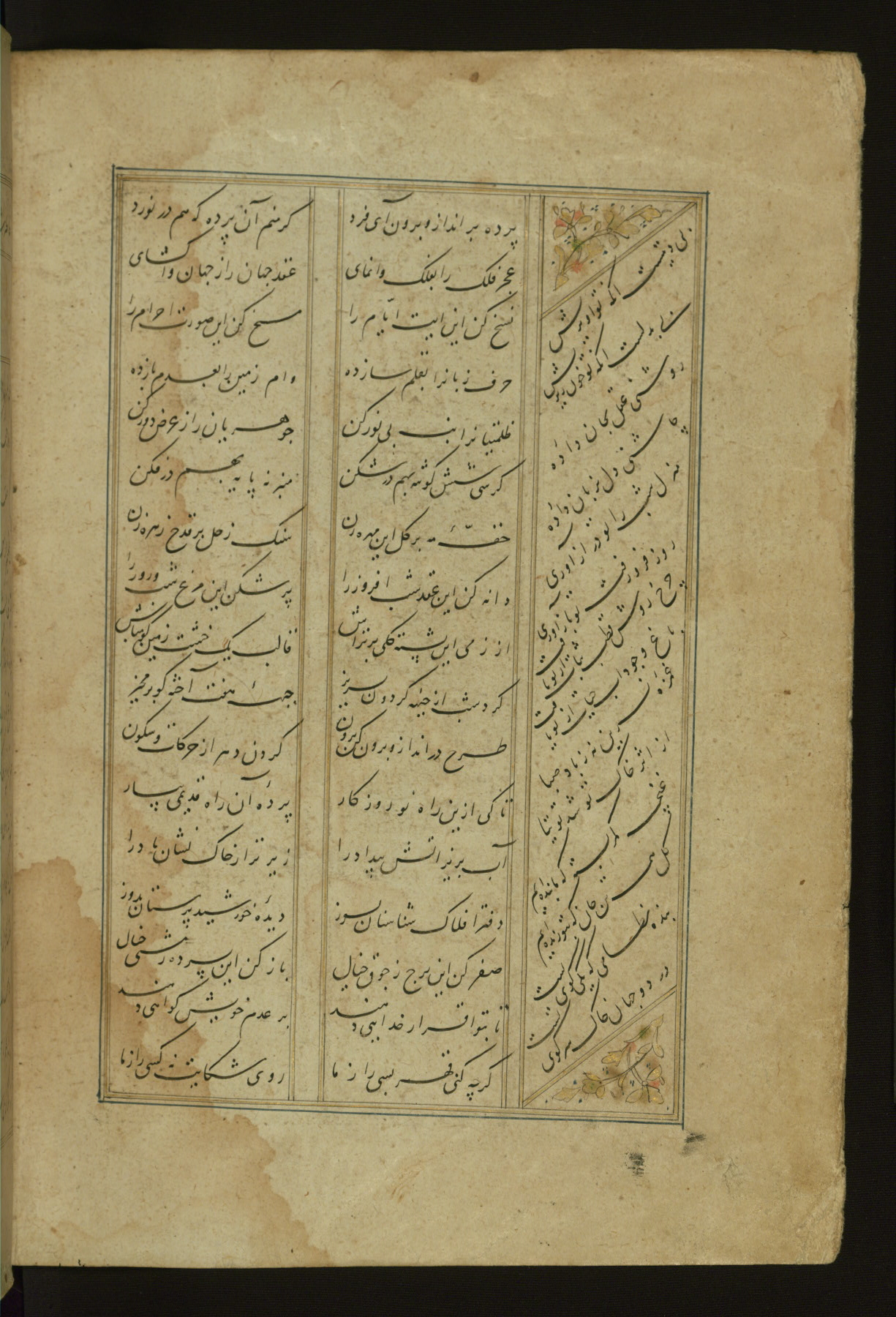 This copy of the Khamsah (quintet) of Niẓāmī Ganjavī (d. 605 AH / 1209 CE) was written by Abū Bakr Shāh ibn Ḥasan ibn ʿAlī al-Shahrastānī and illuminated by Jamāl al-Dīn ibn Muḥammad al-Ṣiddīqī al-Iṣfahānī between 892 AH / 1486 CE and 900 AH / 1494-5 CE. The manuscript opens with a double-page illuminated frontispiece with an inscription giving the title of the work and the name of the author (fols. 1b-2a). There are four illuminated titlepieces with the names of the individual poems and twenty-six repainted illustrations. According to evidence supplied by the colophons, the original binding was by the hand of Jamāl al-Dīn ibn Muḥammad al-Ṣiddīqī al-Iṣfahānī, as well. Unfortunately, it has not survived. The binding presently attached to the manuscript dates to the twelfth century AH / eighteenth CE.