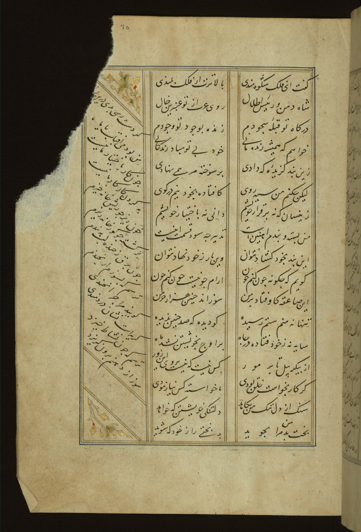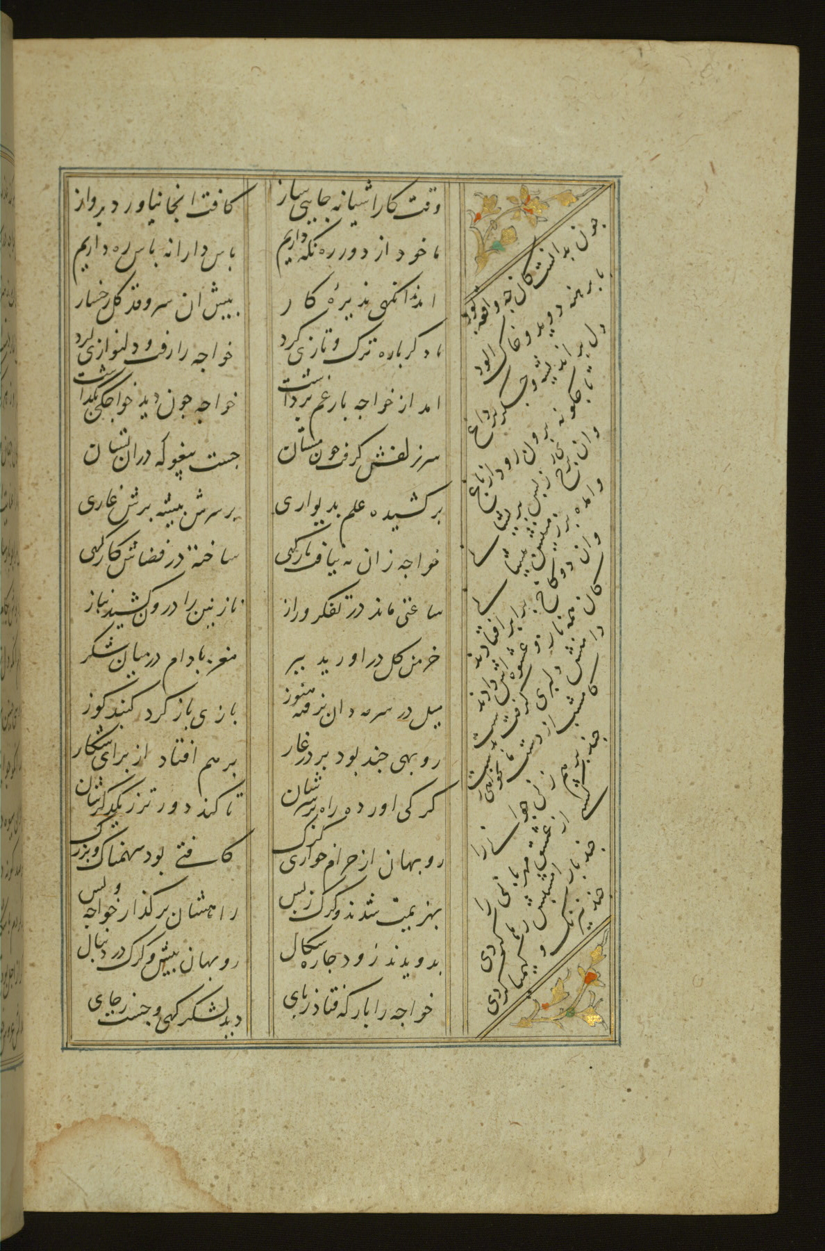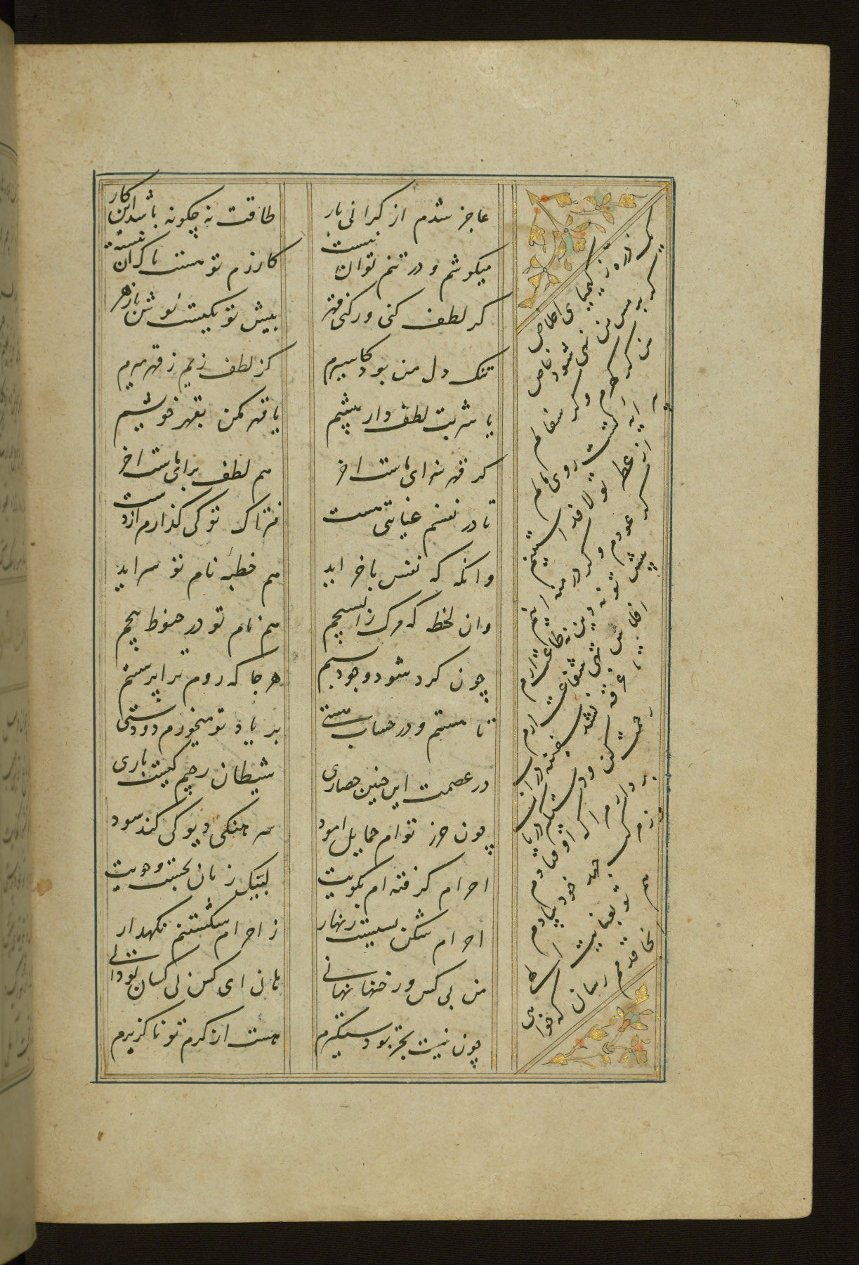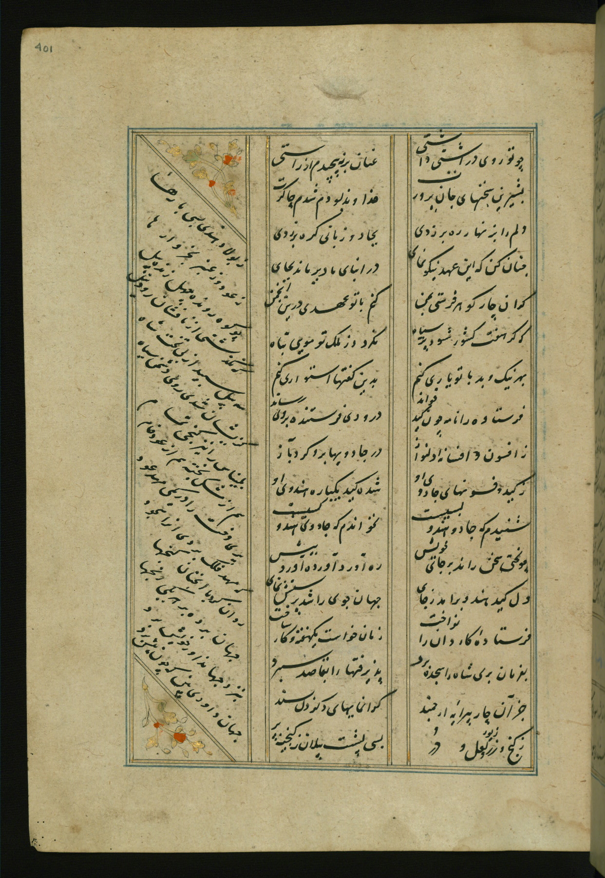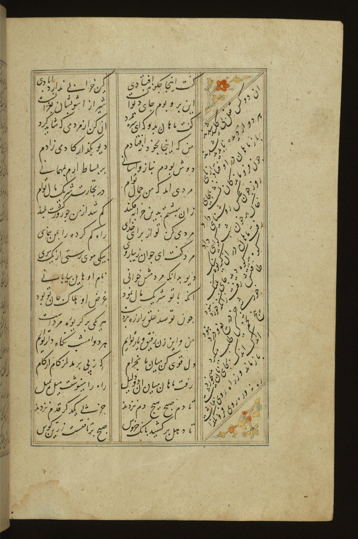 This copy of the Khamsah (quintet) of Niẓāmī Ganjavī (d. 605 AH / 1209 CE) was written by Abū Bakr Shāh ibn Ḥasan ibn ʿAlī al-Shahrastānī and illuminated by Jamāl al-Dīn ibn Muḥammad al-Ṣiddīqī al-Iṣfahānī between 892 AH / 1486 CE and 900 AH / 1494-5 CE. The manuscript opens with a double-page illuminated frontispiece with an inscription giving the title of the work and the name of the author (fols. 1b-2a). There are four illuminated titlepieces with the names of the individual poems and twenty-six repainted illustrations. According to evidence supplied by the colophons, the original binding was by the hand of Jamāl al-Dīn ibn Muḥammad al-Ṣiddīqī al-Iṣfahānī, as well. Unfortunately, it has not survived. The binding presently attached to the manuscript dates to the twelfth century AH / eighteenth CE.