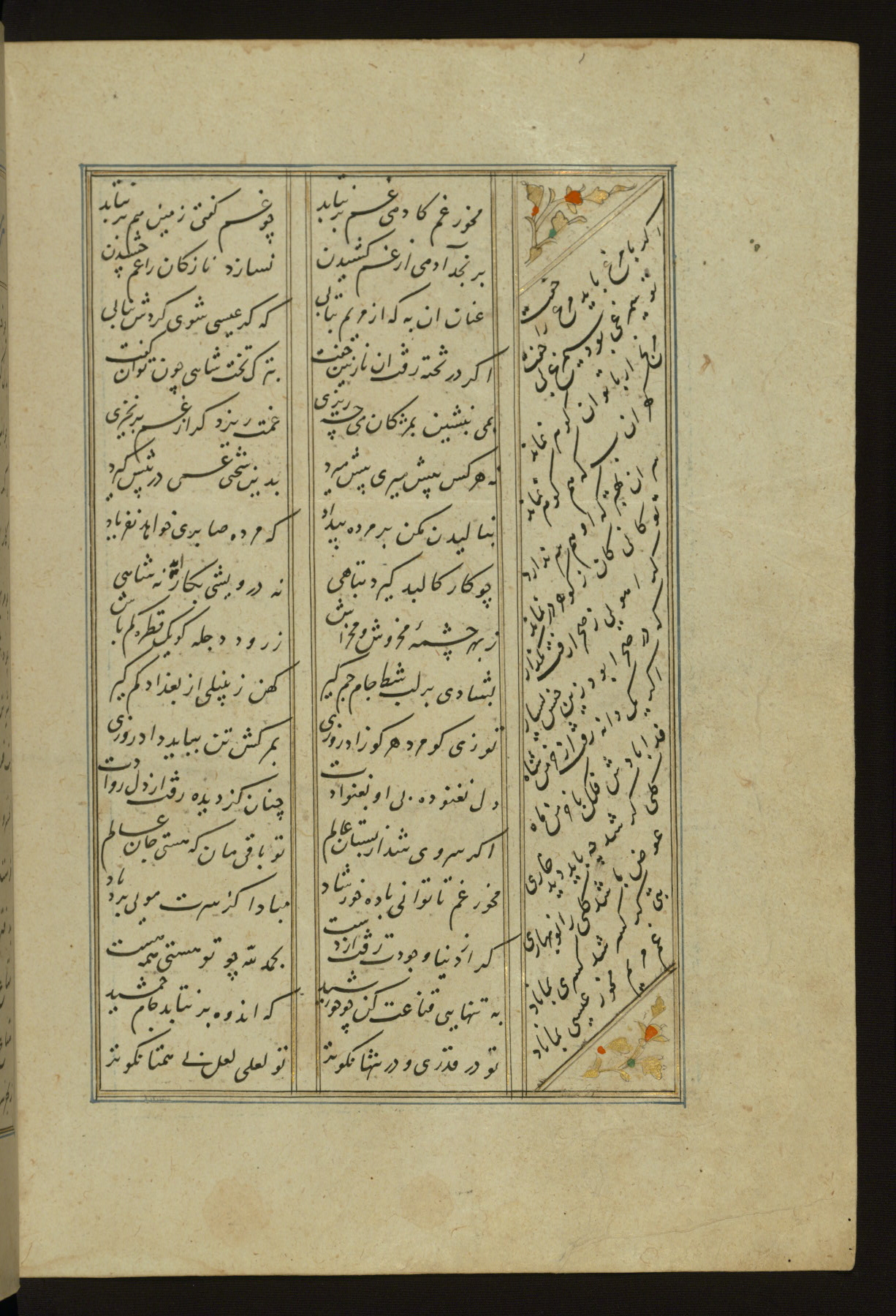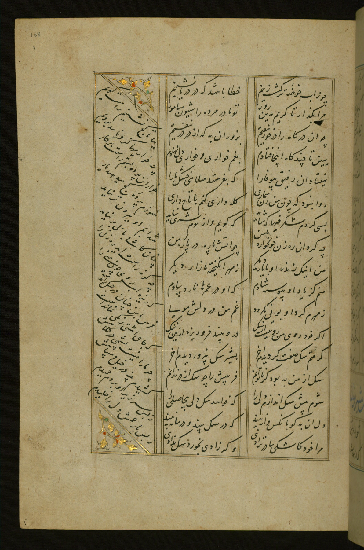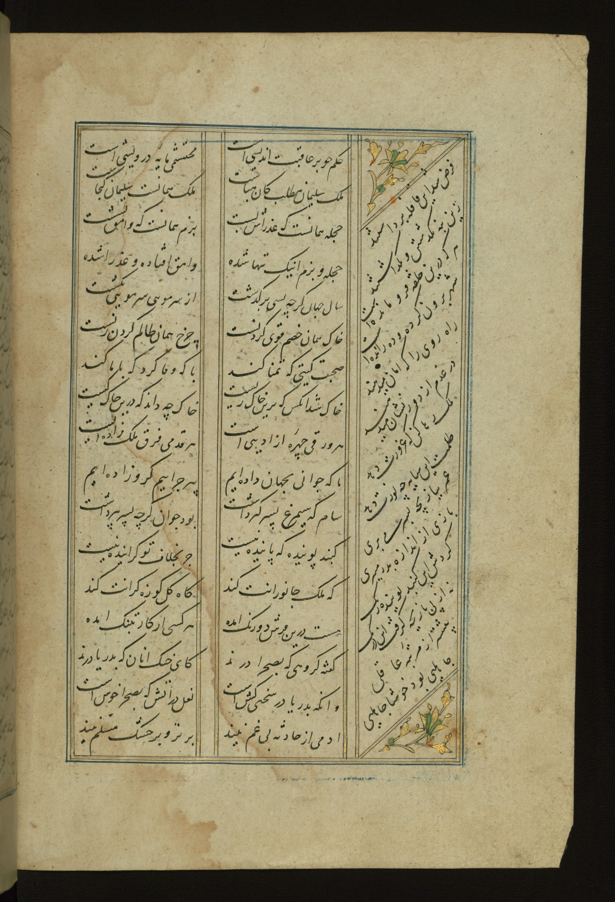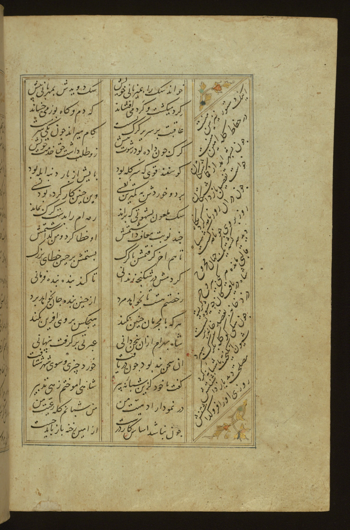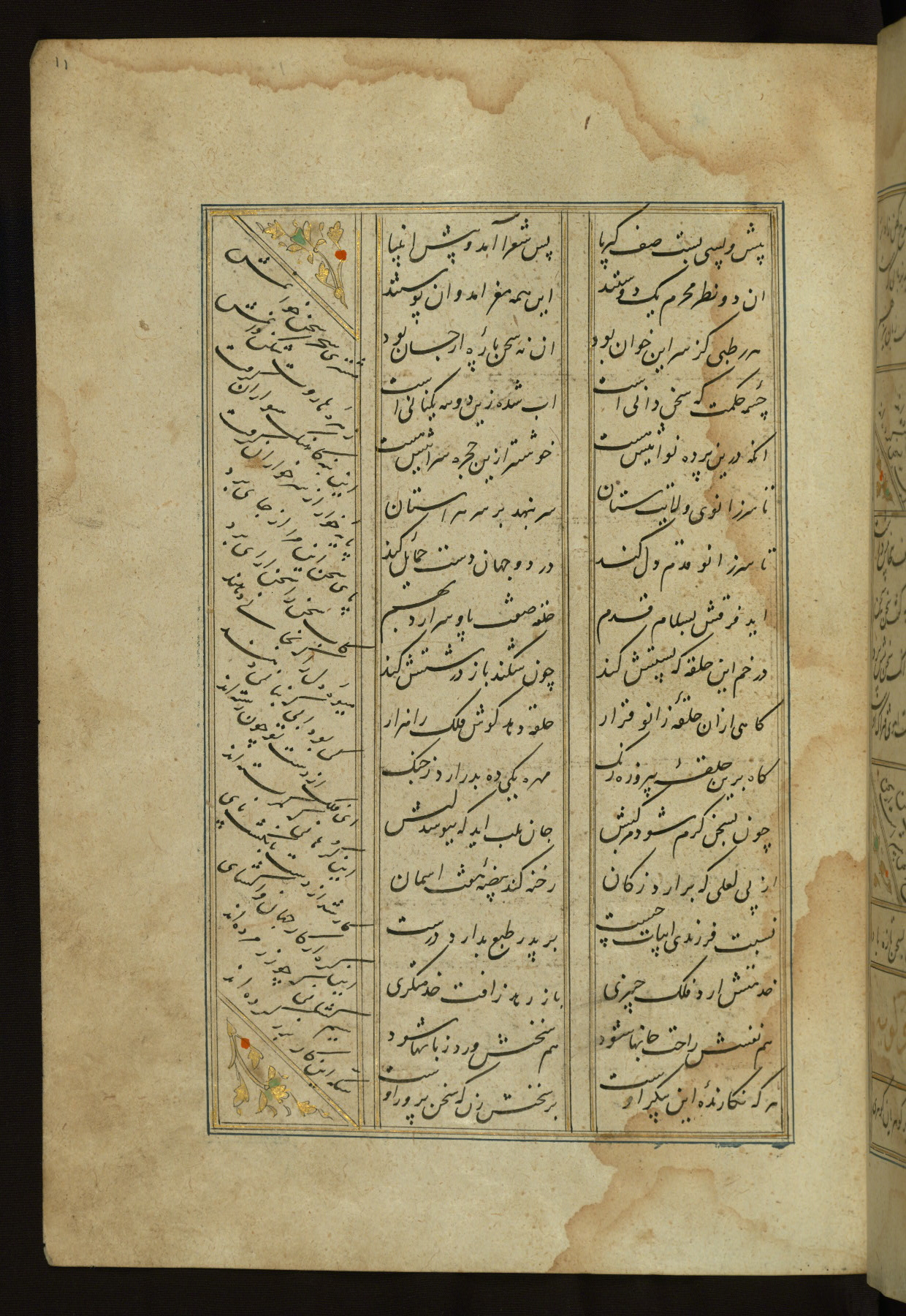 This copy of the Khamsah (quintet) of Niẓāmī Ganjavī (d. 605 AH / 1209 CE) was written by Abū Bakr Shāh ibn Ḥasan ibn ʿAlī al-Shahrastānī and illuminated by Jamāl al-Dīn ibn Muḥammad al-Ṣiddīqī al-Iṣfahānī between 892 AH / 1486 CE and 900 AH / 1494-5 CE. The manuscript opens with a double-page illuminated frontispiece with an inscription giving the title of the work and the name of the author (fols. 1b-2a). There are four illuminated titlepieces with the names of the individual poems and twenty-six repainted illustrations. According to evidence supplied by the colophons, the original binding was by the hand of Jamāl al-Dīn ibn Muḥammad al-Ṣiddīqī al-Iṣfahānī, as well. Unfortunately, it has not survived. The binding presently attached to the manuscript dates to the twelfth century AH / eighteenth CE.