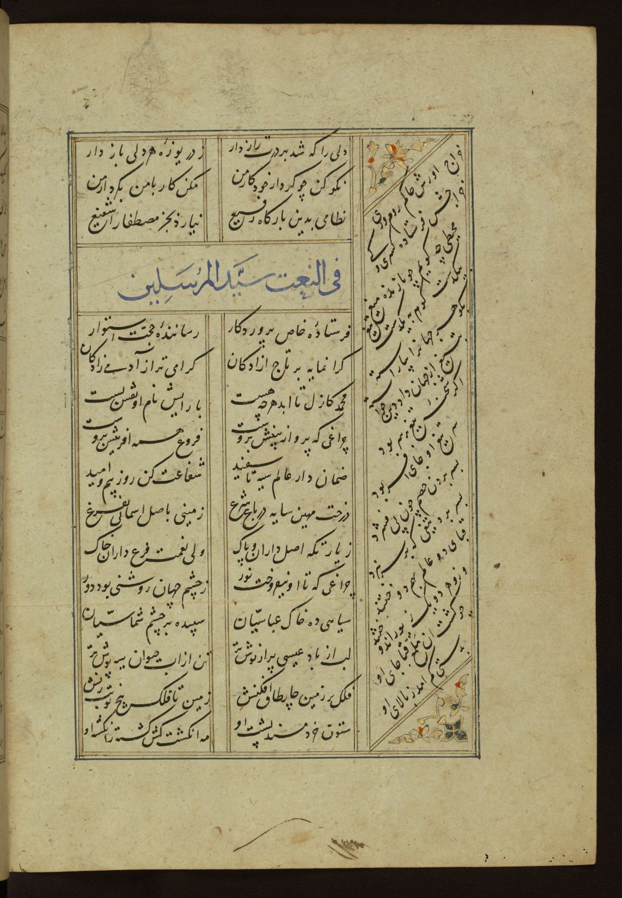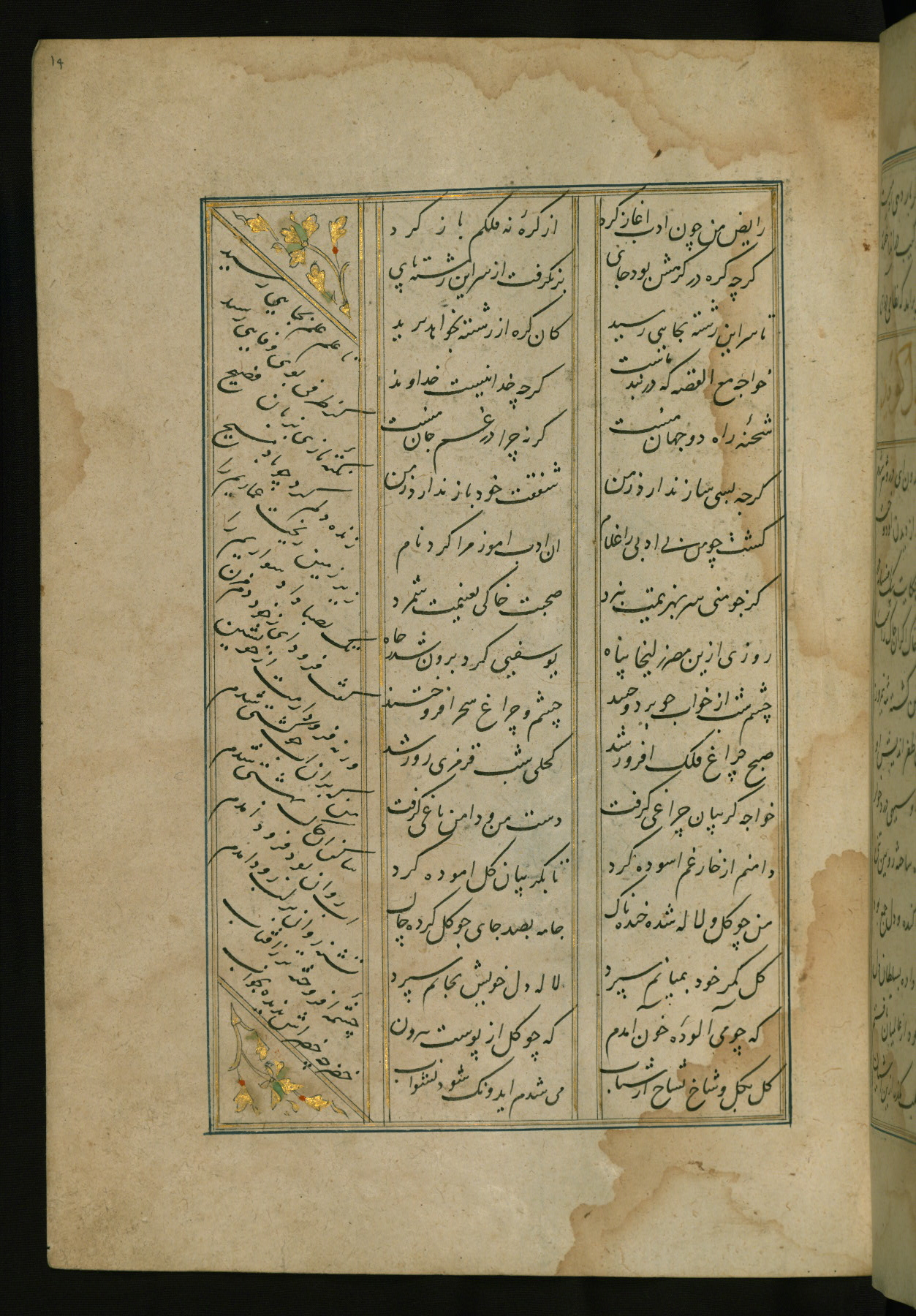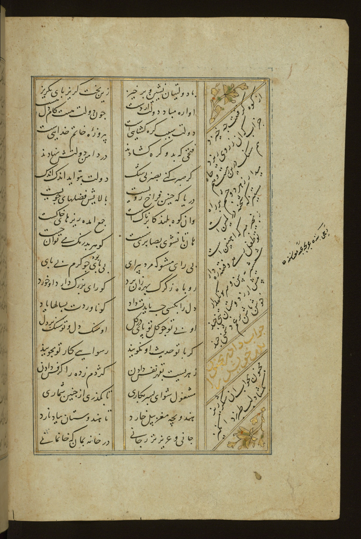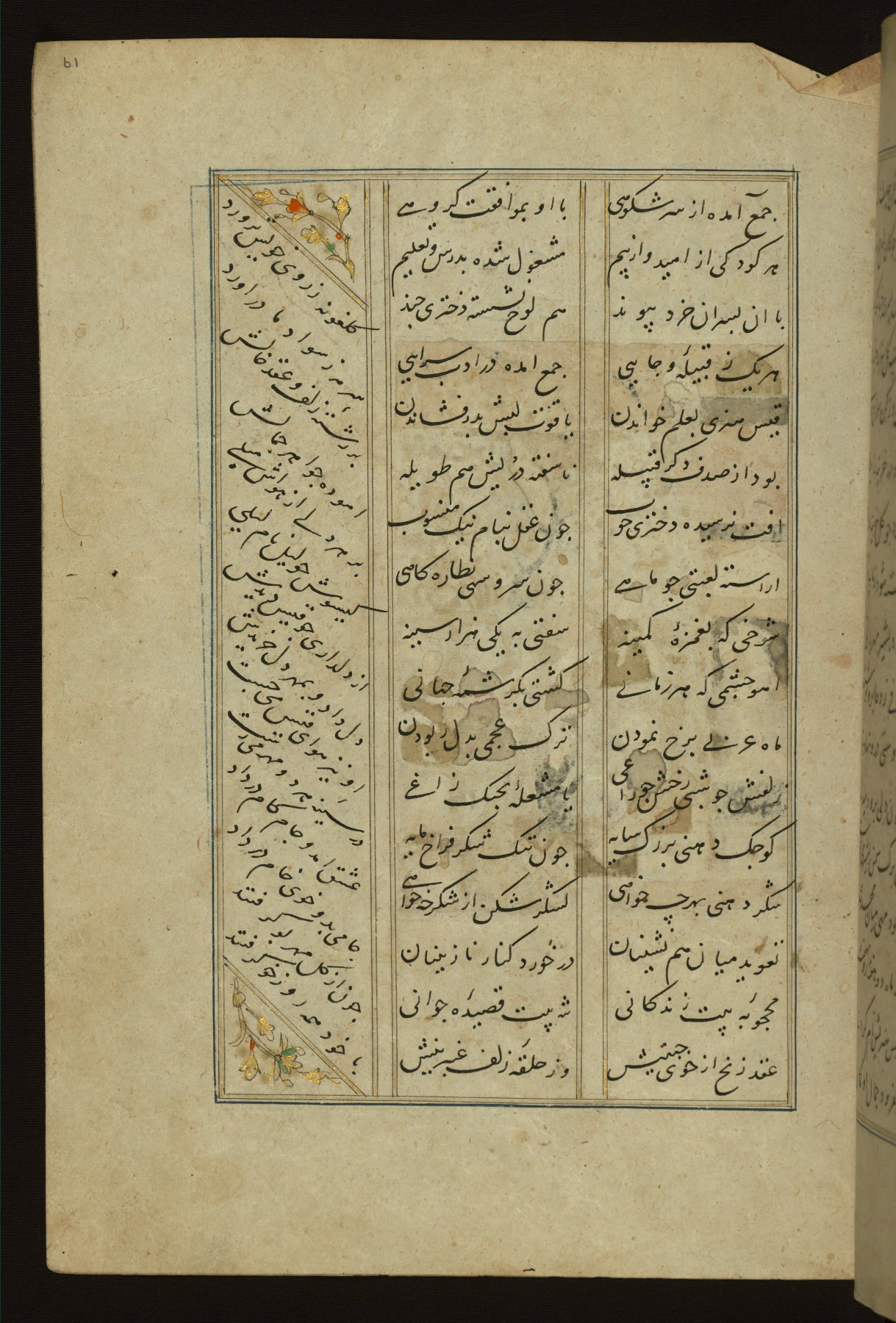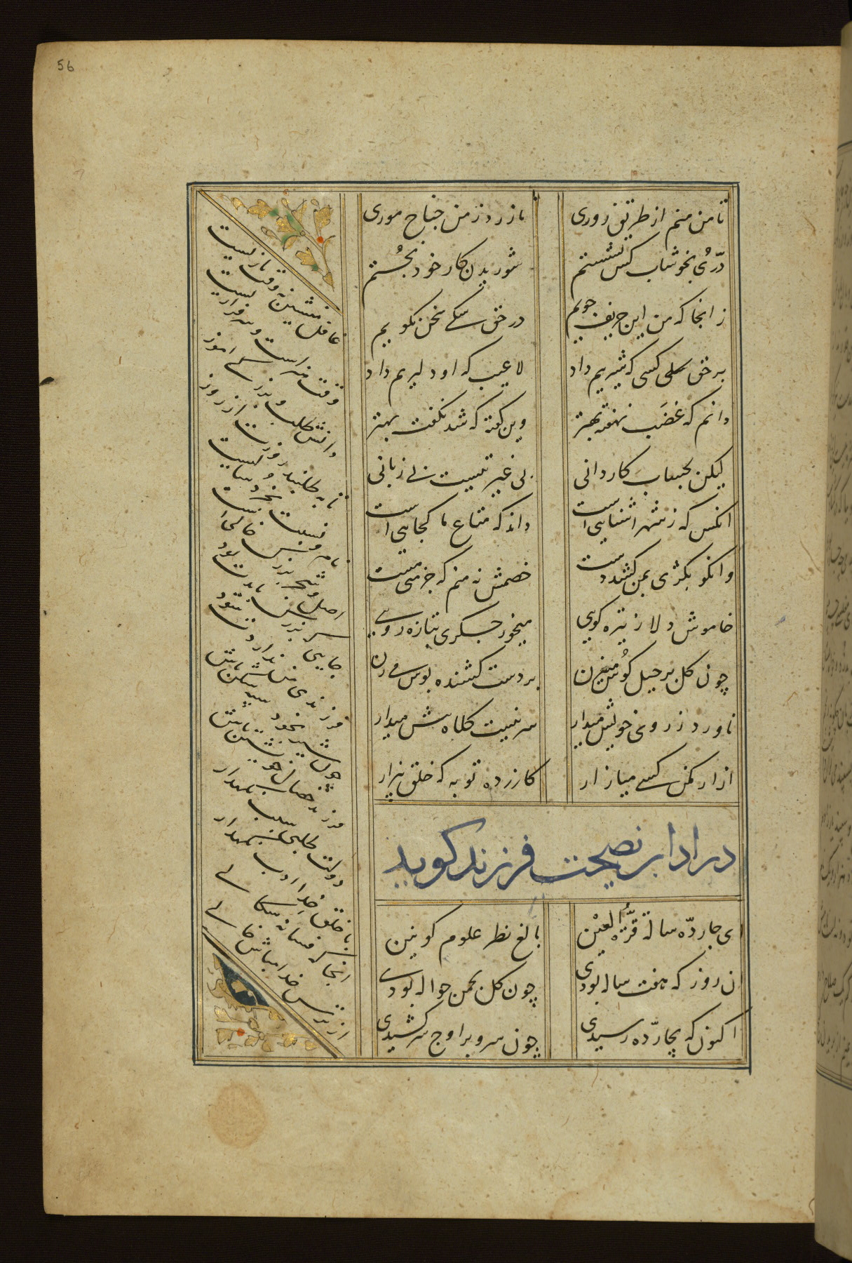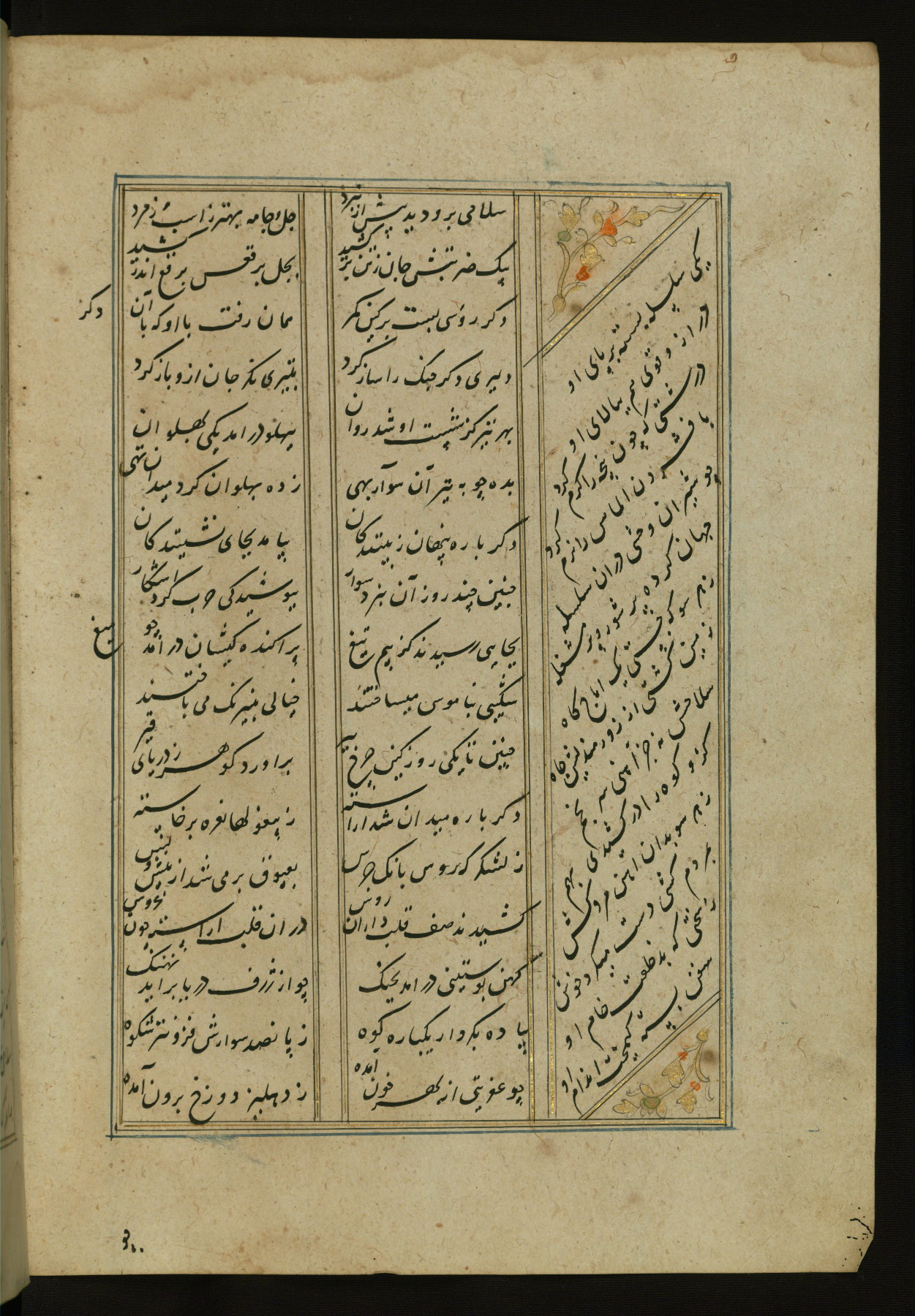 This copy of the Khamsah (quintet) of Niẓāmī Ganjavī (d. 605 AH / 1209 CE) was written by Abū Bakr Shāh ibn Ḥasan ibn ʿAlī al-Shahrastānī and illuminated by Jamāl al-Dīn ibn Muḥammad al-Ṣiddīqī al-Iṣfahānī between 892 AH / 1486 CE and 900 AH / 1494-5 CE. The manuscript opens with a double-page illuminated frontispiece with an inscription giving the title of the work and the name of the author (fols. 1b-2a). There are four illuminated titlepieces with the names of the individual poems and twenty-six repainted illustrations. According to evidence supplied by the colophons, the original binding was by the hand of Jamāl al-Dīn ibn Muḥammad al-Ṣiddīqī al-Iṣfahānī, as well. Unfortunately, it has not survived. The binding presently attached to the manuscript dates to the twelfth century AH / eighteenth CE.